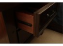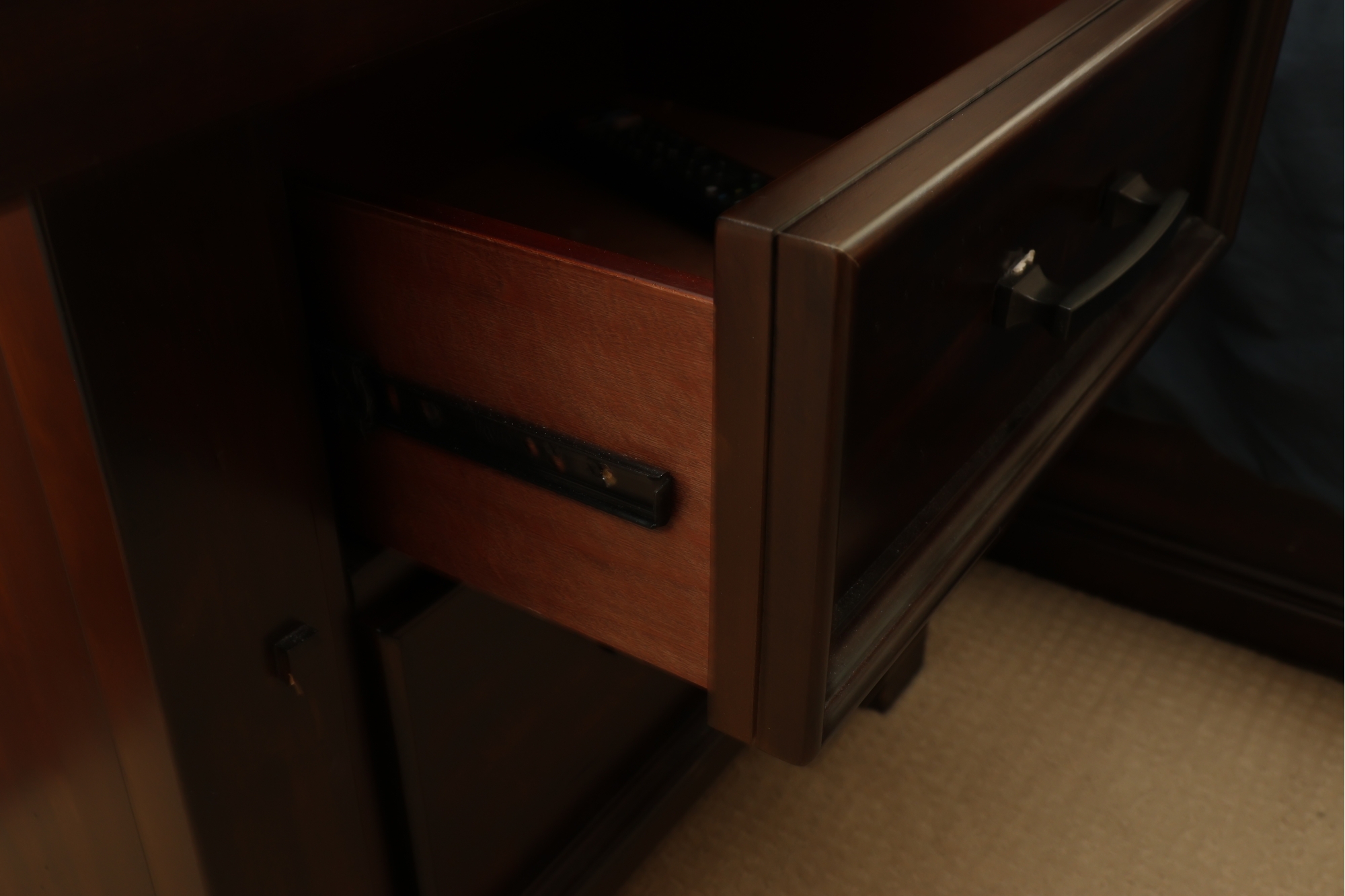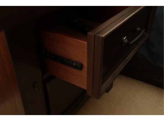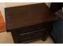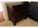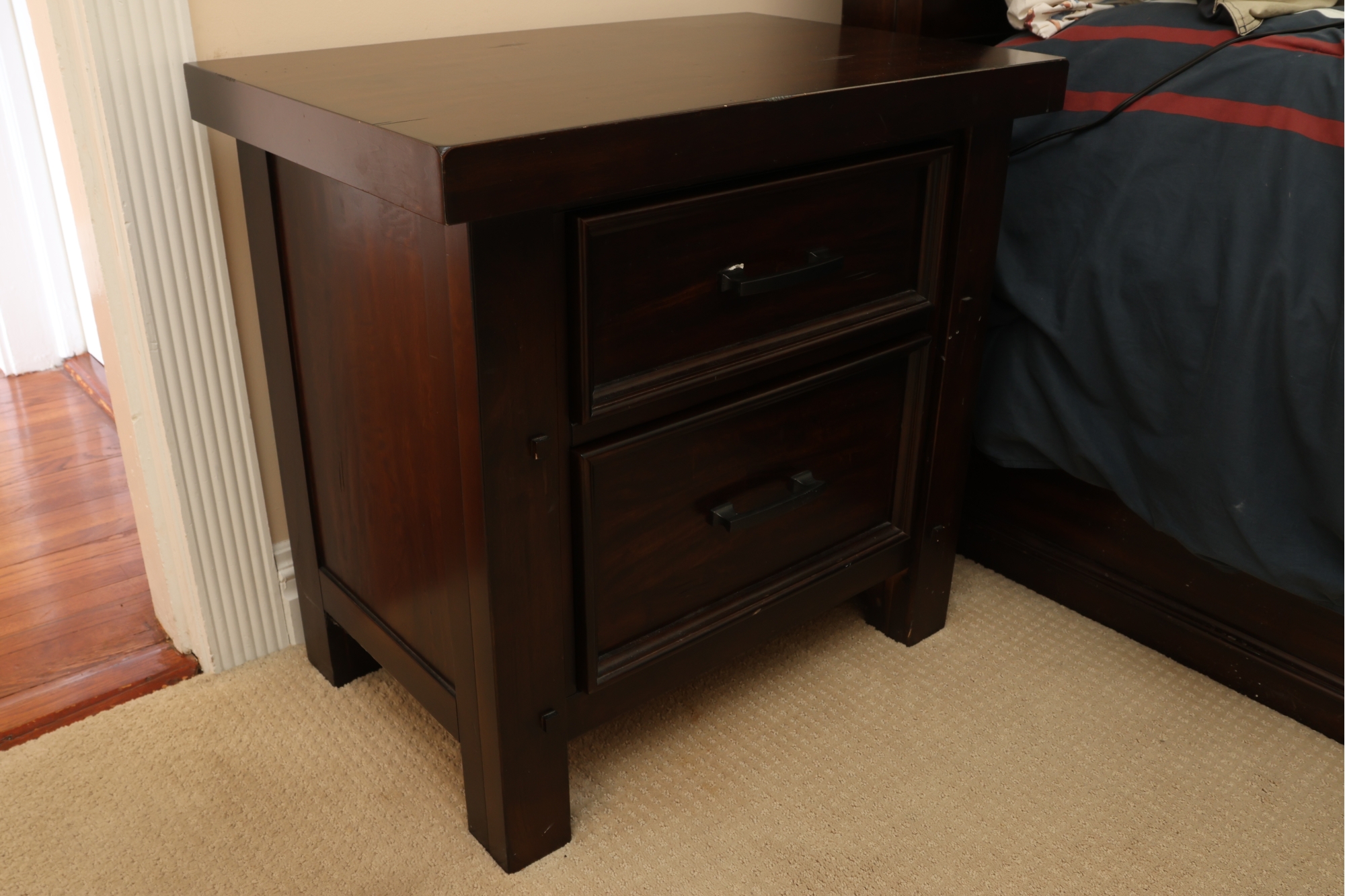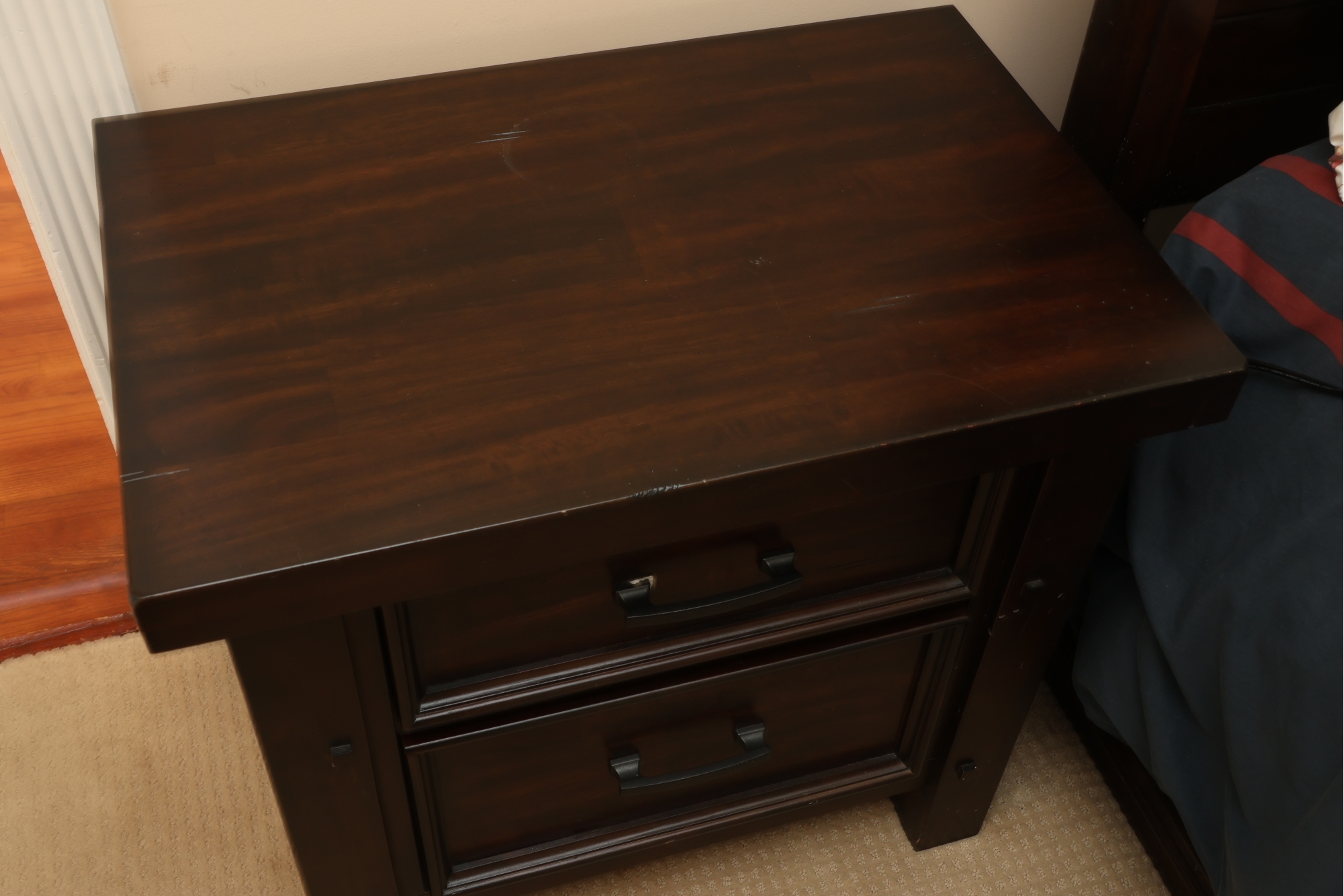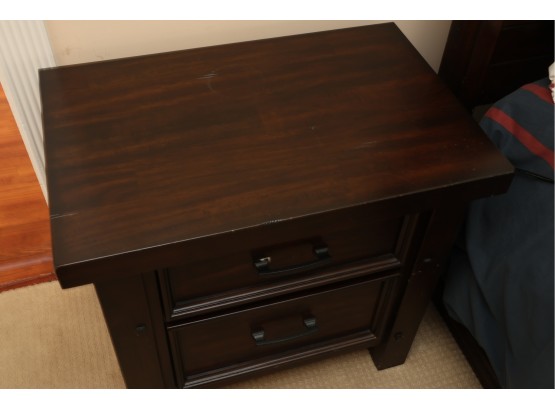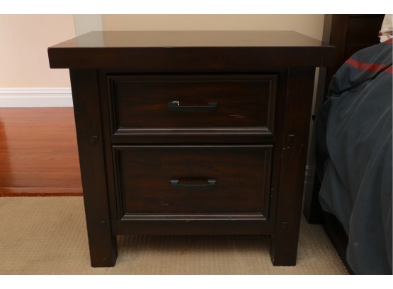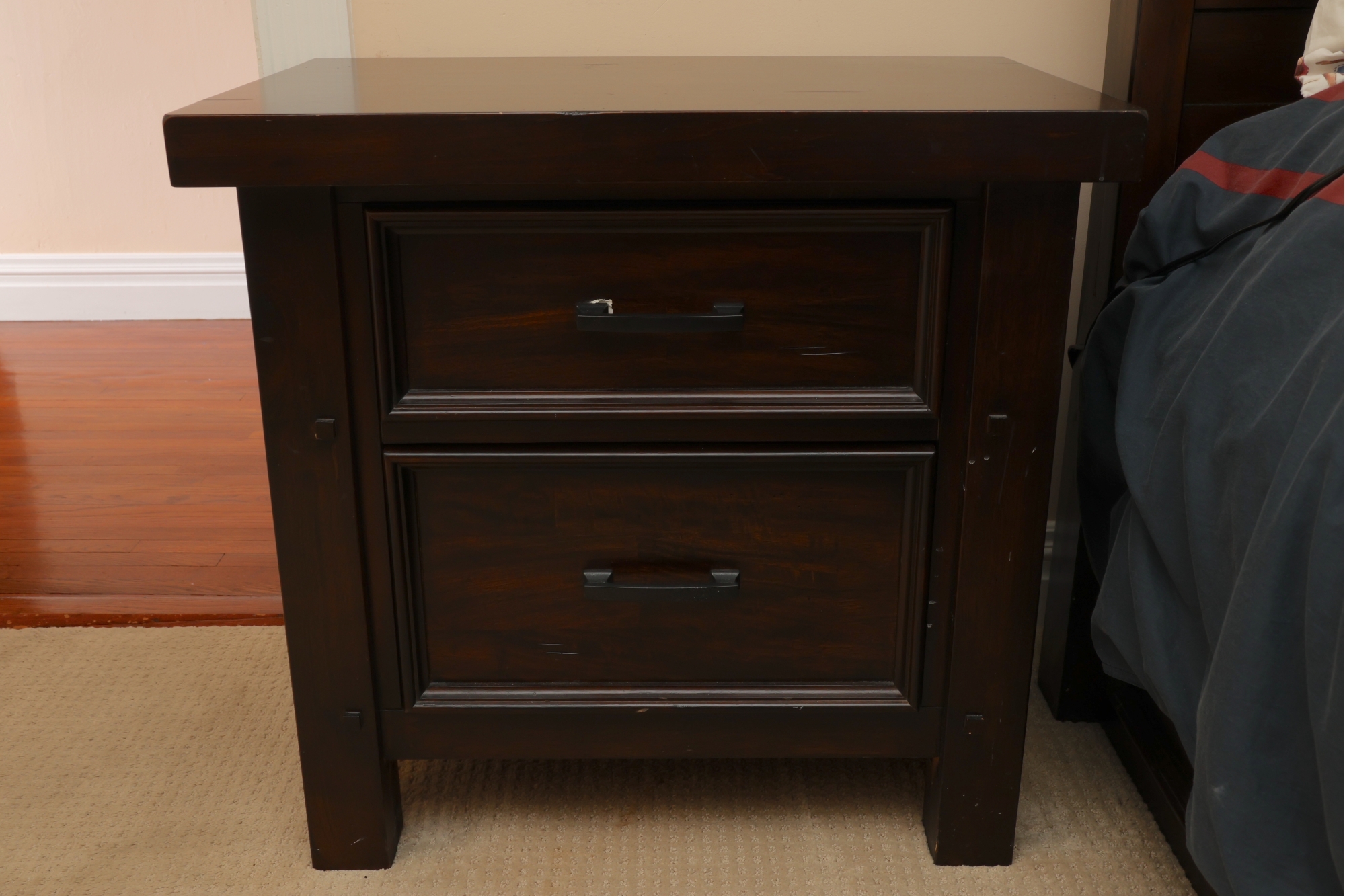 A rectangular dark-stained wooden nightstand featuring two recessed panel drawers with dark metal bar pulls. It has sturdy block legs with visible decorative square accents. The piece shows several scratches and scuffs on the top, drawer fronts, and legs.