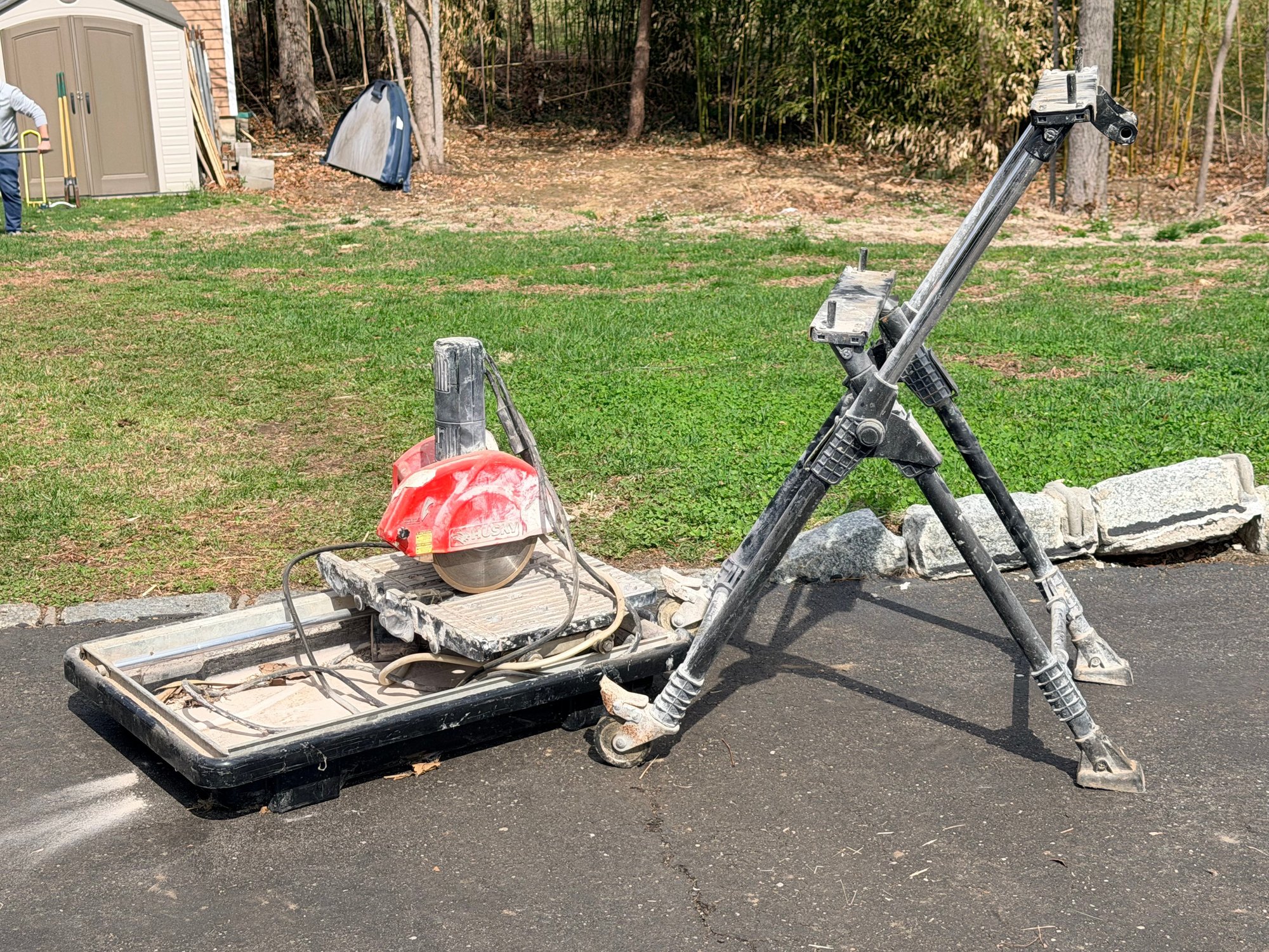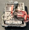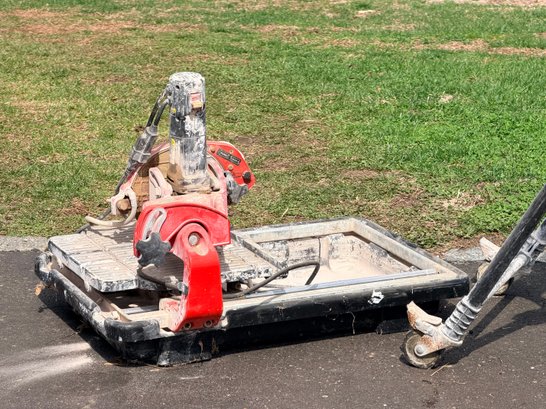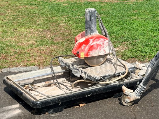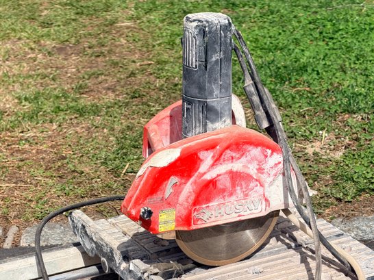 A Husky electric masonry saw featuring a circular diamond blade housed in a protective red guard, mounted on a sliding tray base designed for cutting tile, stone, or similar materials, with integrated motor housing and corded power supply suitable for jobsite or workshop use.