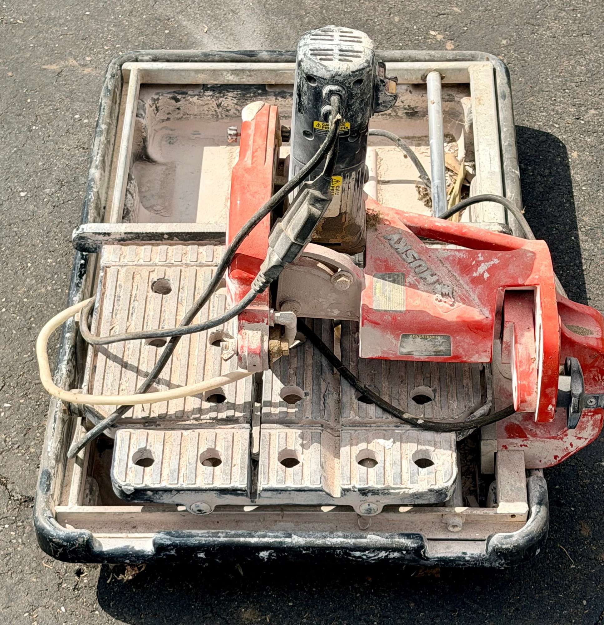 Used condition with heavy dust and residue from prior use, visible wear and scuffing to housing and base, and signs of regular operation; blade present; operational status tested and working
