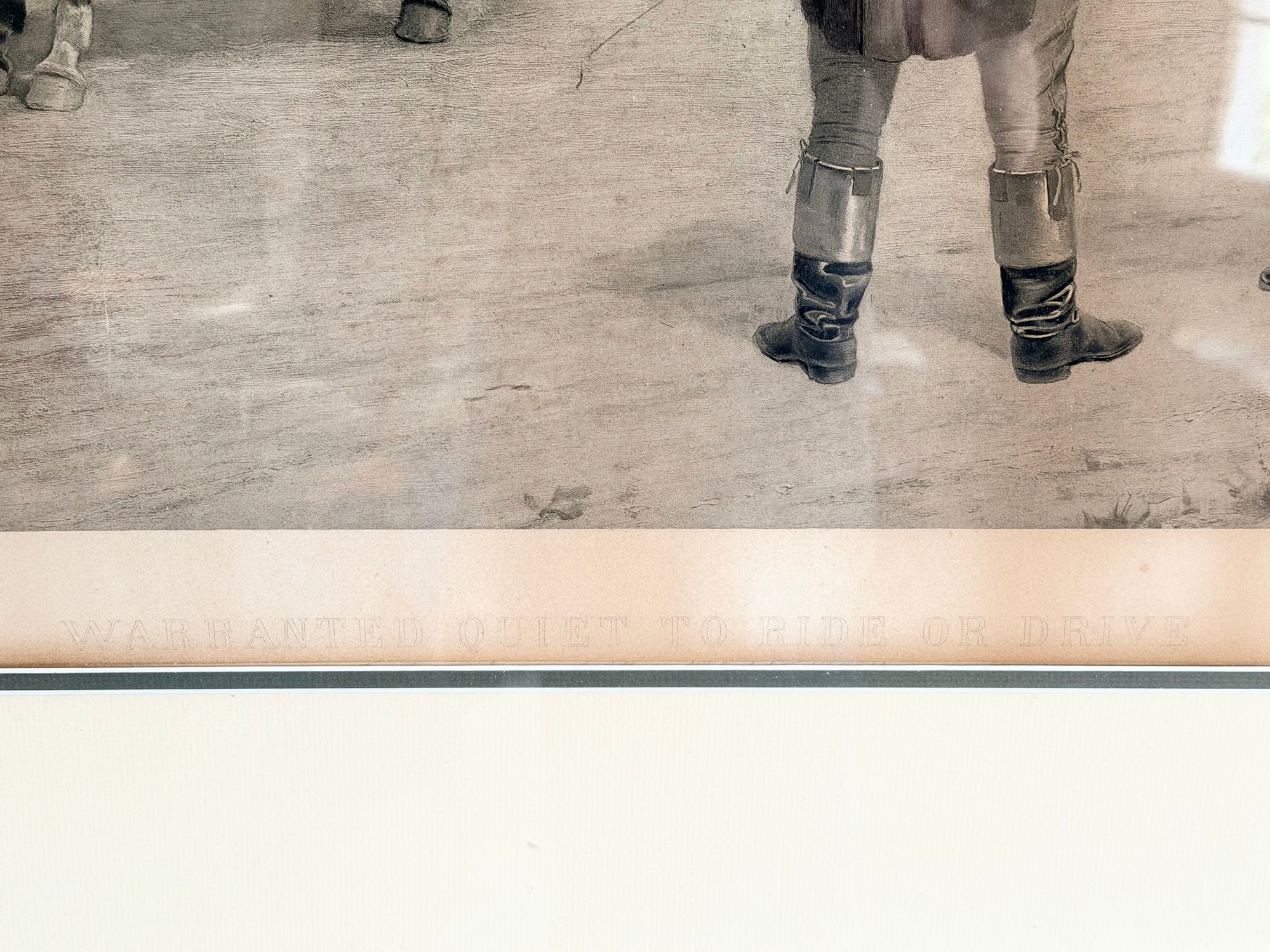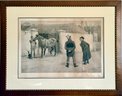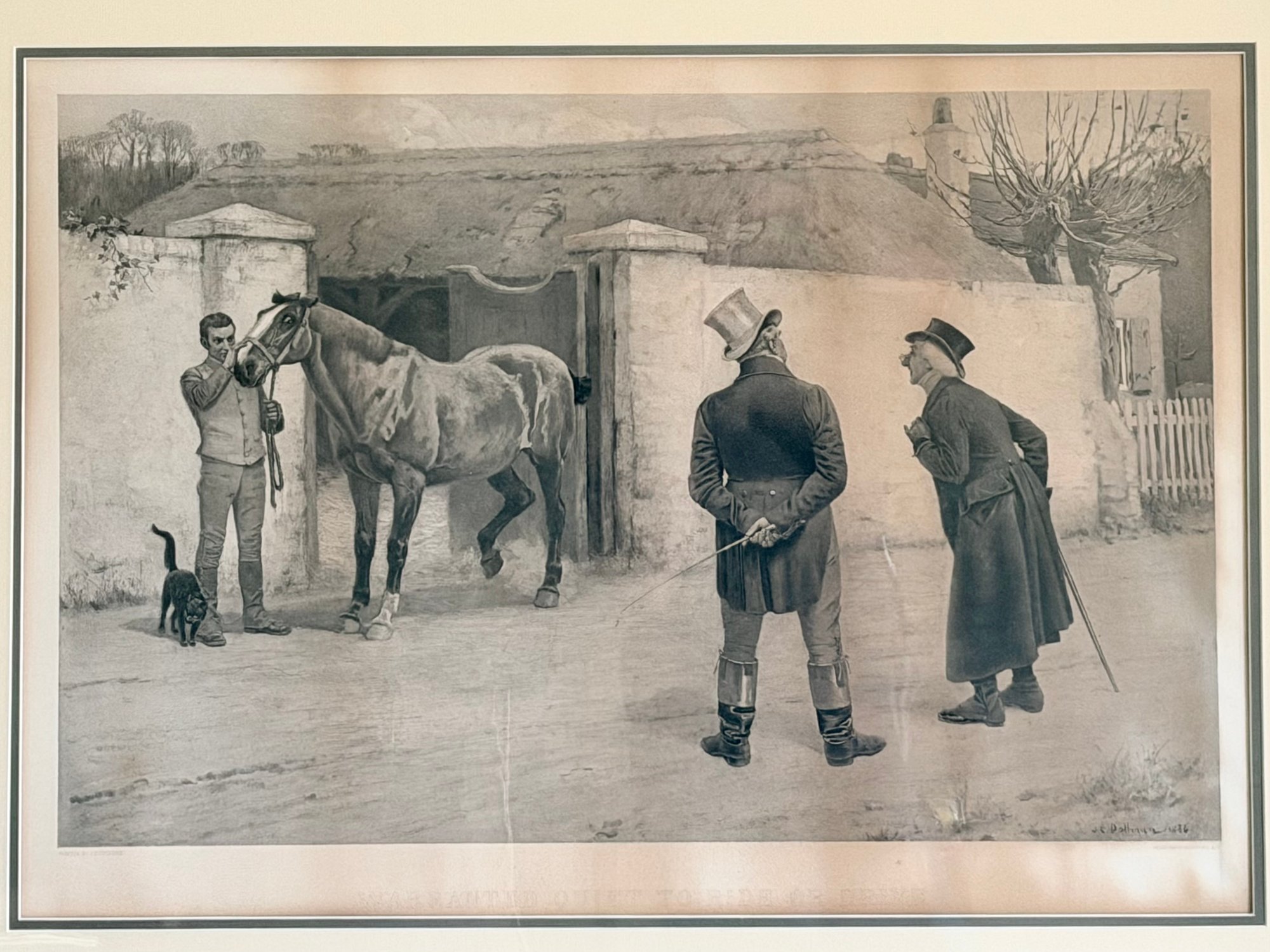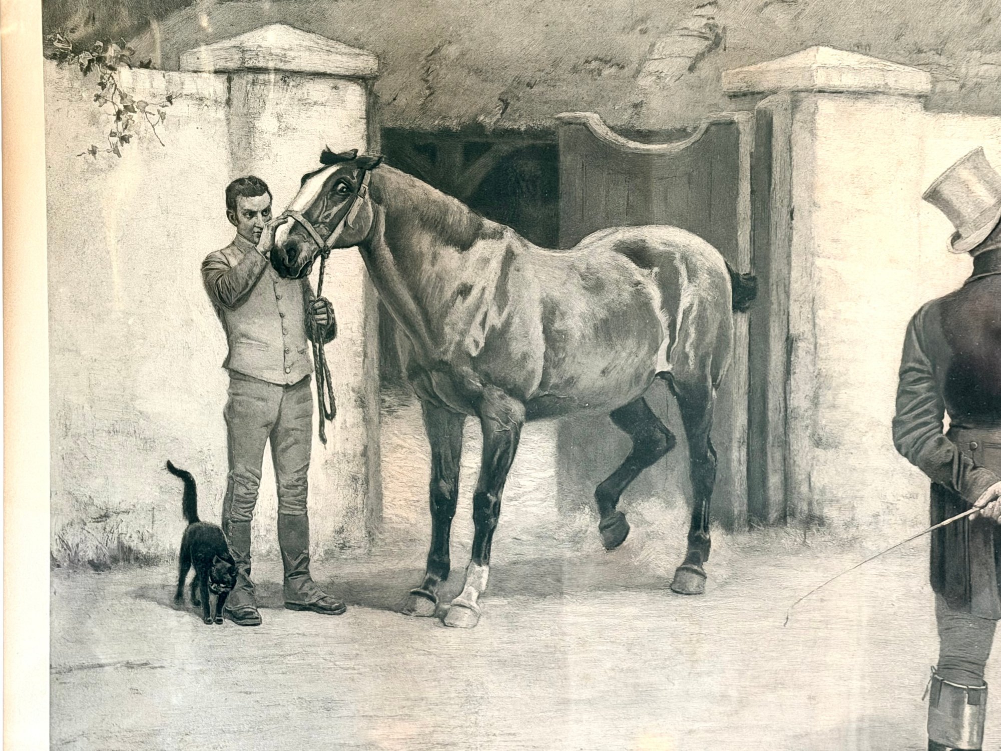 Framed black-and-white photogravure depicting a stable yard scene with a horse being examined by a handler while two formally dressed men observe. A dog stands nearby, adding to the narrative detail. The composition reflects late 19th-century European genre imagery with careful attention to posture and setting.