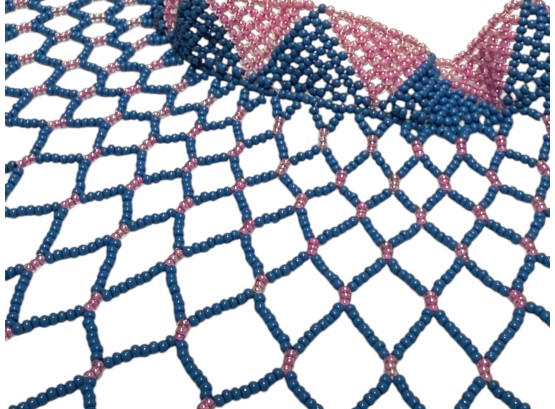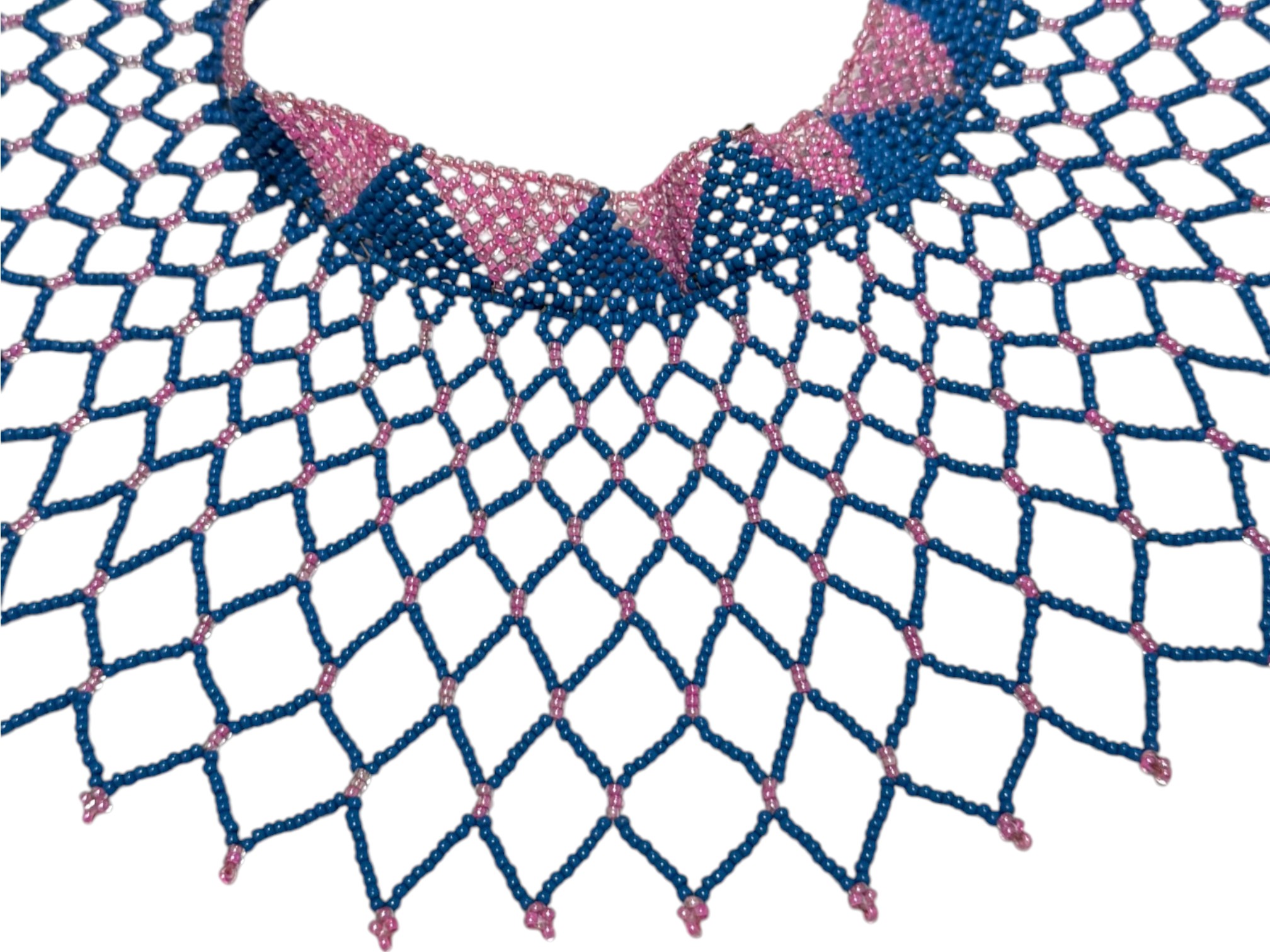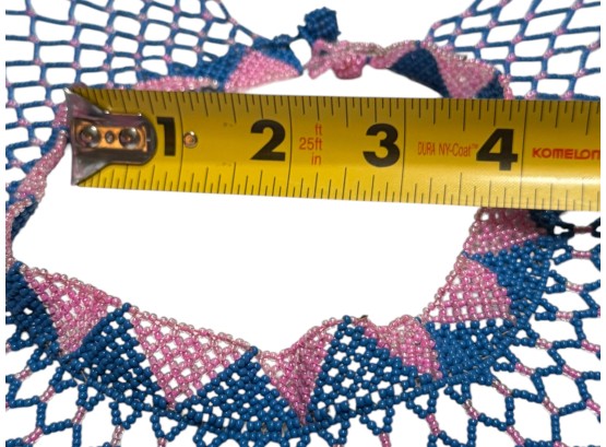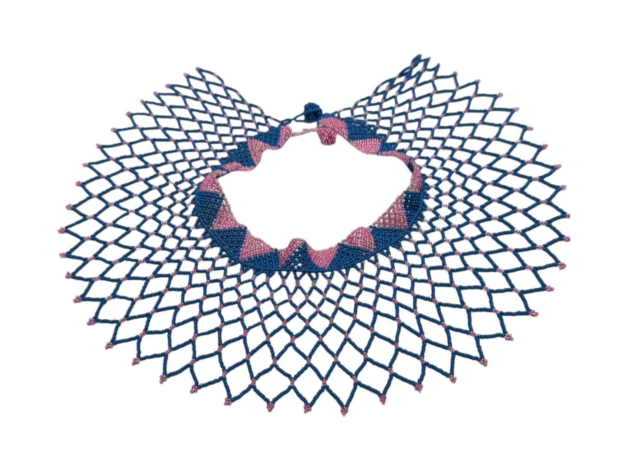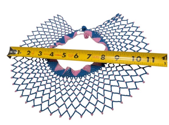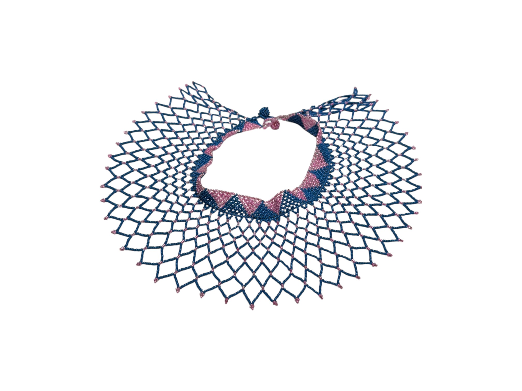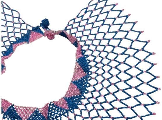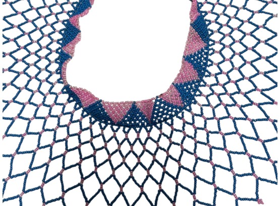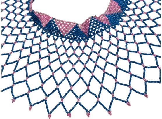 African-inspired (possiby inspired by the Maasai and Zulu culture) beaded collar necklace, featuring a wide, draped silhouette with a flexible, lattice‑like structure. Crafted from high‑quality glass or resin seed beads. Finished with a dual "Guru" bead and loop closure.