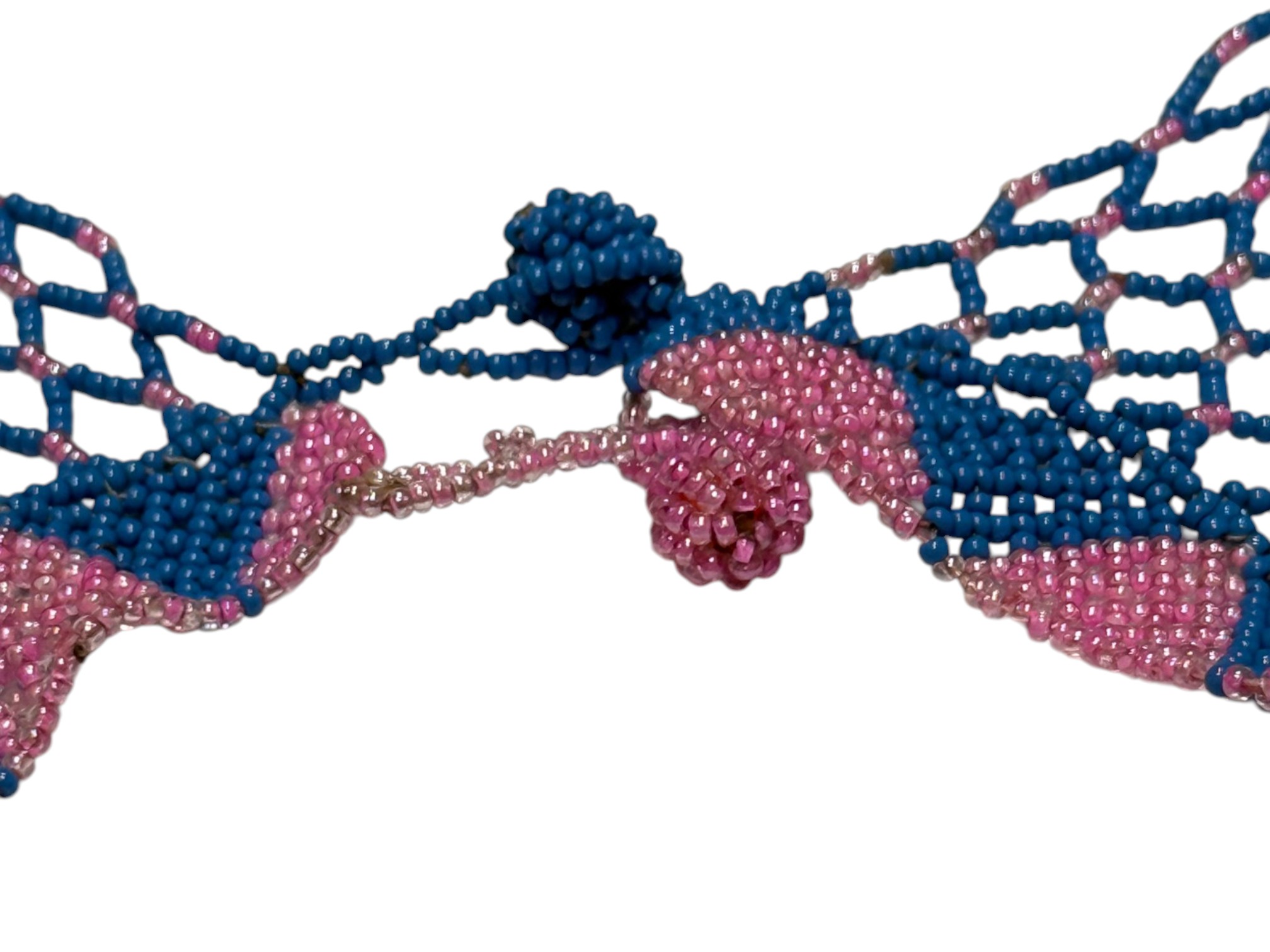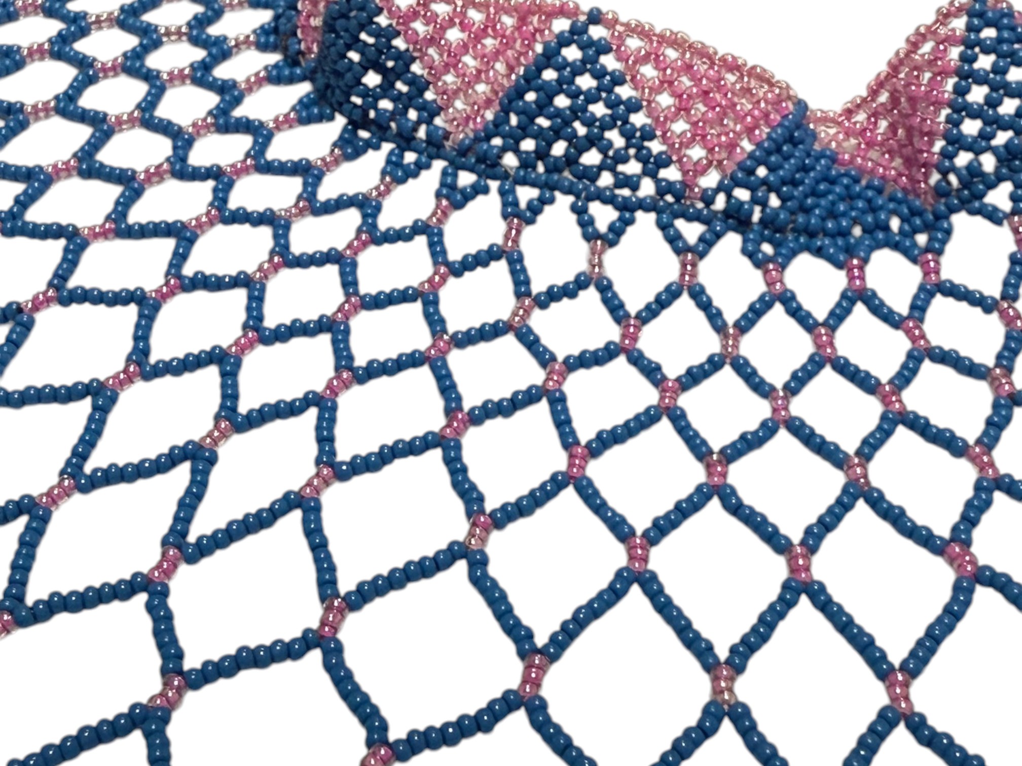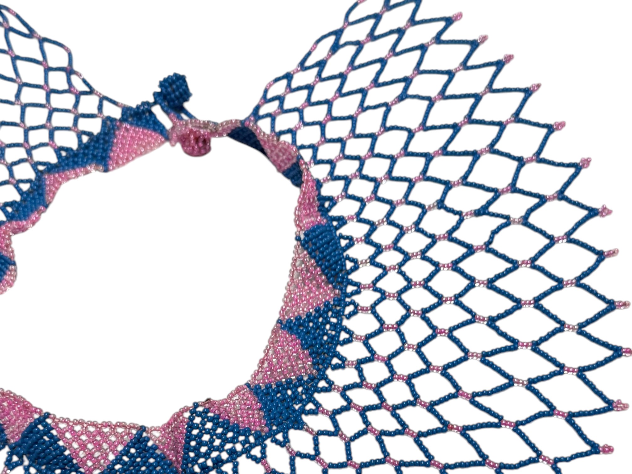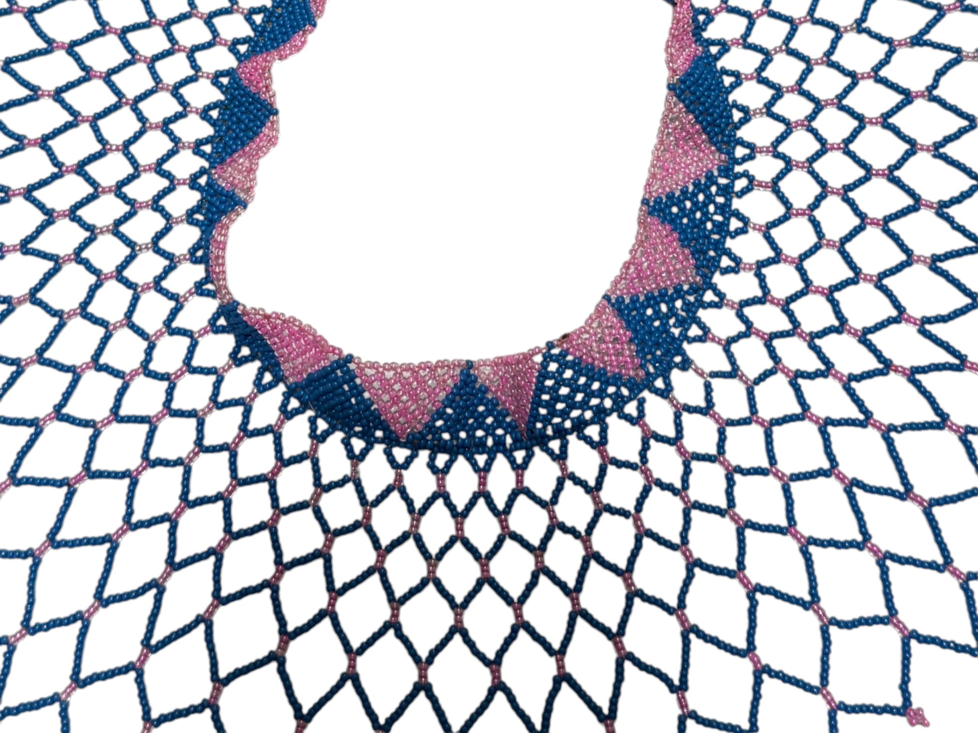 African-inspired (possiby inspired by the Maasai and Zulu culture) beaded collar necklace, featuring a wide, draped silhouette with a flexible, lattice‑like structure. Crafted from high‑quality glass or resin seed beads. Finished with a dual "Guru" bead and loop closure.