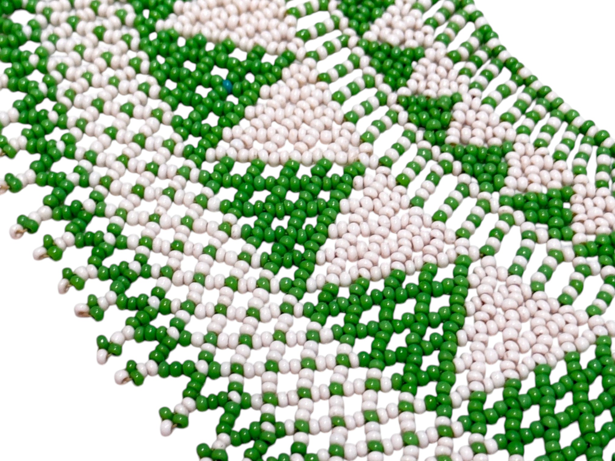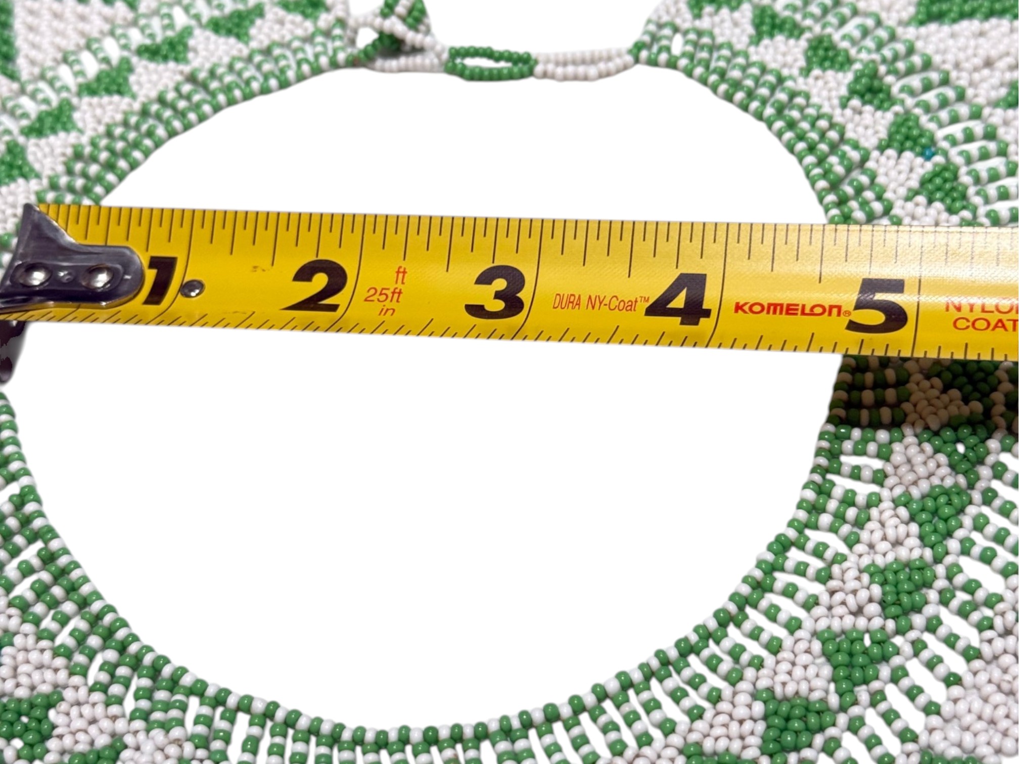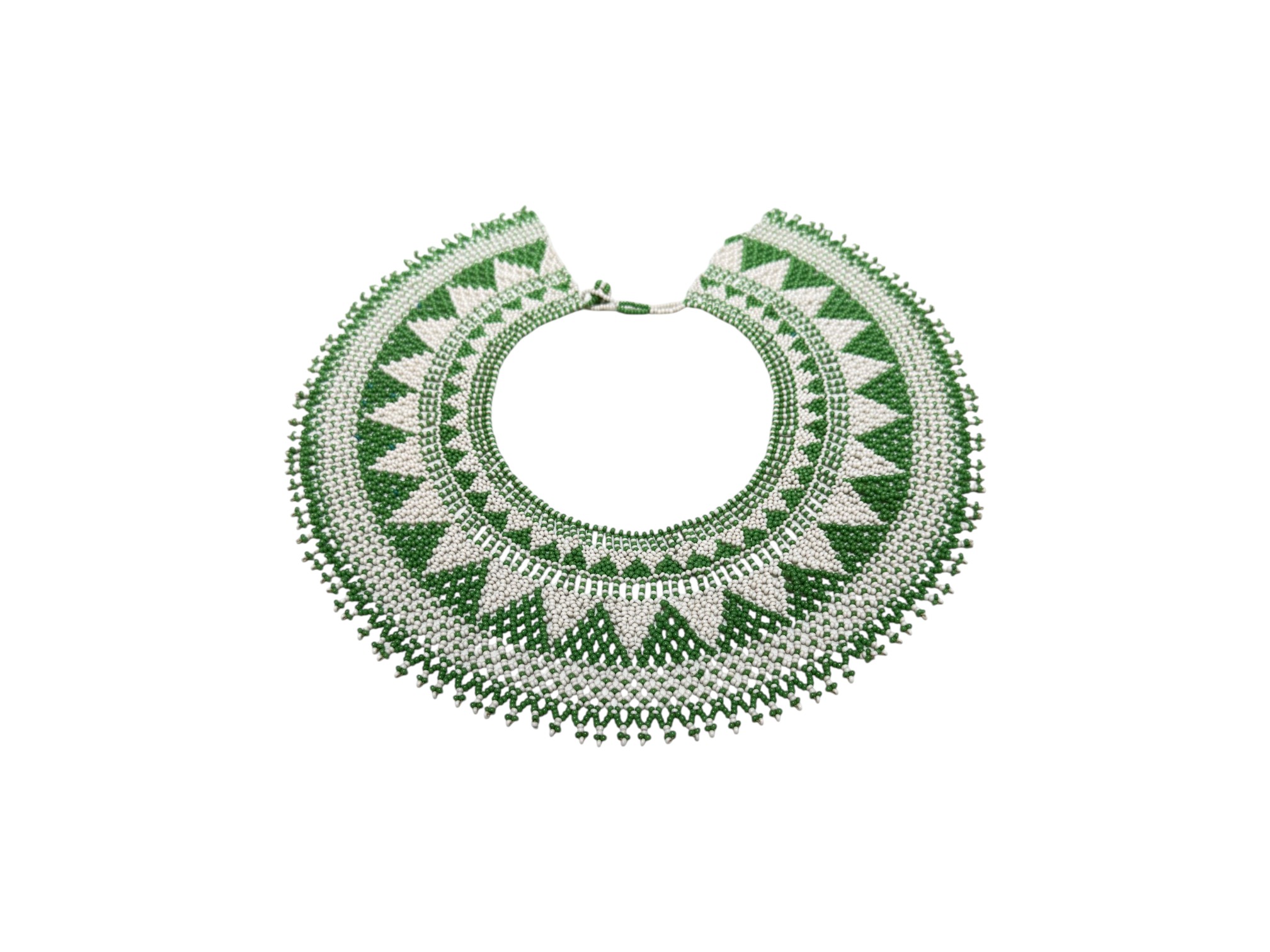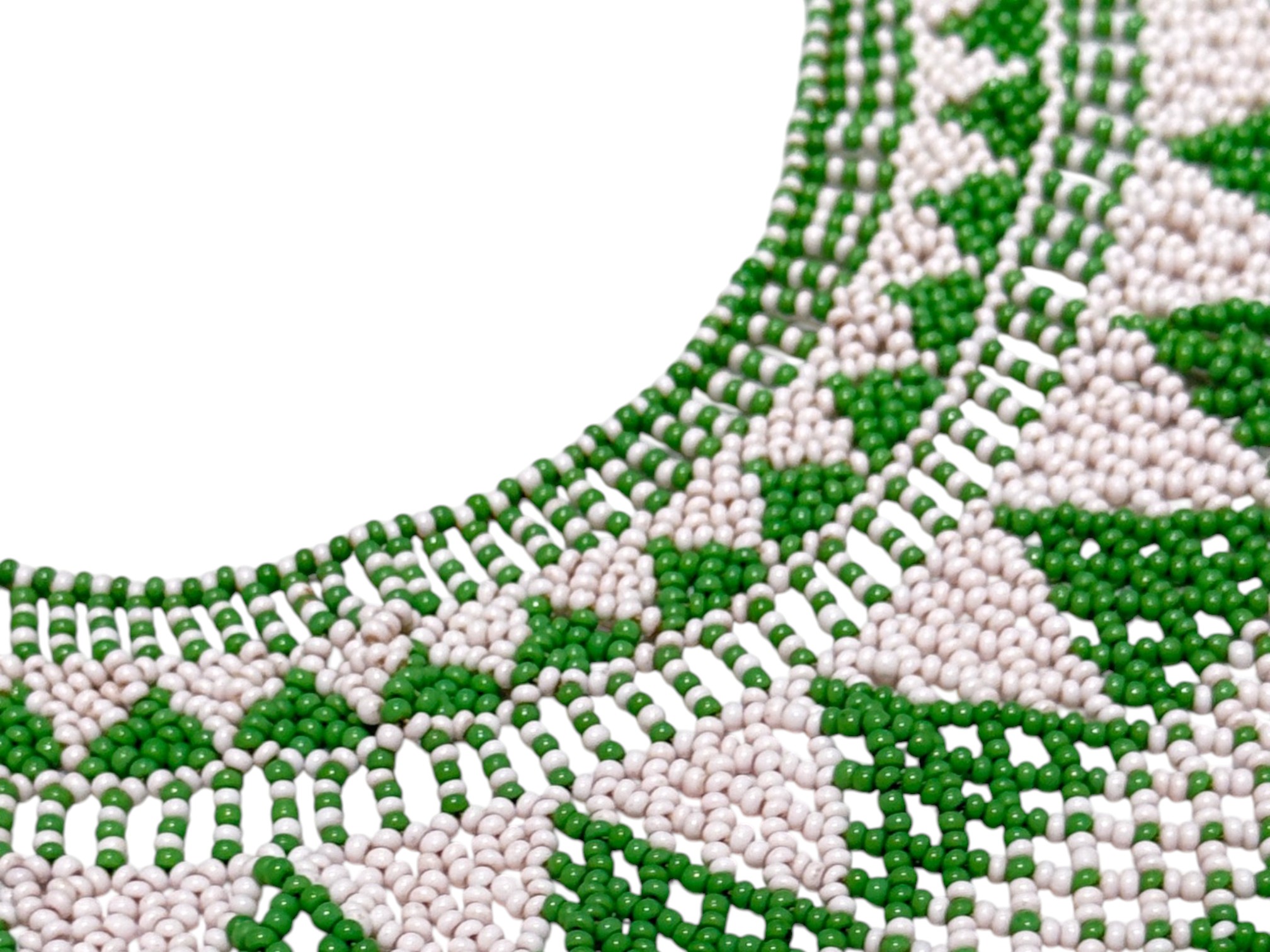Ethnic-inspired seed‑bead necklace is designed in a "bib" or "collar" style with intricate geometric patterns in green and white. Its aesthetic echoes global beadwork traditions, from African and Egyptian artisans to Ukrainian silyanka and kryza collars. Finished with a "Guru" bead and loop closure.