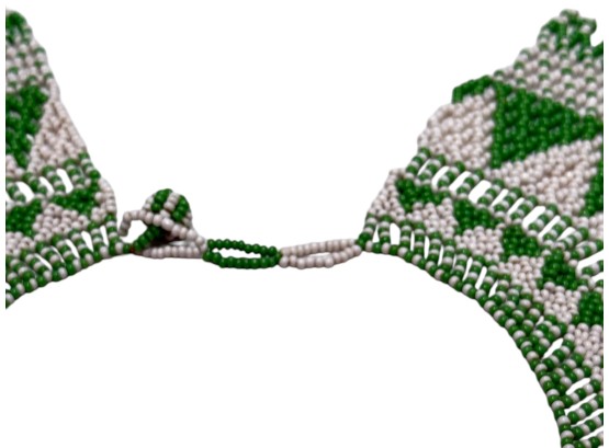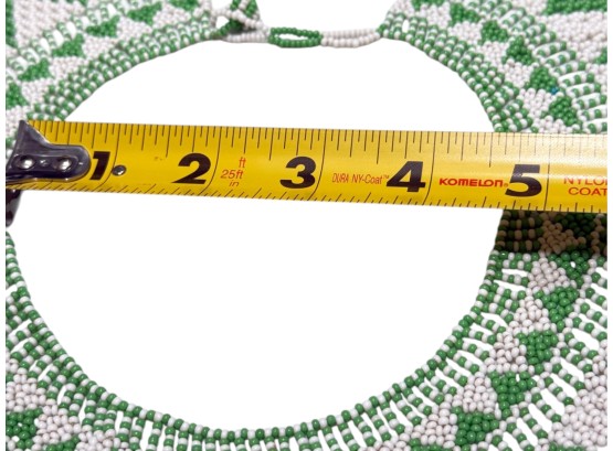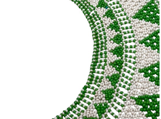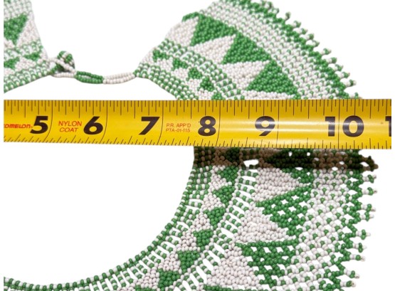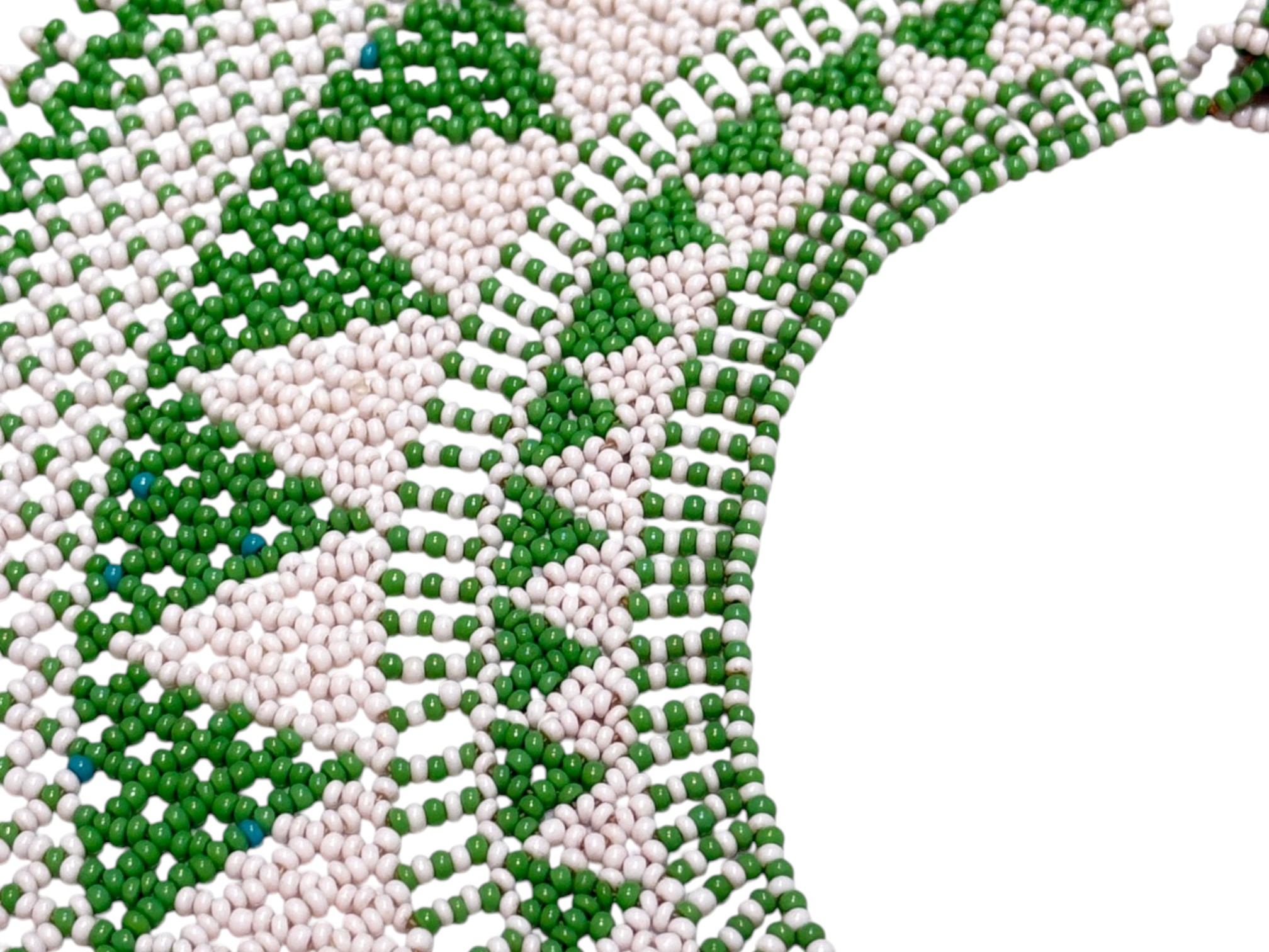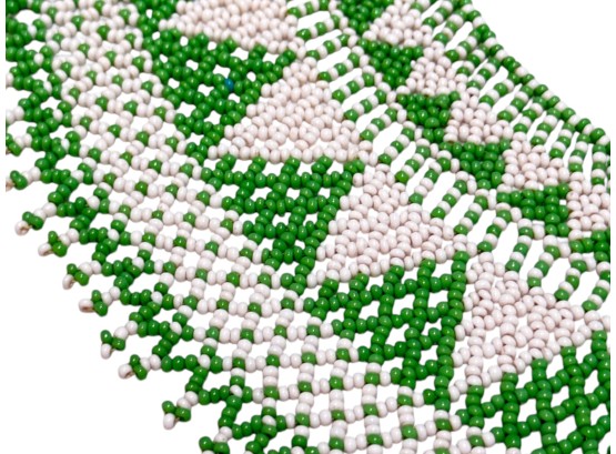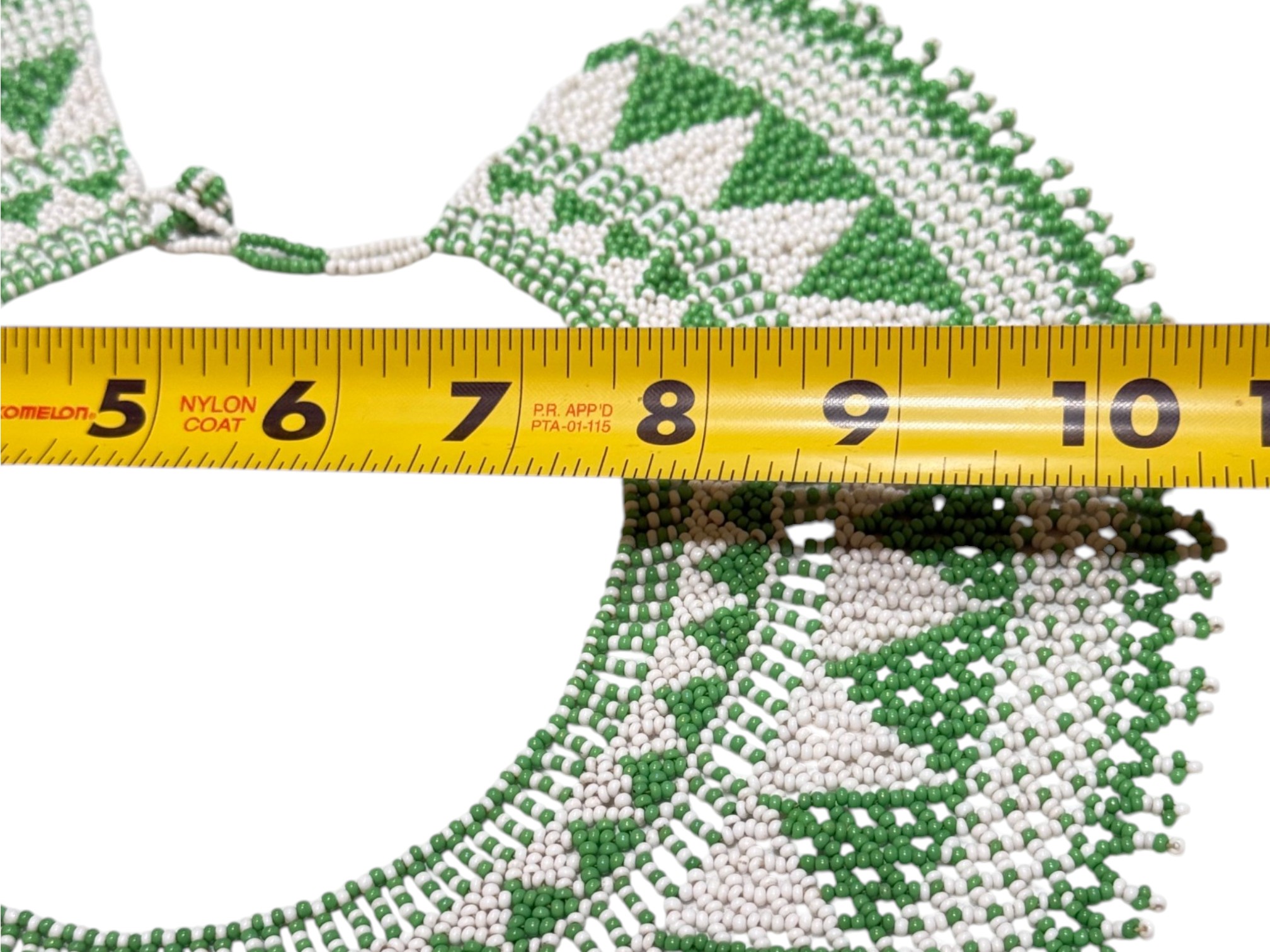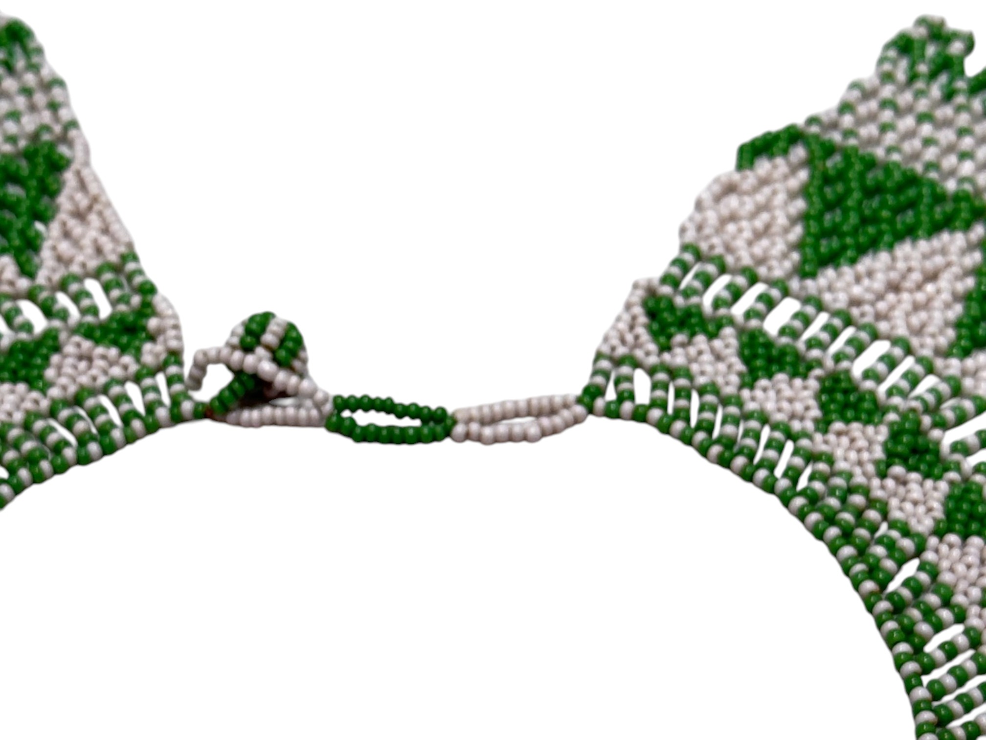 Ethnic-inspired seed‑bead necklace is designed in a "bib" or "collar" style with intricate geometric patterns in green and white. Its aesthetic echoes global beadwork traditions, from African and Egyptian artisans to Ukrainian silyanka and kryza collars. Finished with a "Guru" bead and loop closure.
