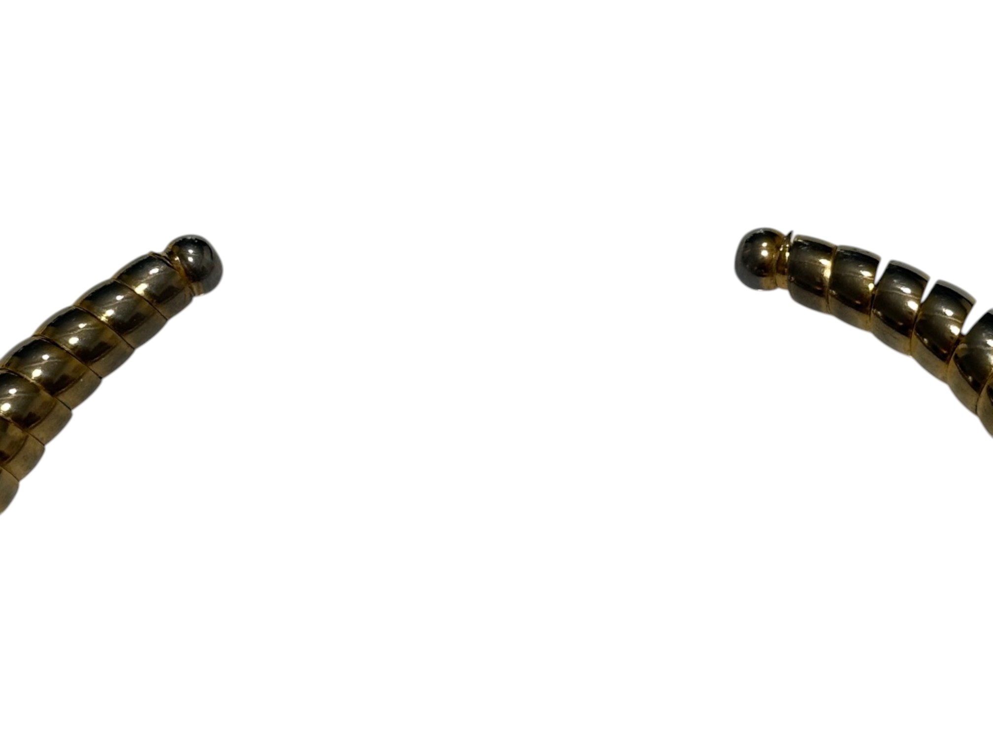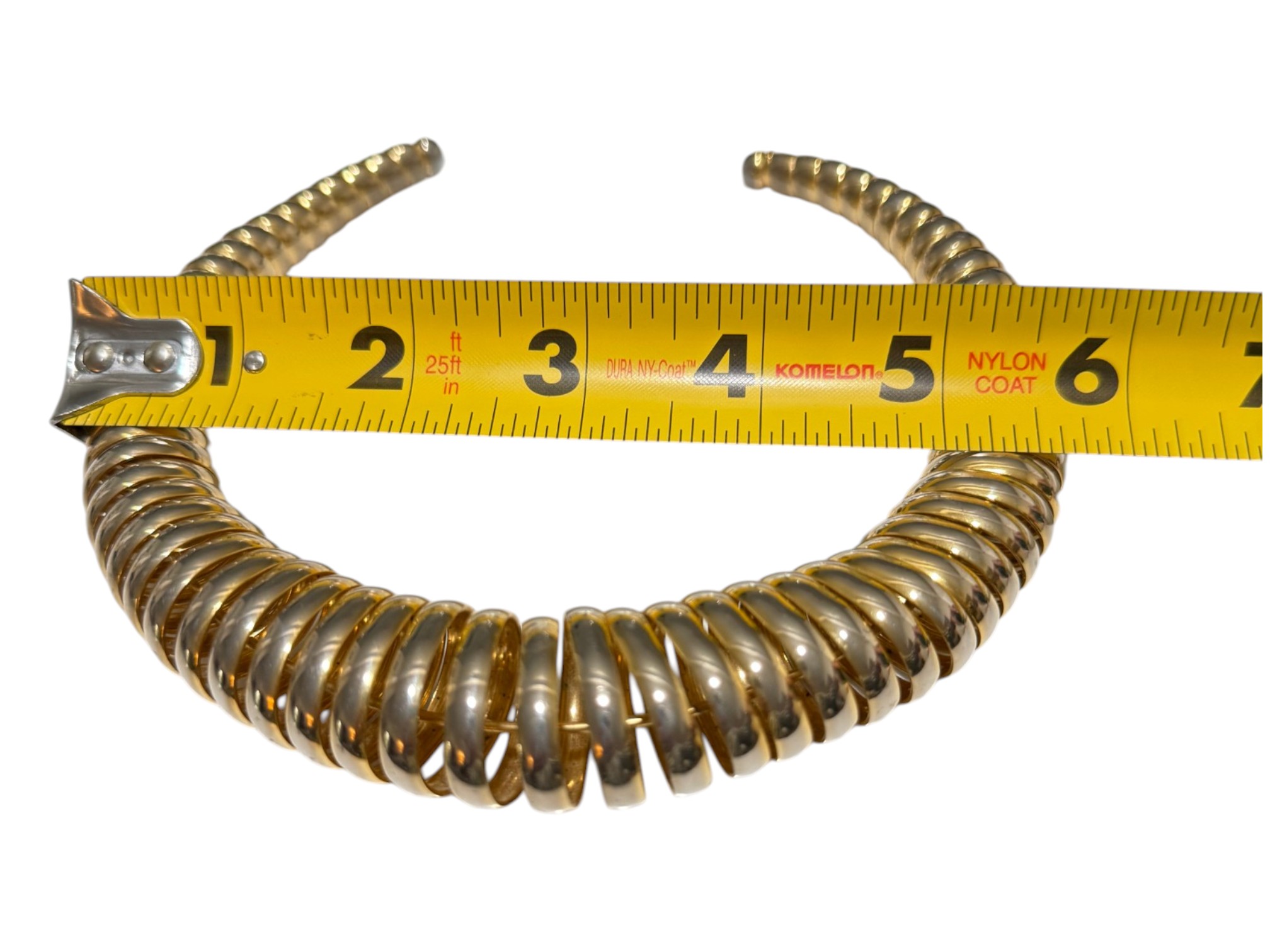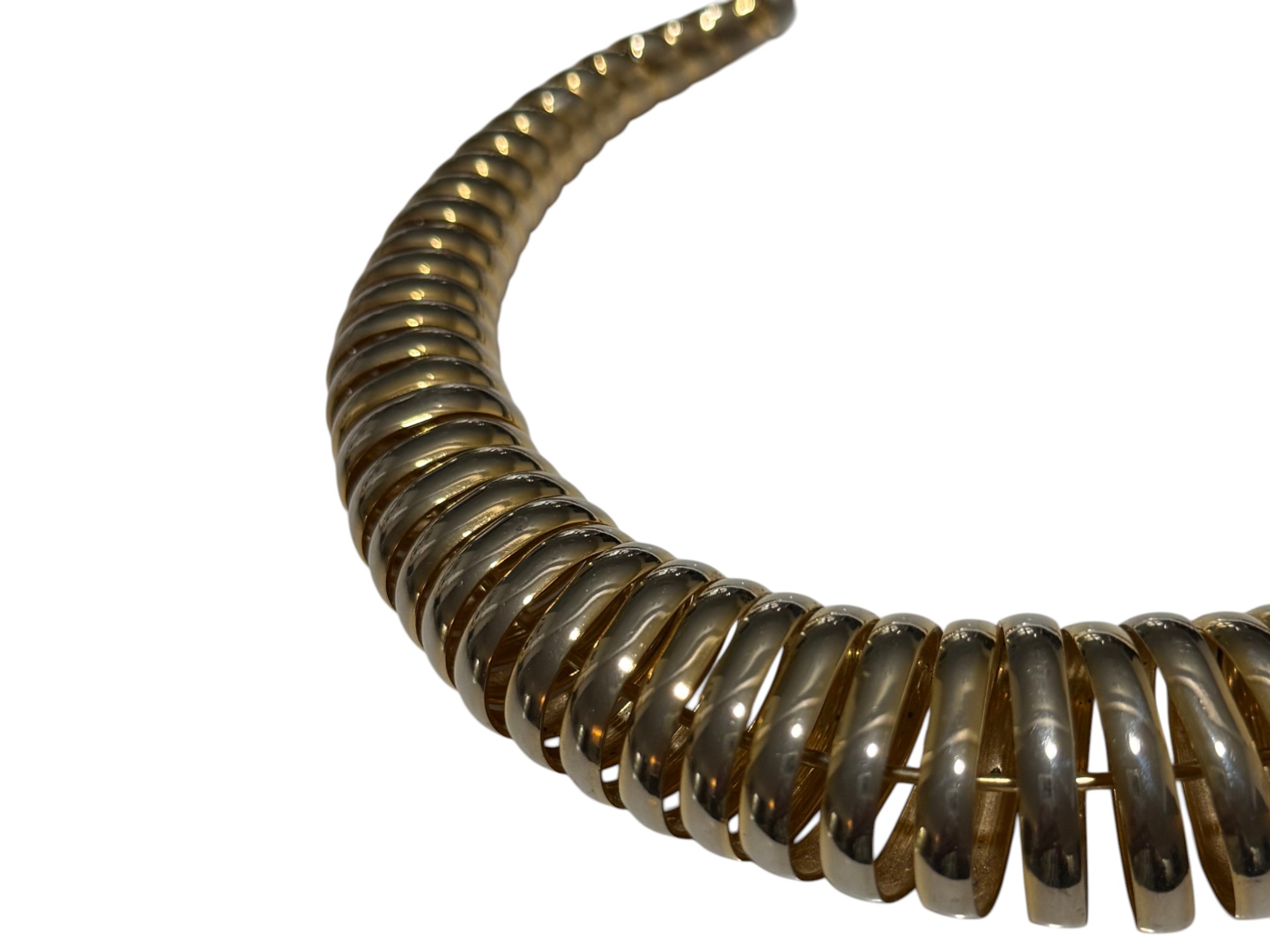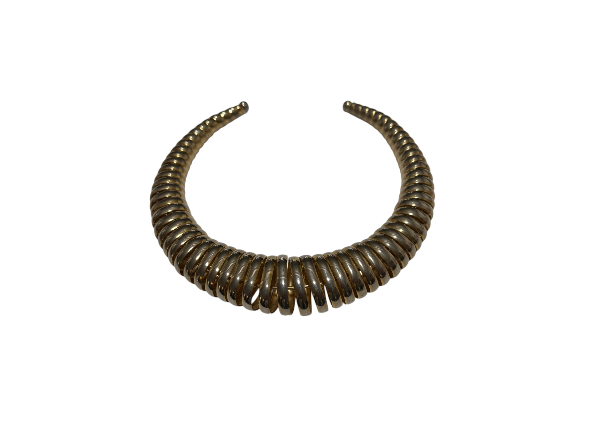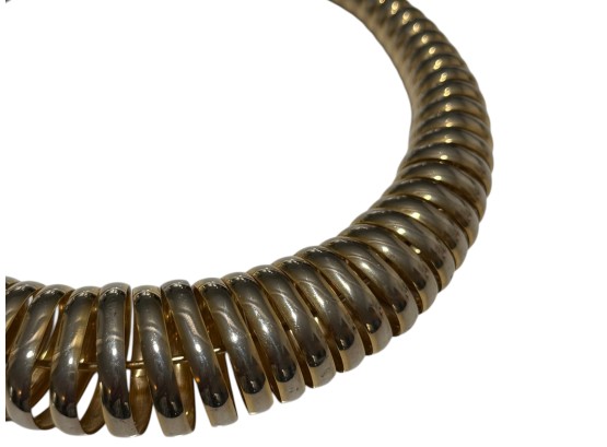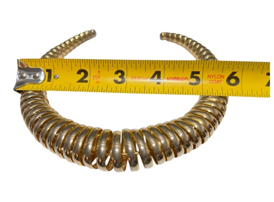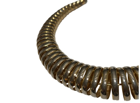 Vintage (1980s) gold‑toned coiled choker with a graduated, spiral construction, its ribbed metal elements evoking classic tubogas (coiled metal) workmanship of Italian jewelry design. No closure.