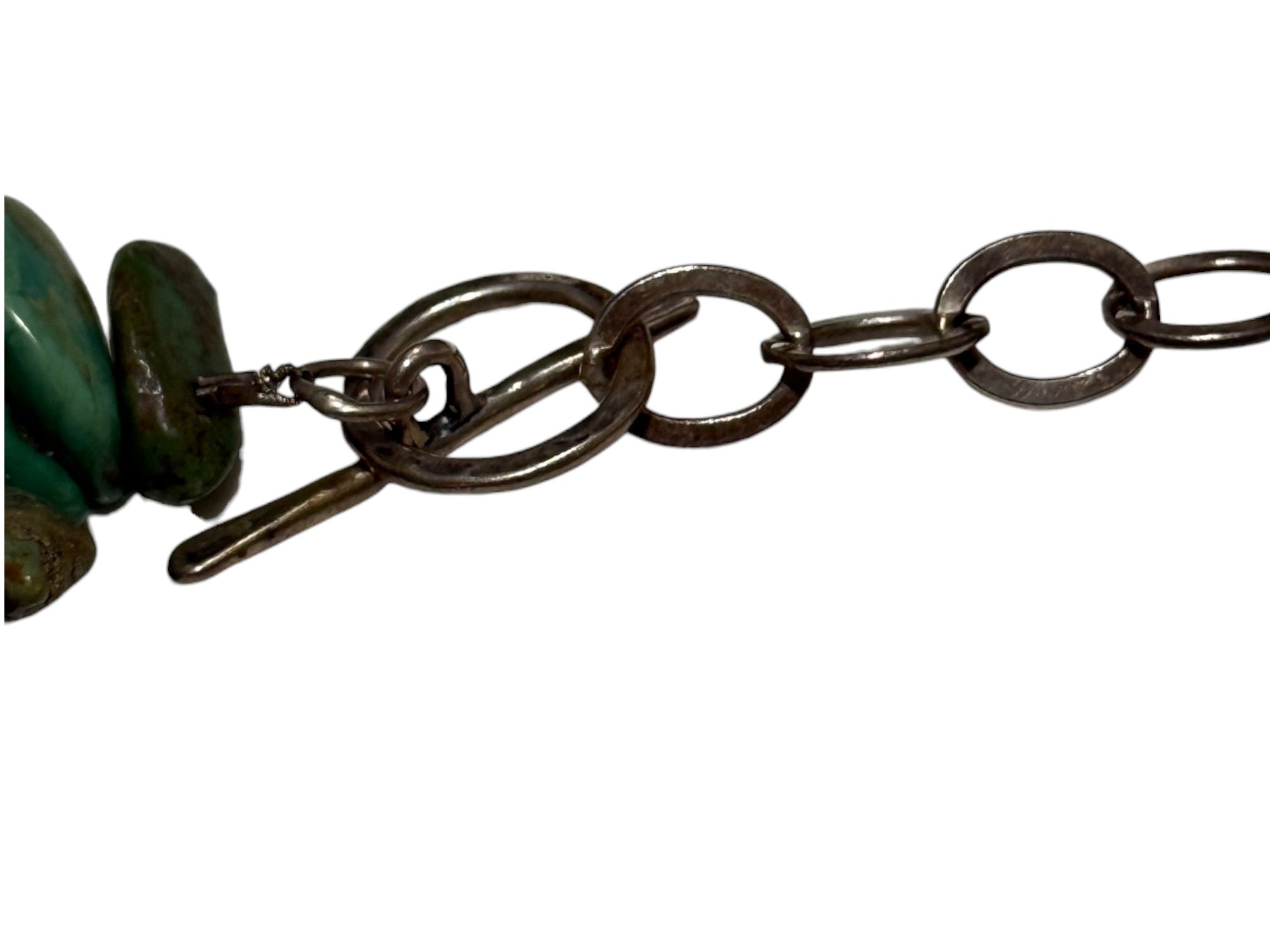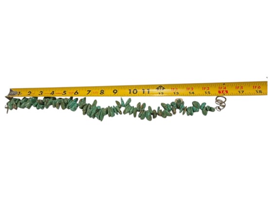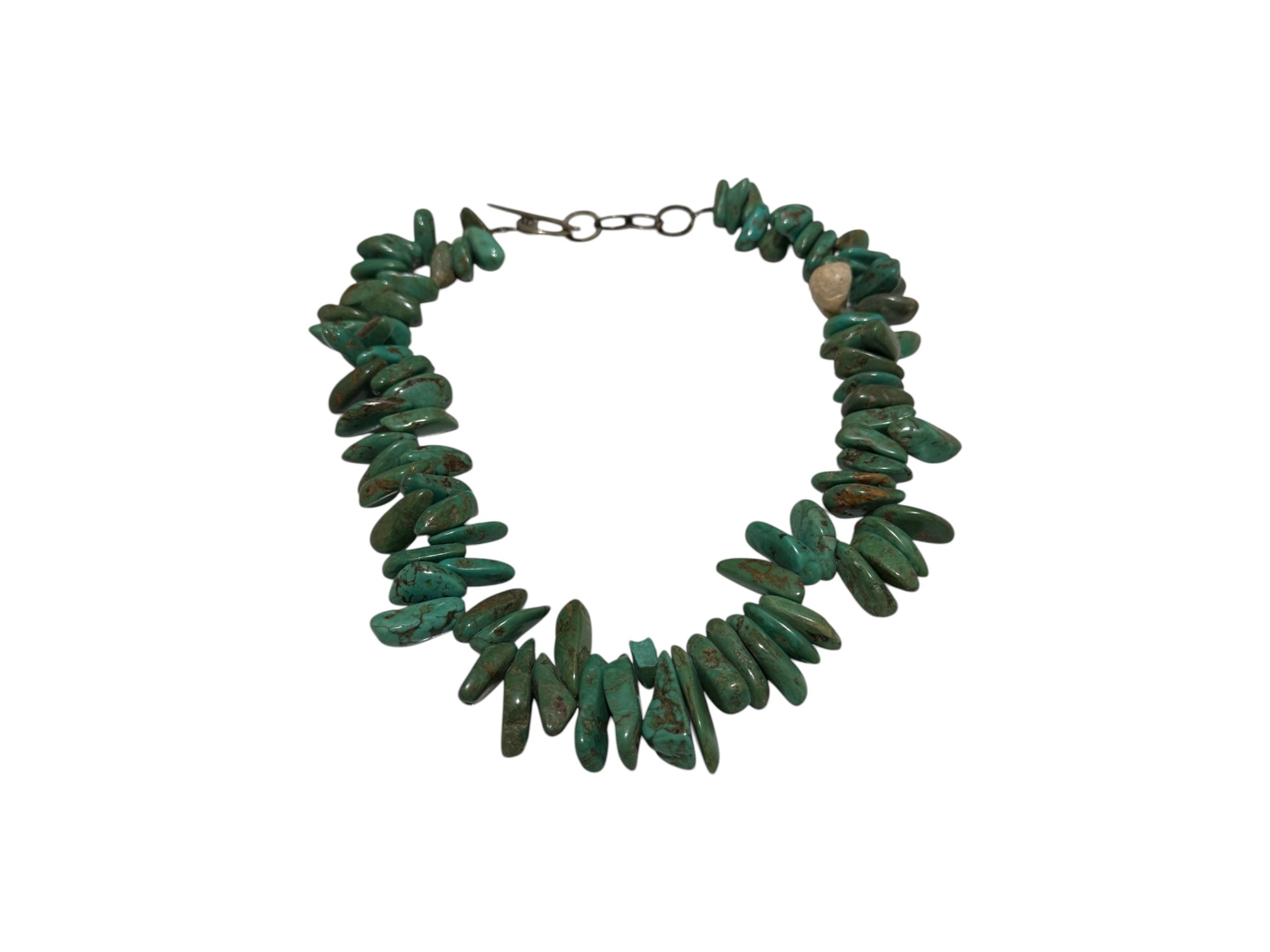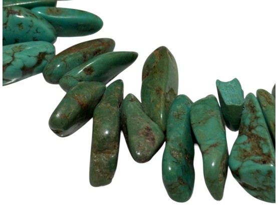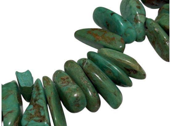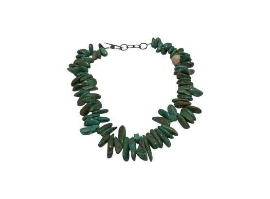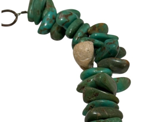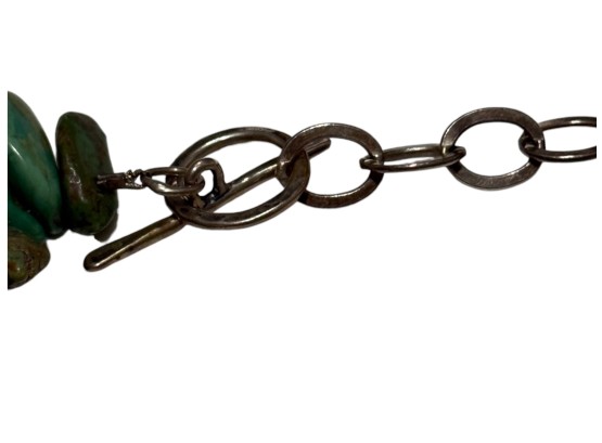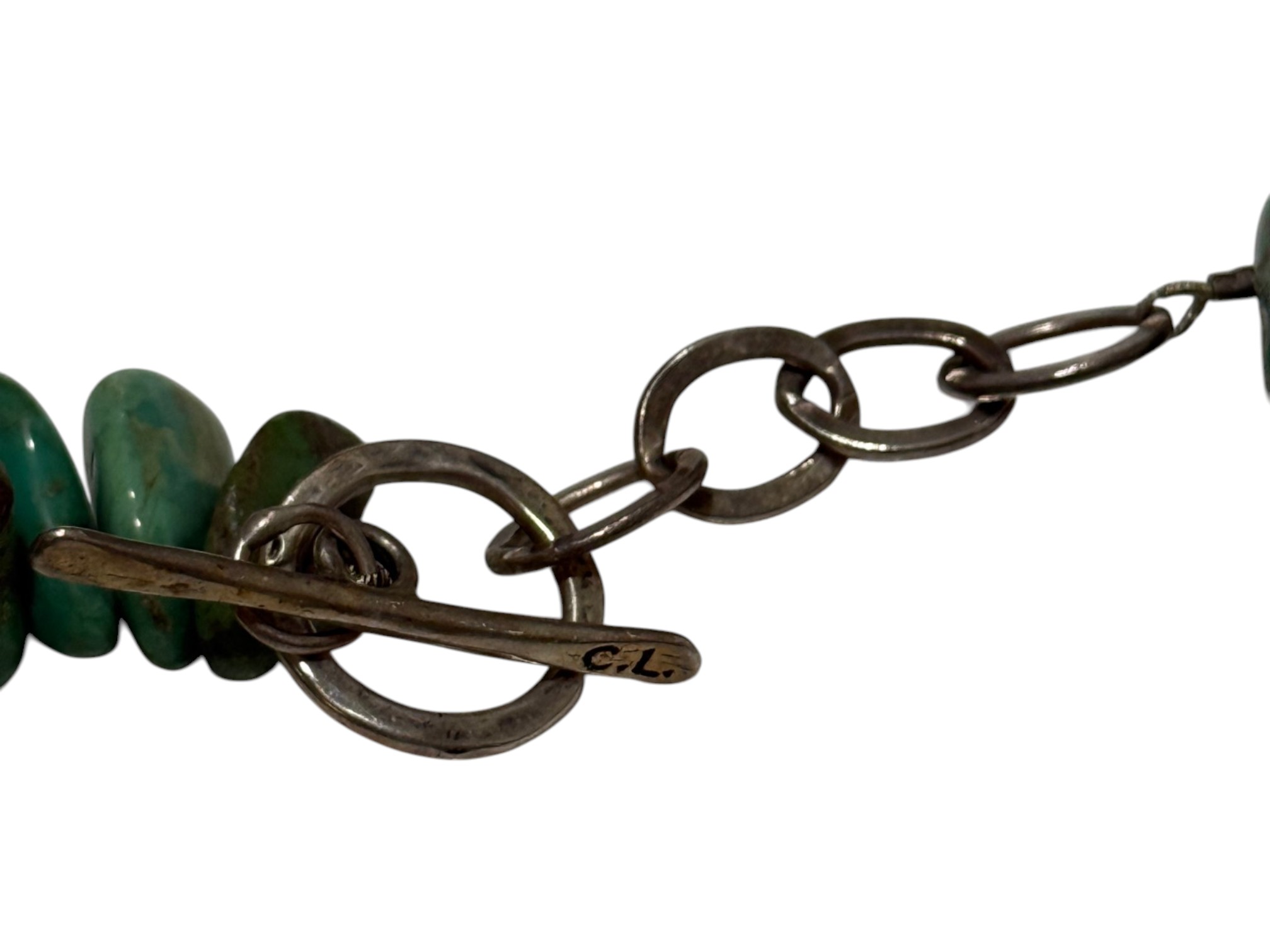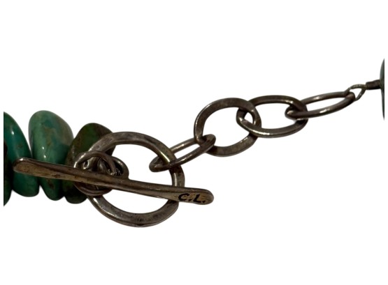 Native American-inspired (possibly of Navajo or Santo Domingo (Kewa) origin) necklace, featuring natural turquoise beads, in irregular, chunky nugget forms. Finished with a sterling silver toggle closure, marked "C.L.".