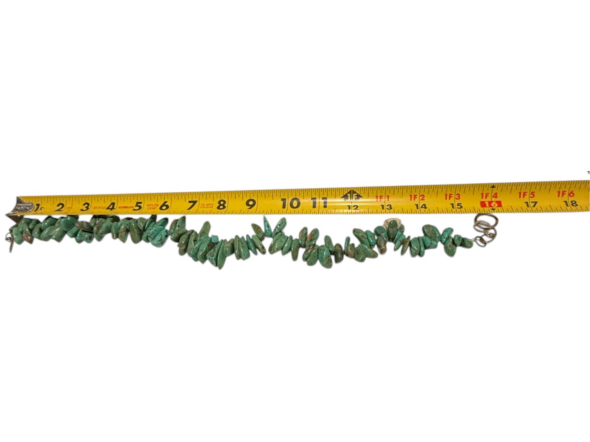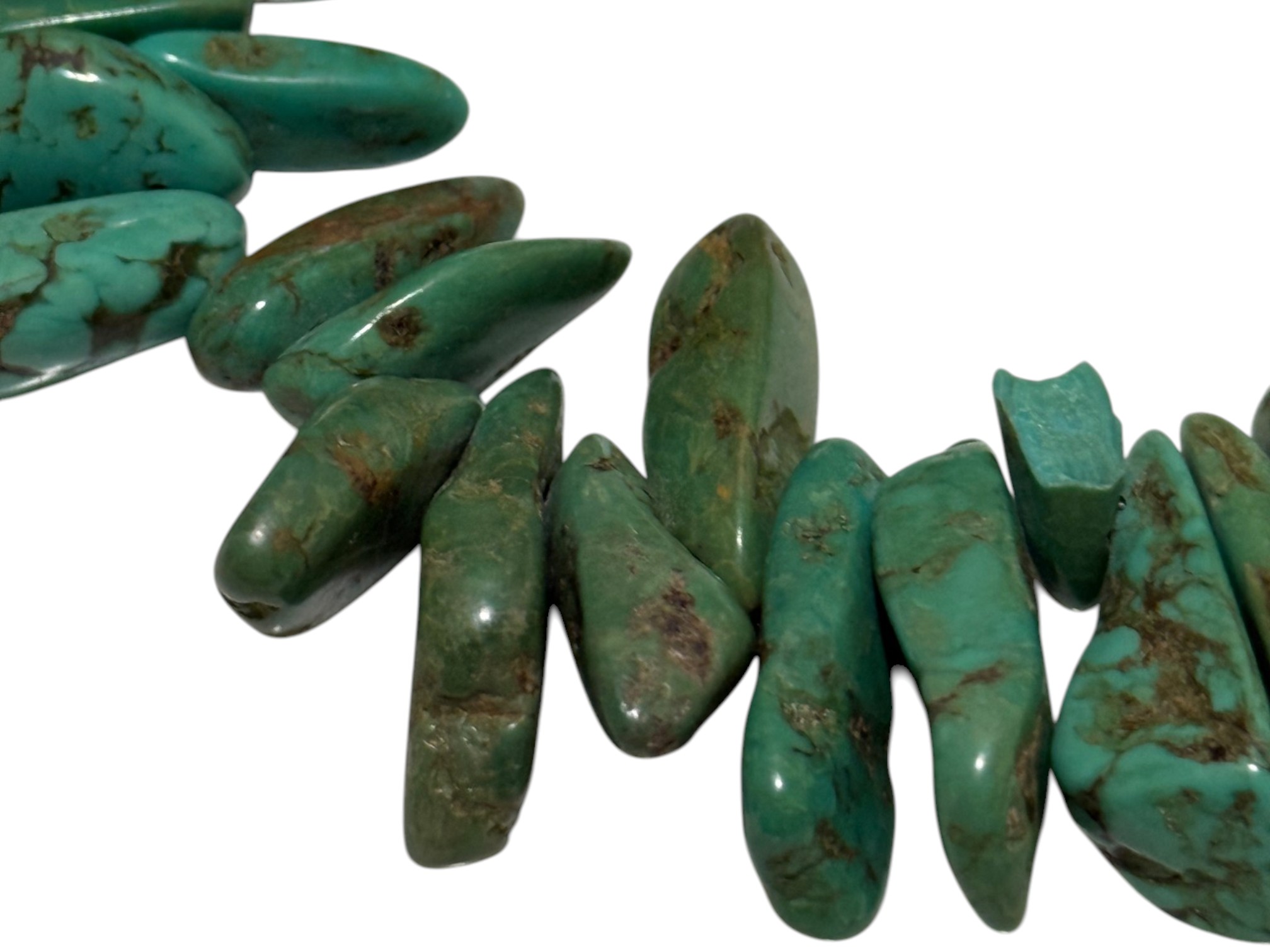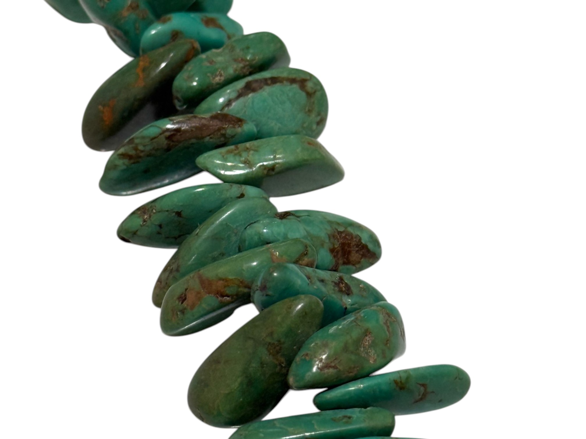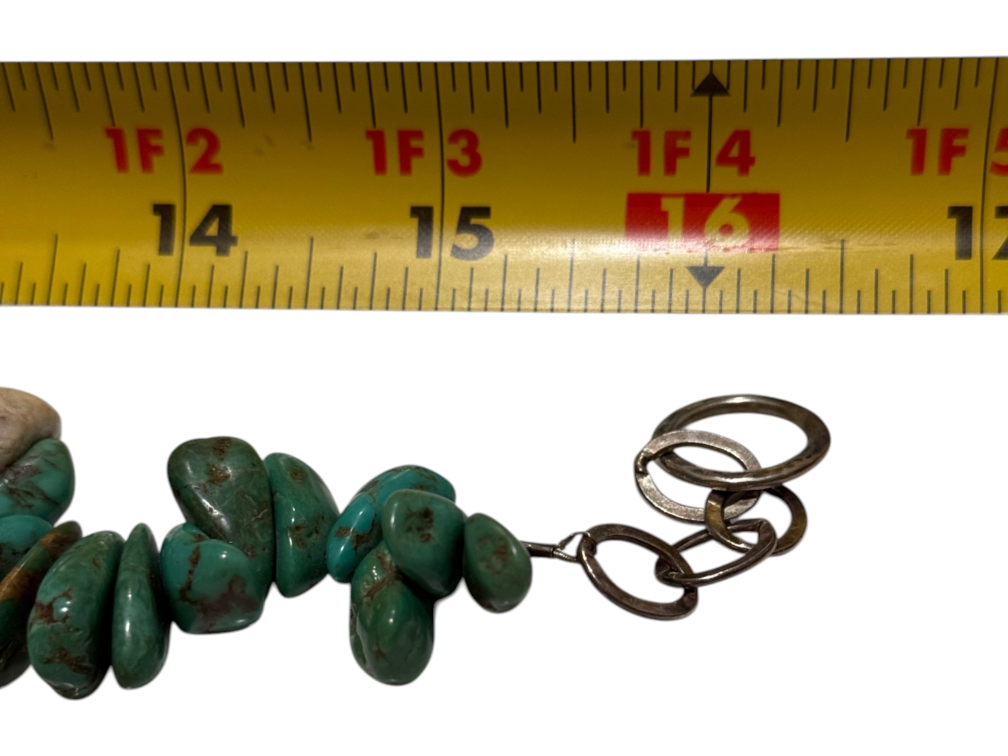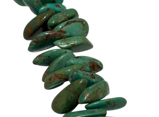 Native American-inspired (possibly of Navajo or Santo Domingo (Kewa) origin) necklace, featuring natural turquoise beads, in irregular, chunky nugget forms. Finished with a sterling silver toggle closure, marked "C.L.".