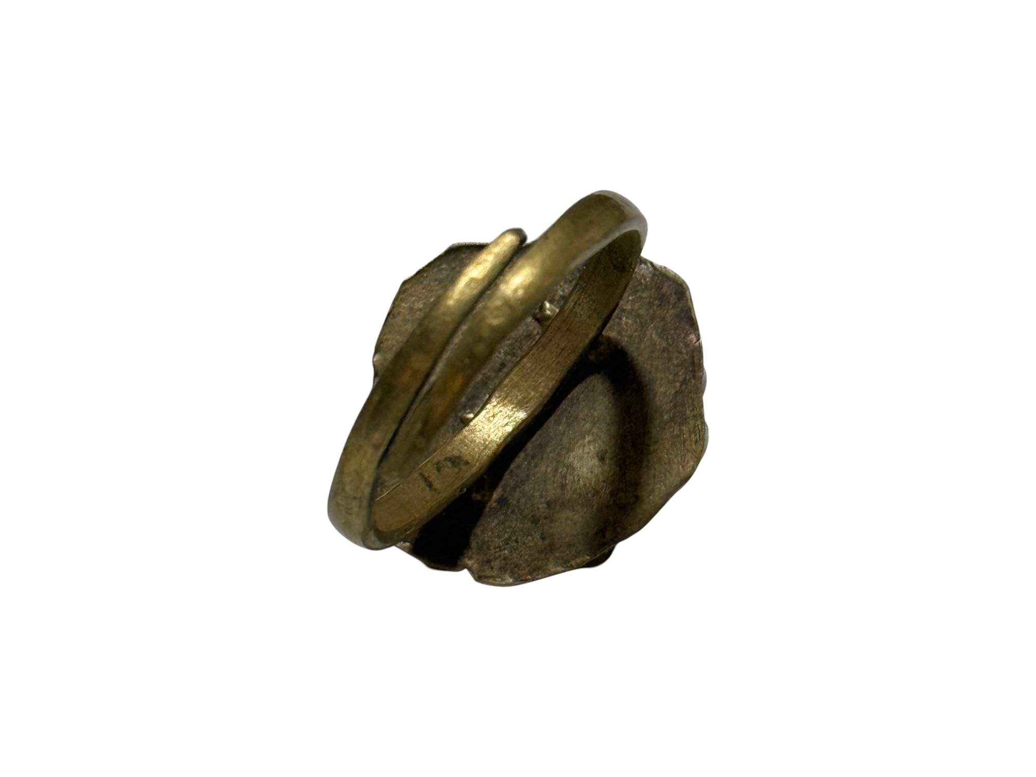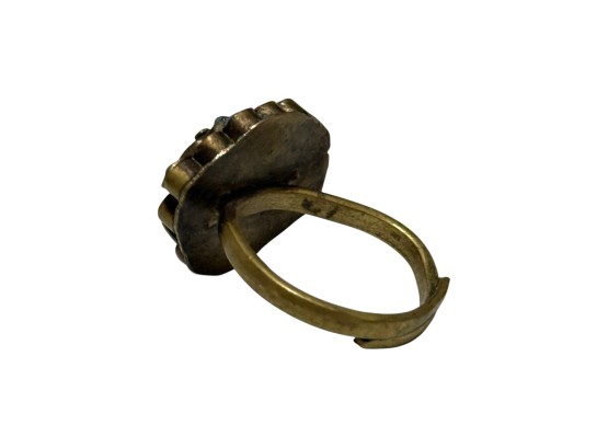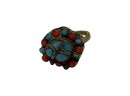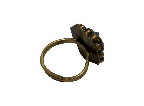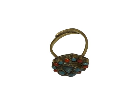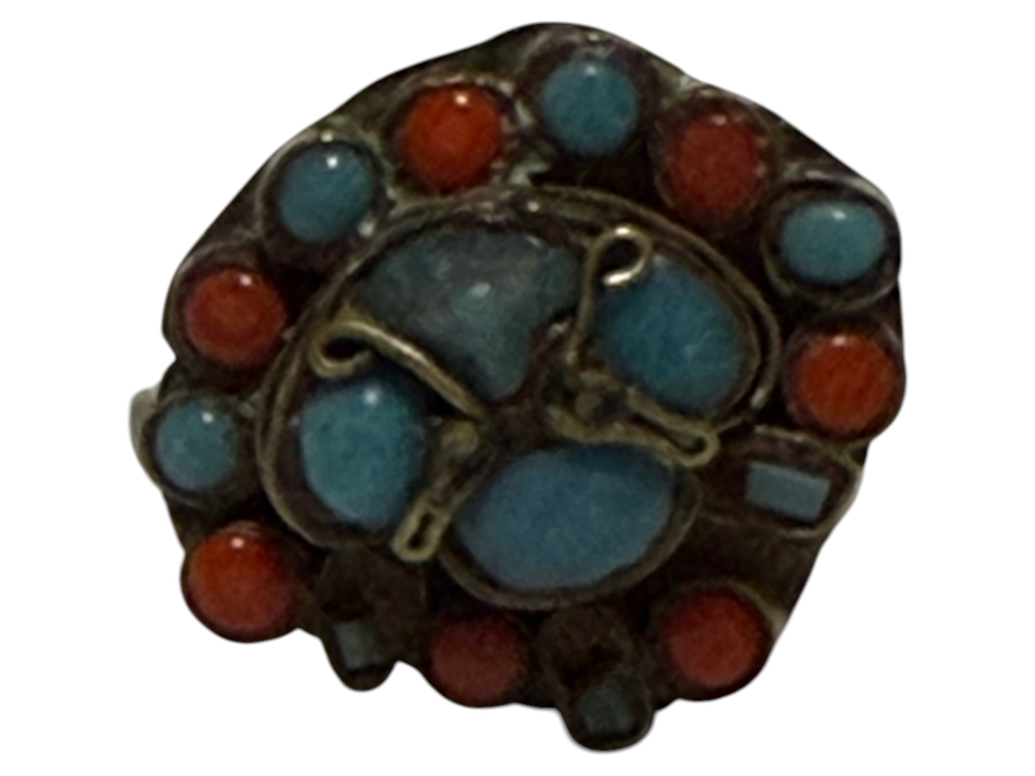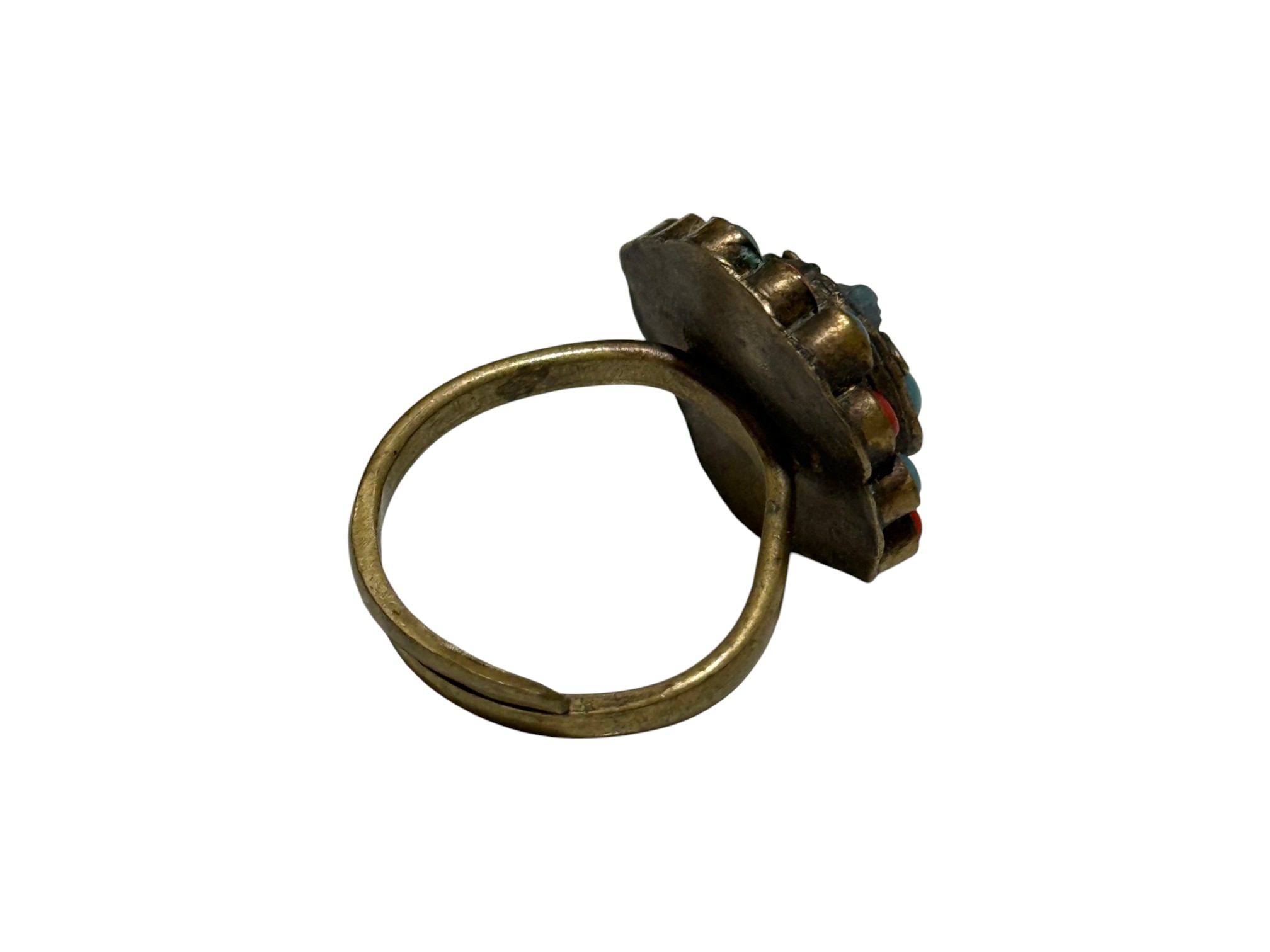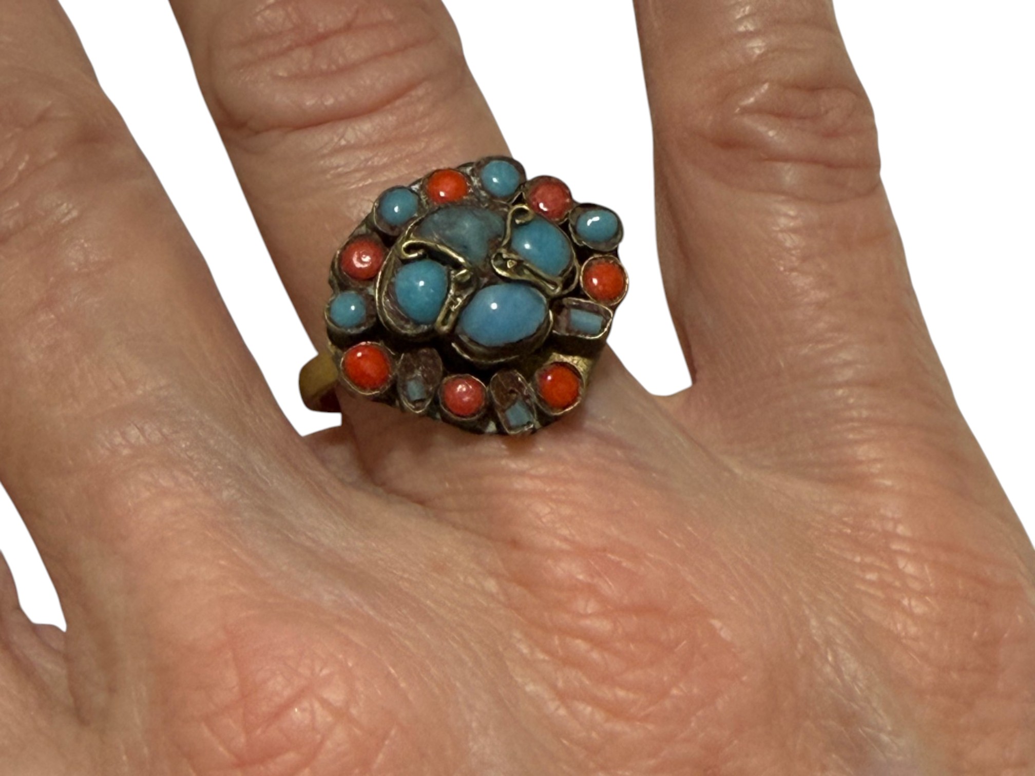 Tibetan-inspired (possibly handmade in Tibet or Nepal) ring featuring traditional turquoise and coral cabochons (gemstones) set in metal.