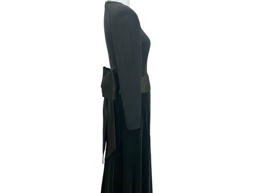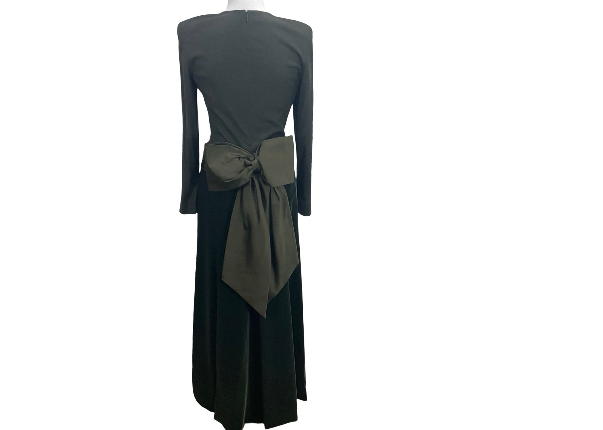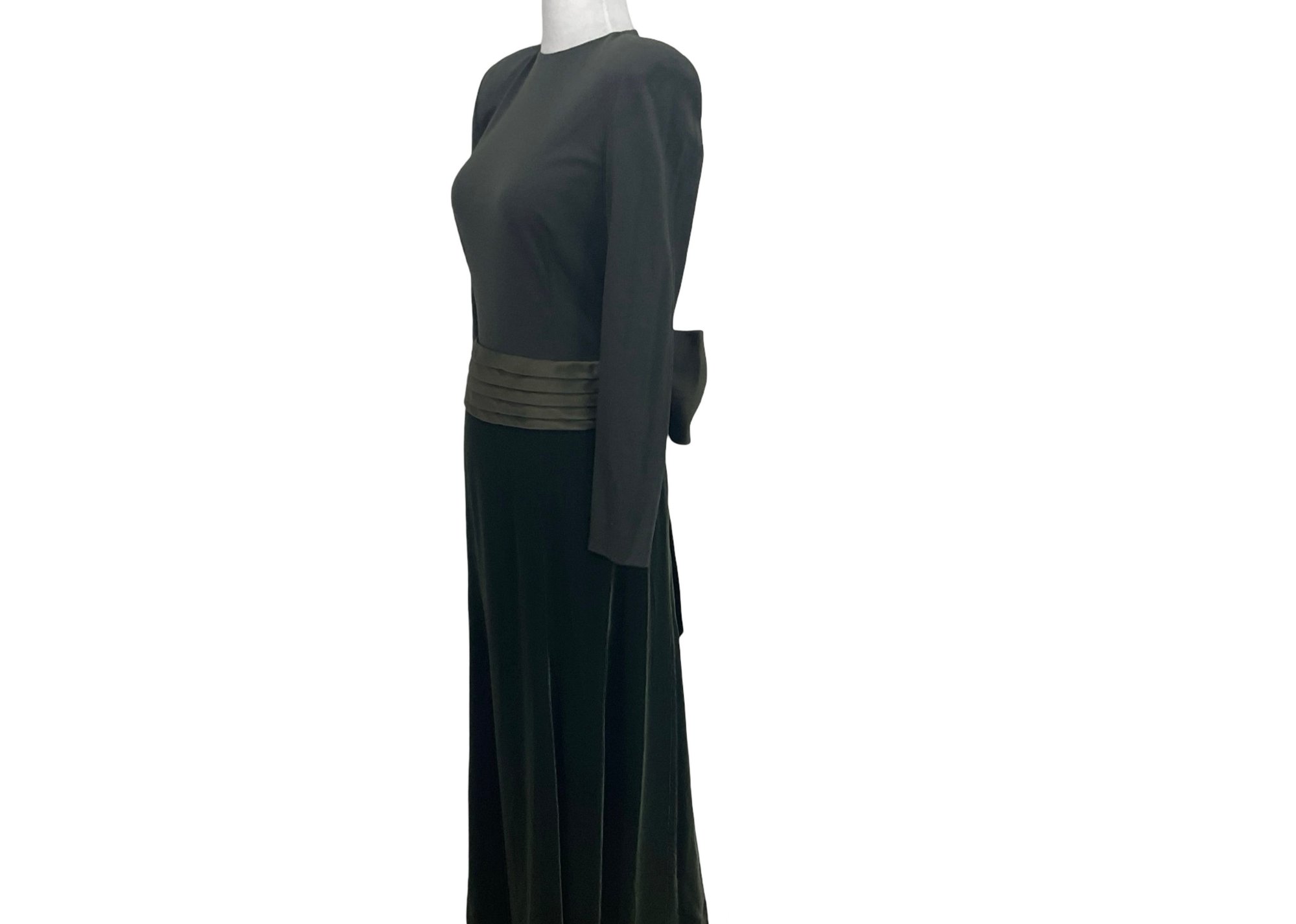 Gown has back zipper and large bow in back, measures 19" across chest, 15" across waist & 58" long