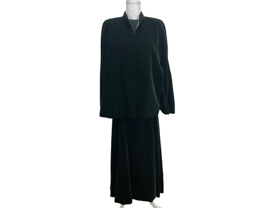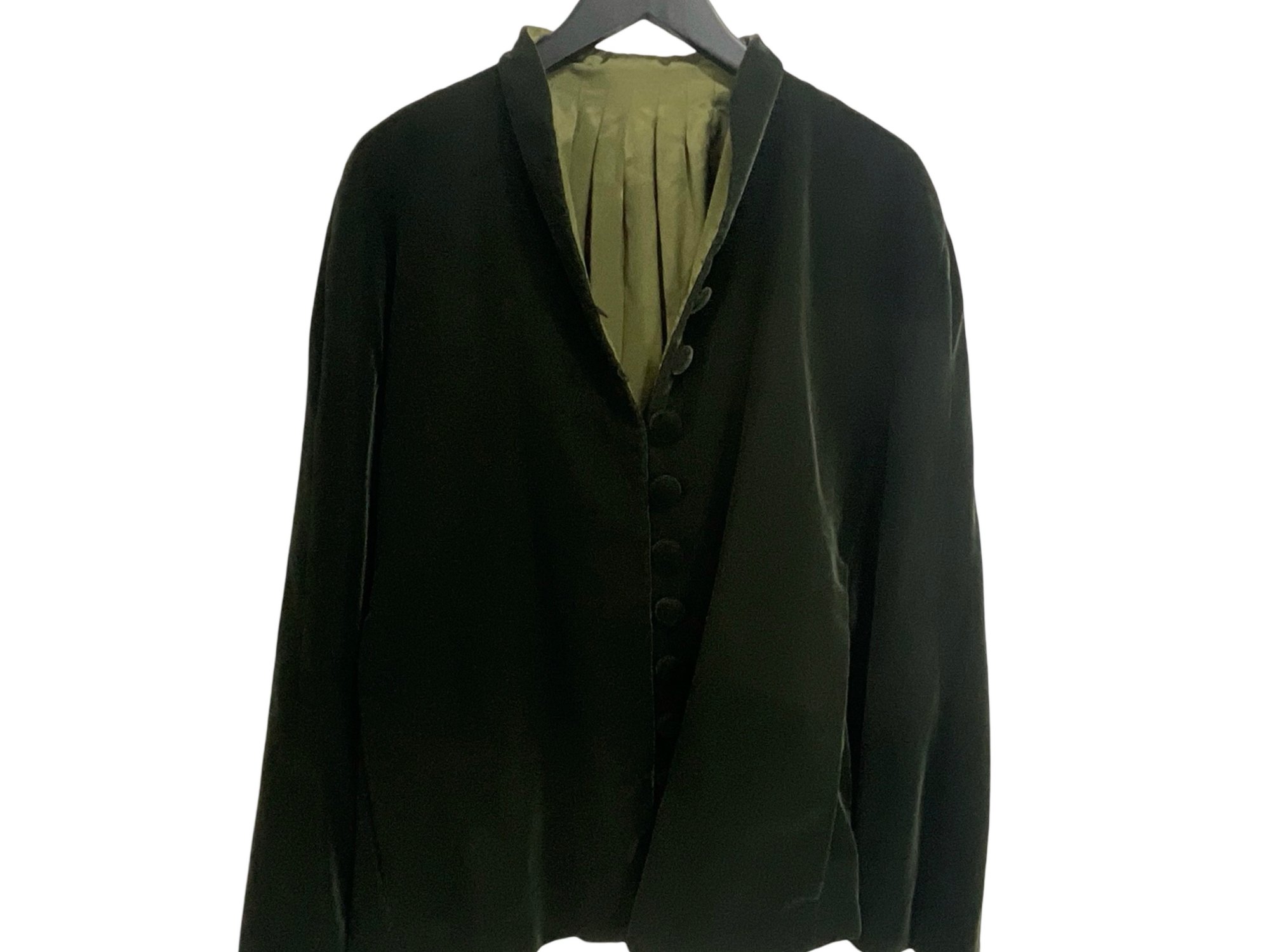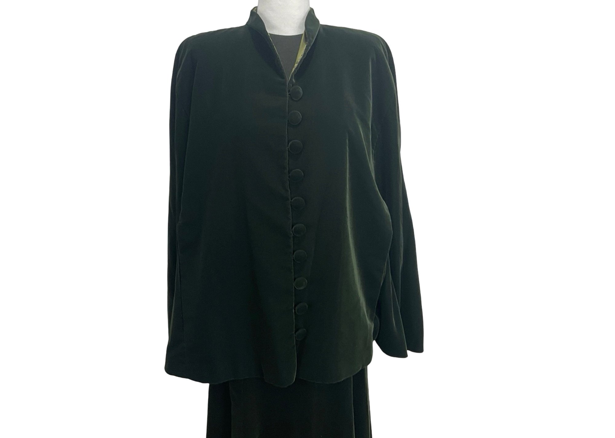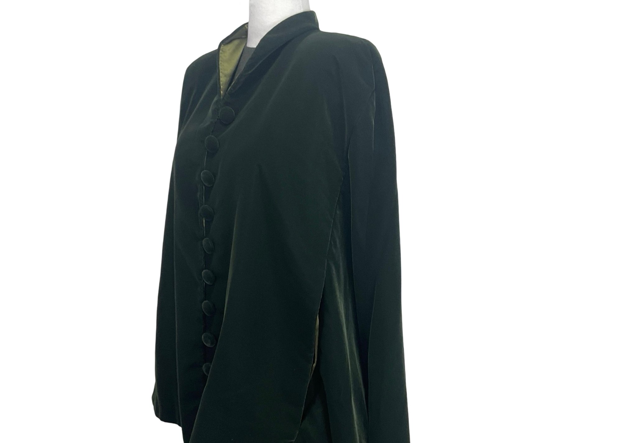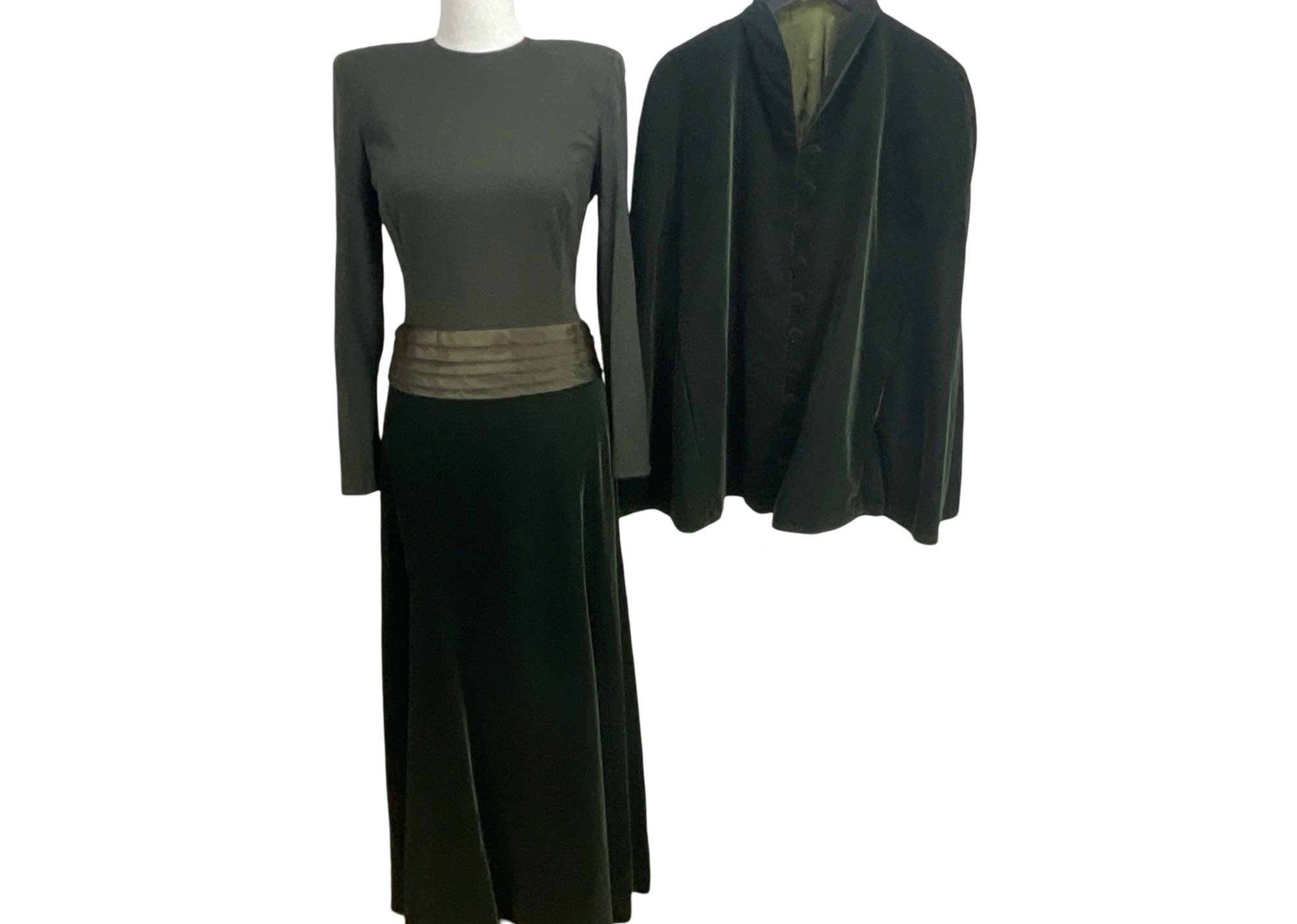 Cape is green velvet that matching bottom of gown, cap measures 29" long