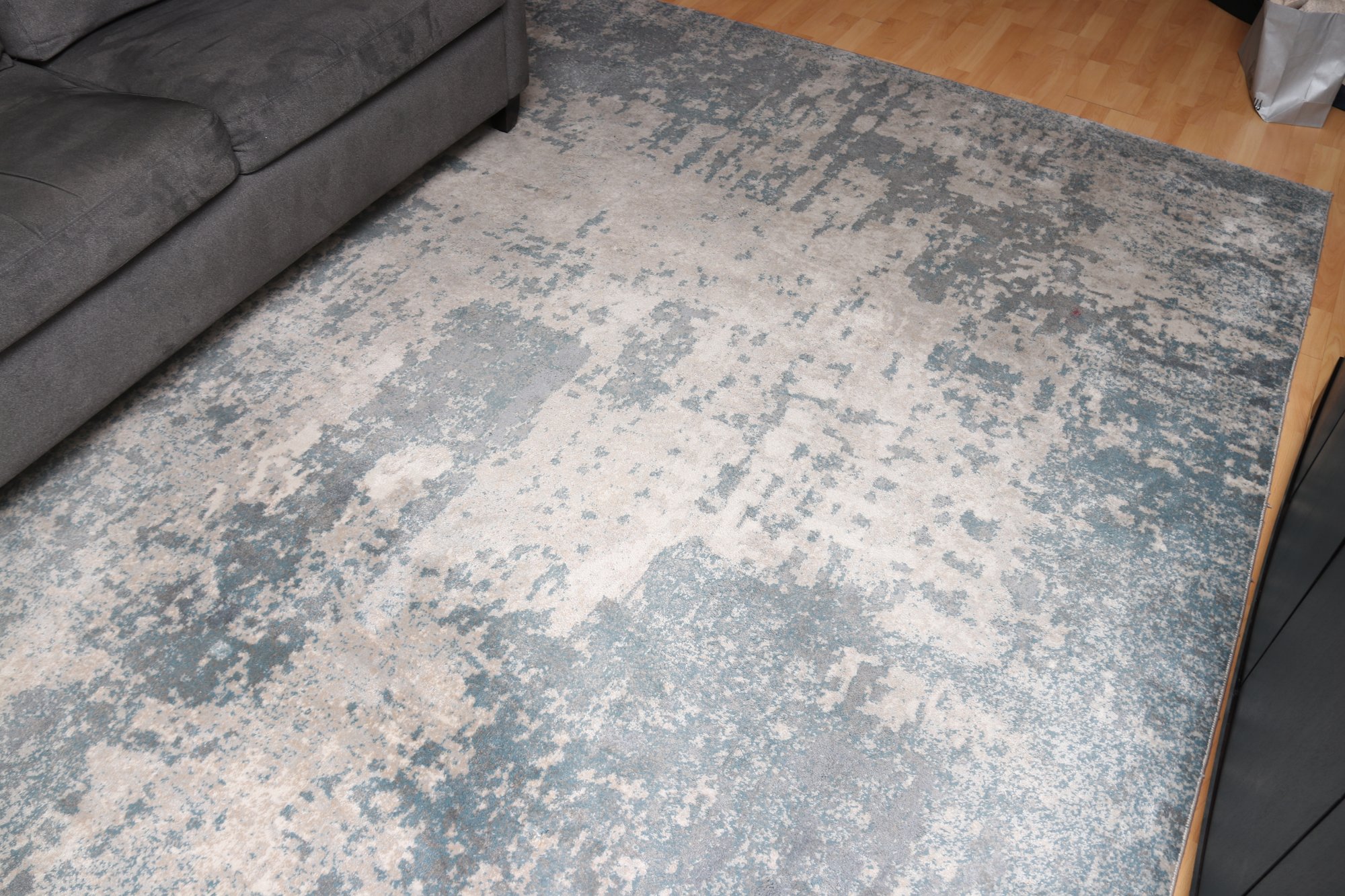 Area rug measures 10'x8' and is in good condition. It is a mix of blues and gray tones.