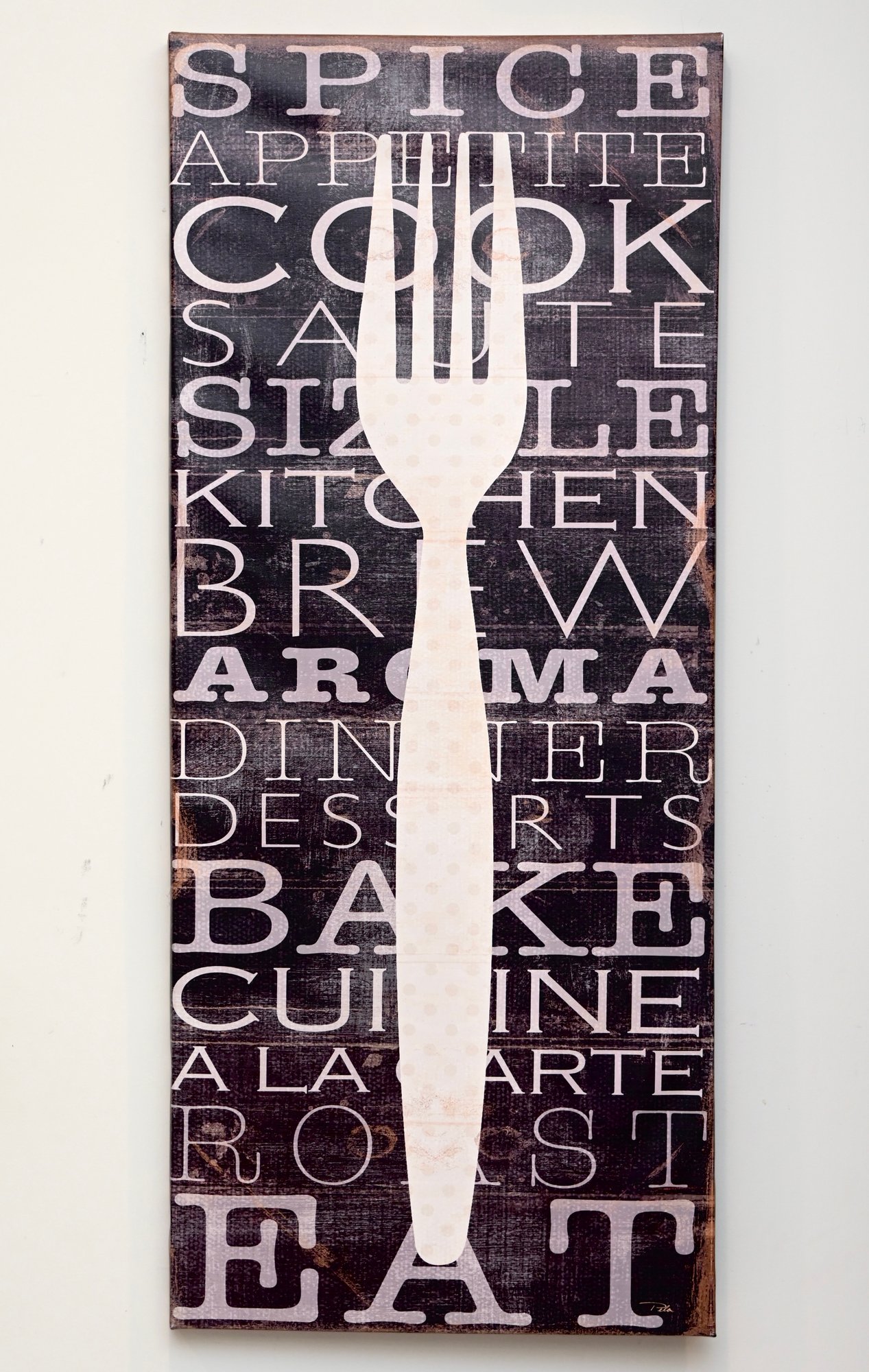 kitchen-themed wall art piece featuring a large, stylized fork silhouette set against a dark, textured background. The background is adorned with an array of culinary-related words such as "SPICE," "APPETITE," "COOK," "BAKE," "CUISINE," and "EAT," arranged in various fonts and sizes, creating a dynamic and layered effect