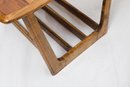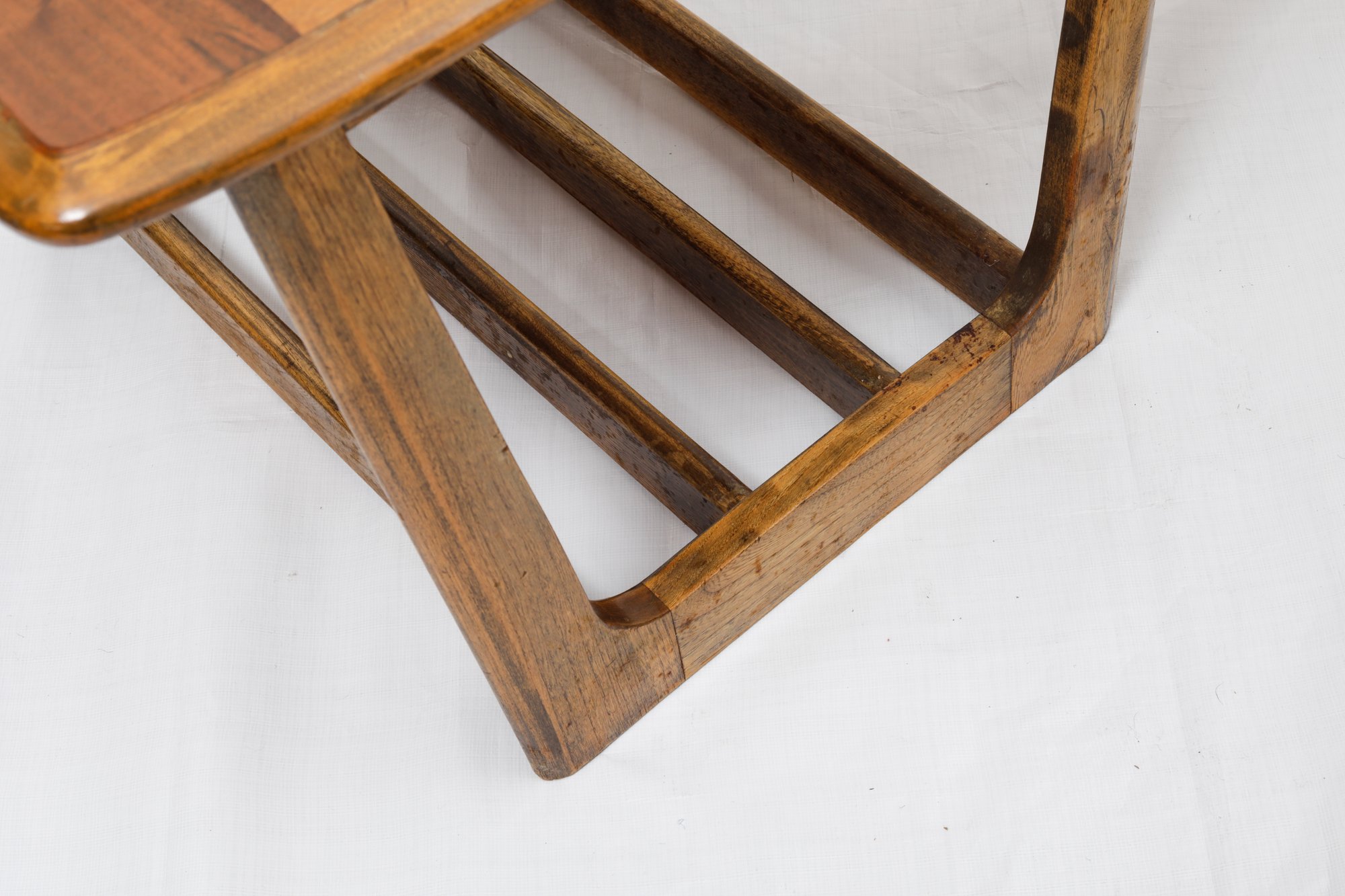 This particular side end table typically features sleek, clean lines and a minimalist design. The "sleigh leg" refers to the distinctive shape of the table legs, resembling the curved, scrolled legs of a sleigh. The legs are often made of walnut, a popular wood choice during the mid-century modern period known for its warmth and rich tones.good condition with minor wear to the top as seen in photos