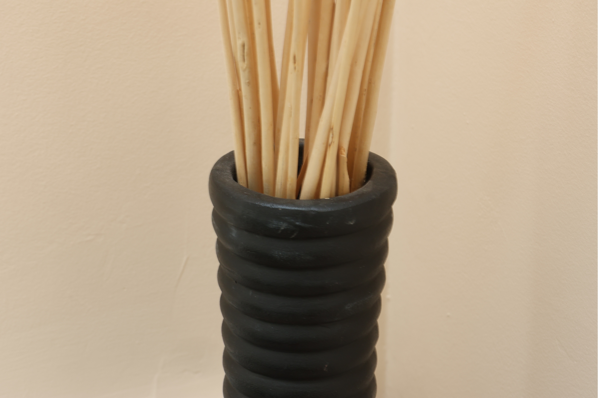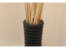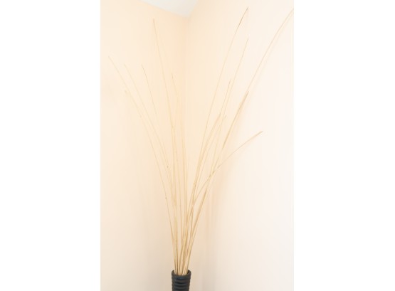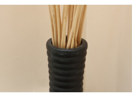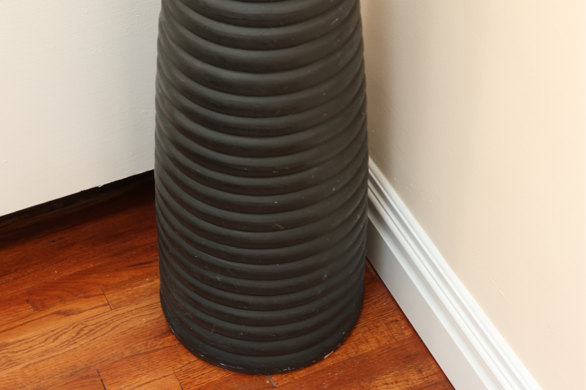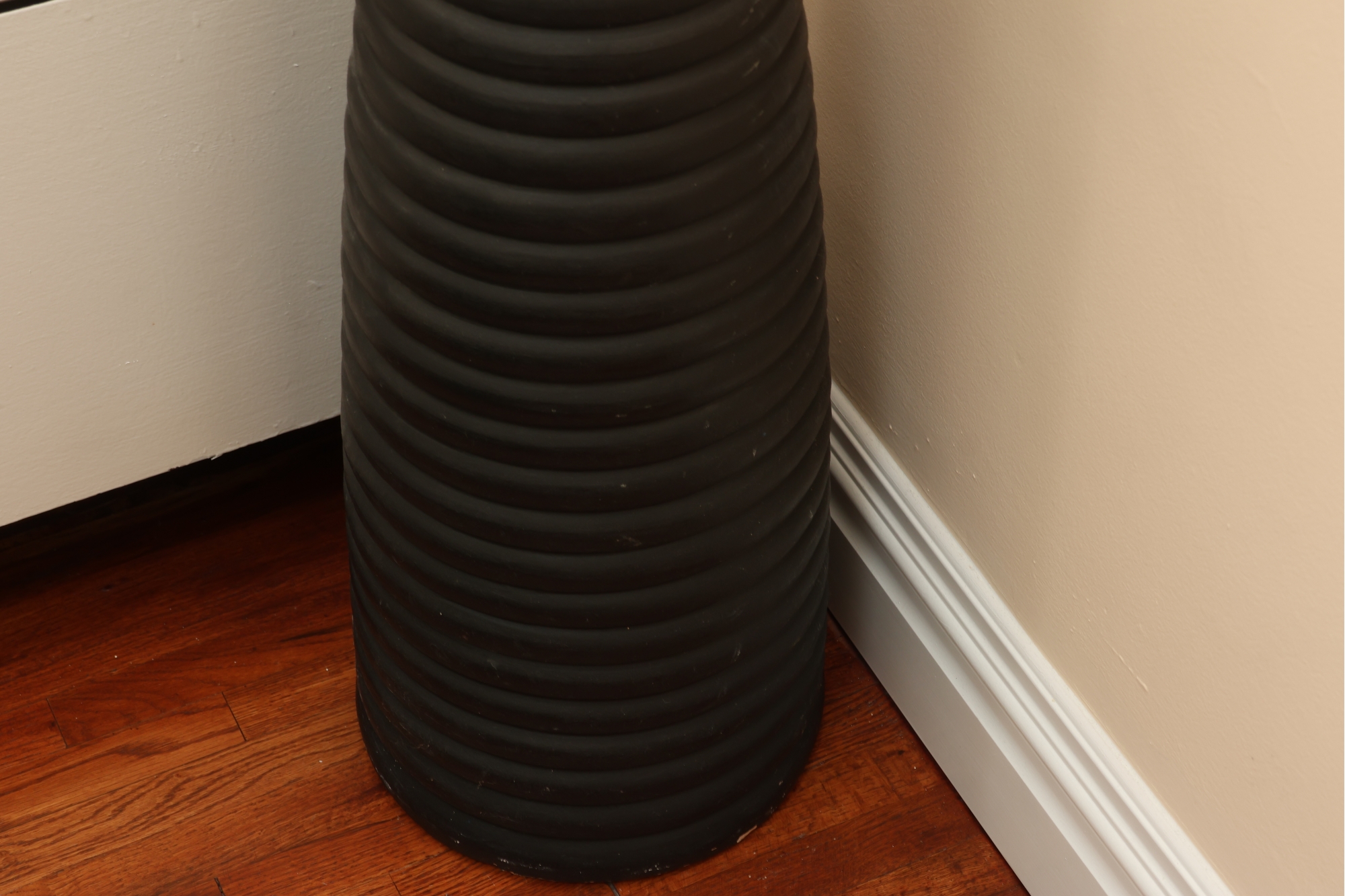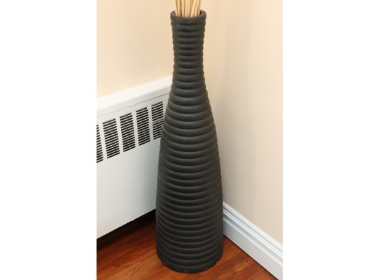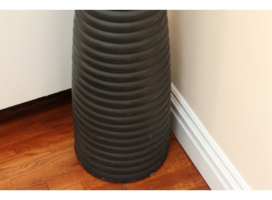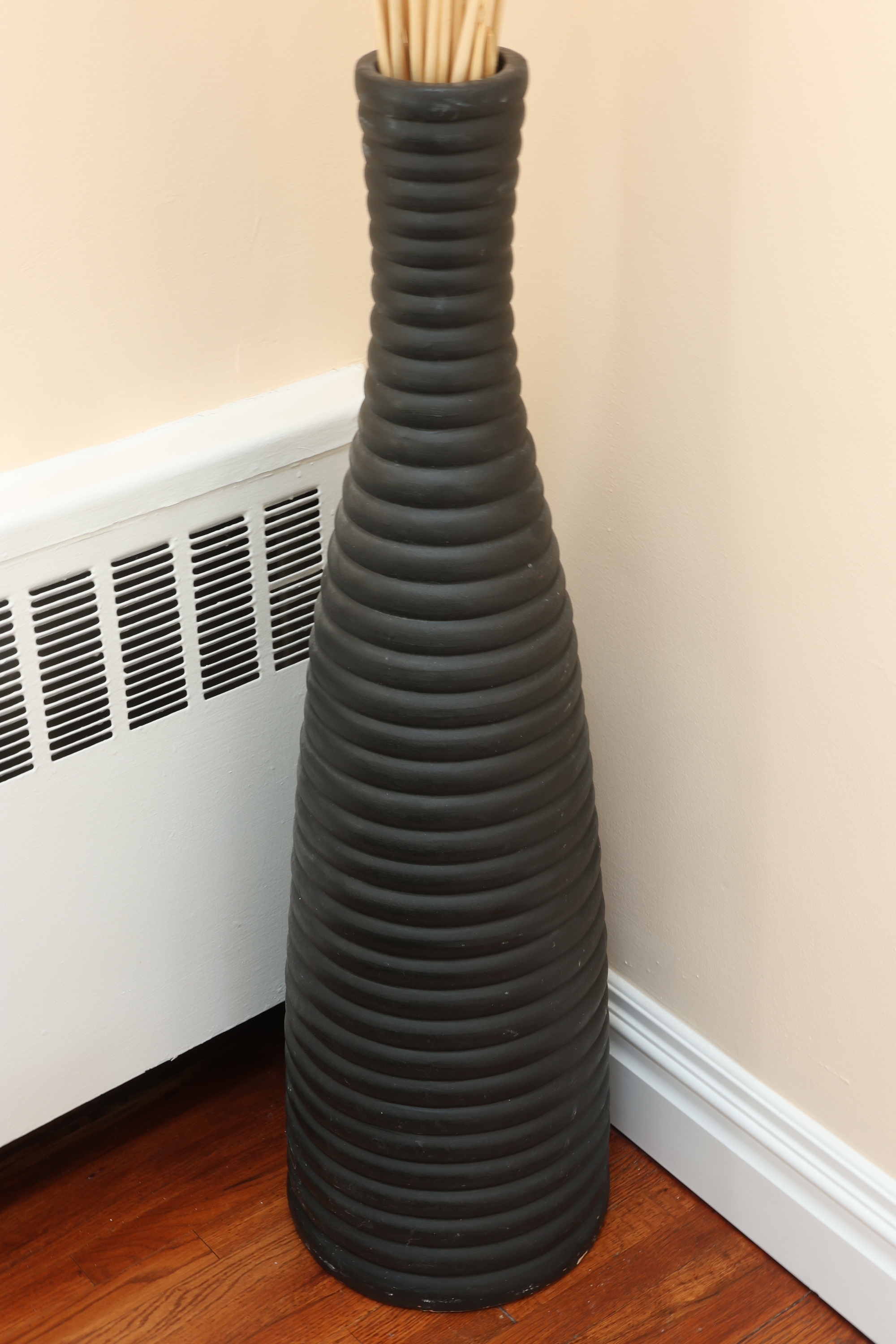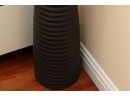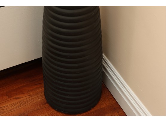 This is a tall, black ceramic floor vase with a distinctive ribbed texture throughout its tapered body. The vase measures approximately 36 inches tall with an 11 x 11 inch square base diameter, featuring a narrowing neck and wide opening. Its matte dark finish and horizontal ridges create a modern, sculptural aesthetic.