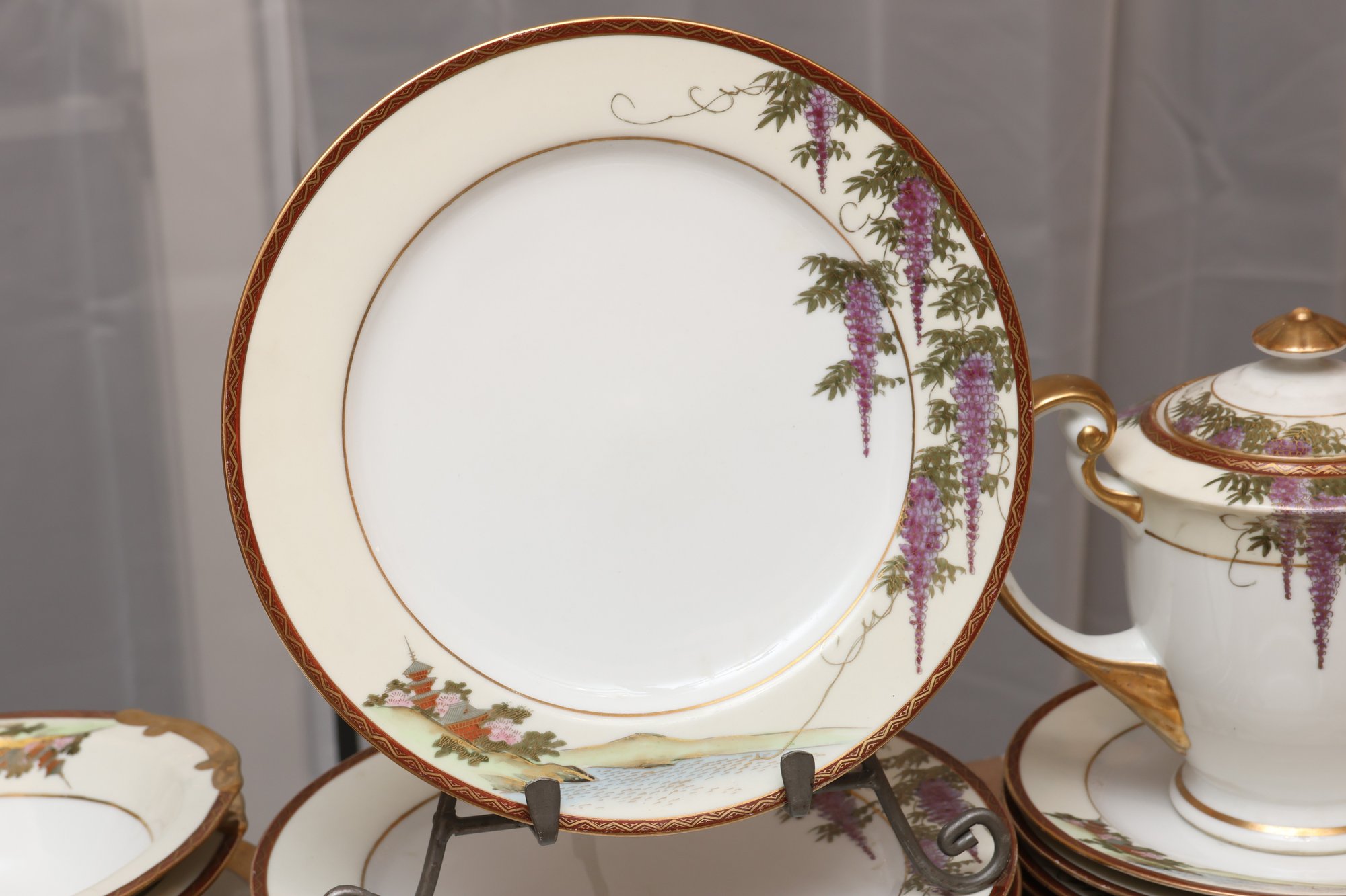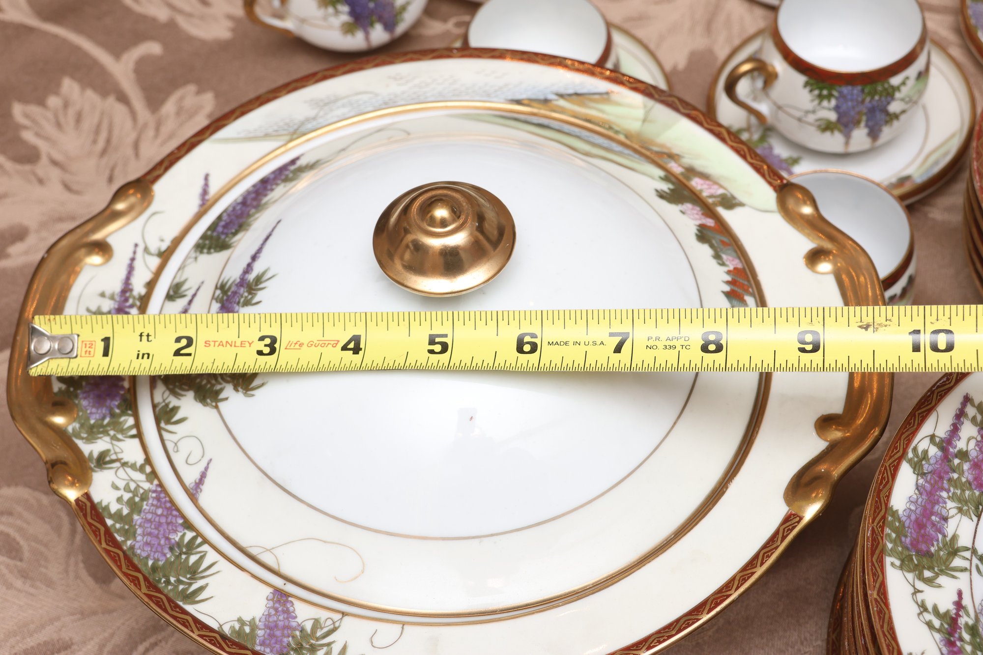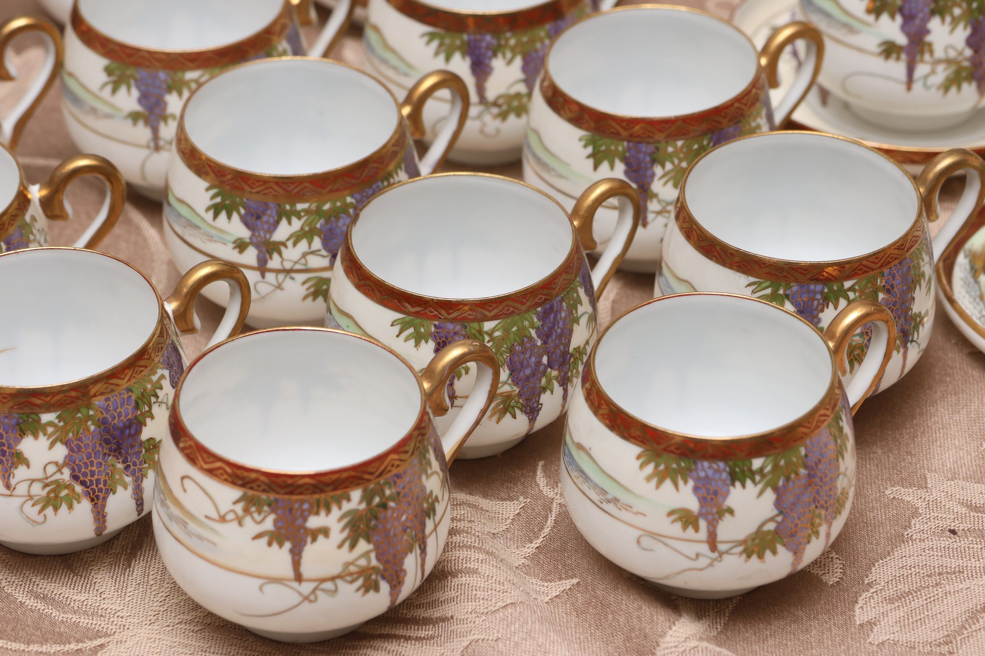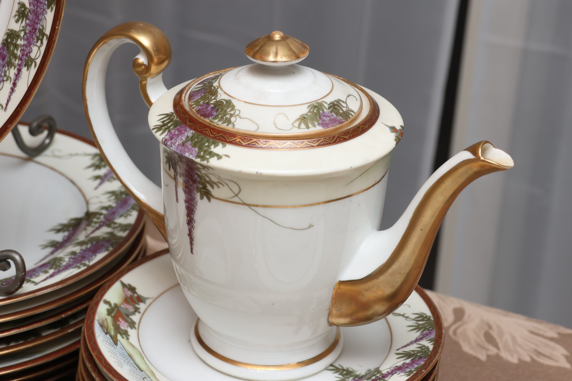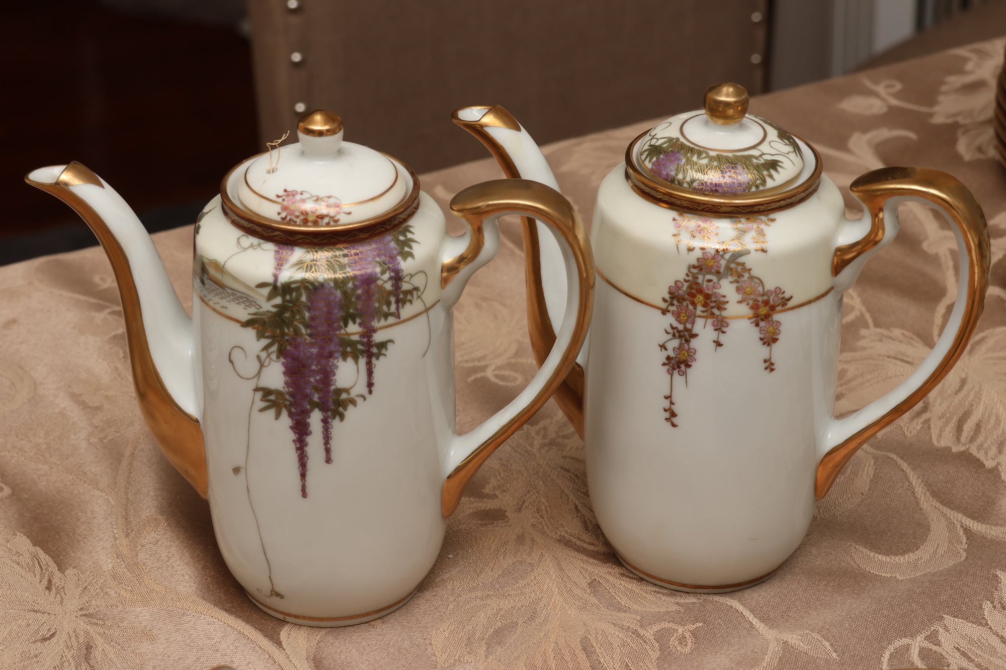 This expansive porcelain dinnerware and tea service features a beautiful purple wisteria or grape vine motif on a creamy white background, elegantly accented with gold trim. The comprehensive set includes a coffee/tea pot, a covered tureen, two oval serving bowls, numerous individual bowls, various dinner and salad plates, and a large collection of cups with matching saucers. Crafted from fine china, the pieces exhibit gilded edges and handles, creating a cohesive and classic aesthetic suitable for a grand table setting.