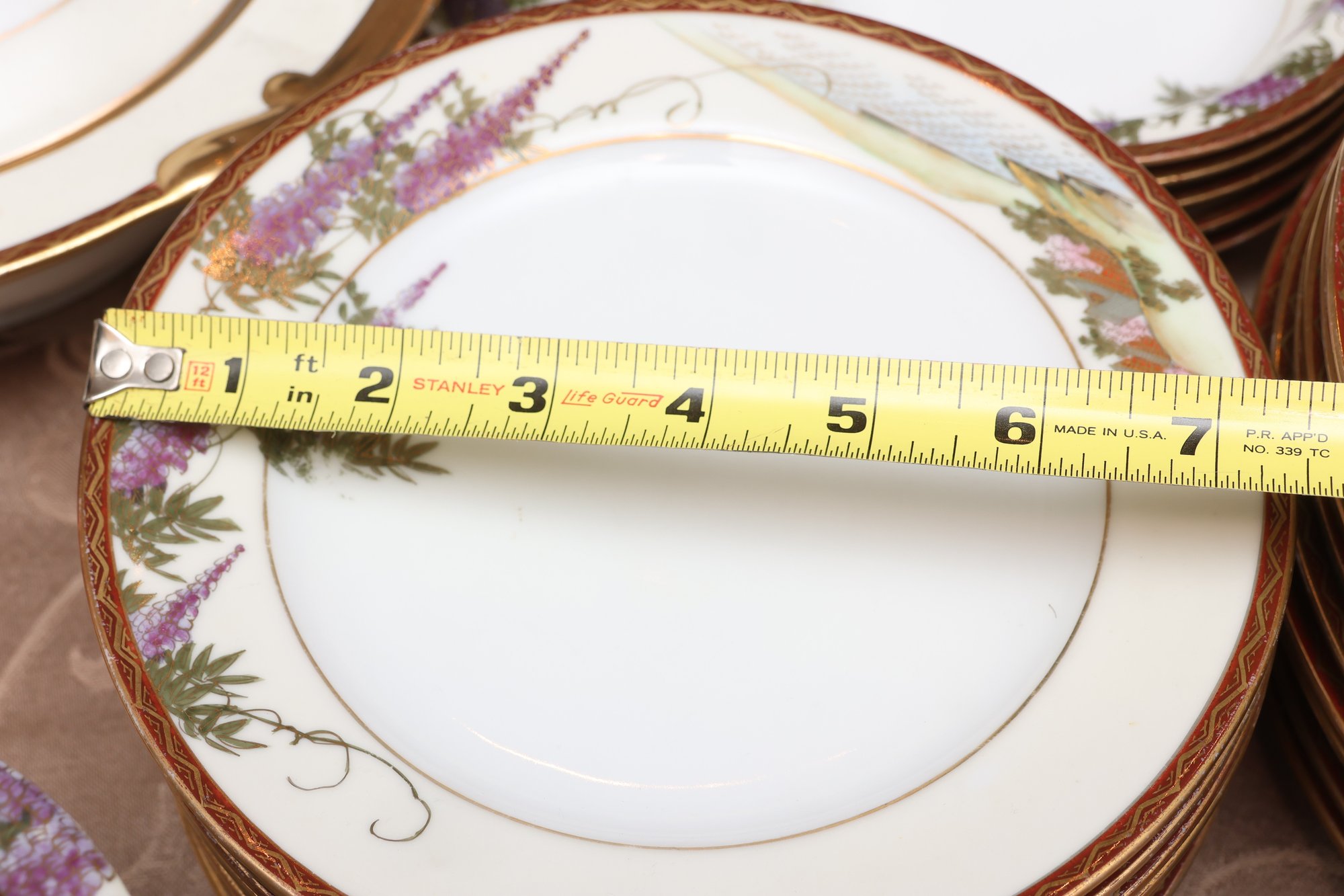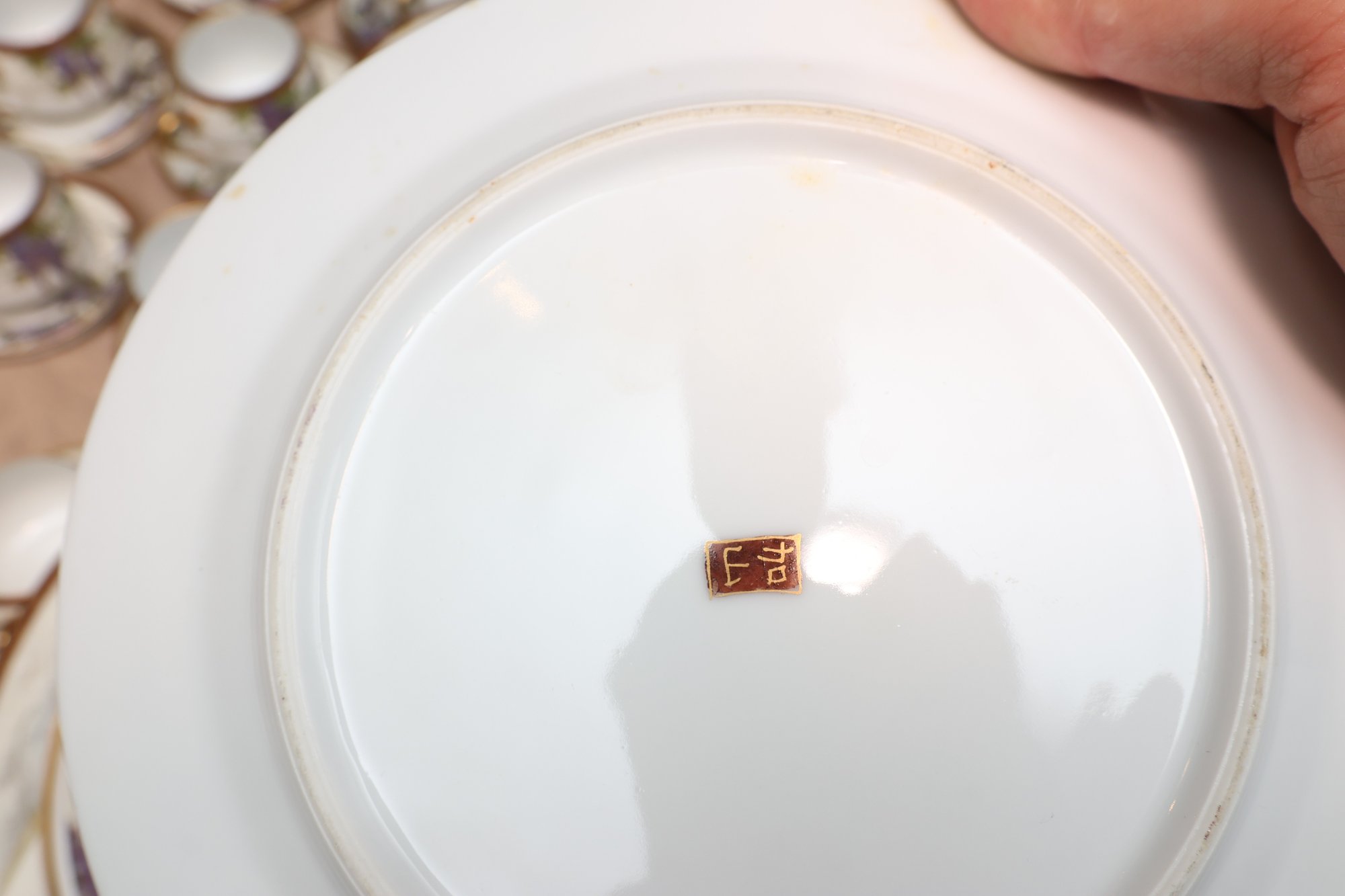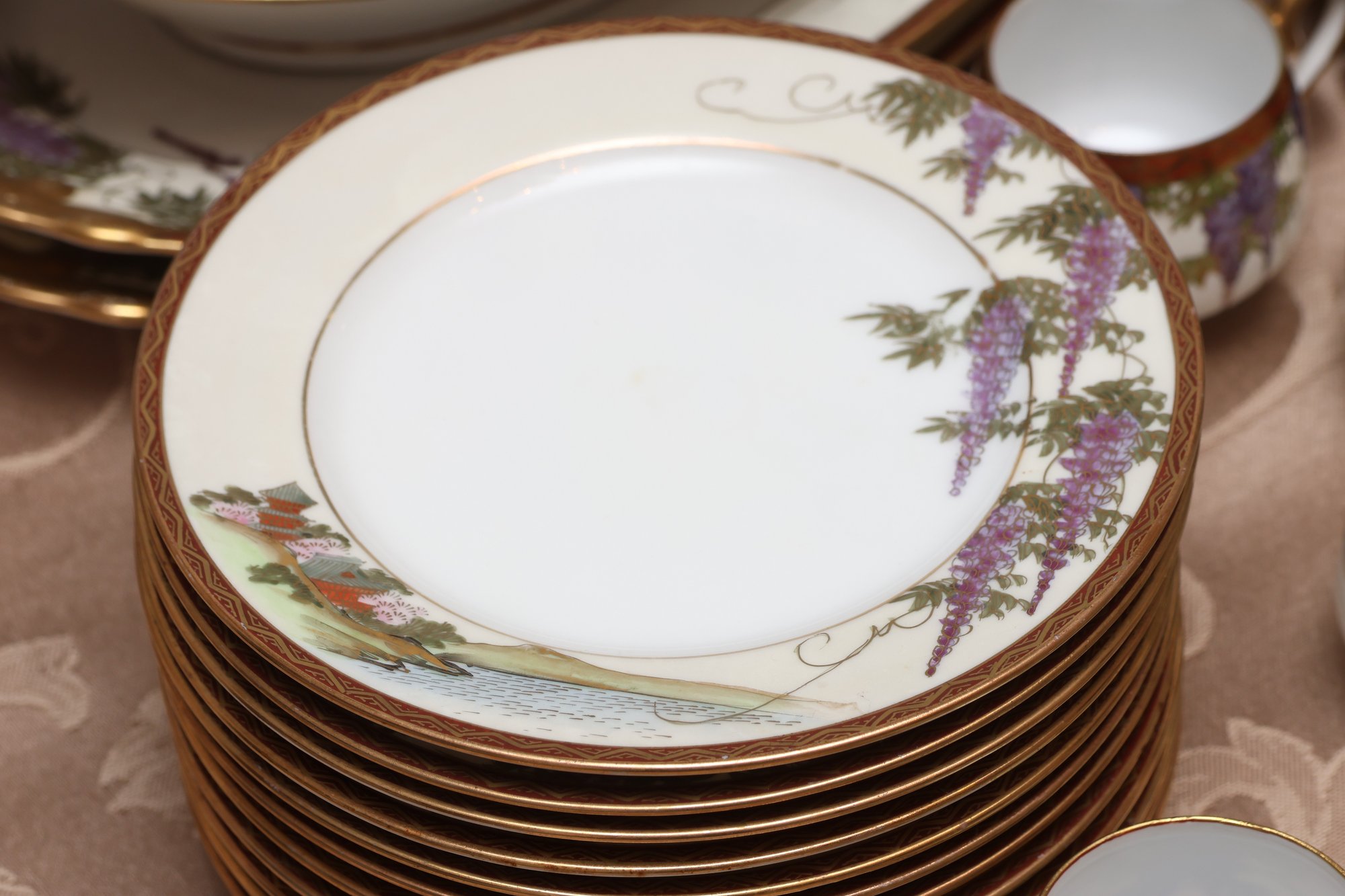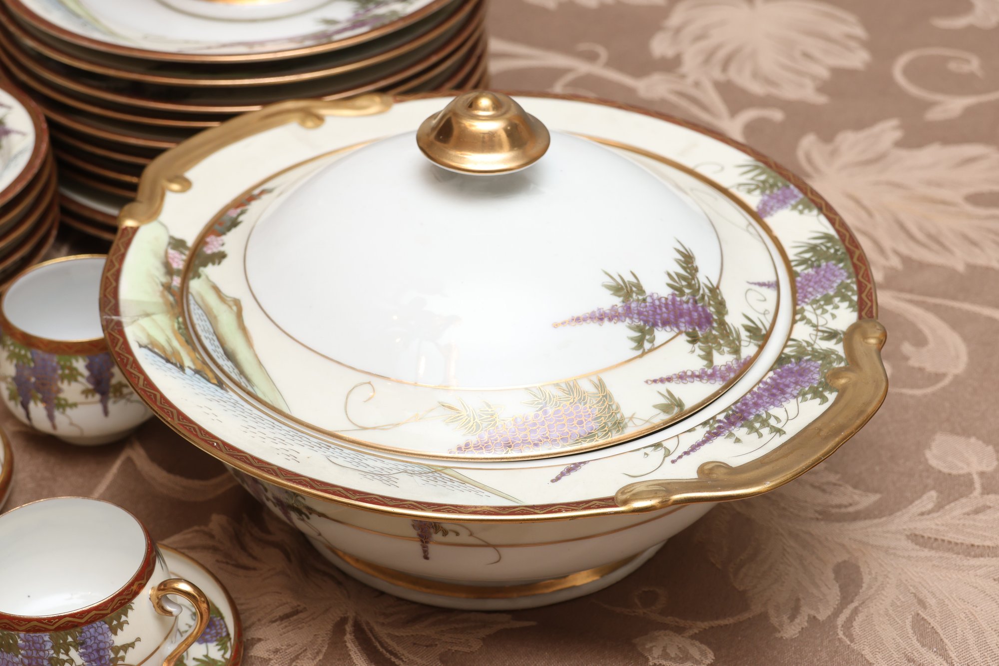 This expansive porcelain dinnerware and tea service features a beautiful purple wisteria or grape vine motif on a creamy white background, elegantly accented with gold trim. The comprehensive set includes a coffee/tea pot, a covered tureen, two oval serving bowls, numerous individual bowls, various dinner and salad plates, and a large collection of cups with matching saucers. Crafted from fine china, the pieces exhibit gilded edges and handles, creating a cohesive and classic aesthetic suitable for a grand table setting.