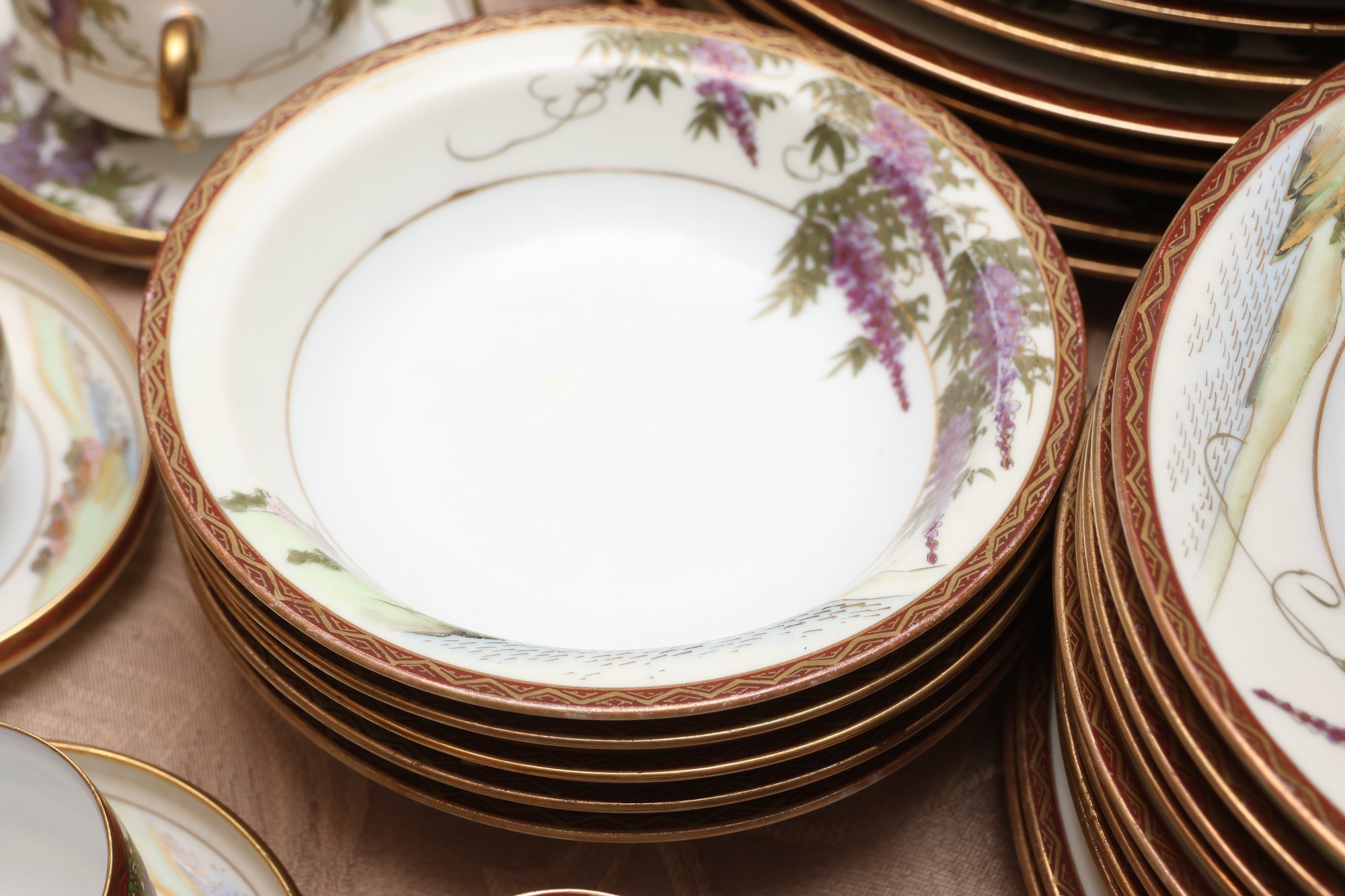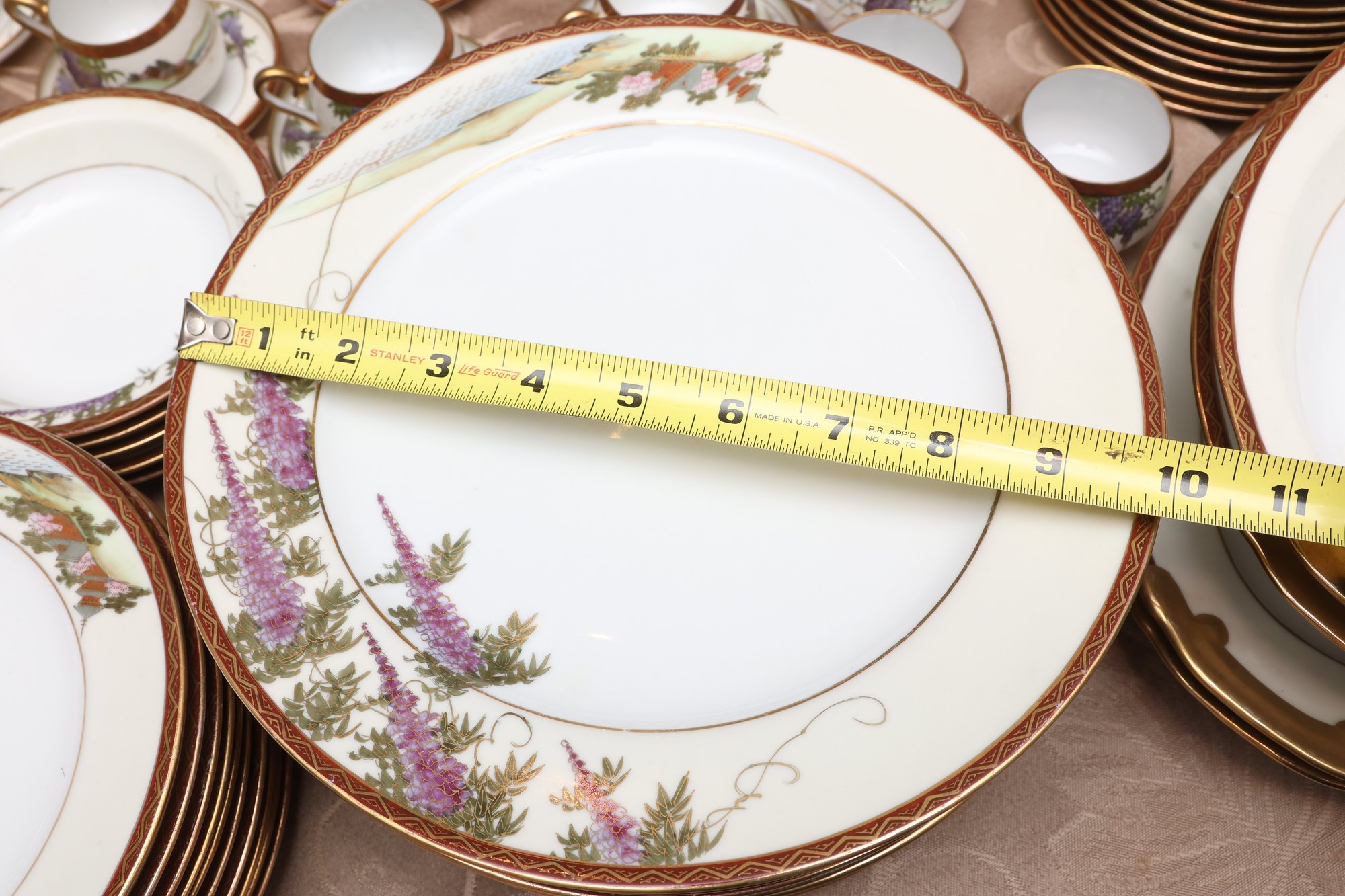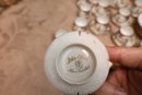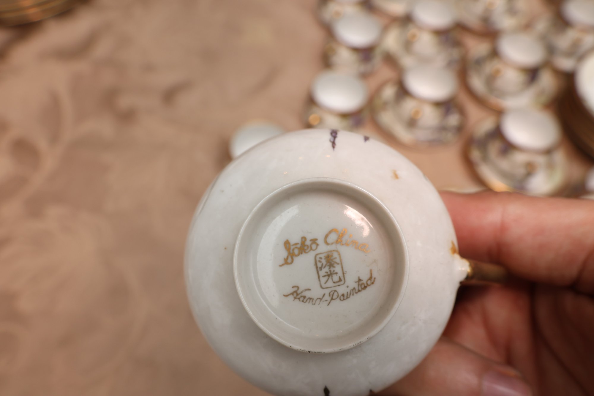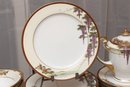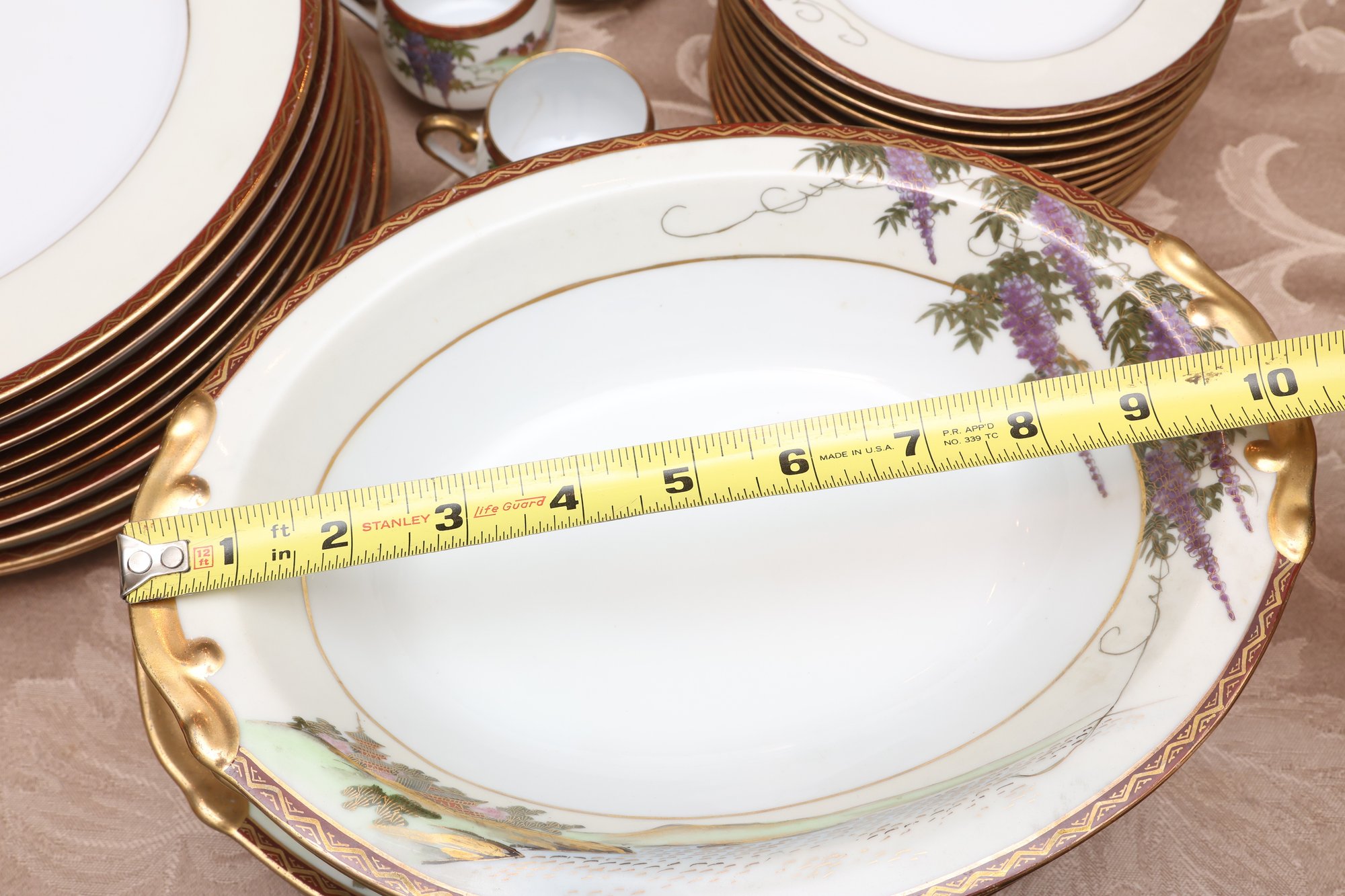 This expansive porcelain dinnerware and tea service features a beautiful purple wisteria or grape vine motif on a creamy white background, elegantly accented with gold trim. The comprehensive set includes a coffee/tea pot, a covered tureen, two oval serving bowls, numerous individual bowls, various dinner and salad plates, and a large collection of cups with matching saucers. Crafted from fine china, the pieces exhibit gilded edges and handles, creating a cohesive and classic aesthetic suitable for a grand table setting.