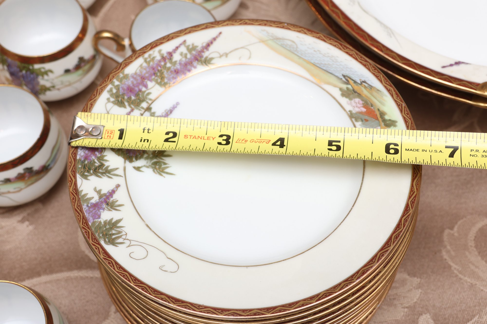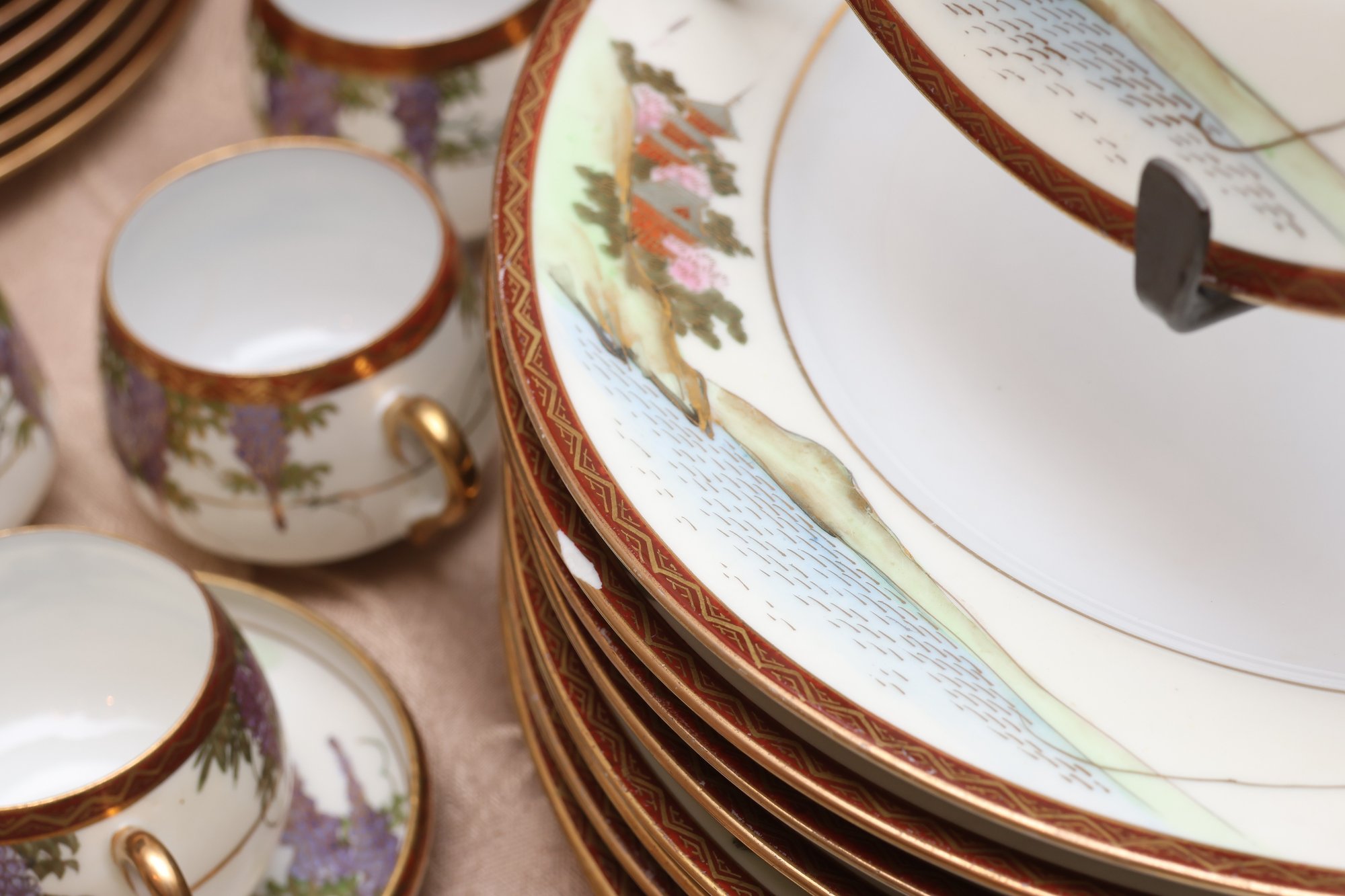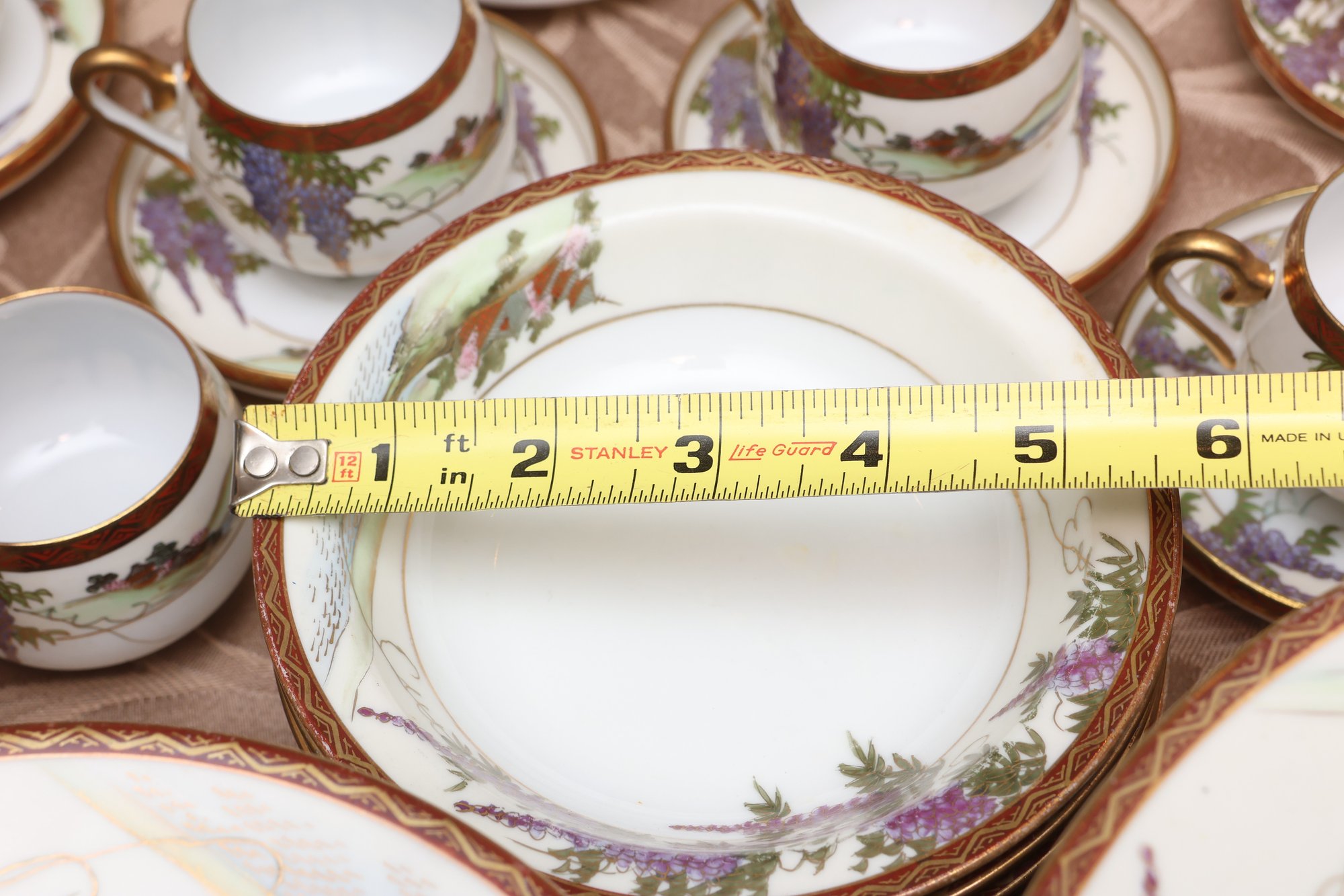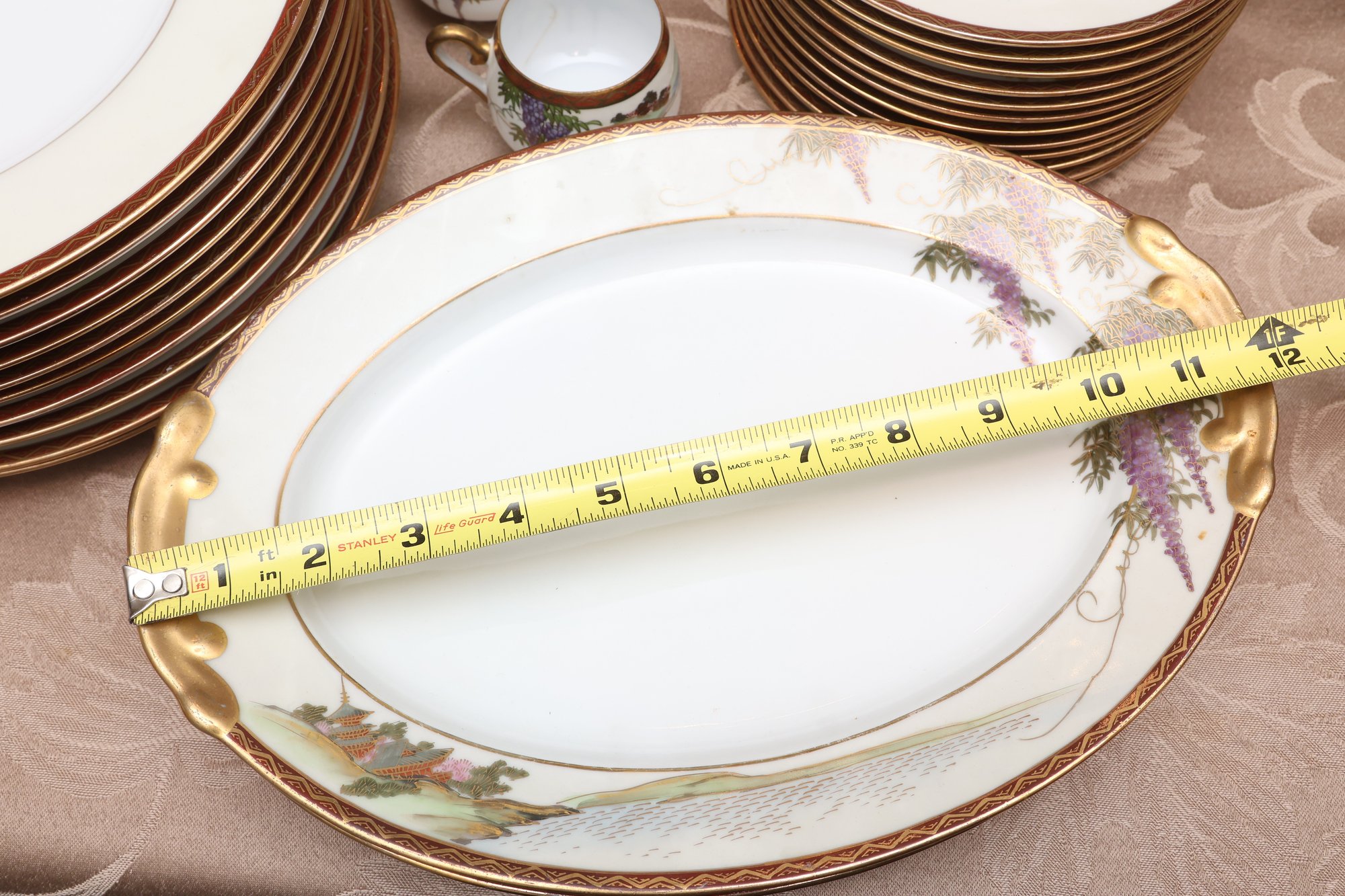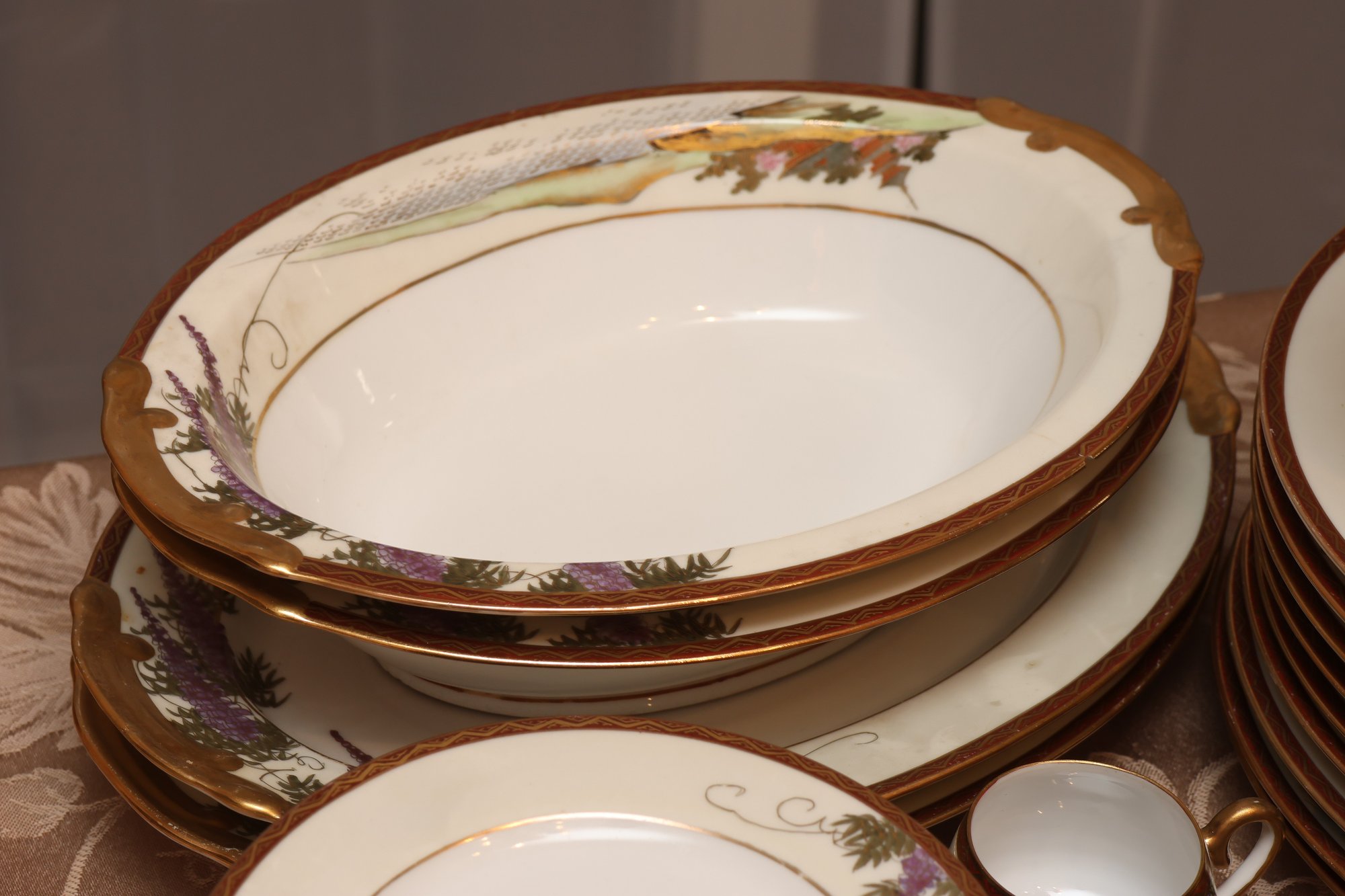 This expansive porcelain dinnerware and tea service features a beautiful purple wisteria or grape vine motif on a creamy white background, elegantly accented with gold trim. The comprehensive set includes a coffee/tea pot, a covered tureen, two oval serving bowls, numerous individual bowls, various dinner and salad plates, and a large collection of cups with matching saucers. Crafted from fine china, the pieces exhibit gilded edges and handles, creating a cohesive and classic aesthetic suitable for a grand table setting.