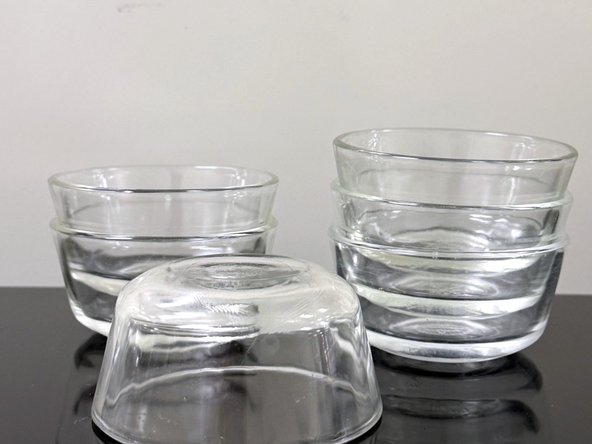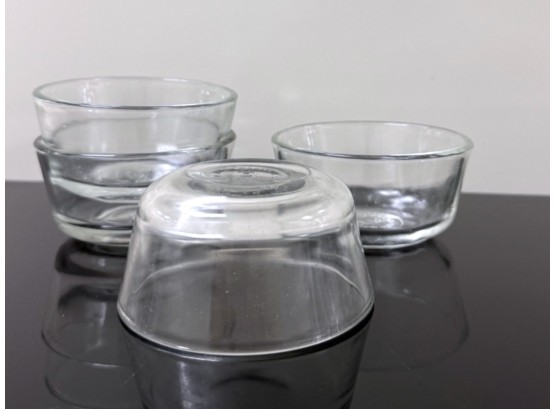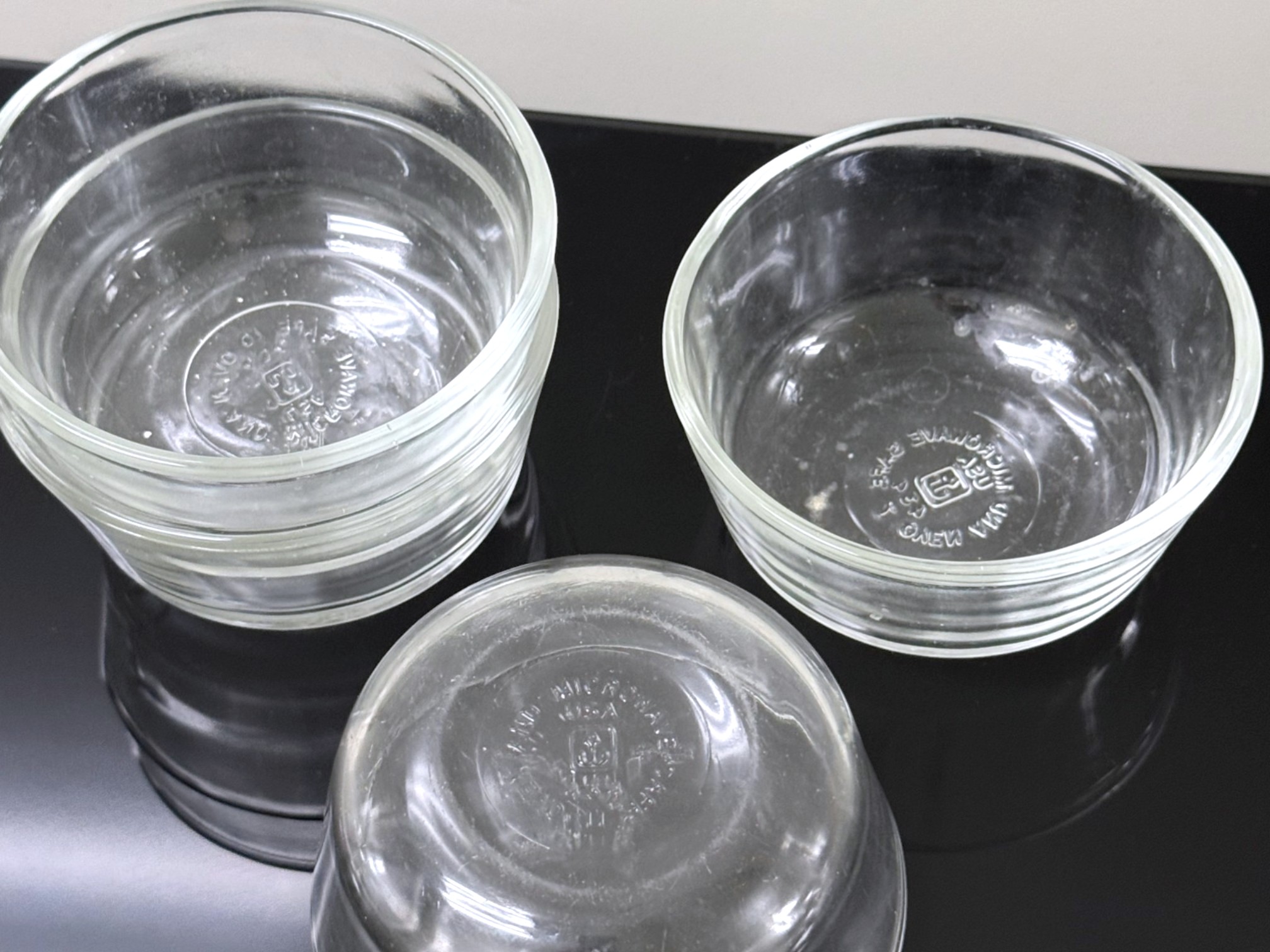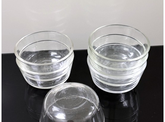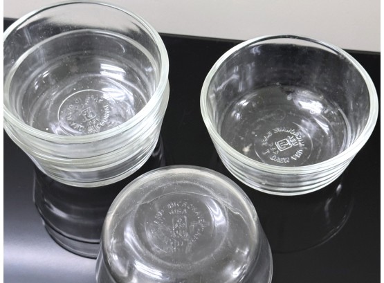 A mixed‑logo assortment of ten ovenproof glass ramekins, including six marked with the earlier Anchor Hocking "Fire‑King" logo and four bearing the later Anchor Hocking mark, all stamped “ovenproof” on the underside. Signs of light wear due to use.