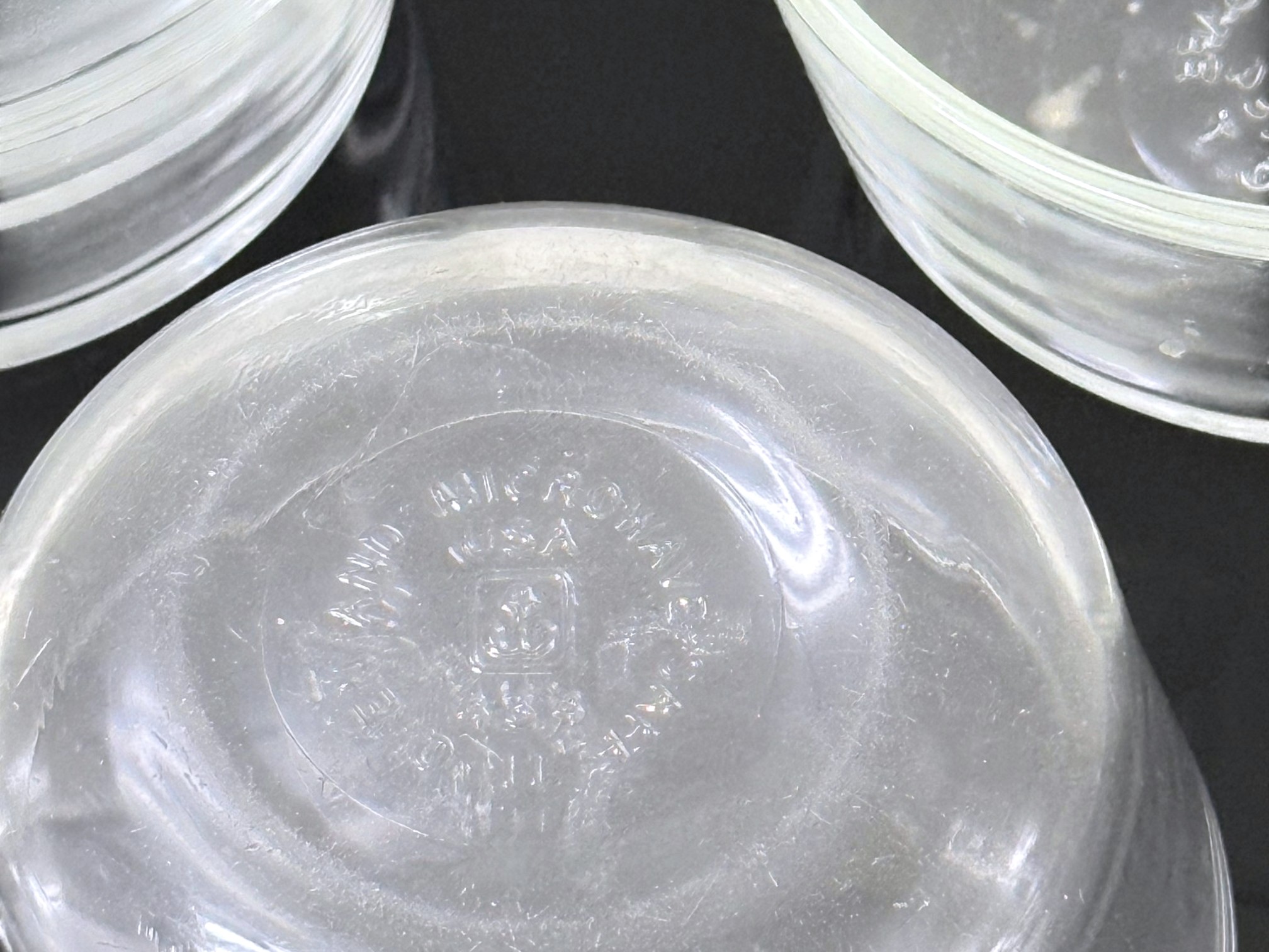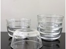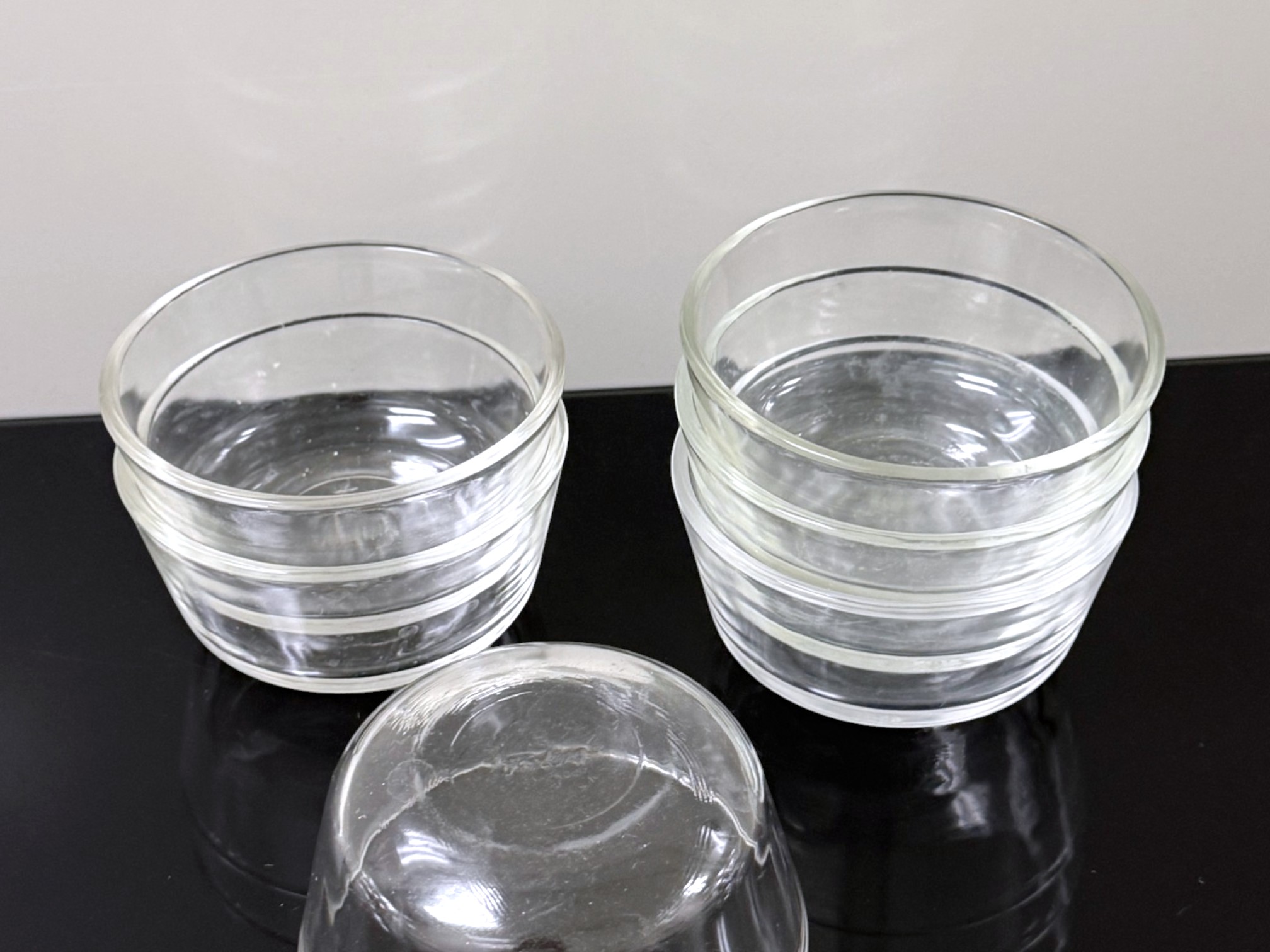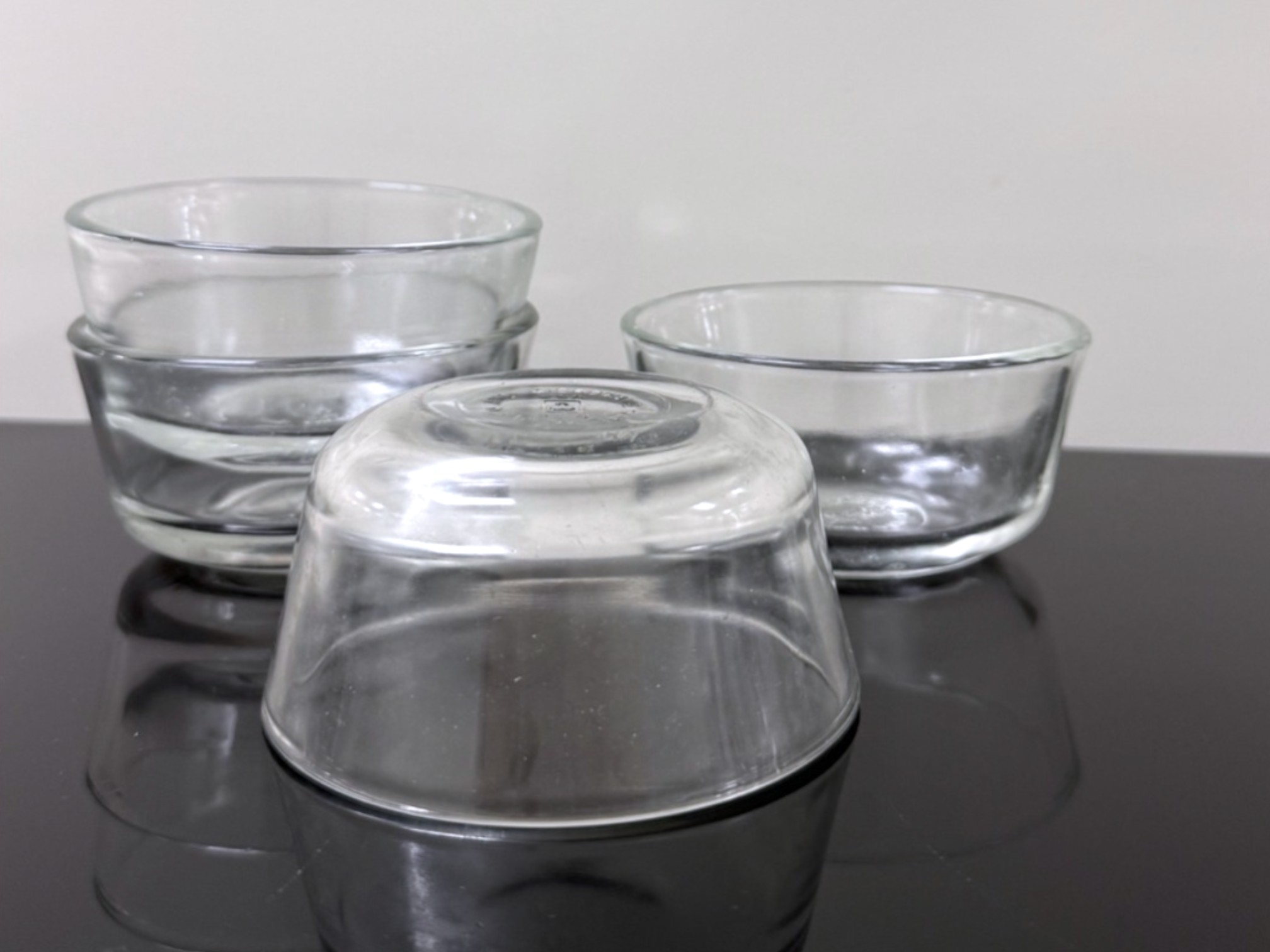 A mixed‑logo assortment of ten ovenproof glass ramekins, including six marked with the earlier Anchor Hocking "Fire‑King" logo and four bearing the later Anchor Hocking mark, all stamped “ovenproof” on the underside. Signs of light wear due to use.