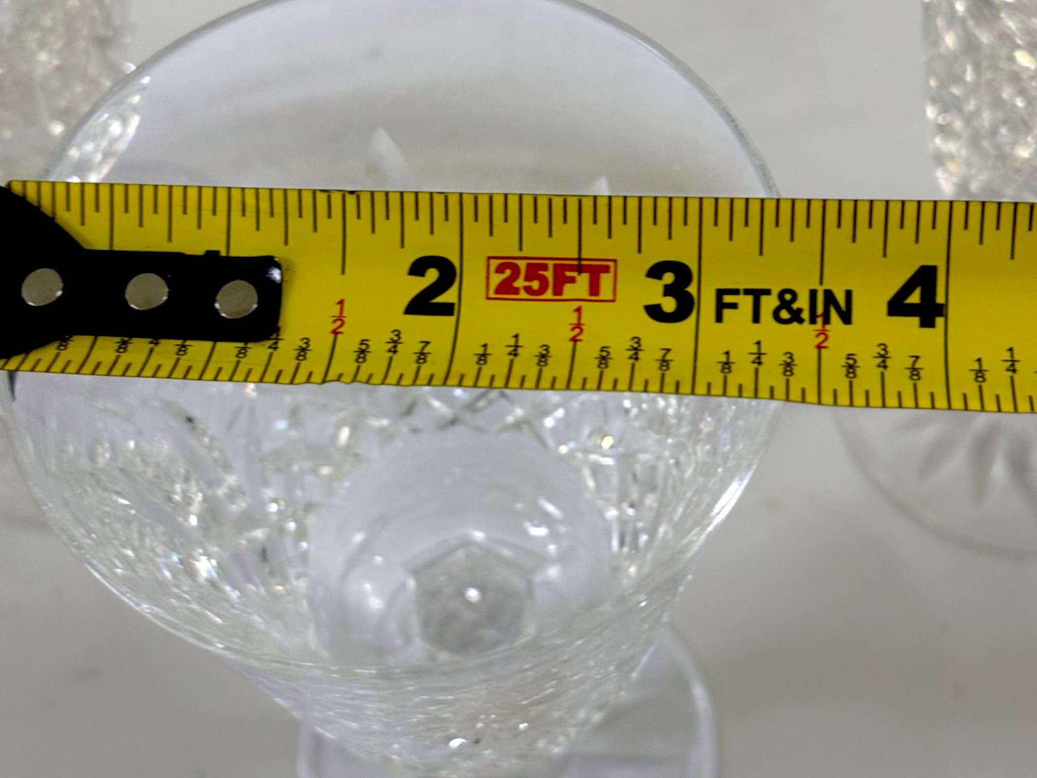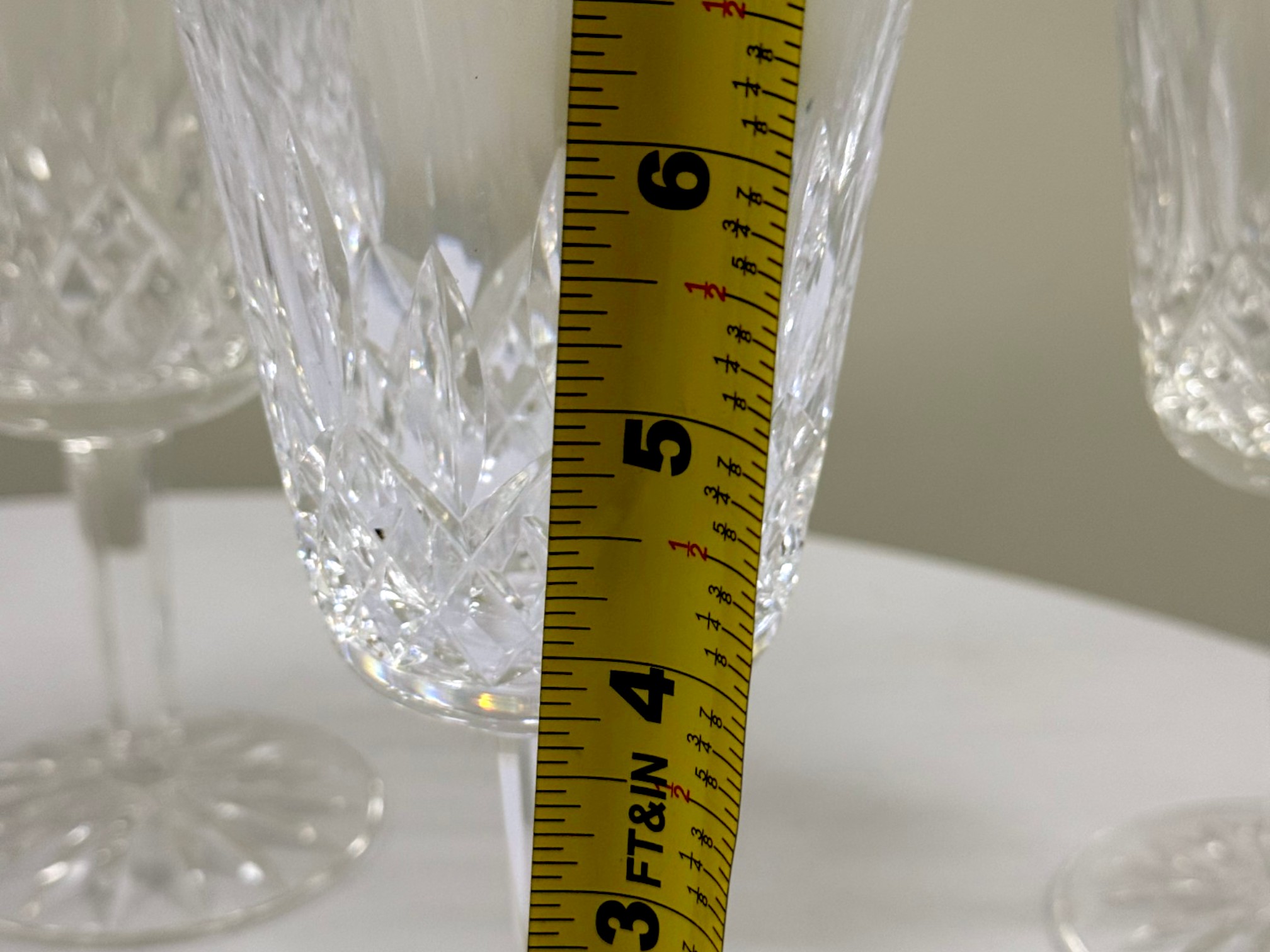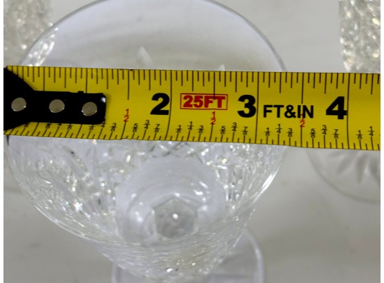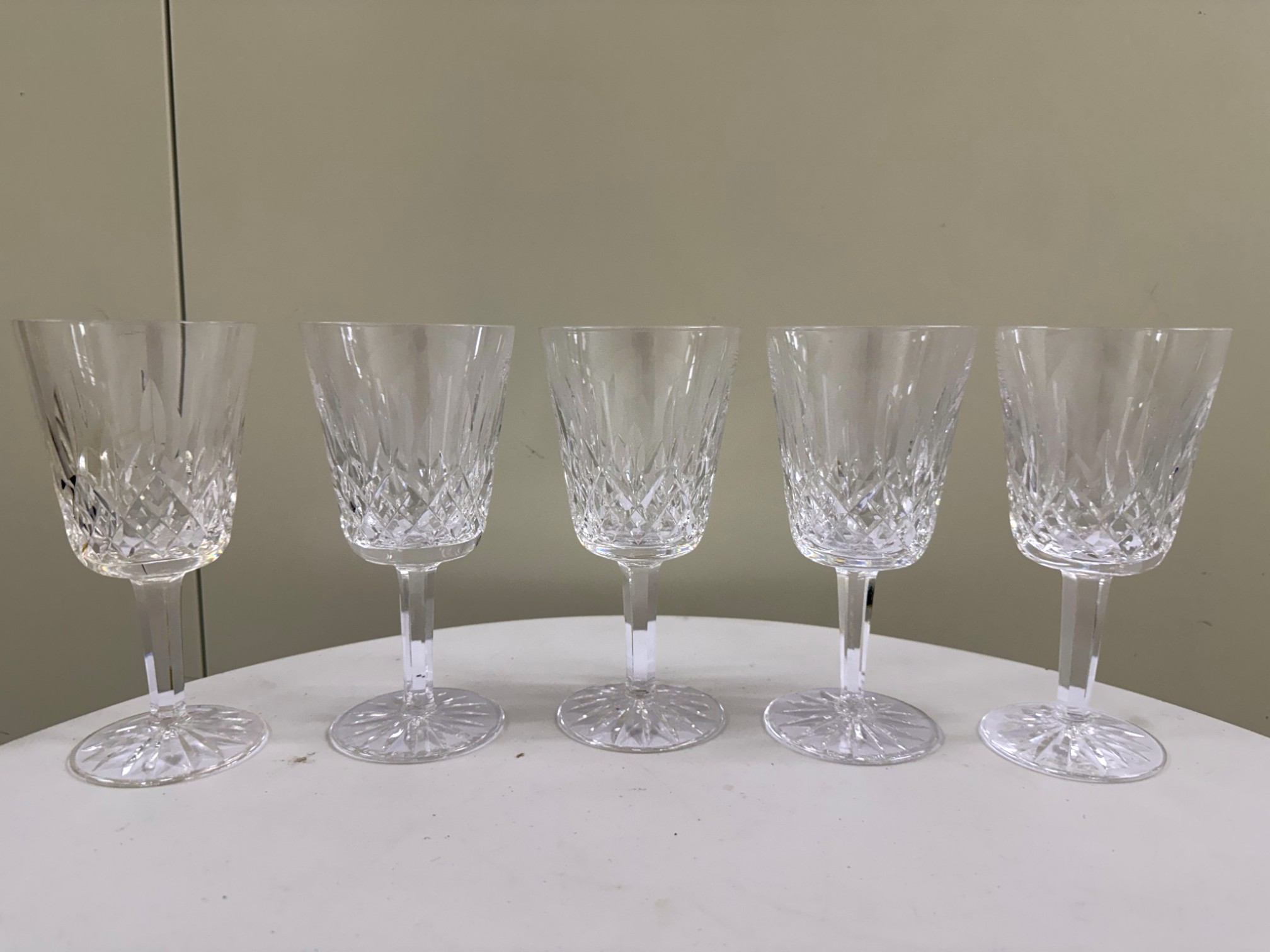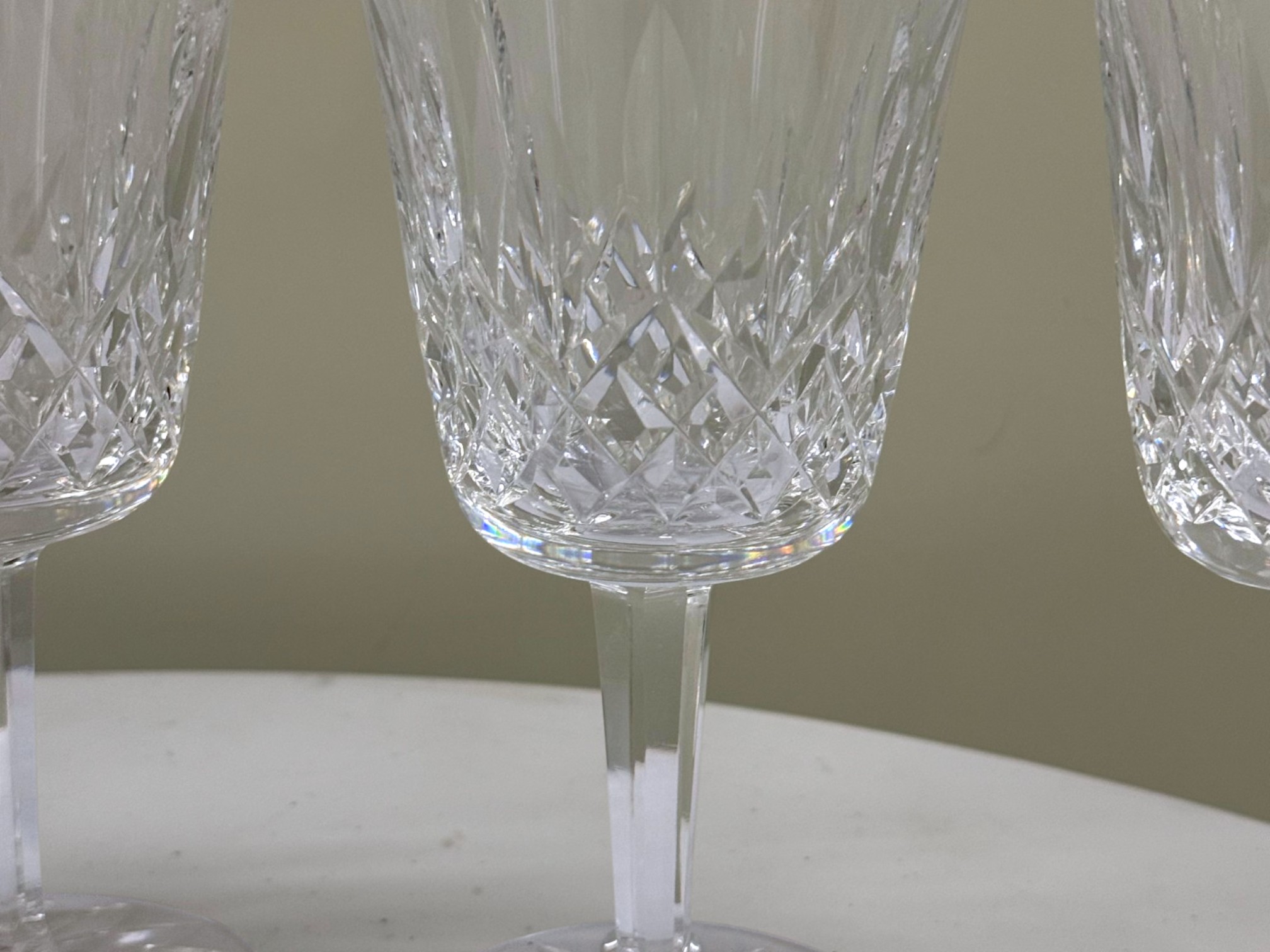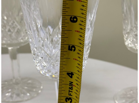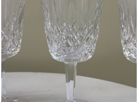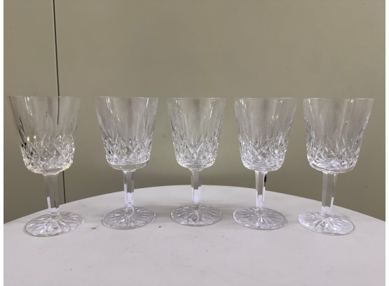 Waterford (Ireland) fine lead‑crystal "Lismore" water goblet, showcasing the pattern’s signature diamond and wedge cuts that create brilliant prismatic sparkle and an elegant, timeless silhouette. Etched "Waterford" on underside of glass.
