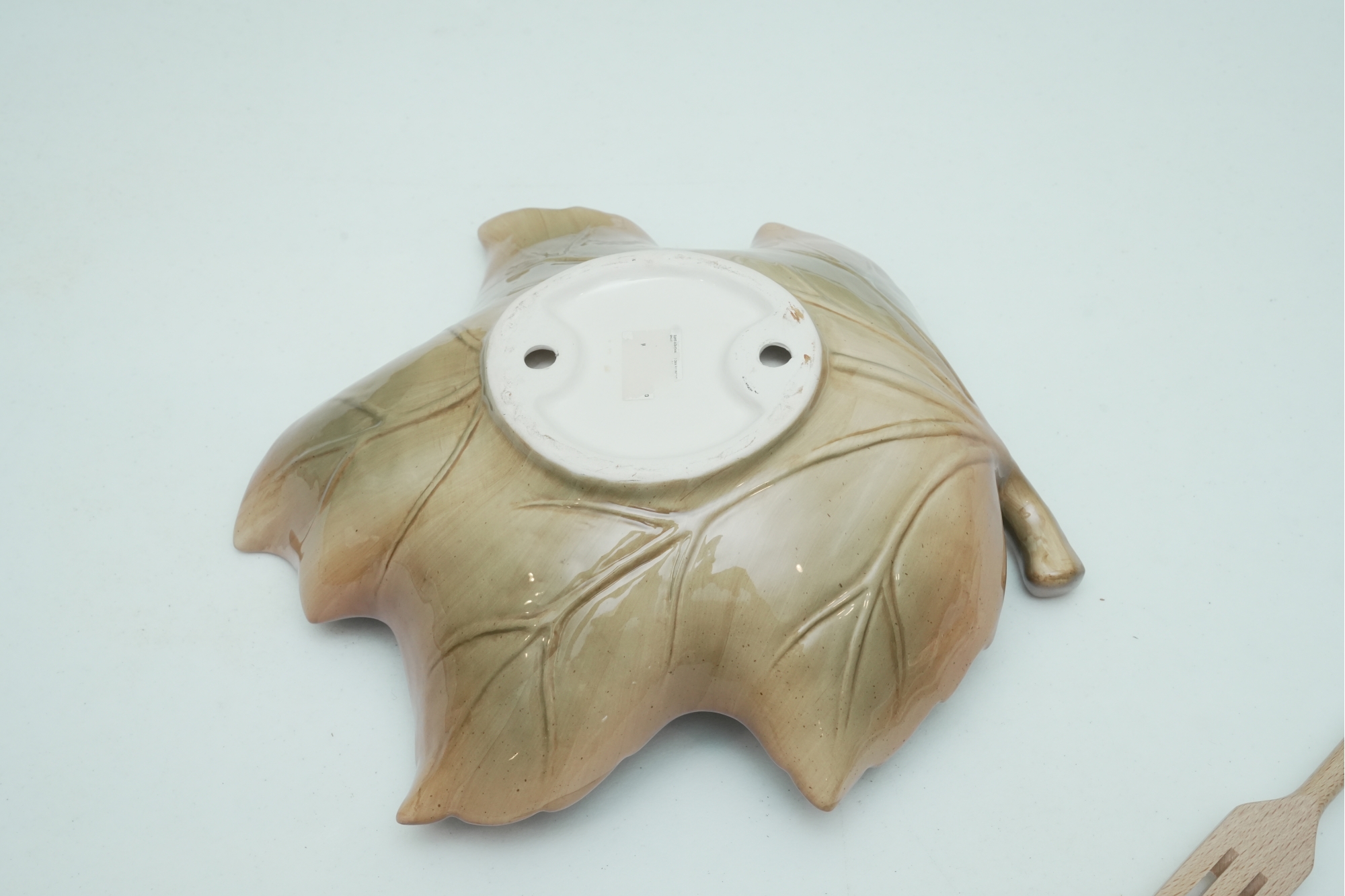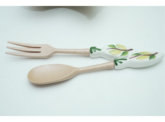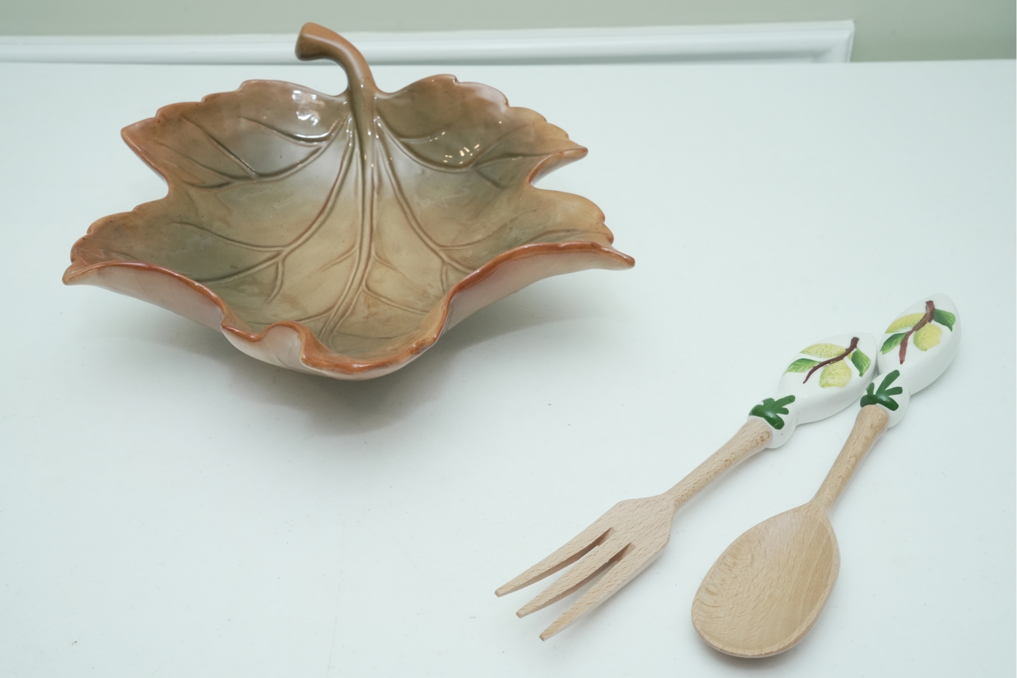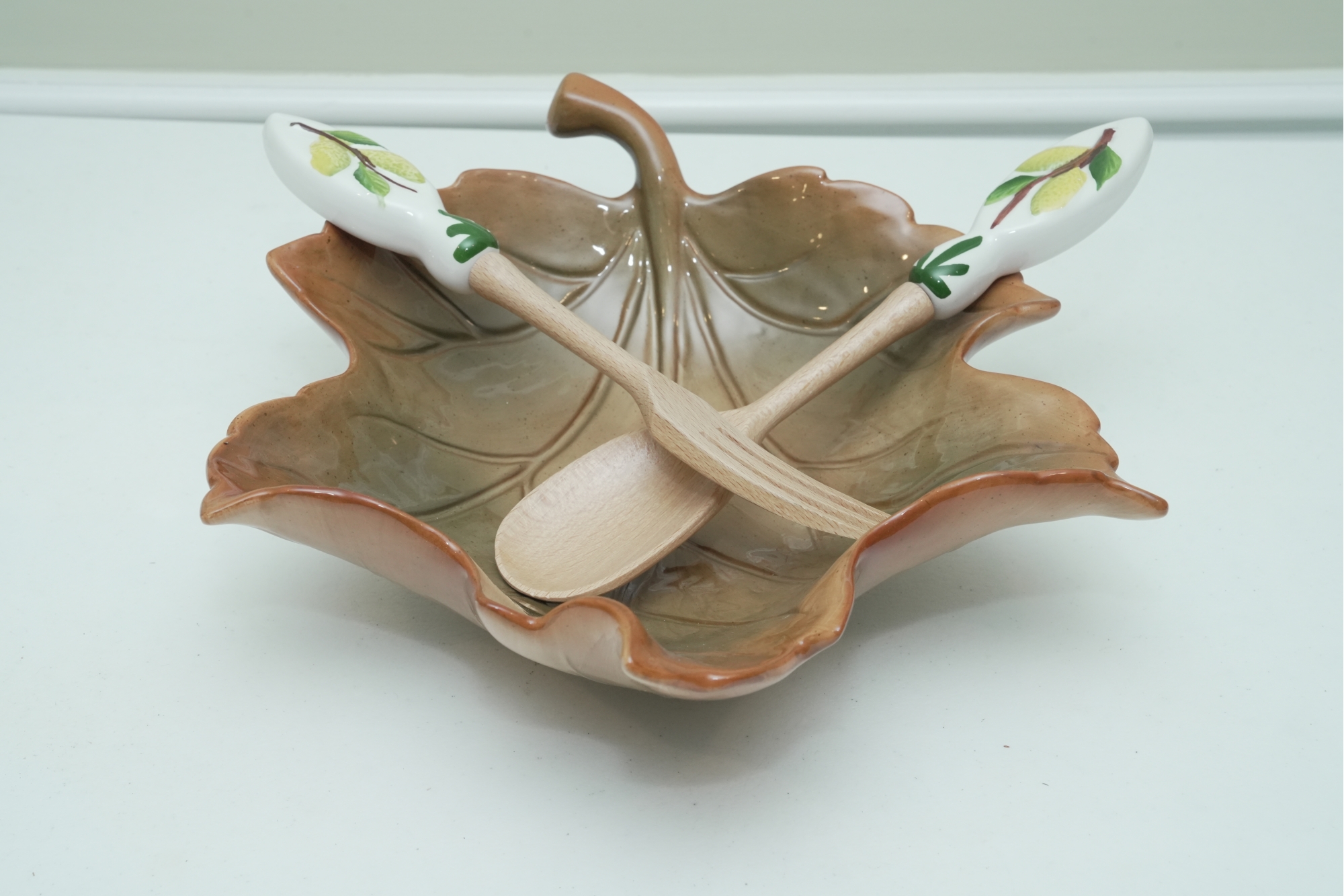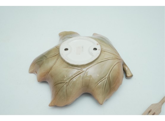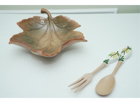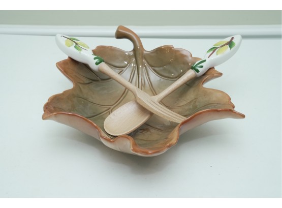 Leaf-Shaped Ceramic Bowl With Wooden & Ceramic Serving Utensils