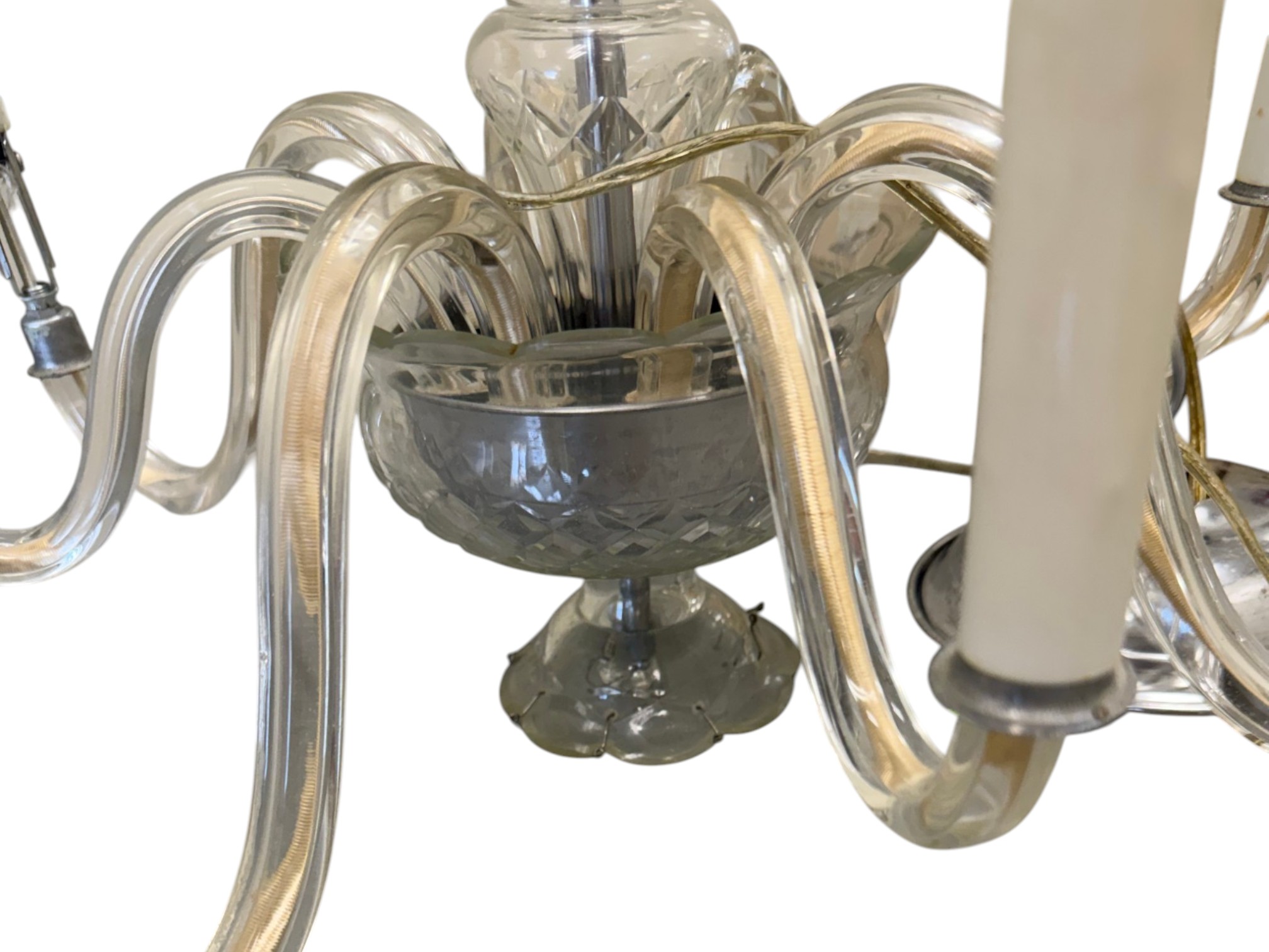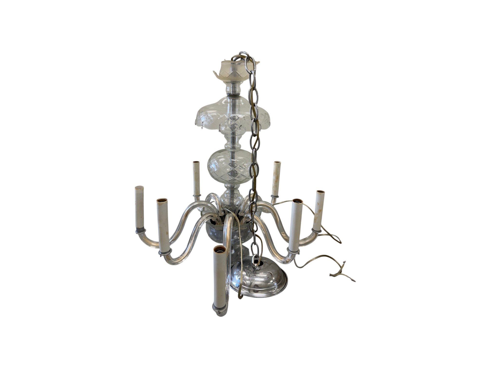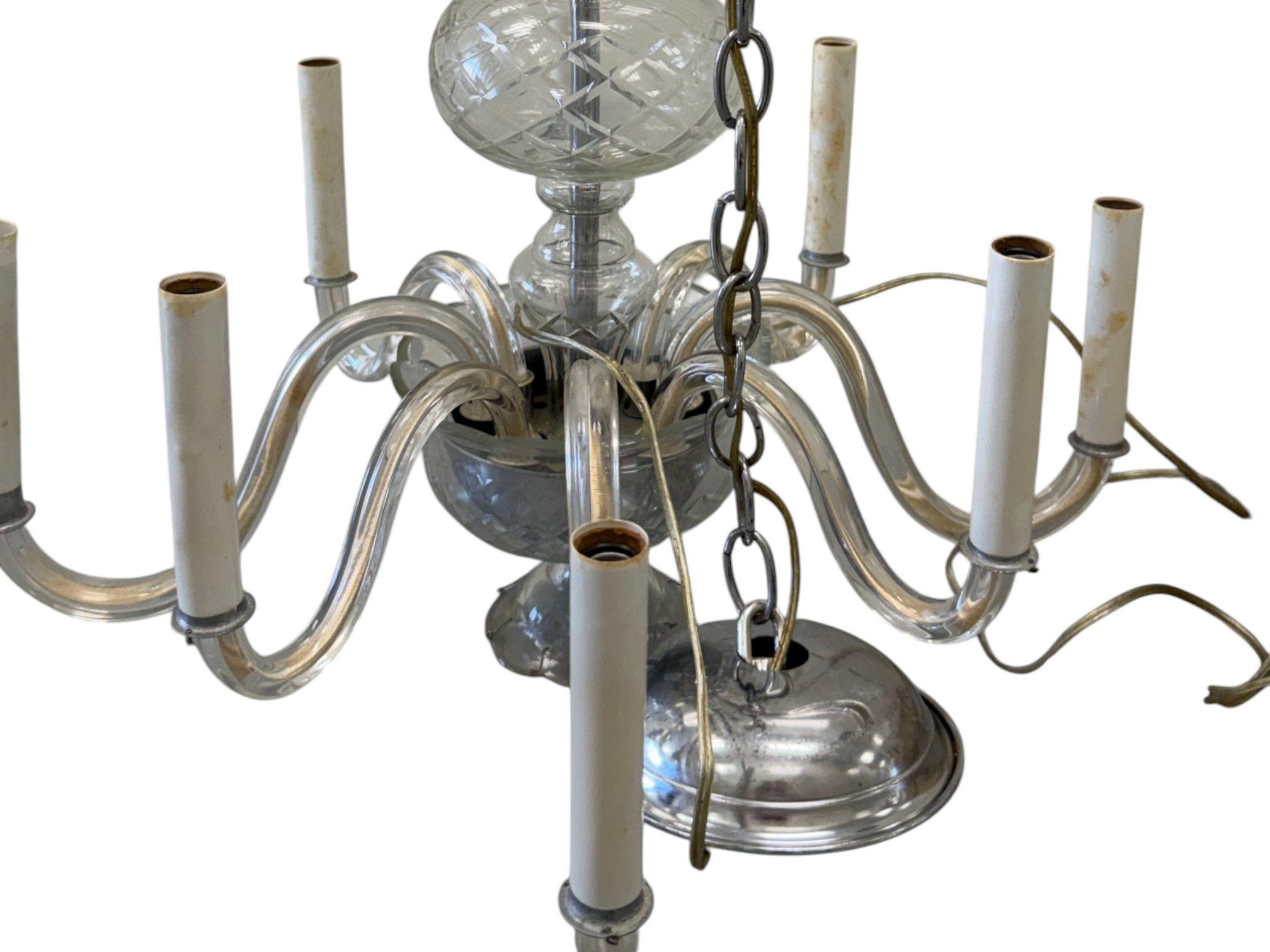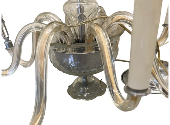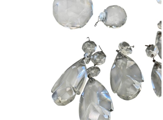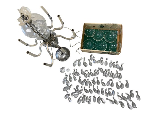 Vintage (1920s) Italian Murano crystal glass chandelier with eight lights. Offered in pieces requiring re‑assembly, the chandelier includes box of eight (8) glass bases for each arm, decorative crystal teardrops that hang with wire grips, as well as the chain and ceiling fixture. Glass at top of fixture damaged and in need of repair.