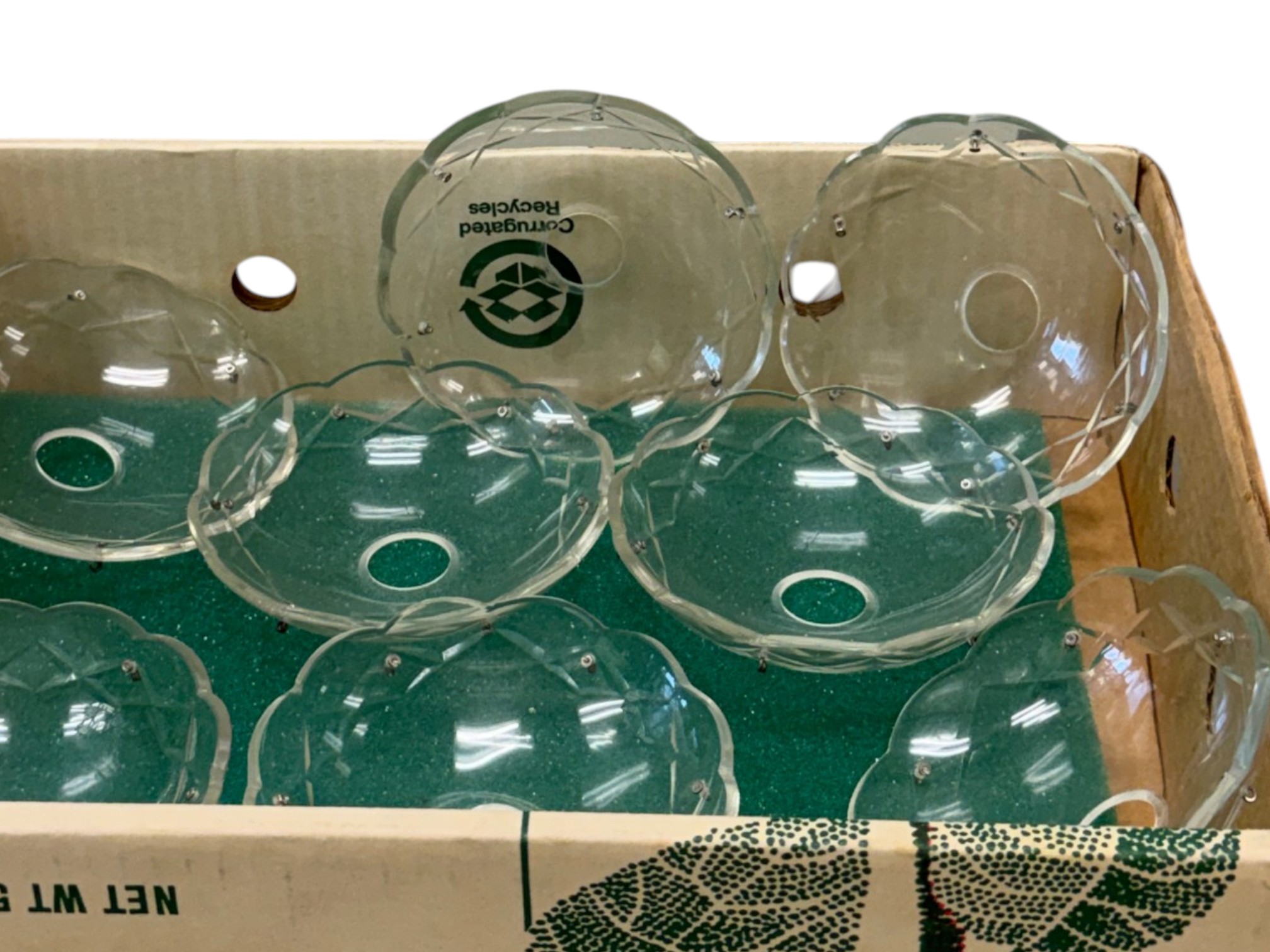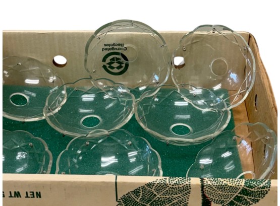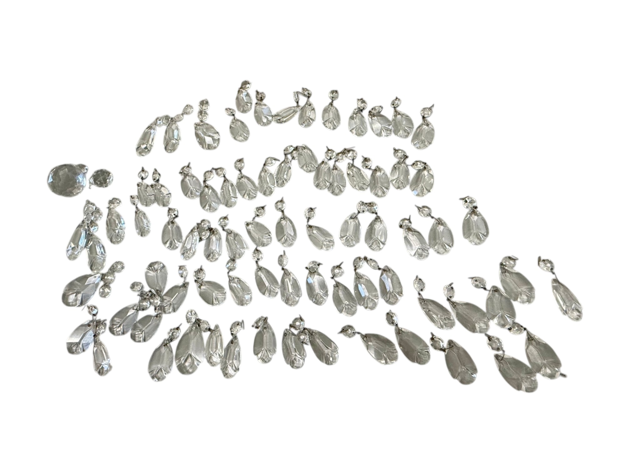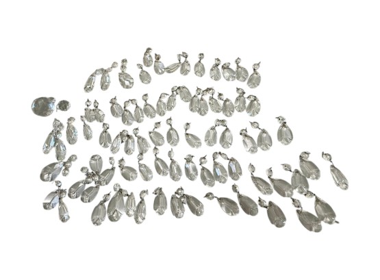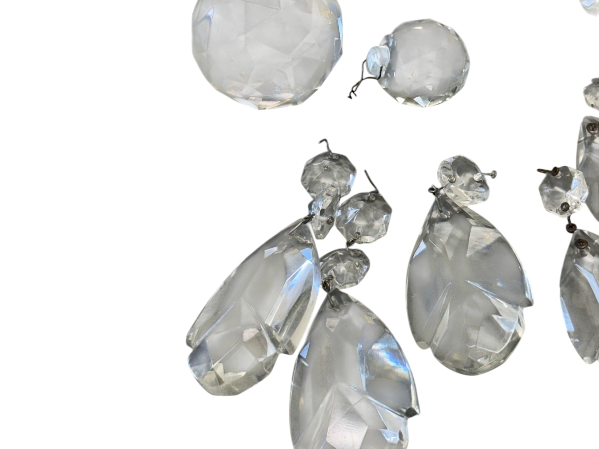 Vintage (1920s) Italian Murano crystal glass chandelier with eight lights. Offered in pieces requiring re‑assembly, the chandelier includes box of eight (8) glass bases for each arm, decorative crystal teardrops that hang with wire grips, as well as the chain and ceiling fixture. Glass at top of fixture damaged and in need of repair.