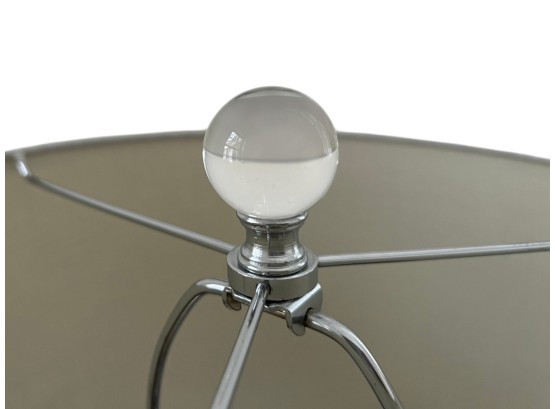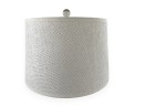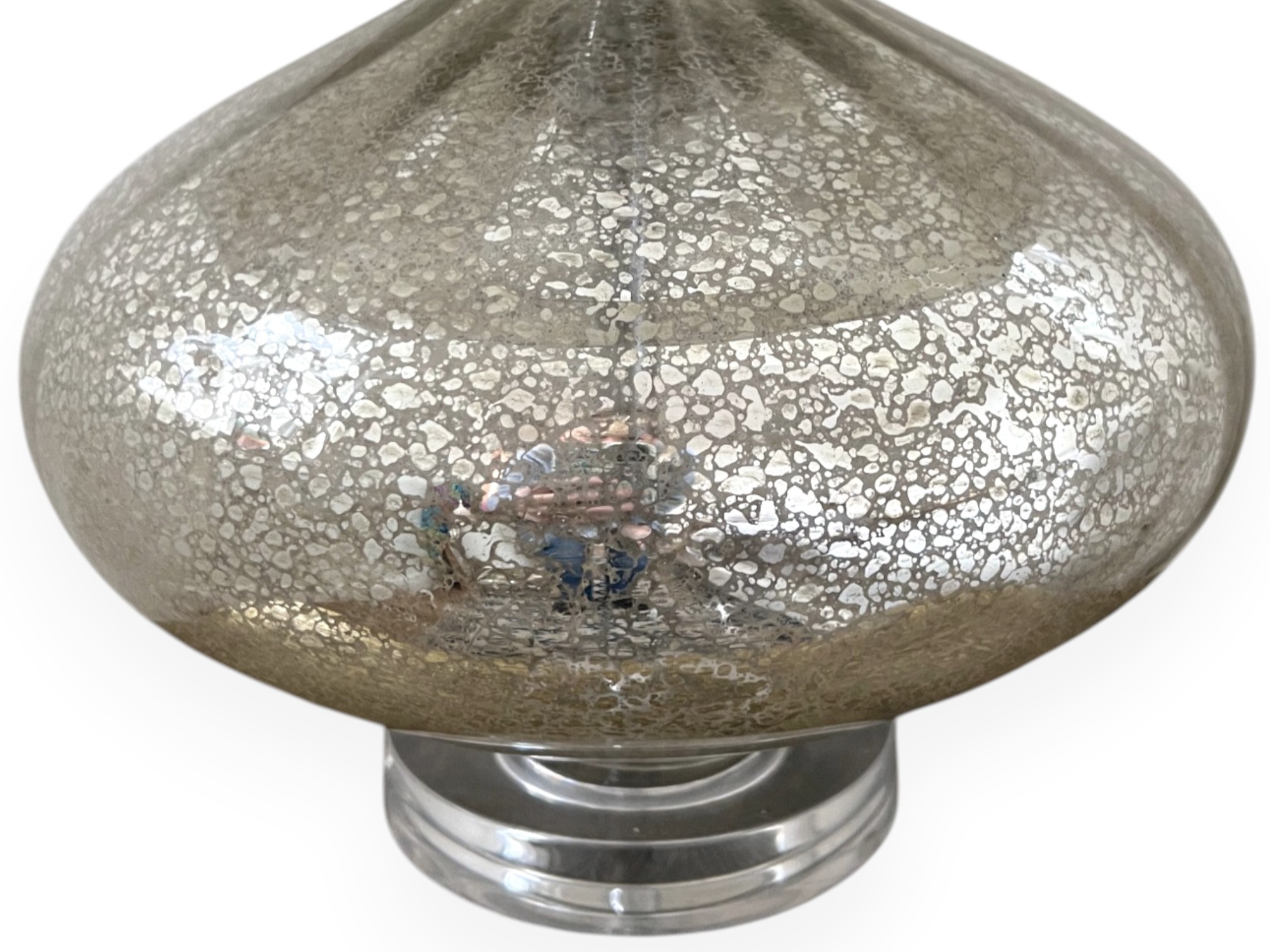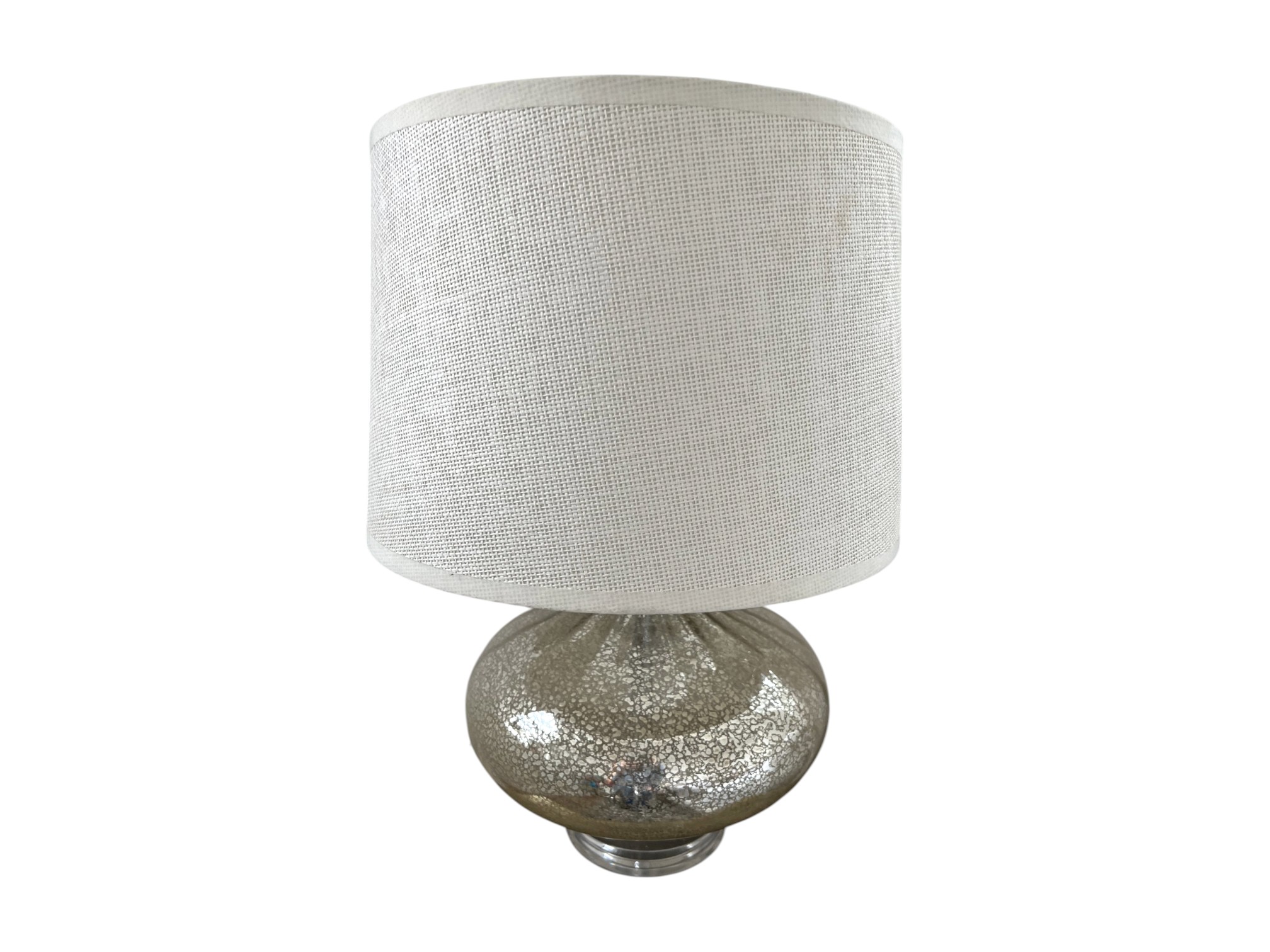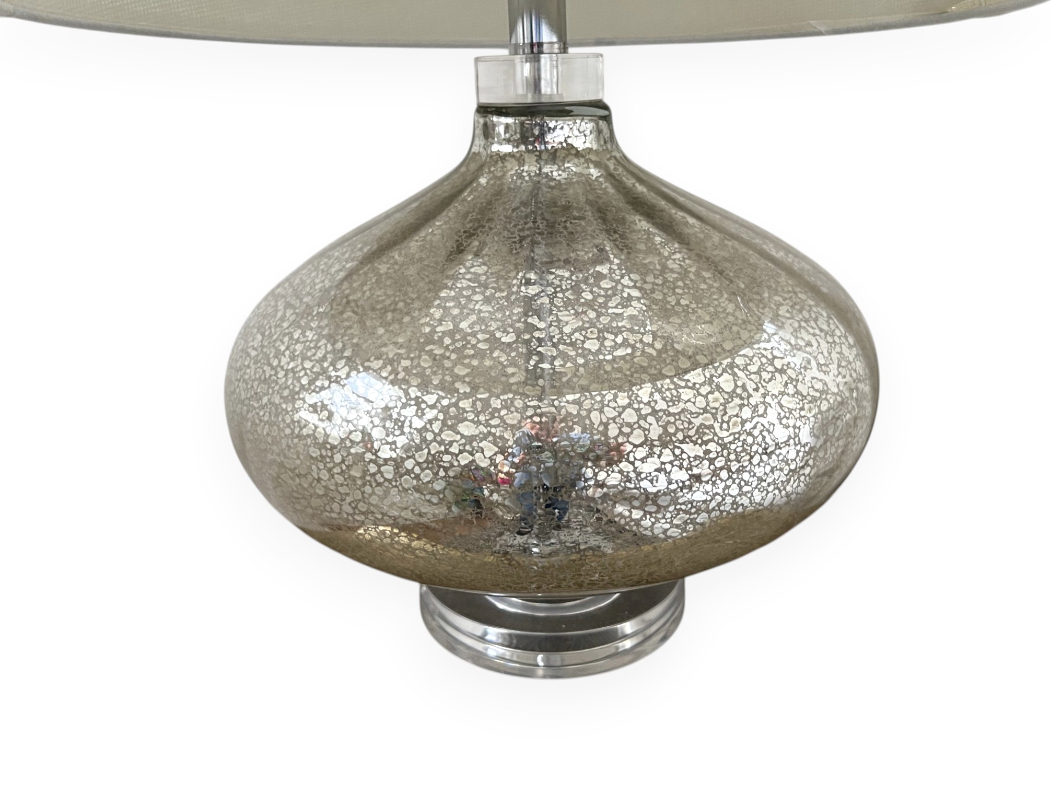 Pair of elegant table lamps, featuring a shimmering speckled silver finish (reminiscent of antique mercury glass) on its gourd‑shaped body, and paired with white fabric drum shades.