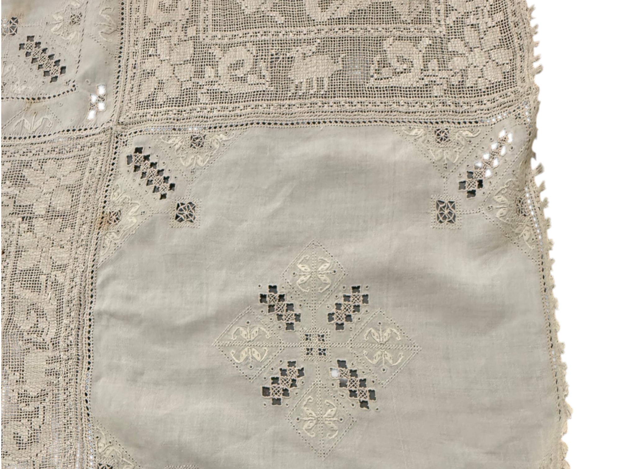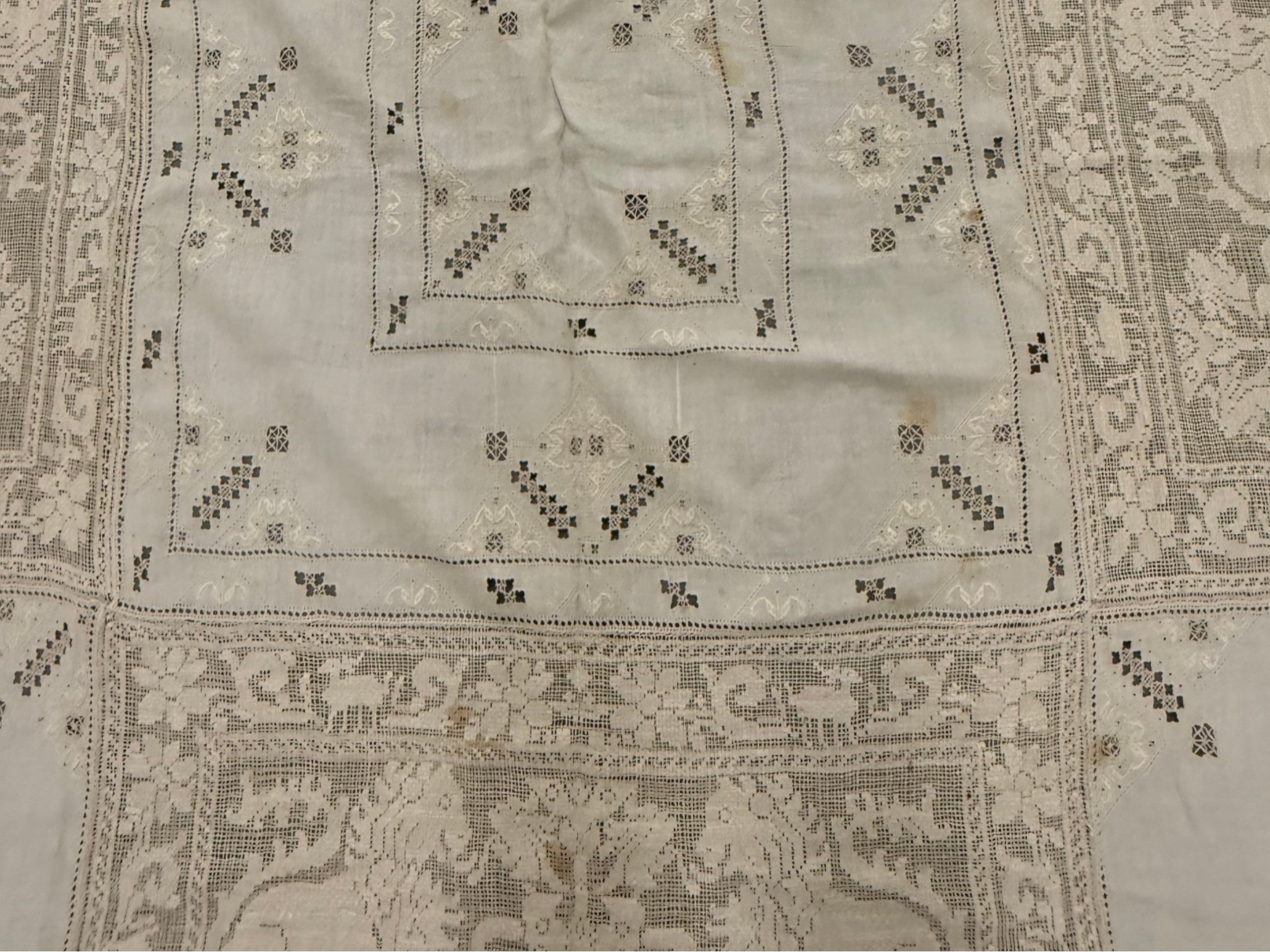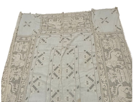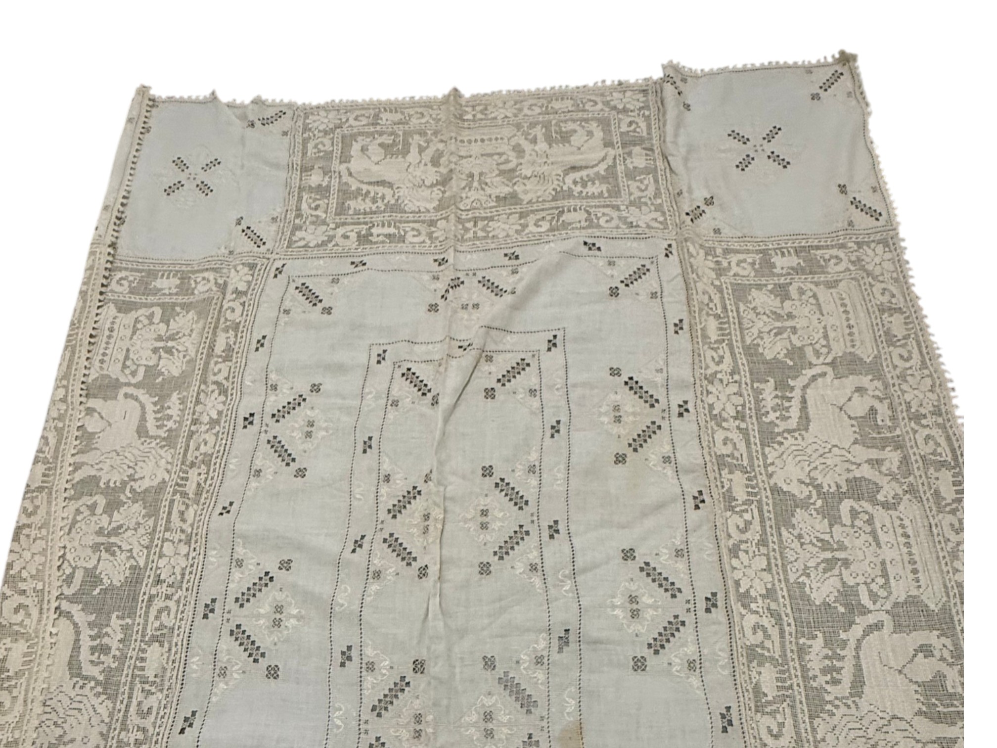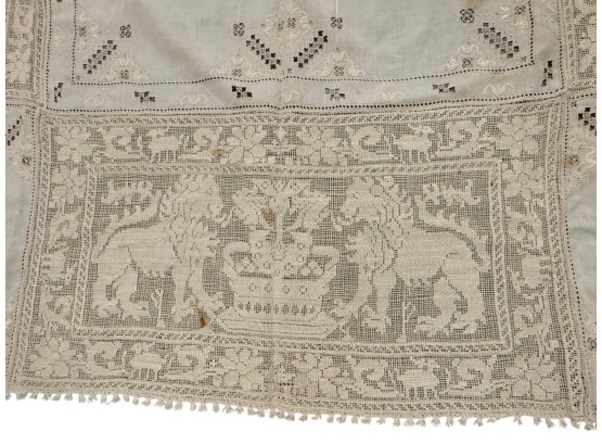 Antique needle‑lace paneled tablecloth, featuring two confronting lions flanking a central floral urn, bordered with additional animal and floral motifs and finished with a knotted fringe. Signs of gentle wear and staining from celebrations.
