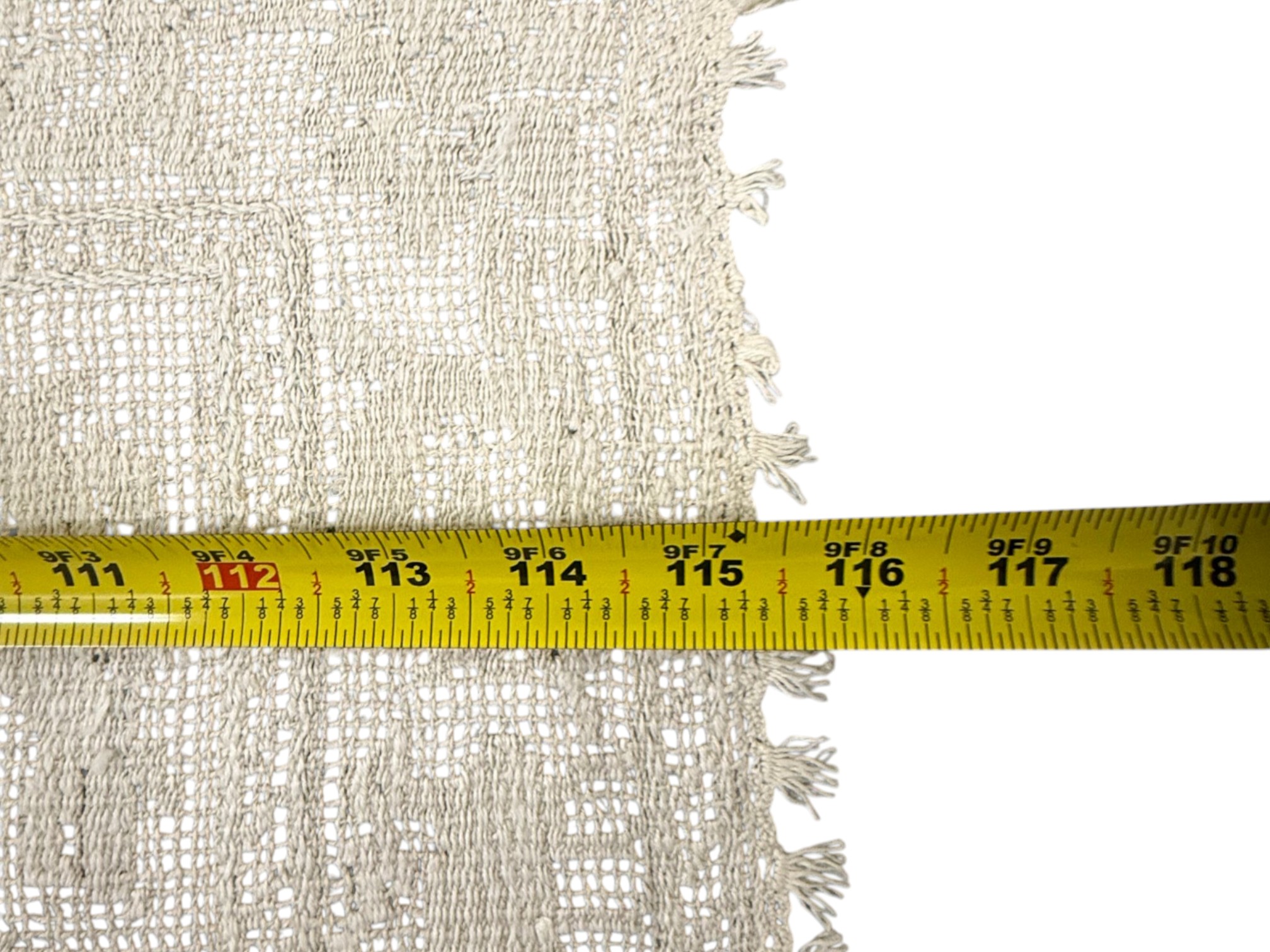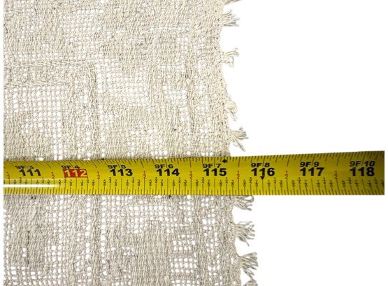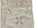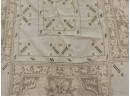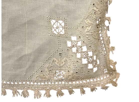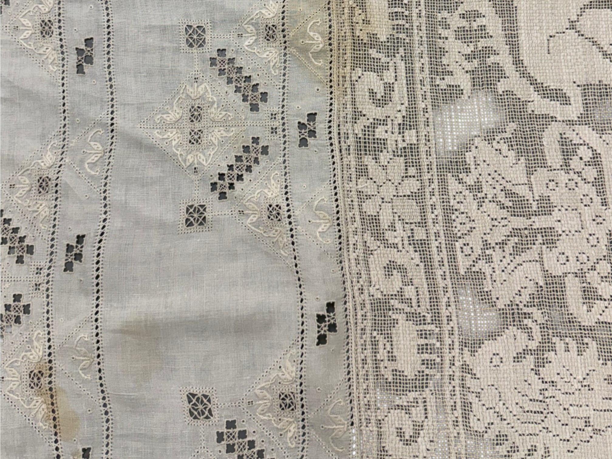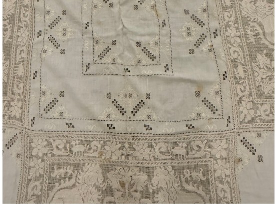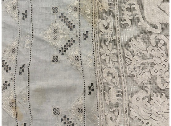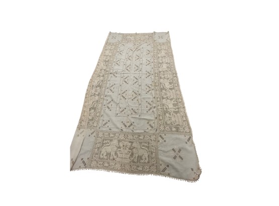 Antique needle‑lace paneled tablecloth, featuring two confronting lions flanking a central floral urn, bordered with additional animal and floral motifs and finished with a knotted fringe. Signs of gentle wear and staining from celebrations.