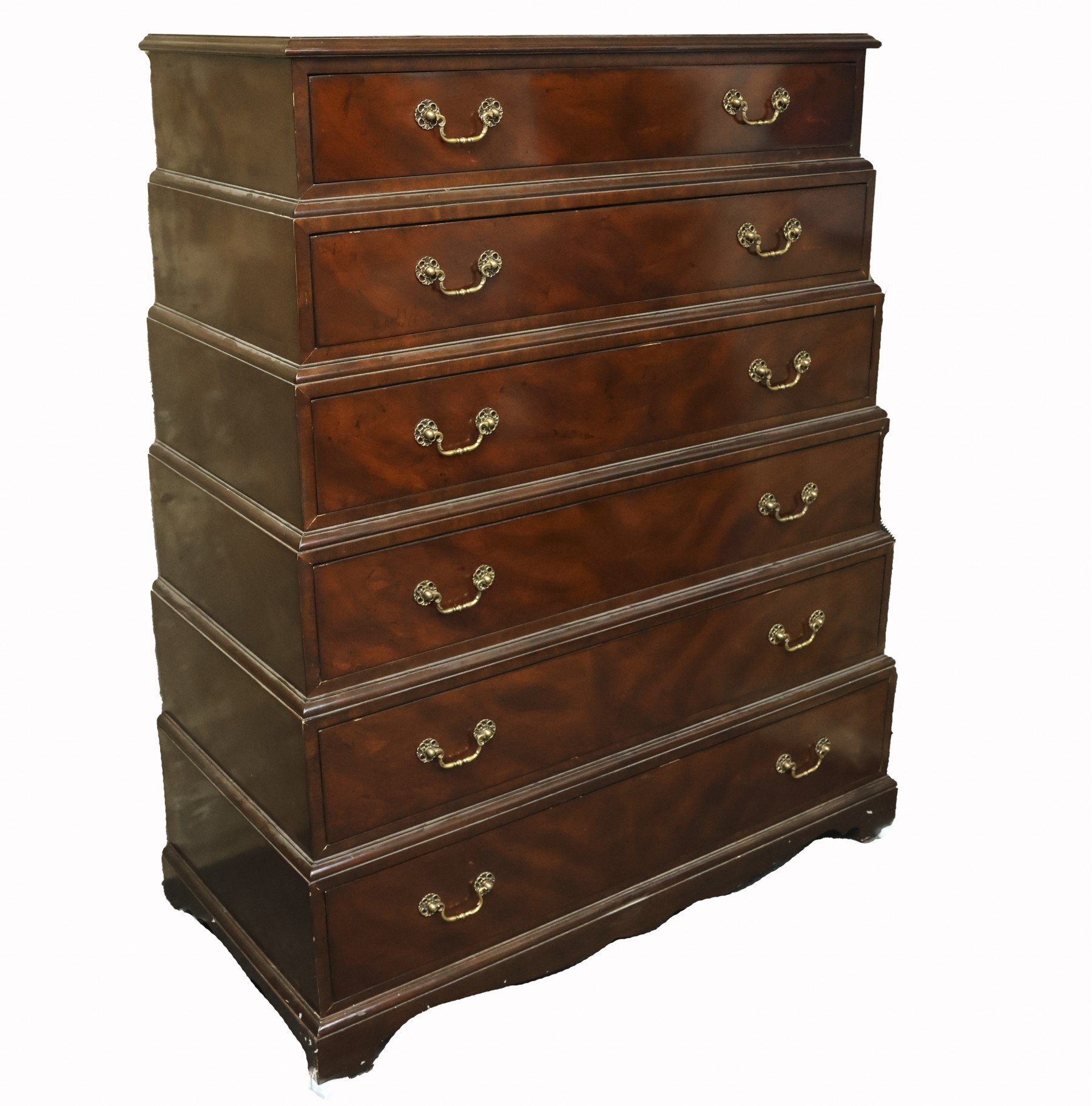 Superb dresser by Lloyd Buxton. This English style chest of drawers is made of walnut with flame detailing on the drawer fronts. There are 6 tiered and graduated drawers with dovetail construction.It's beautifully constructed of solid wood with brass pulls. It's a very solid, heavy and sturdy piece. What a sophisticated storage piece for any room of your home!