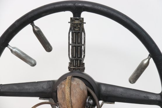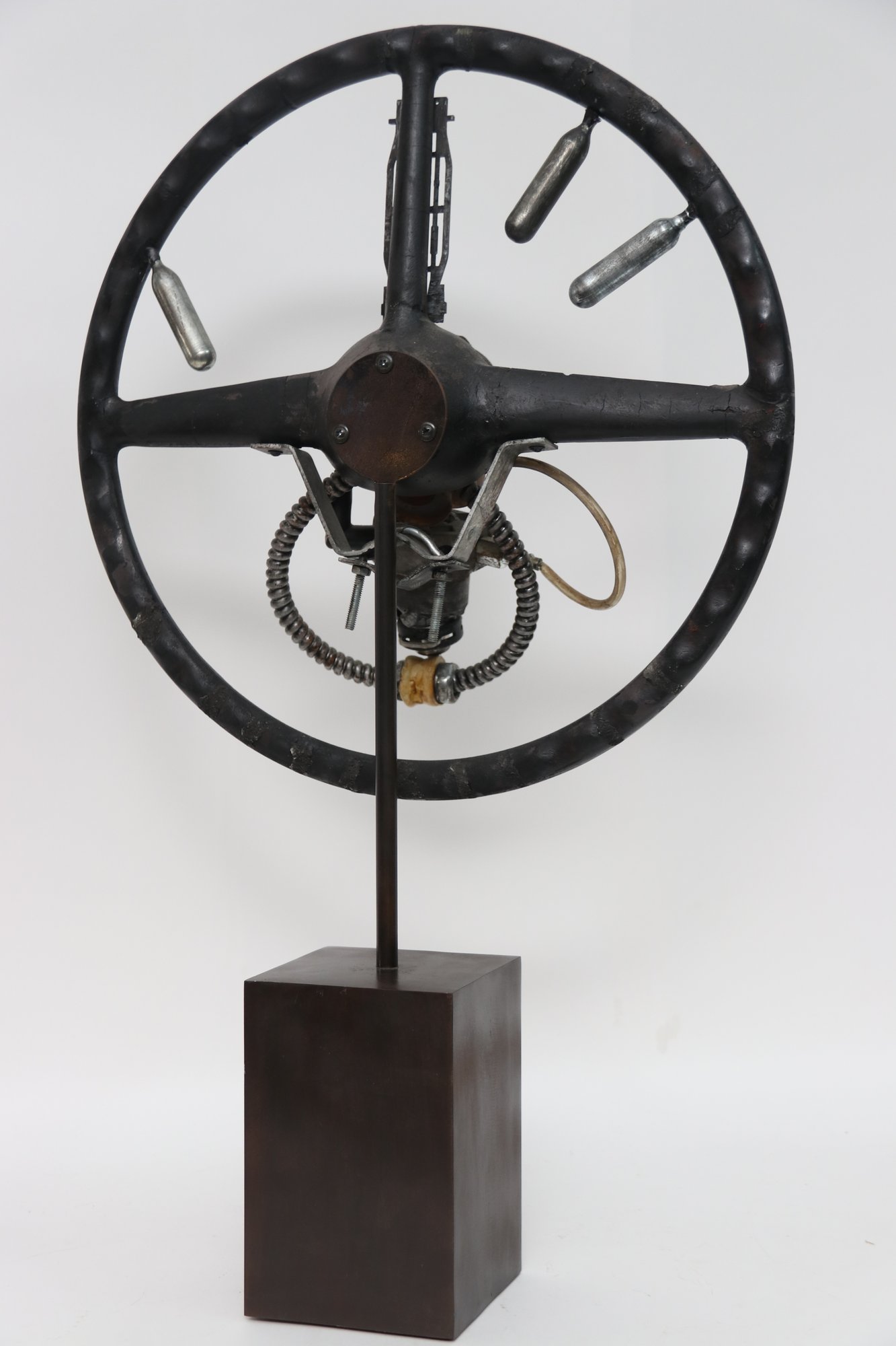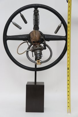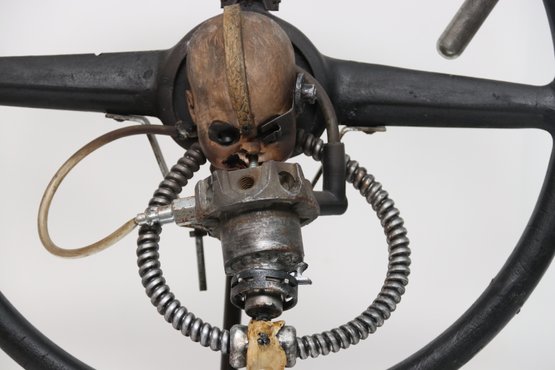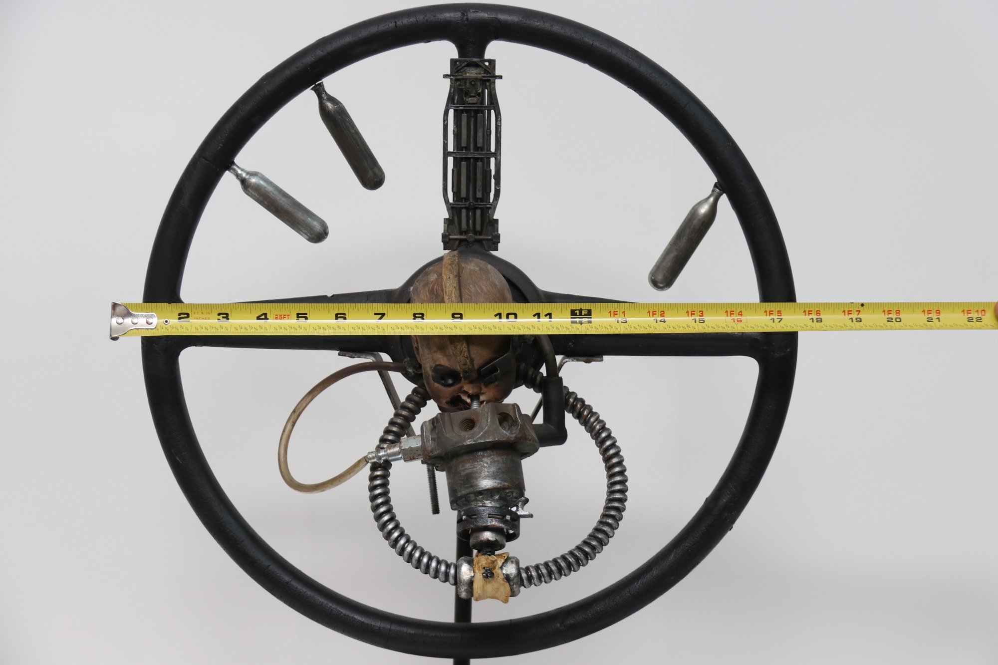 Mad Max: Fury Road-steering wheel sculpture is a unique art piece reminiscent of the film's rugged and dystopian world. Given the central role that vehicles play in the Mad Max series, particularly "Fury Road," the steering wheel holds significant symbolism and could serve as a powerful artistic representation.
