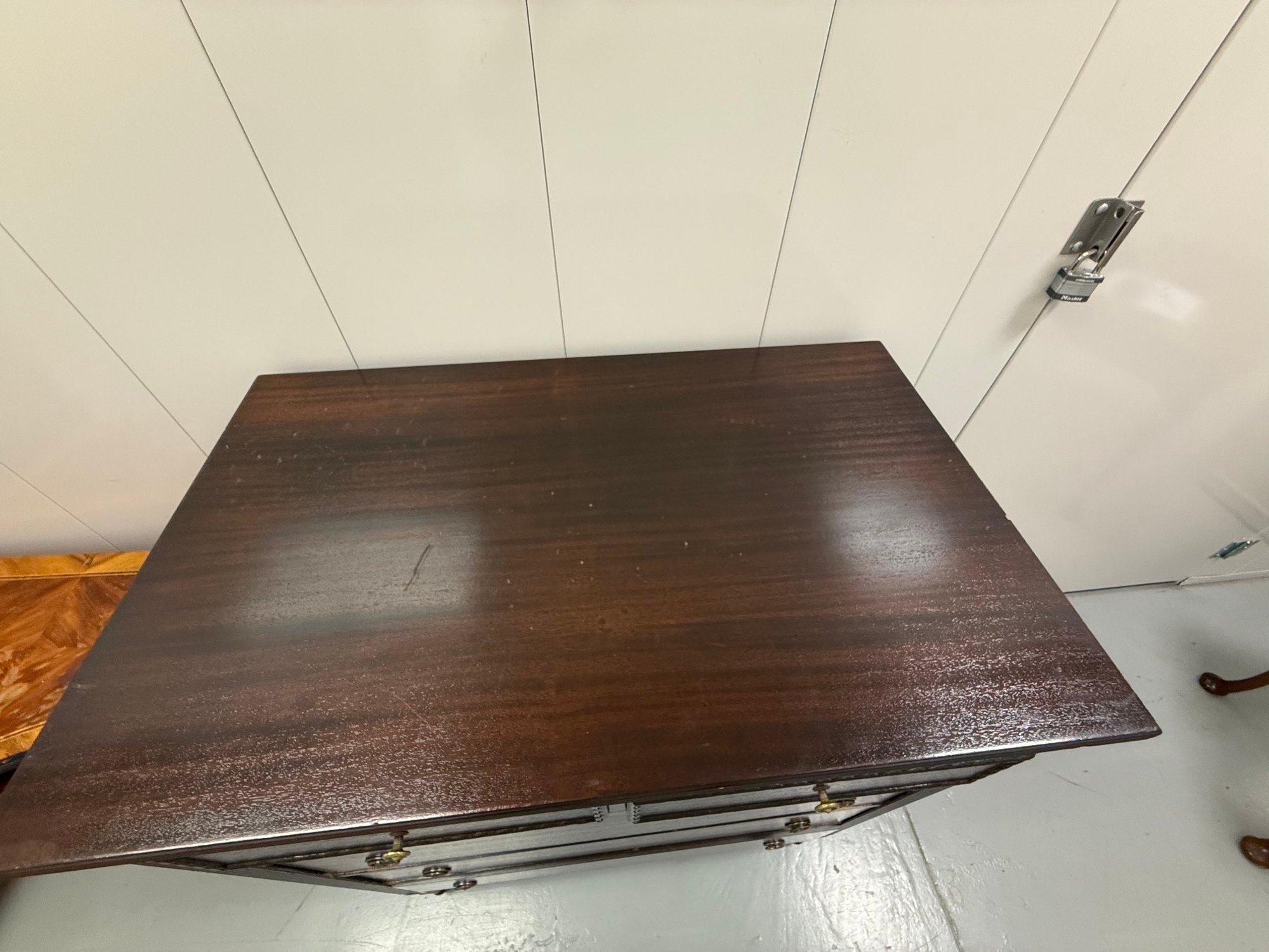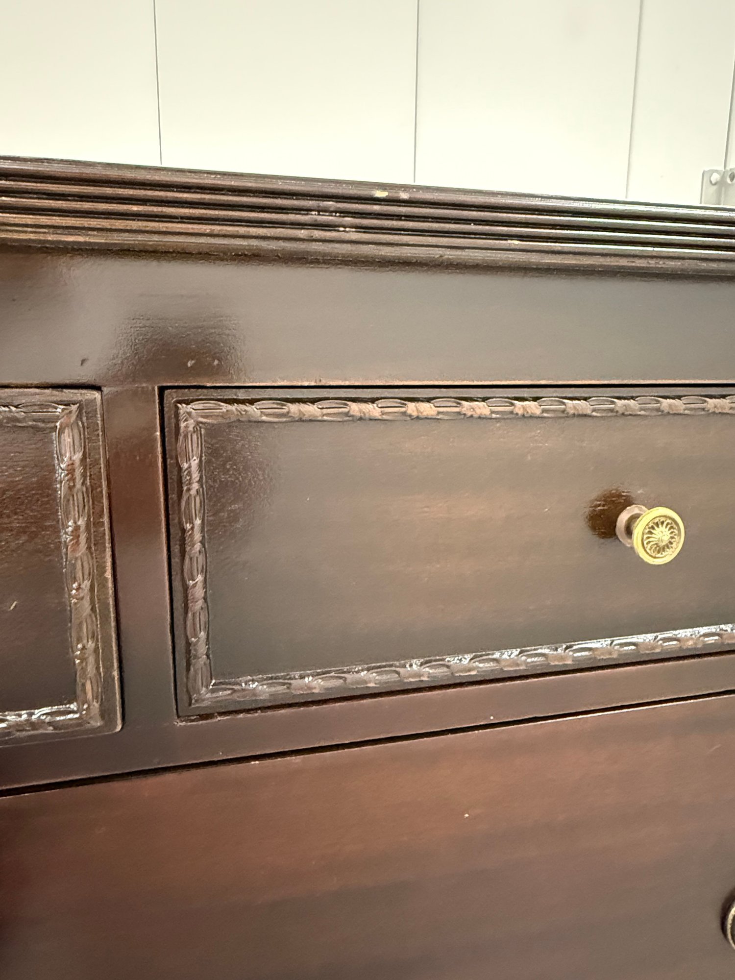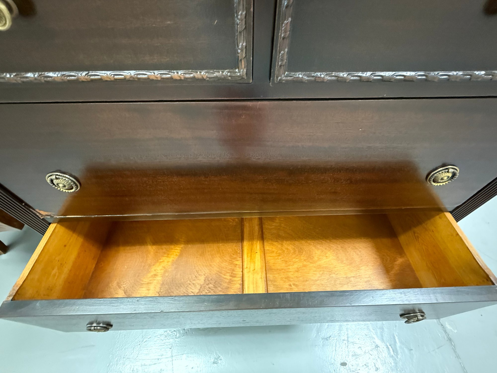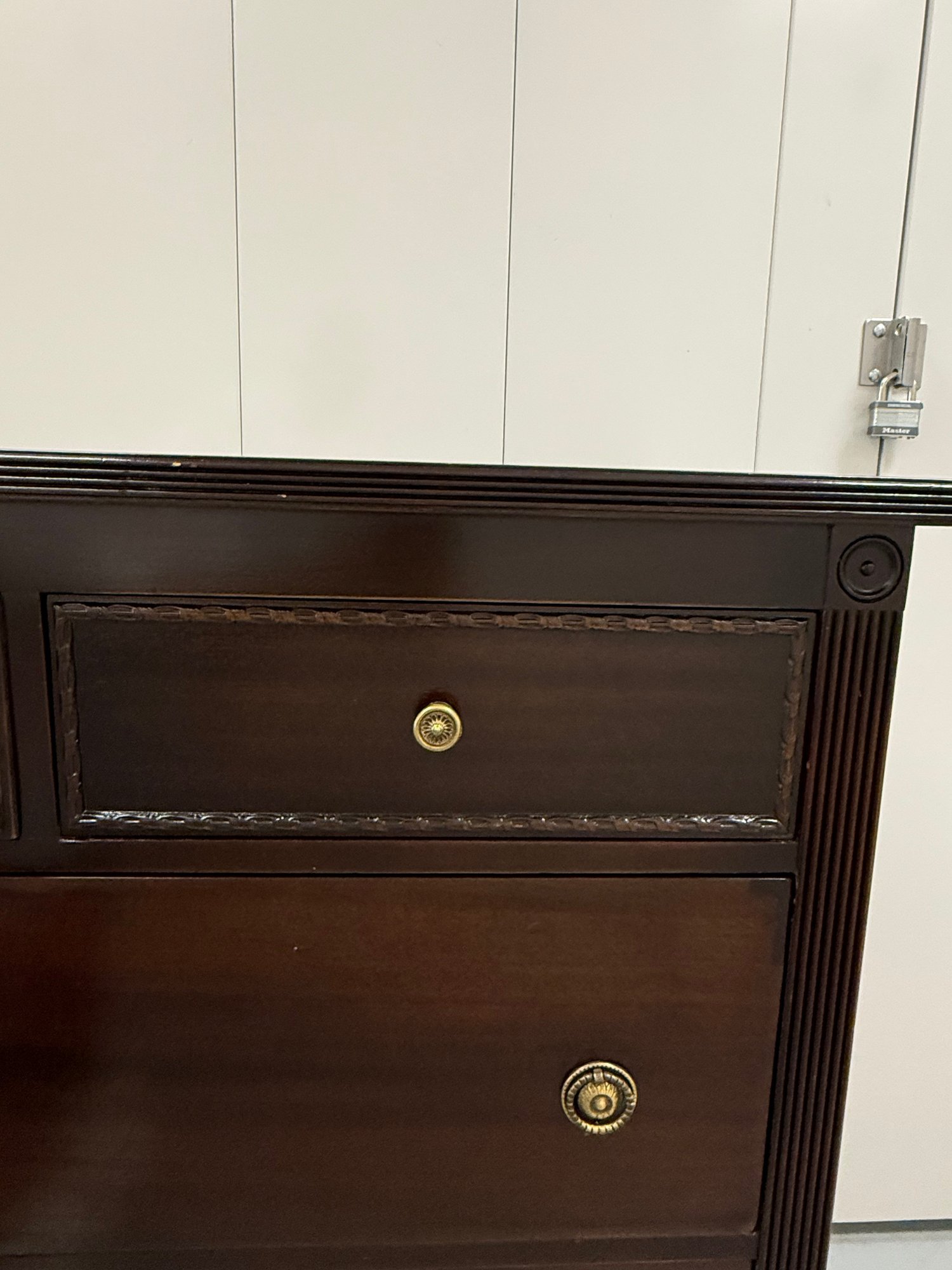 Antique (19th c.) dark wood (mahogany) tall chest of drawers, with fluted legs and brass drawer pulls.