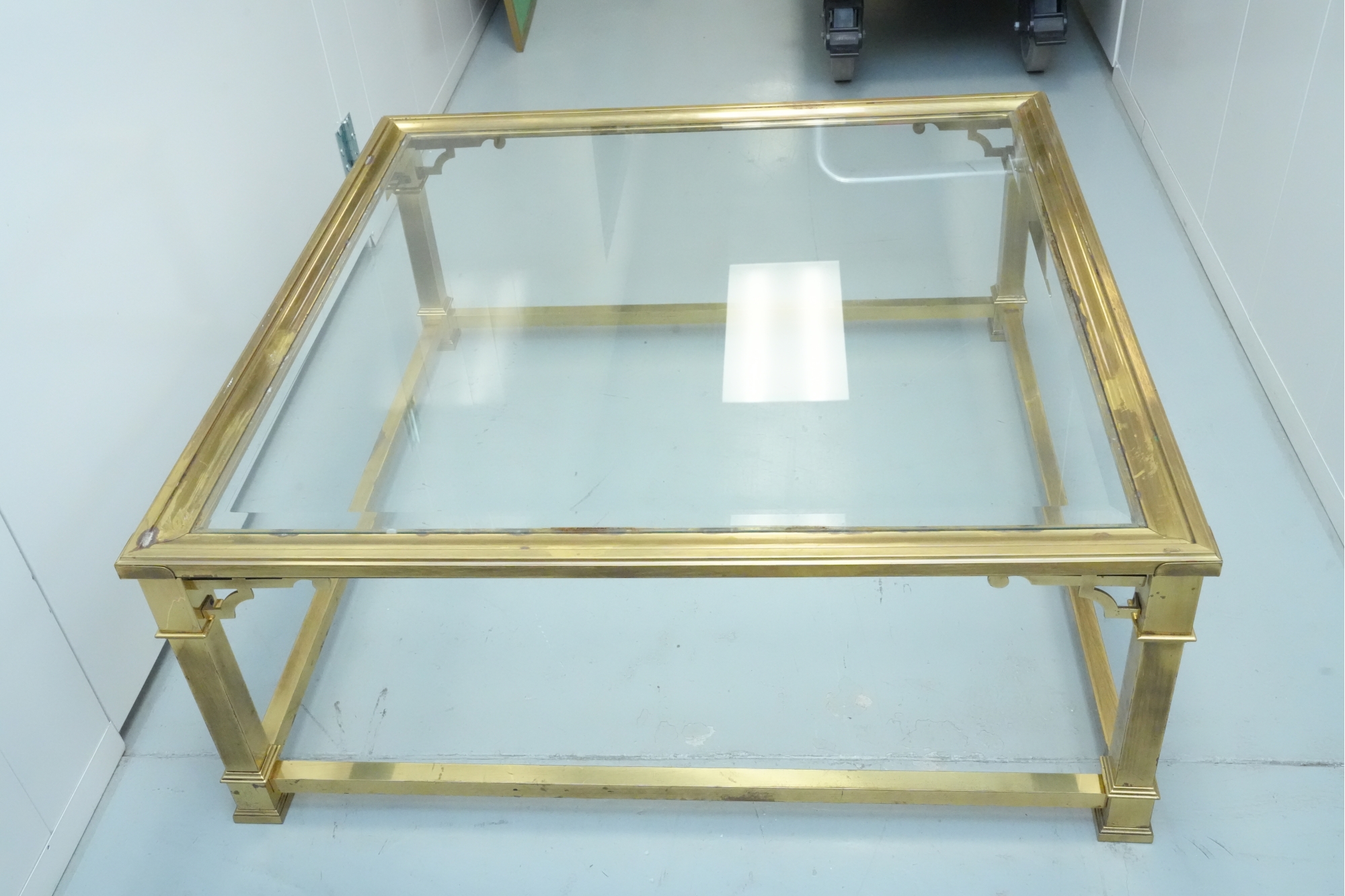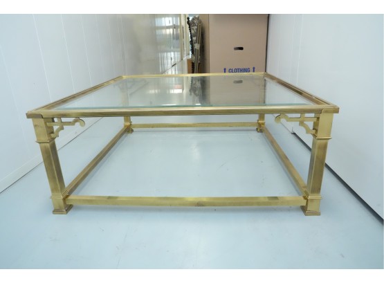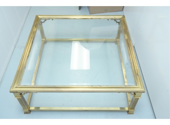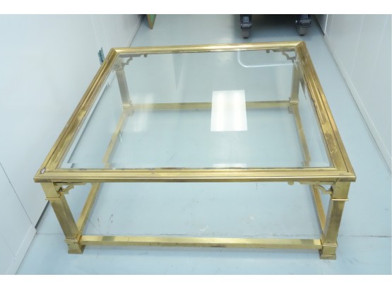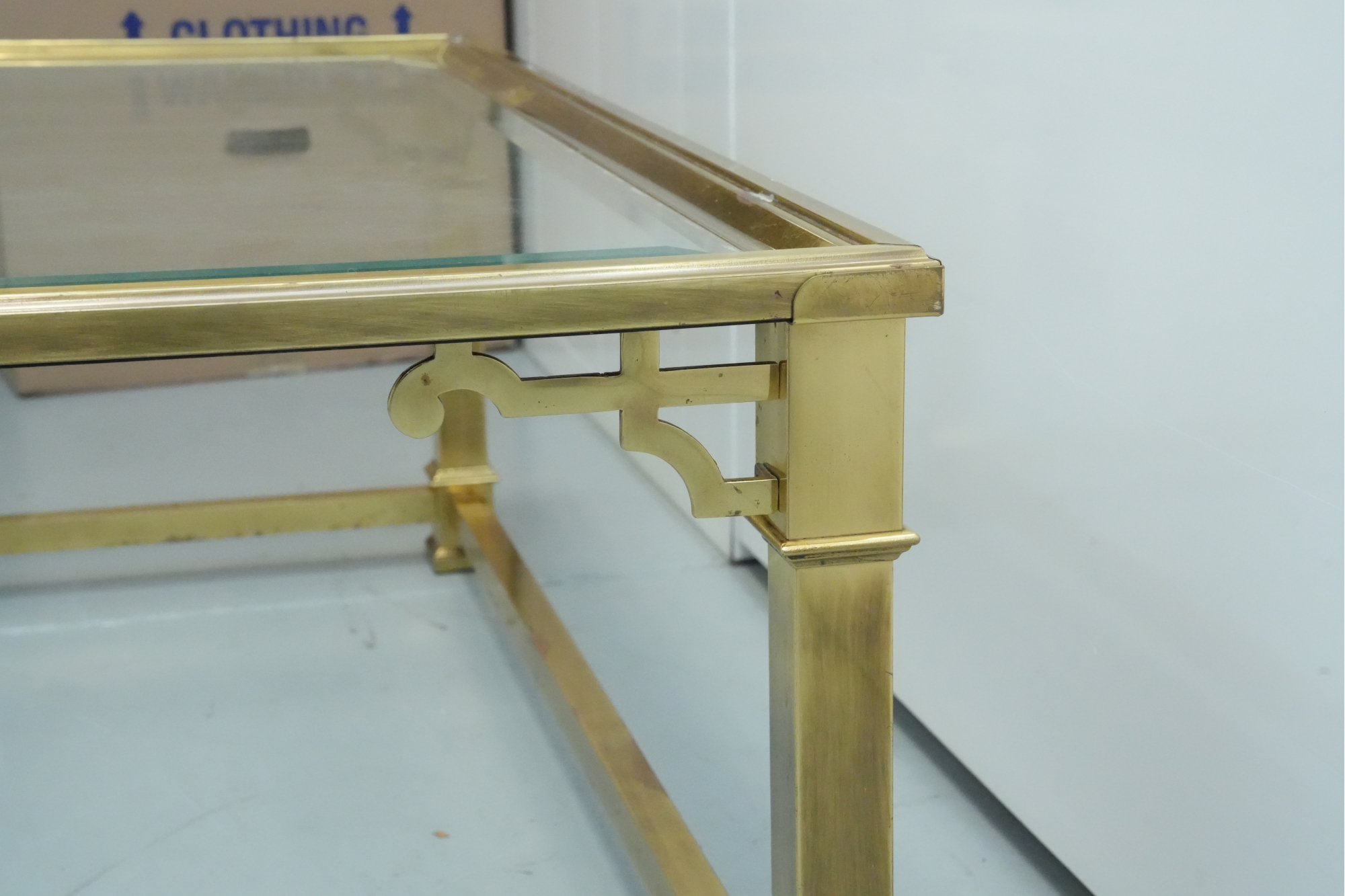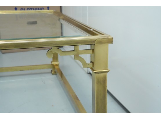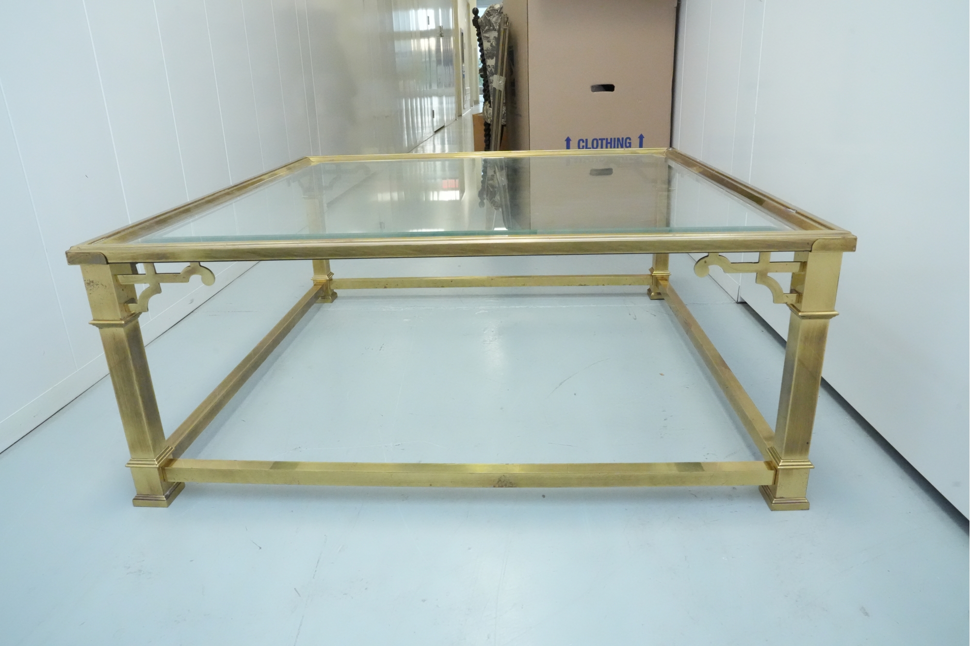 Vintage (1970s) Mastercraft Furniture Company (U.S.A.) brass and glass Greek key coffee table. Glass table does have a chip