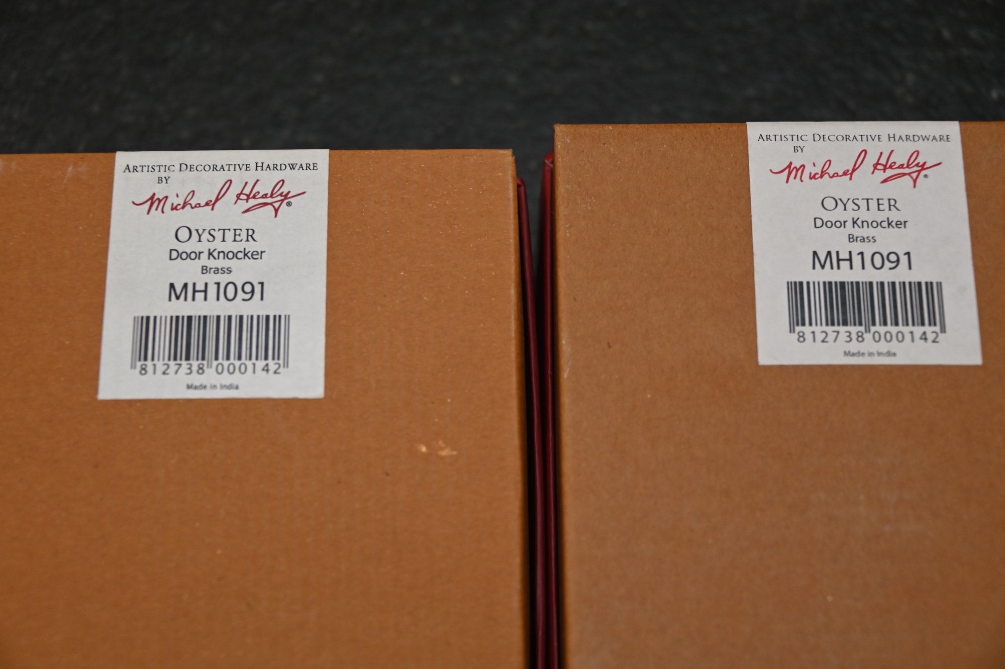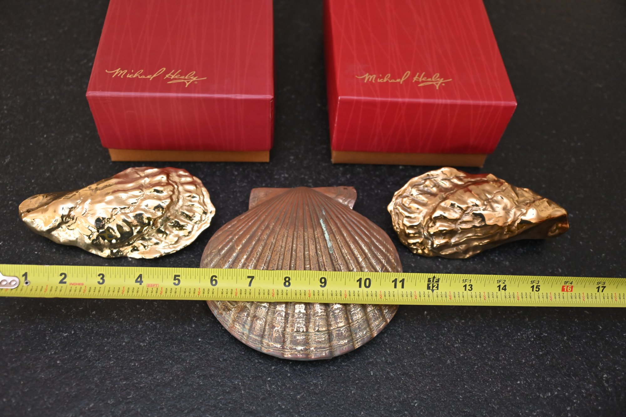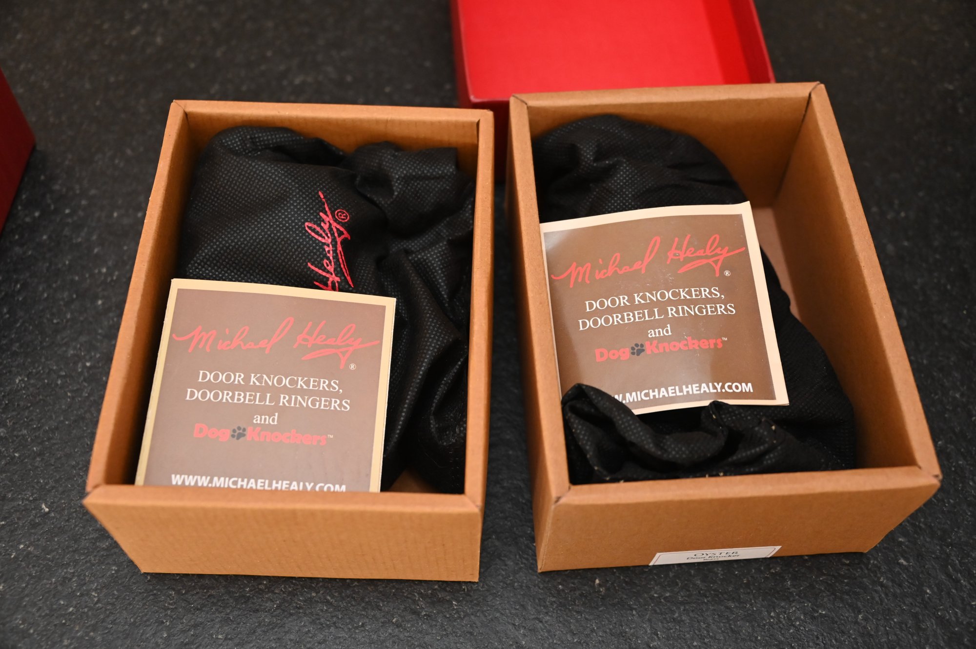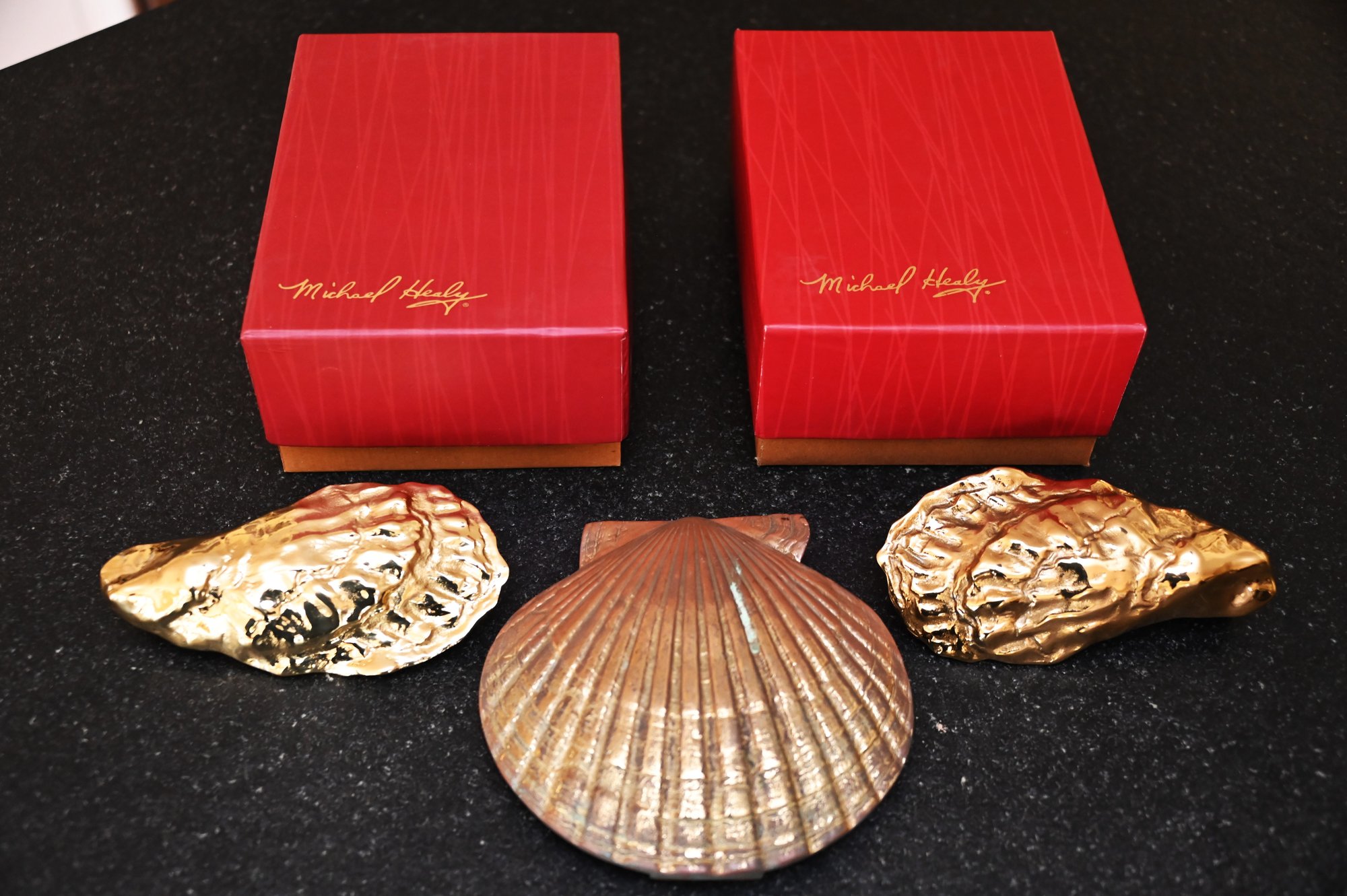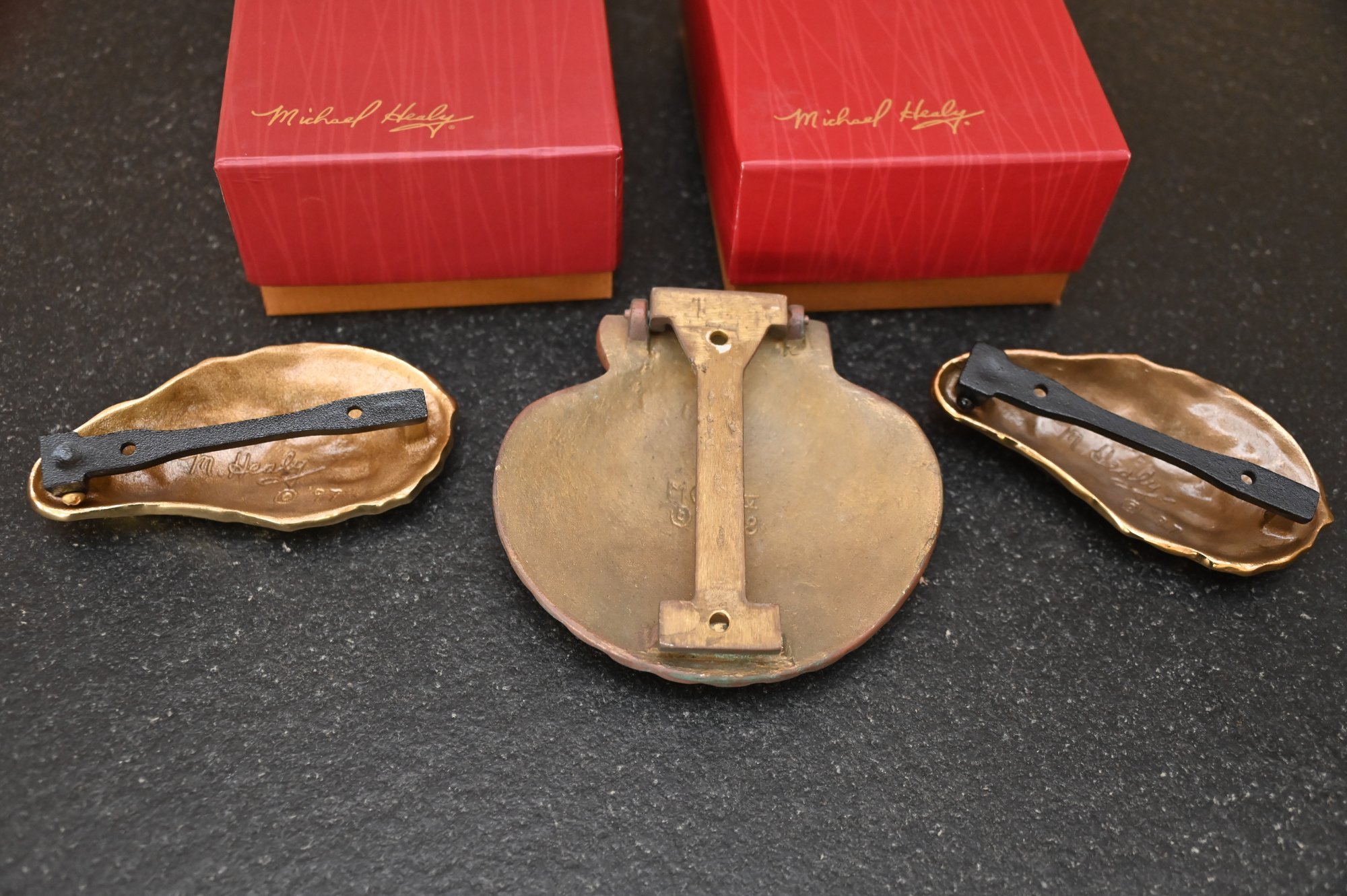This image features three decorative brass door knockers designed by Michael Healy, a well-known artist recognized for his handcrafted door knockers inspired by nature. Two of the pieces are oyster shell knockers with a polished, gold-tone finish, showcasing realistic texture and organic shape. The third piece is a scallop shell door knocker with a rich, antiqued brass finish and detailed ridges that mimic the natural form of a scallop shell. The two red boxes in the background, each signed "Michael Healy,"