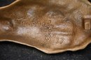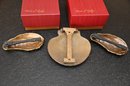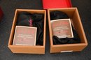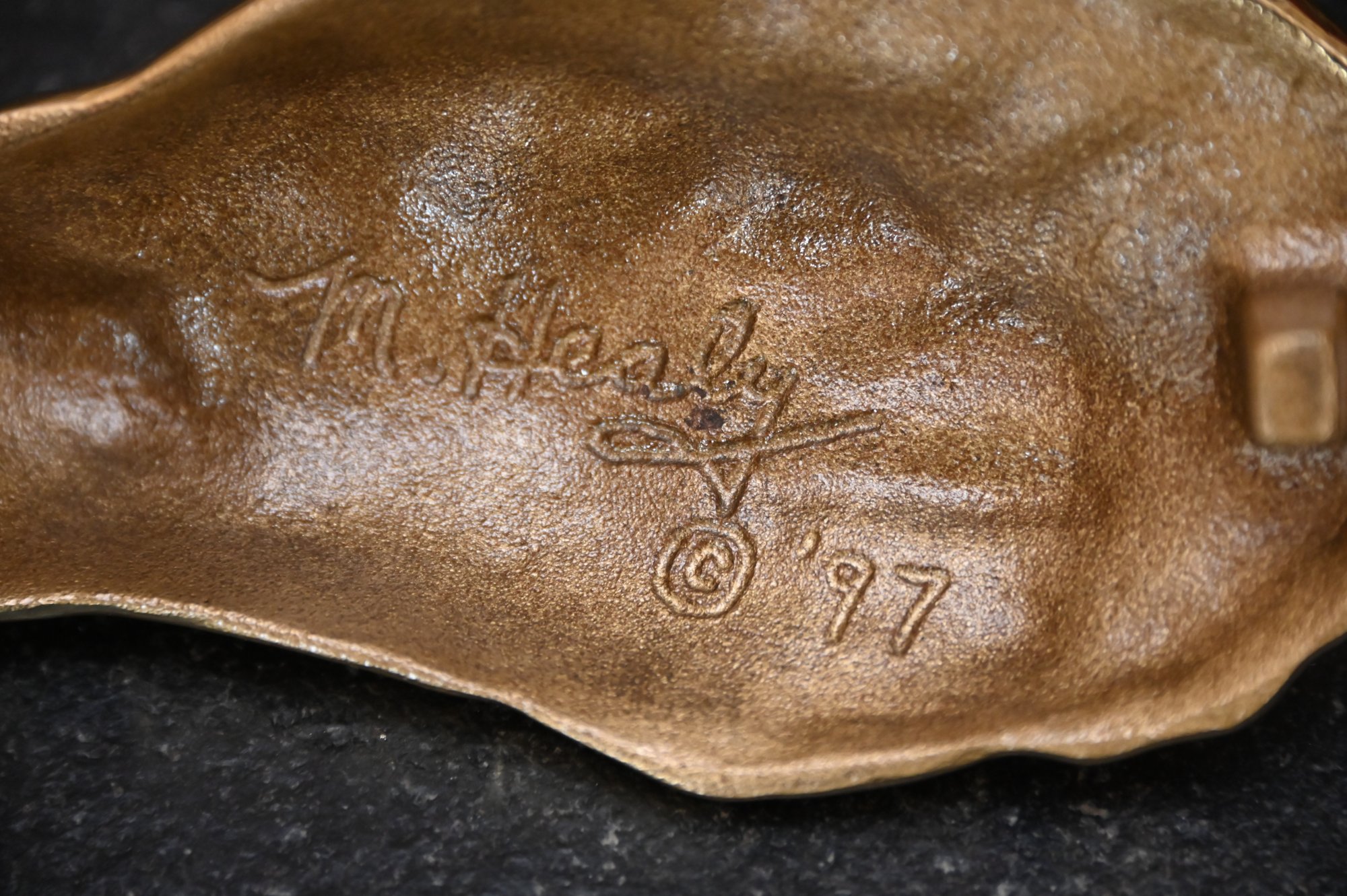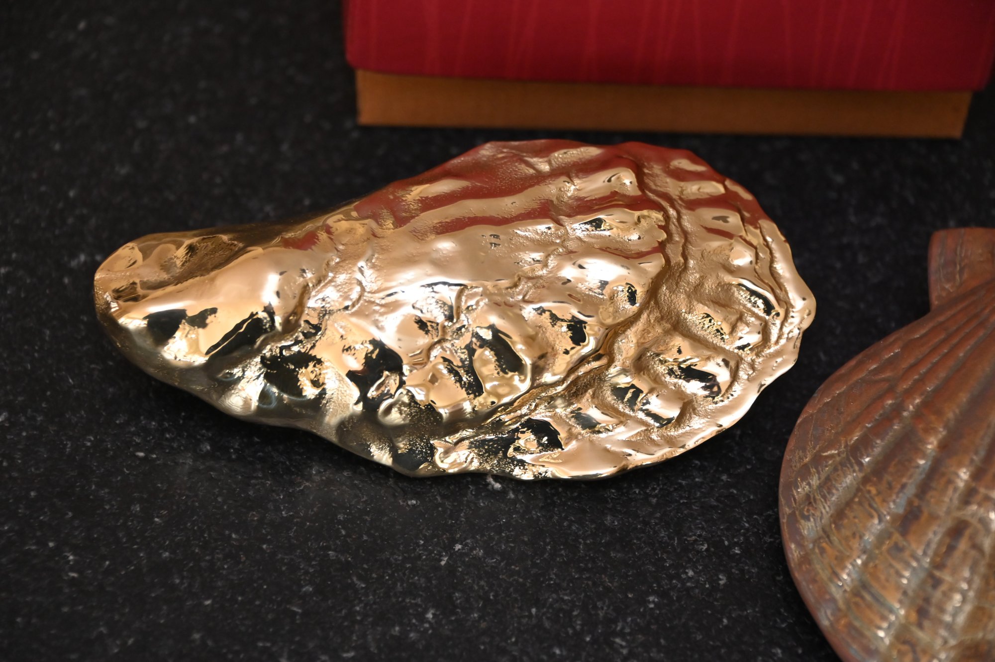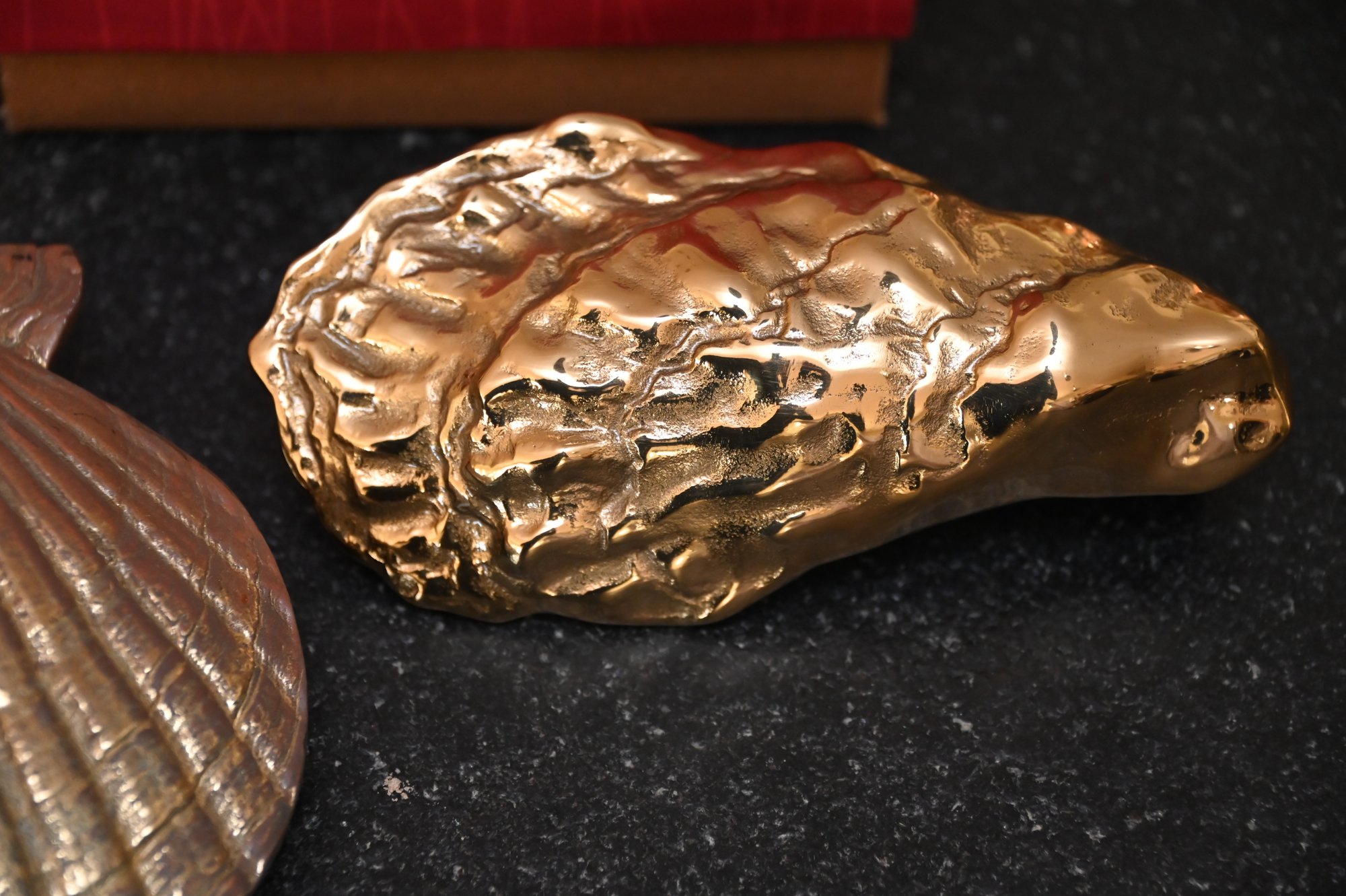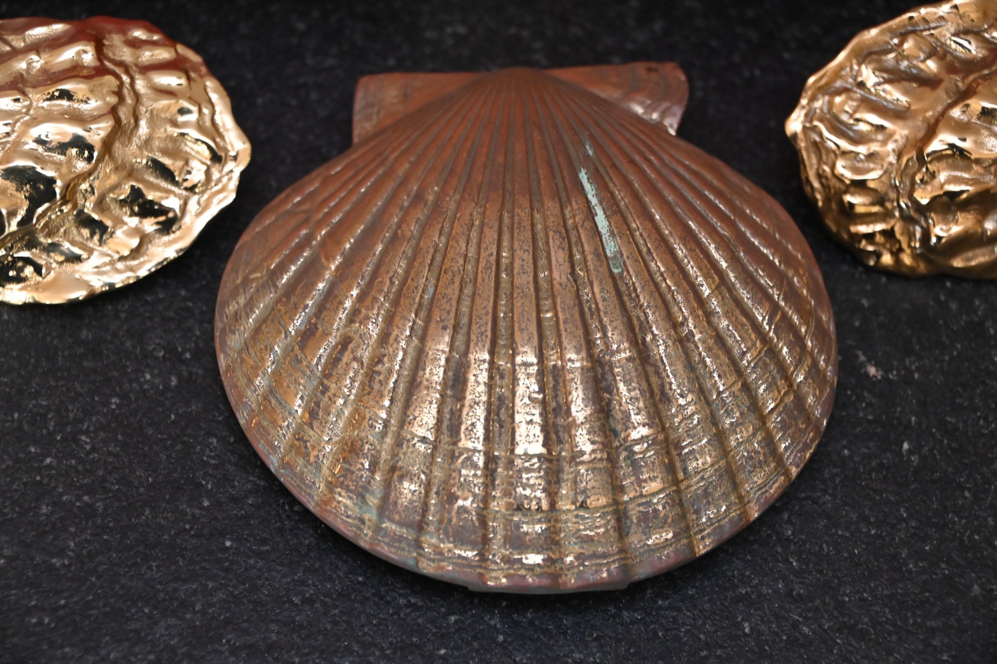 This image features three decorative brass door knockers designed by Michael Healy, a well-known artist recognized for his handcrafted door knockers inspired by nature. Two of the pieces are oyster shell knockers with a polished, gold-tone finish, showcasing realistic texture and organic shape. The third piece is a scallop shell door knocker with a rich, antiqued brass finish and detailed ridges that mimic the natural form of a scallop shell. The two red boxes in the background, each signed "Michael Healy,"