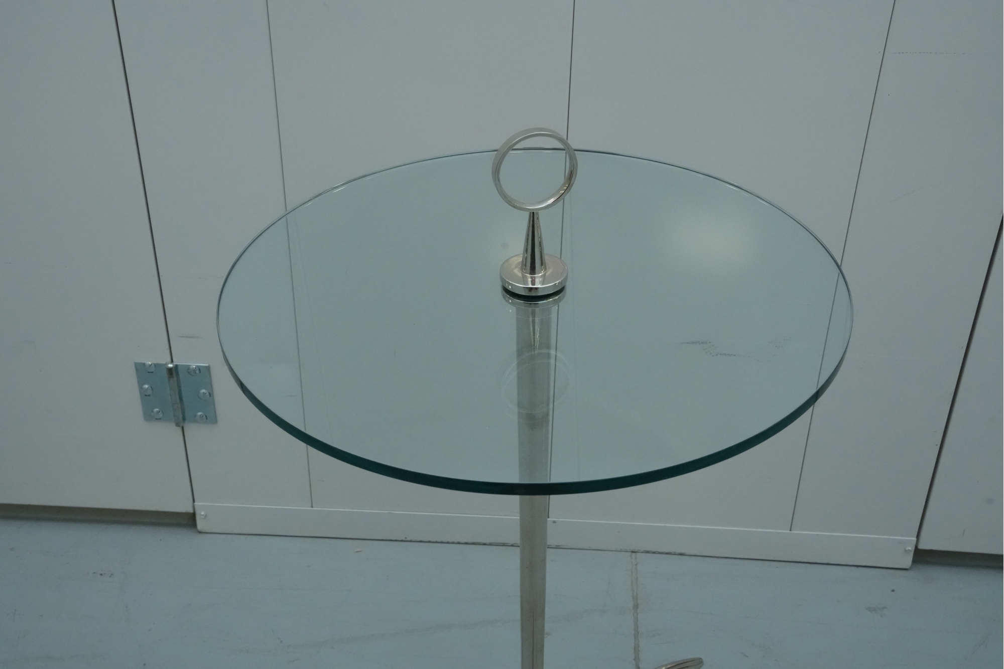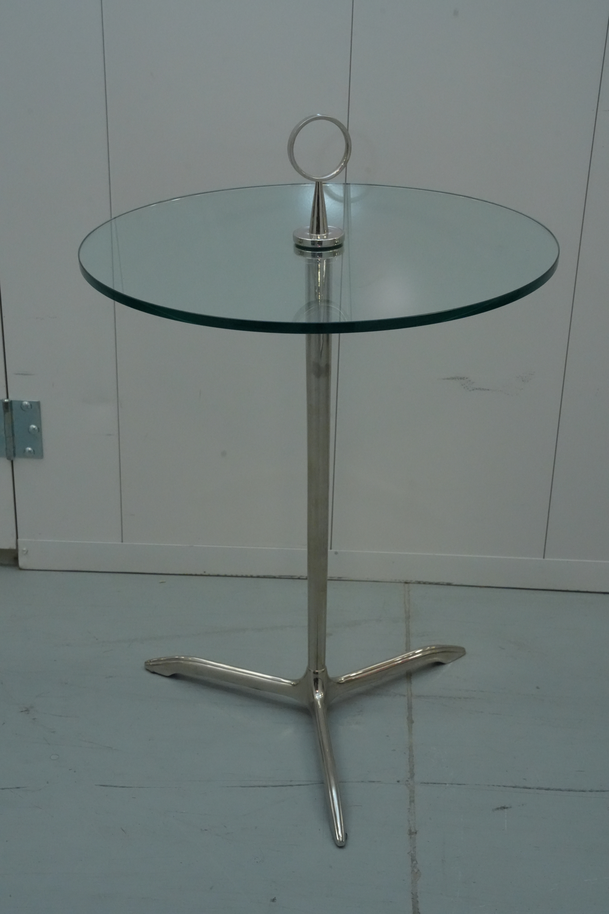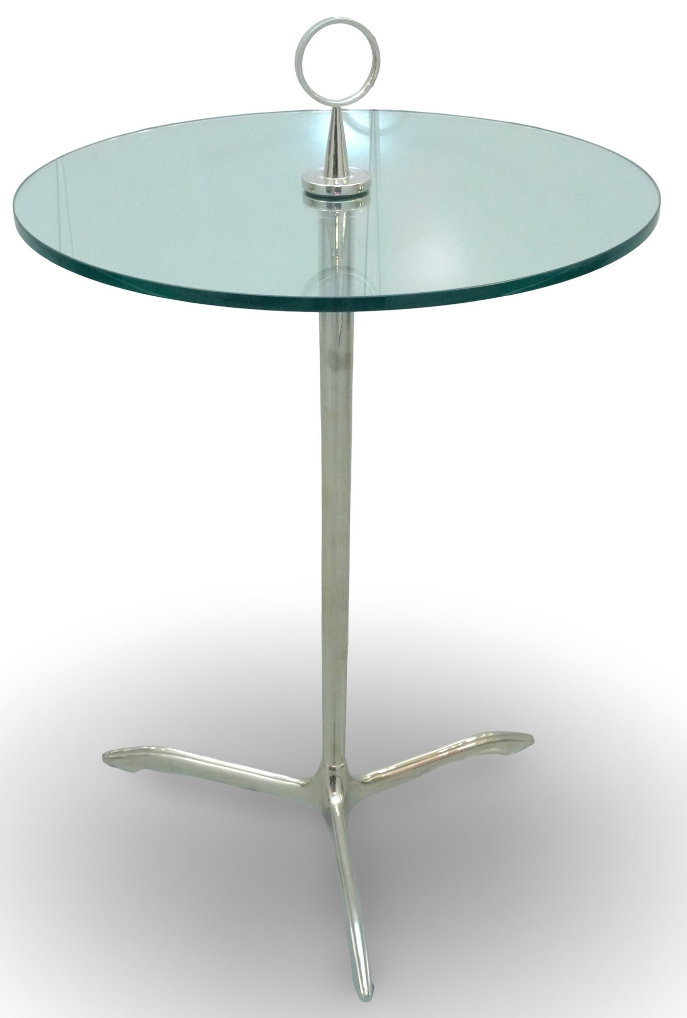 Minimalist 1950s side table featuring a polished stainless-steel tripod base, green-tinted round glass top, and a circular metal handle on top for easy movement.