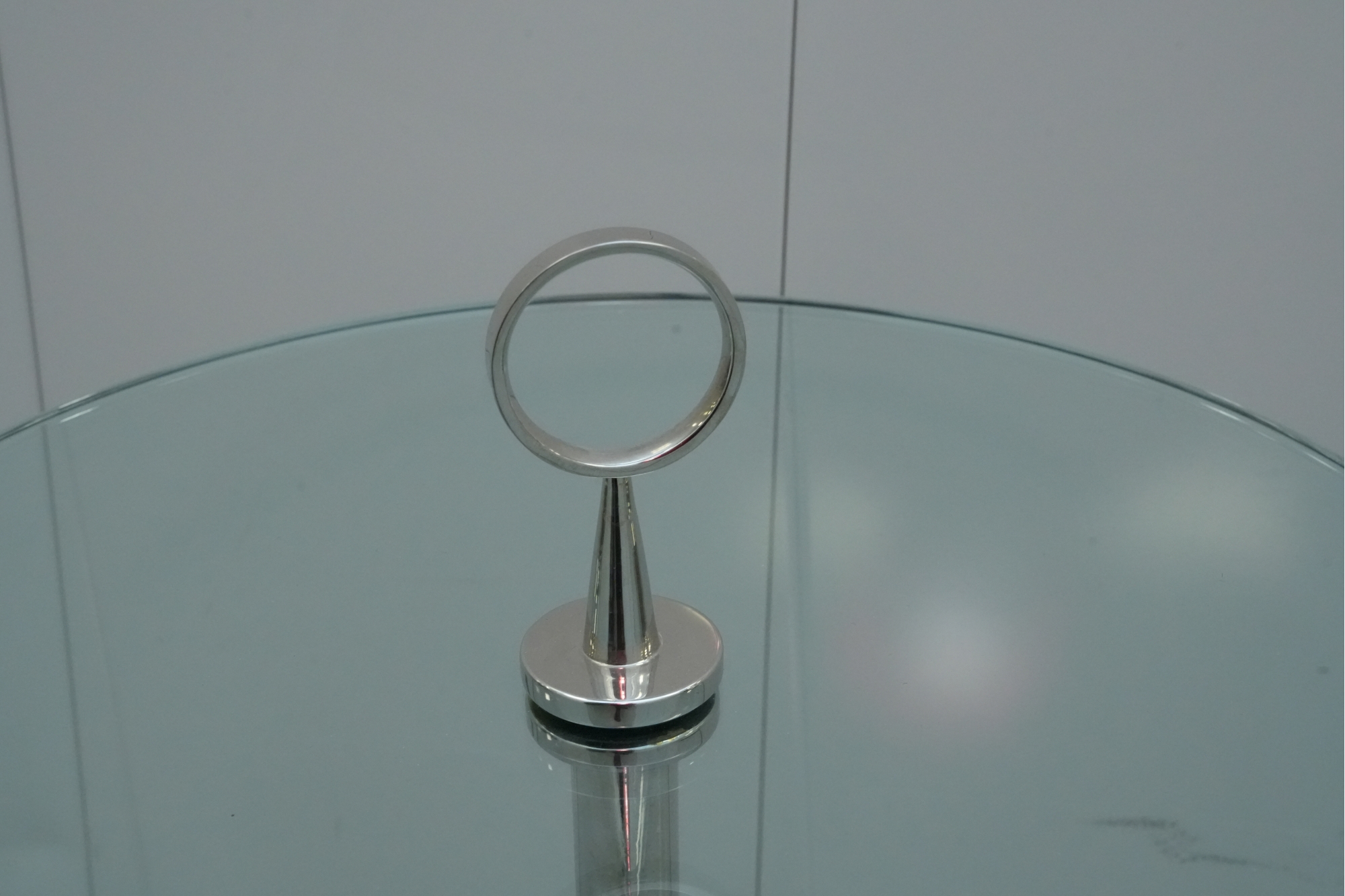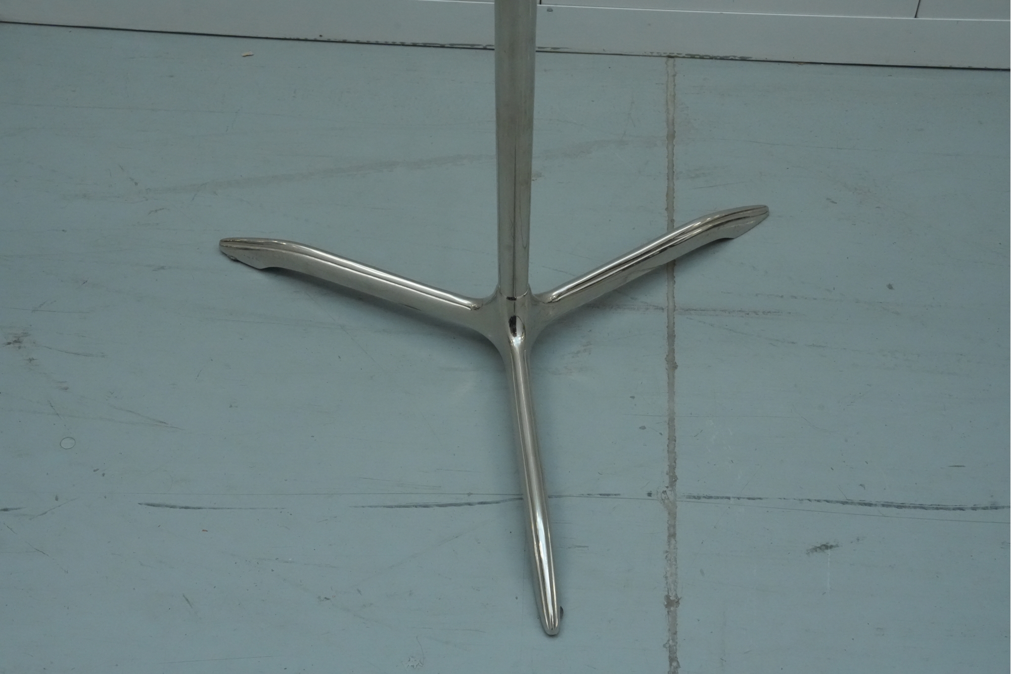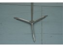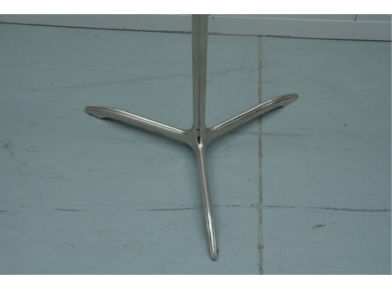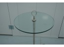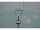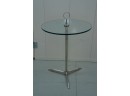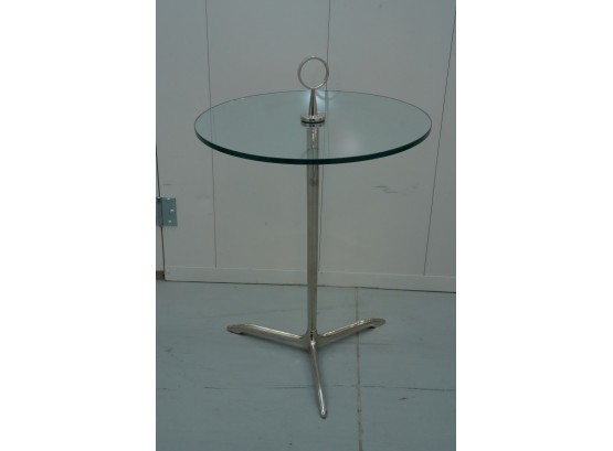 Minimalist 1950s side table featuring a polished stainless-steel tripod base, green-tinted round glass top, and a circular metal handle on top for easy movement.