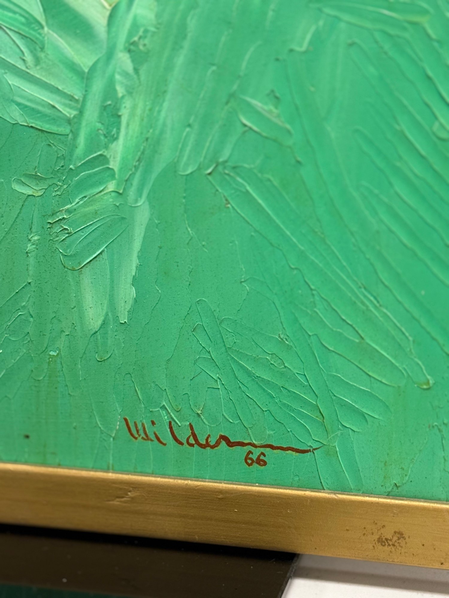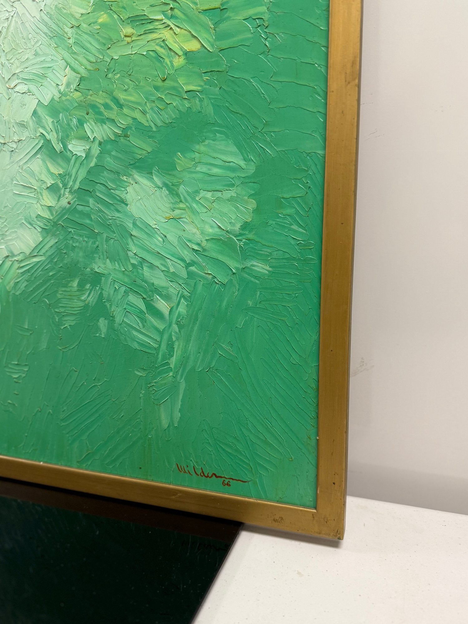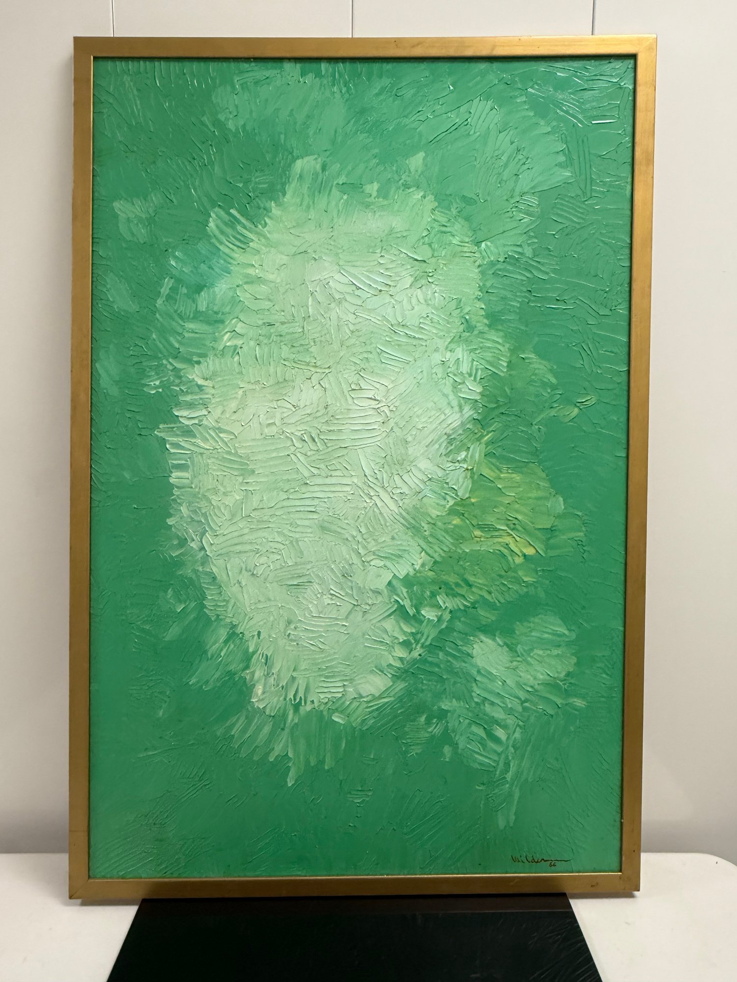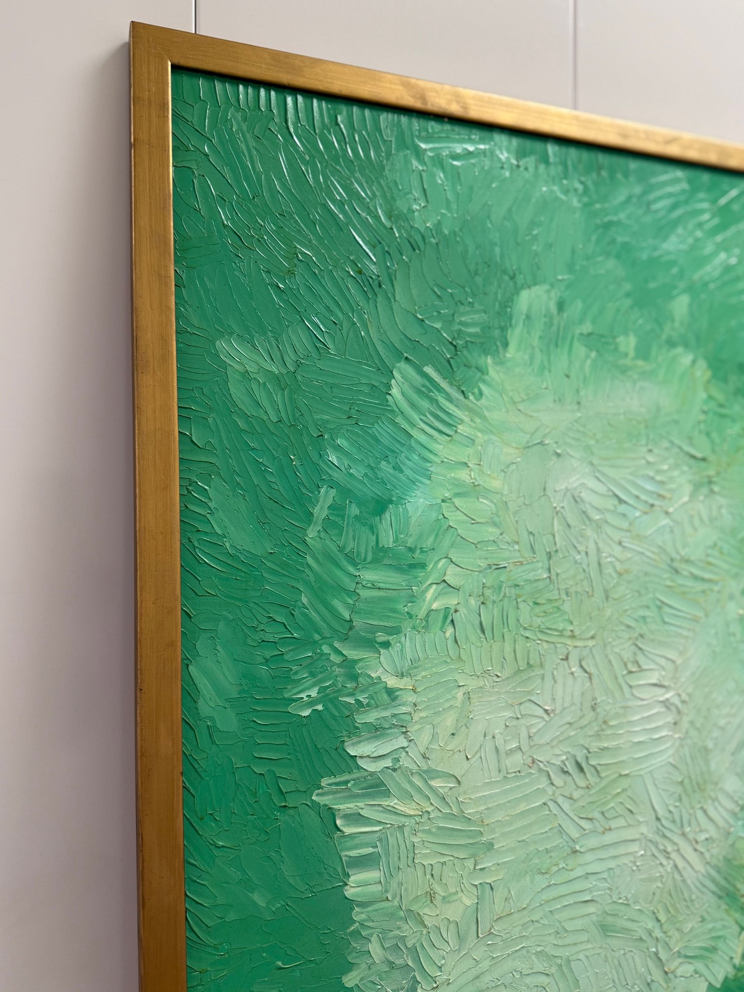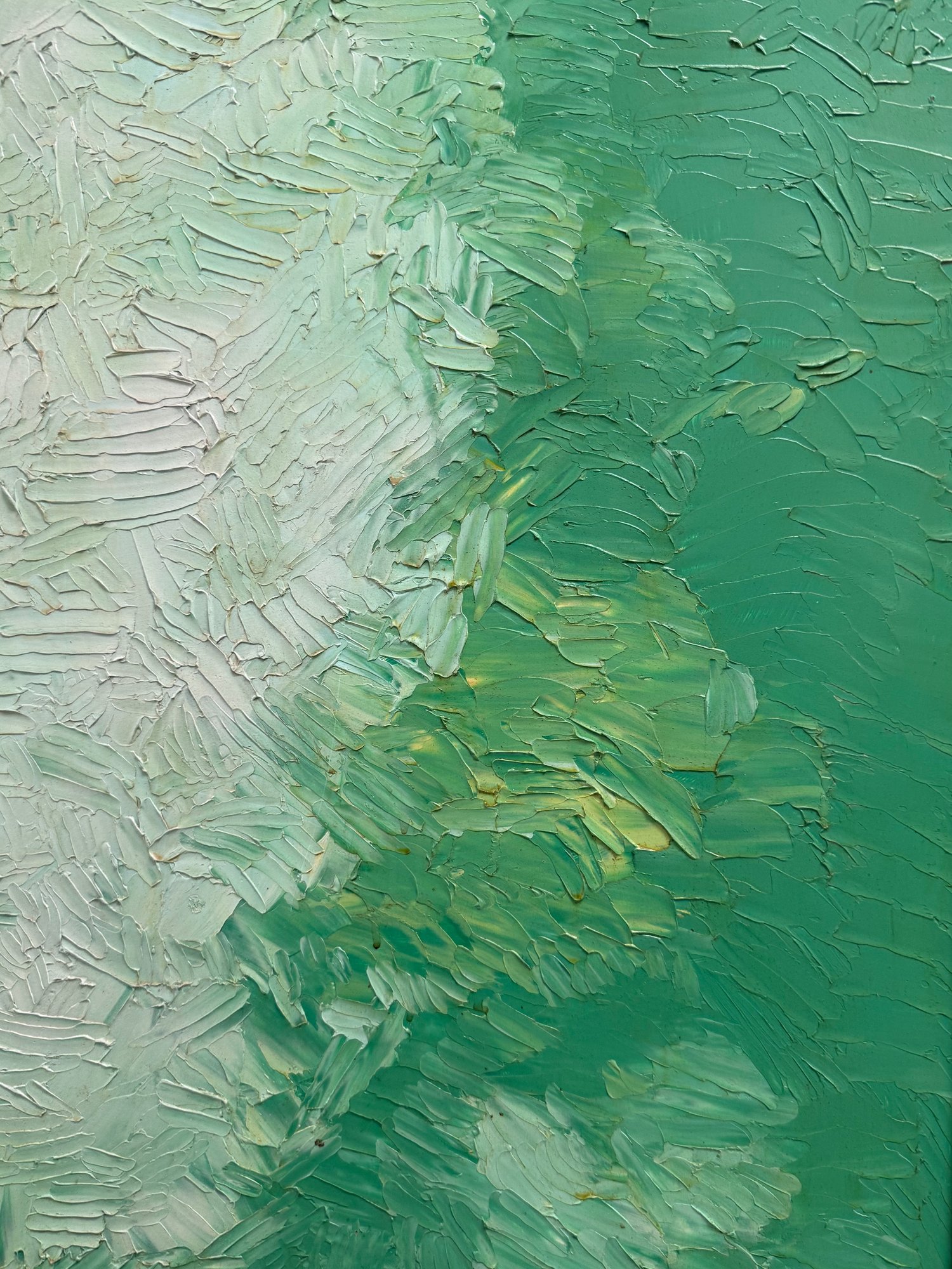 Abstract expressionist painting, featuring a vibrant green background with a central area of lighter green and white impasto brushwork.