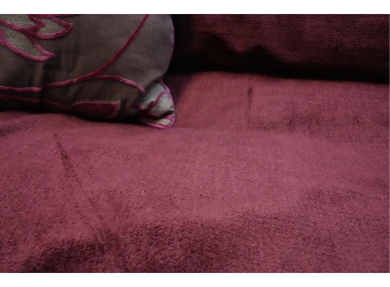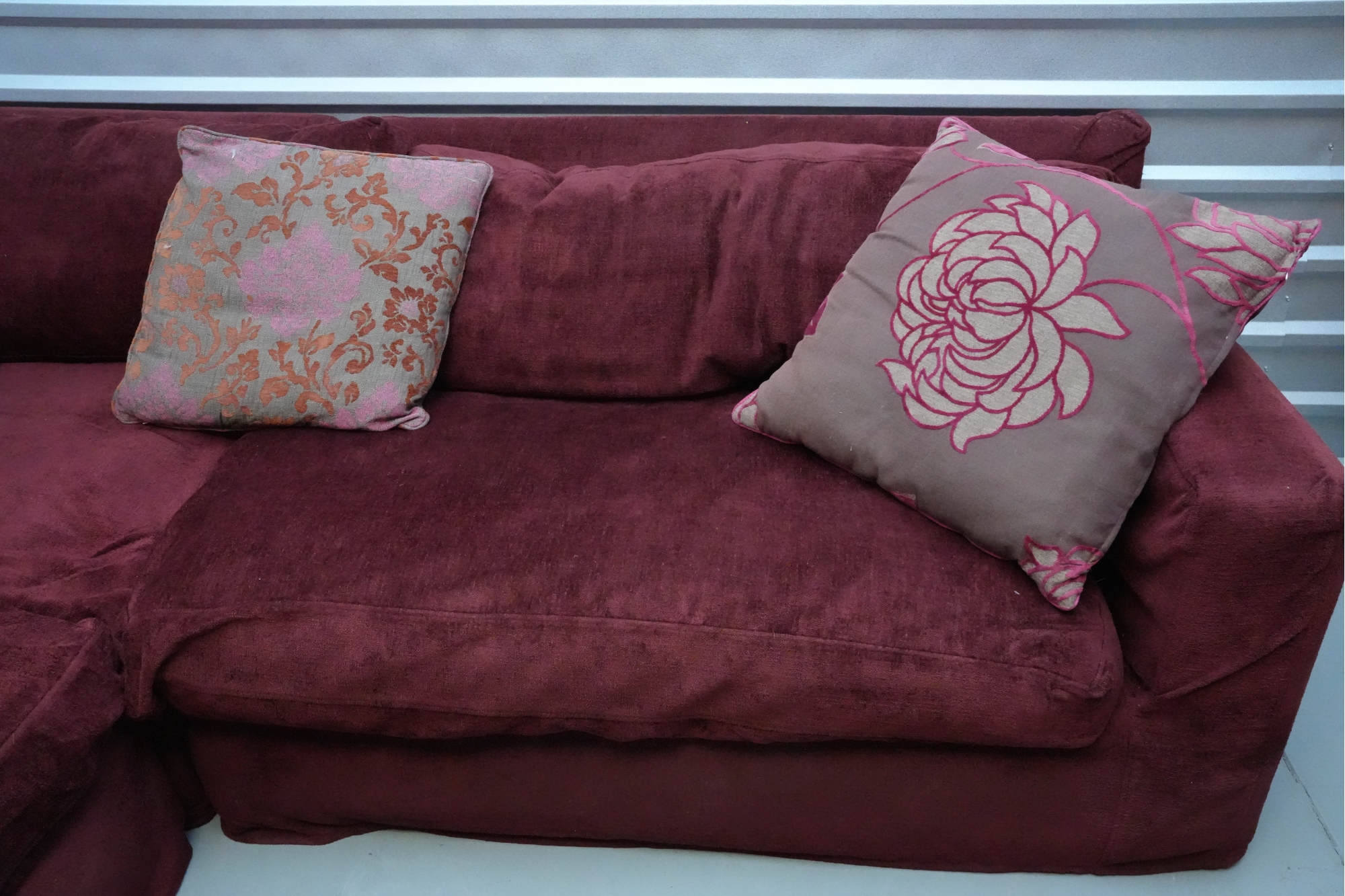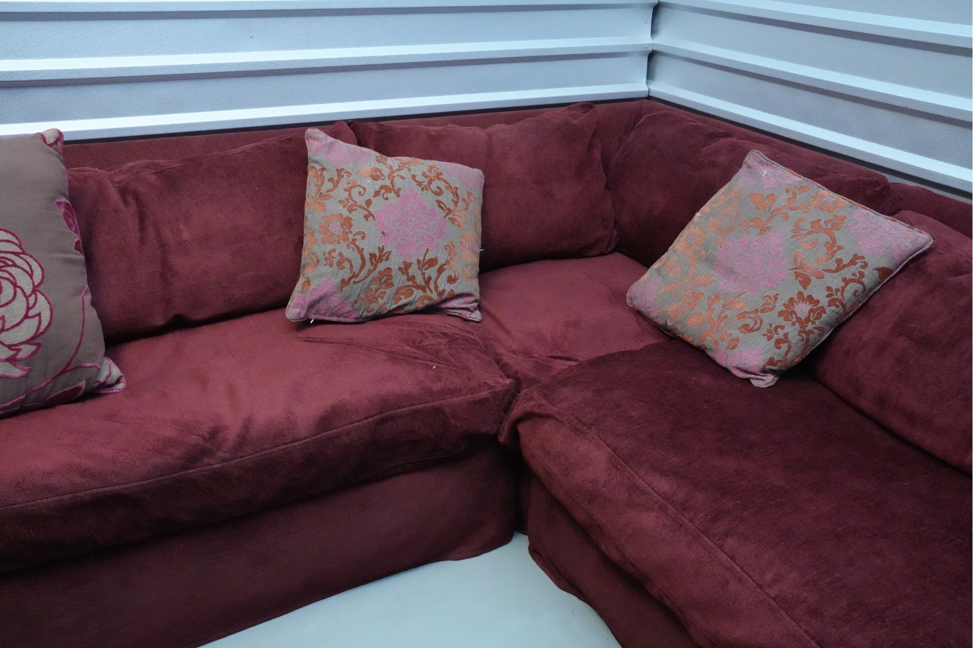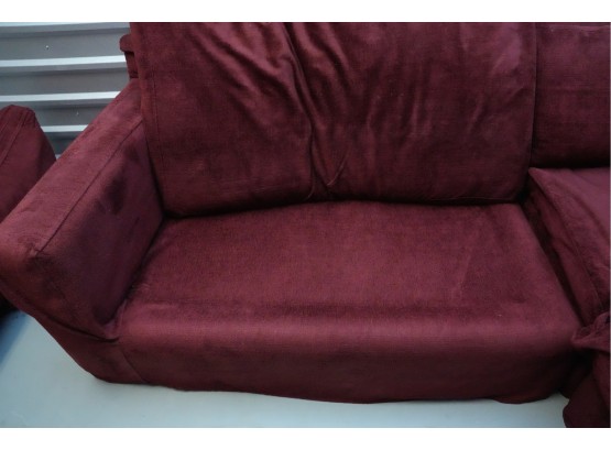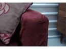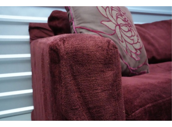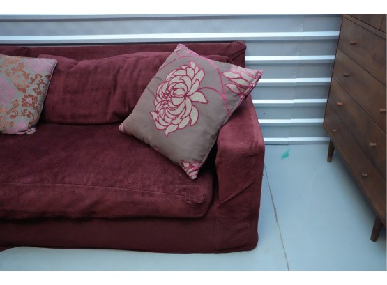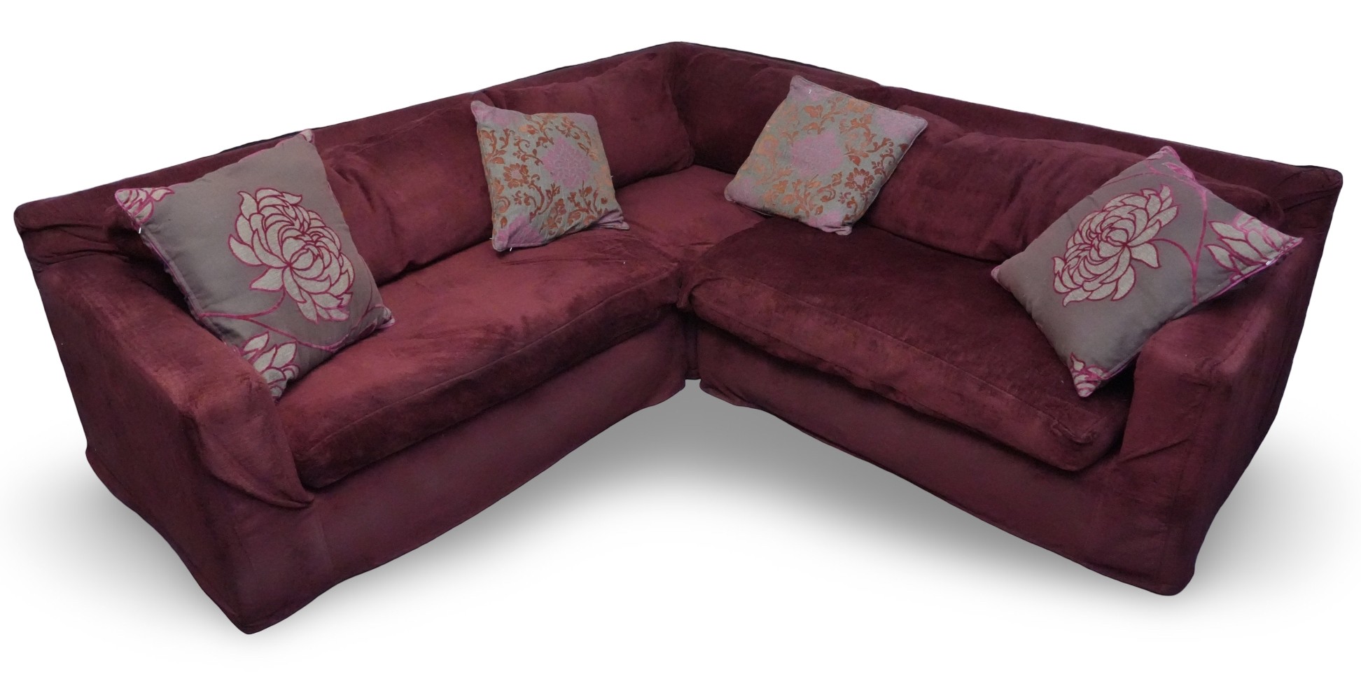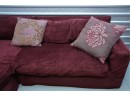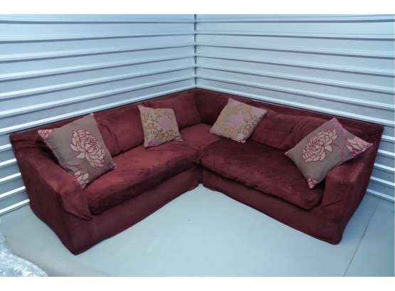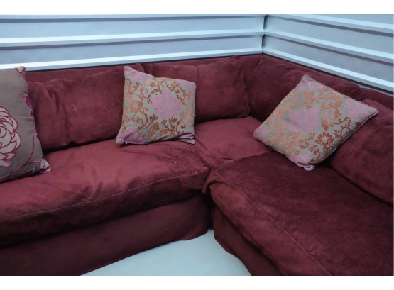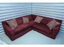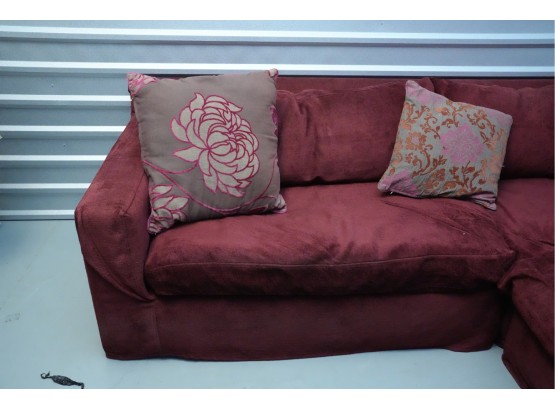 Montauk Sofa (Canada) burgundy fabric sectional sofa with floral accent pillows.