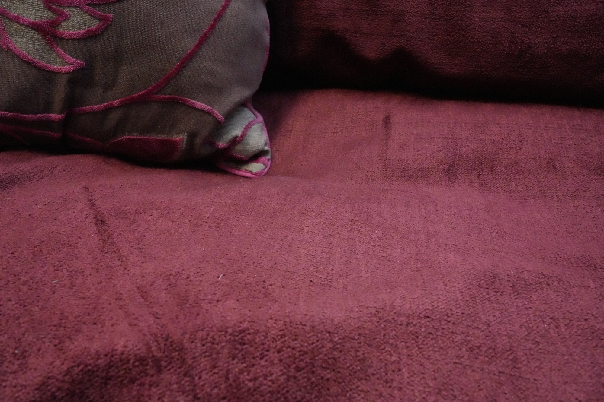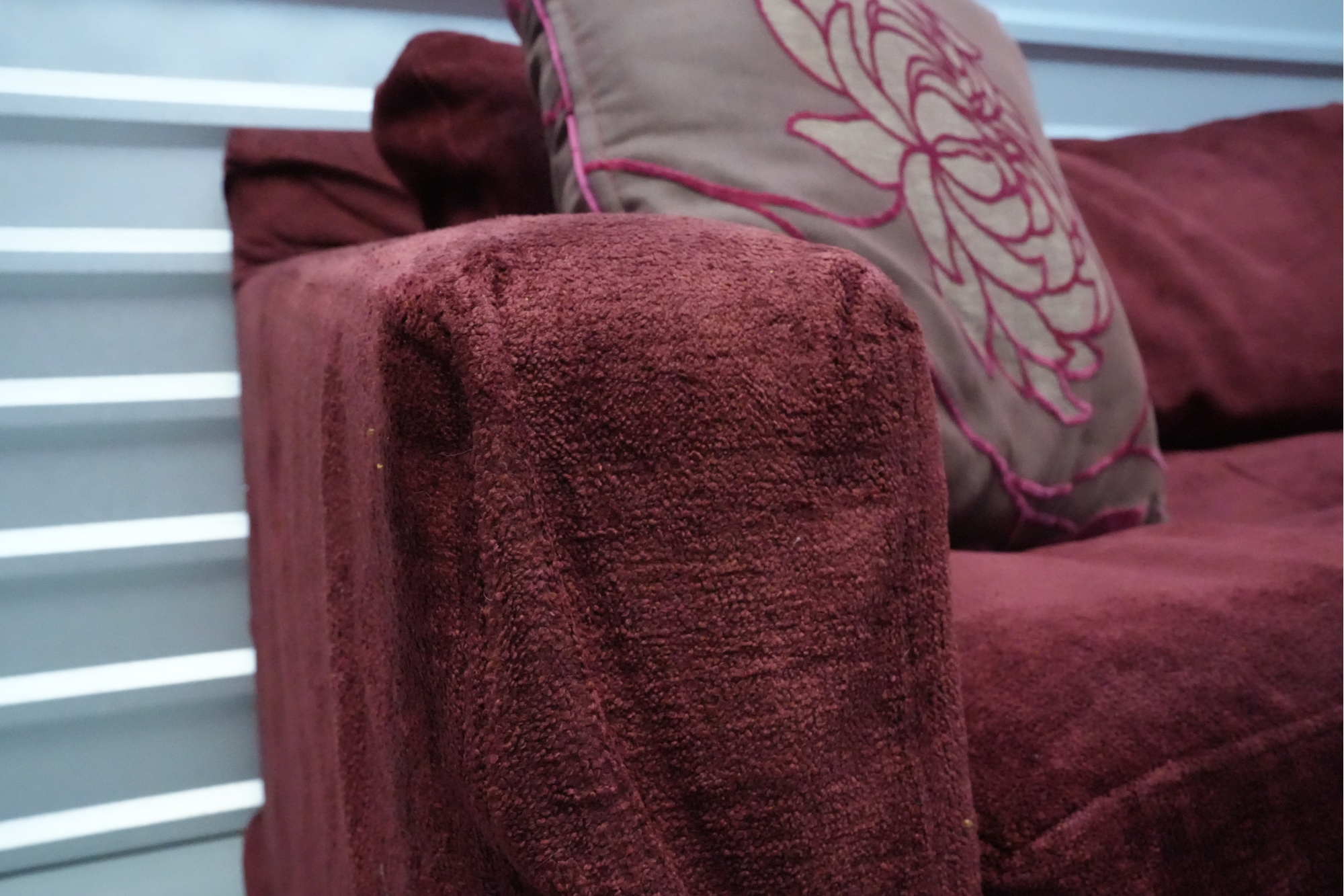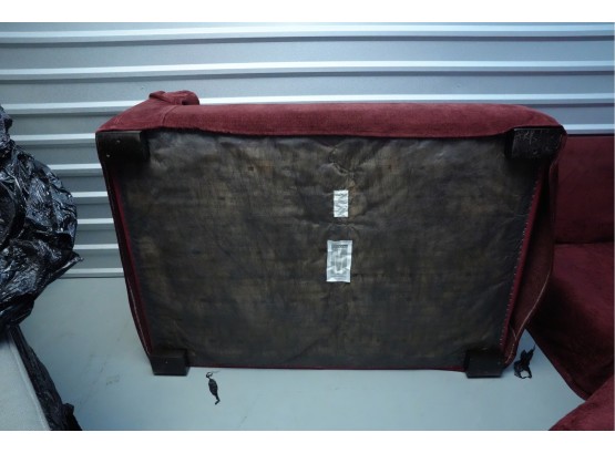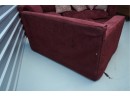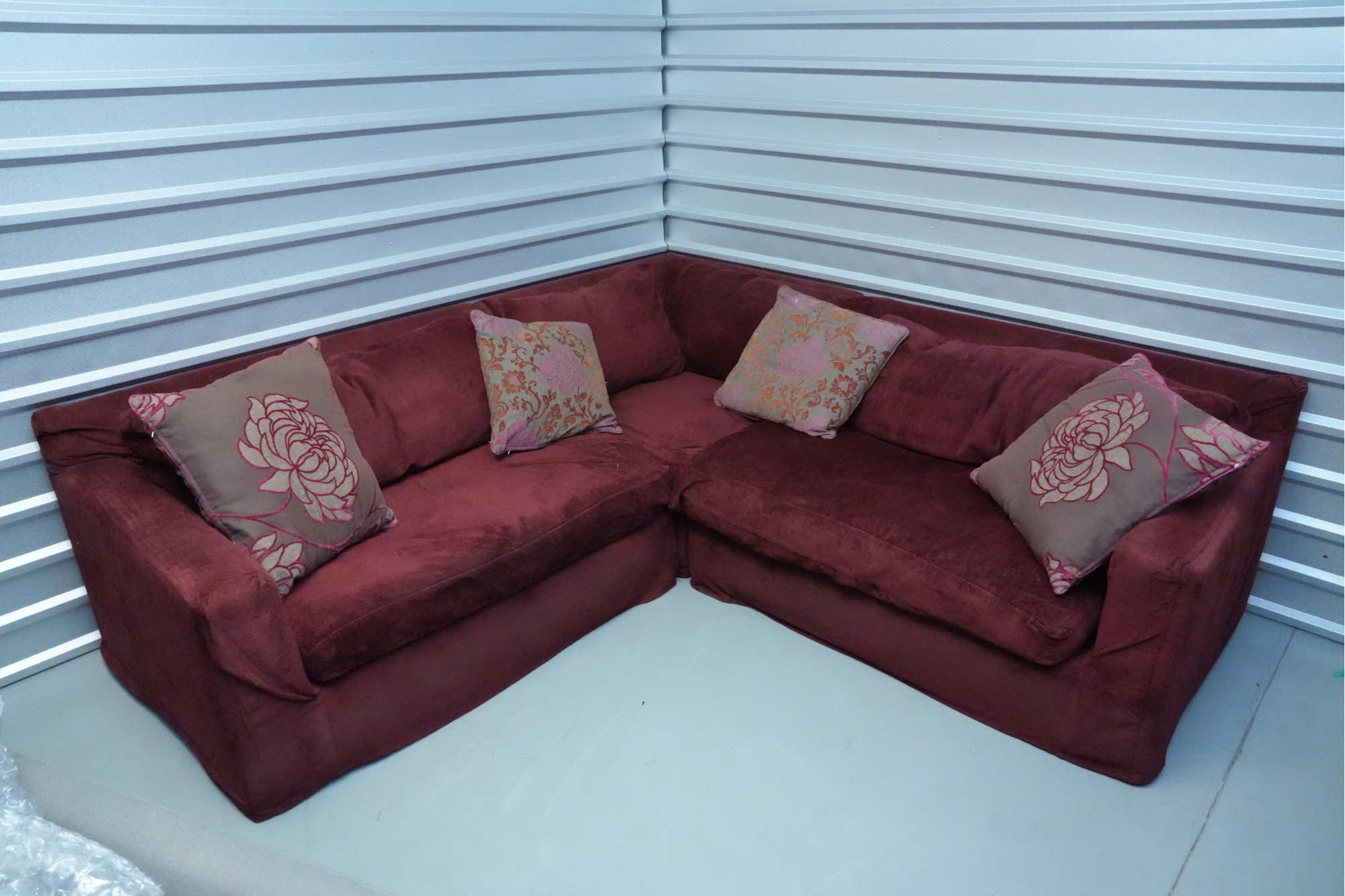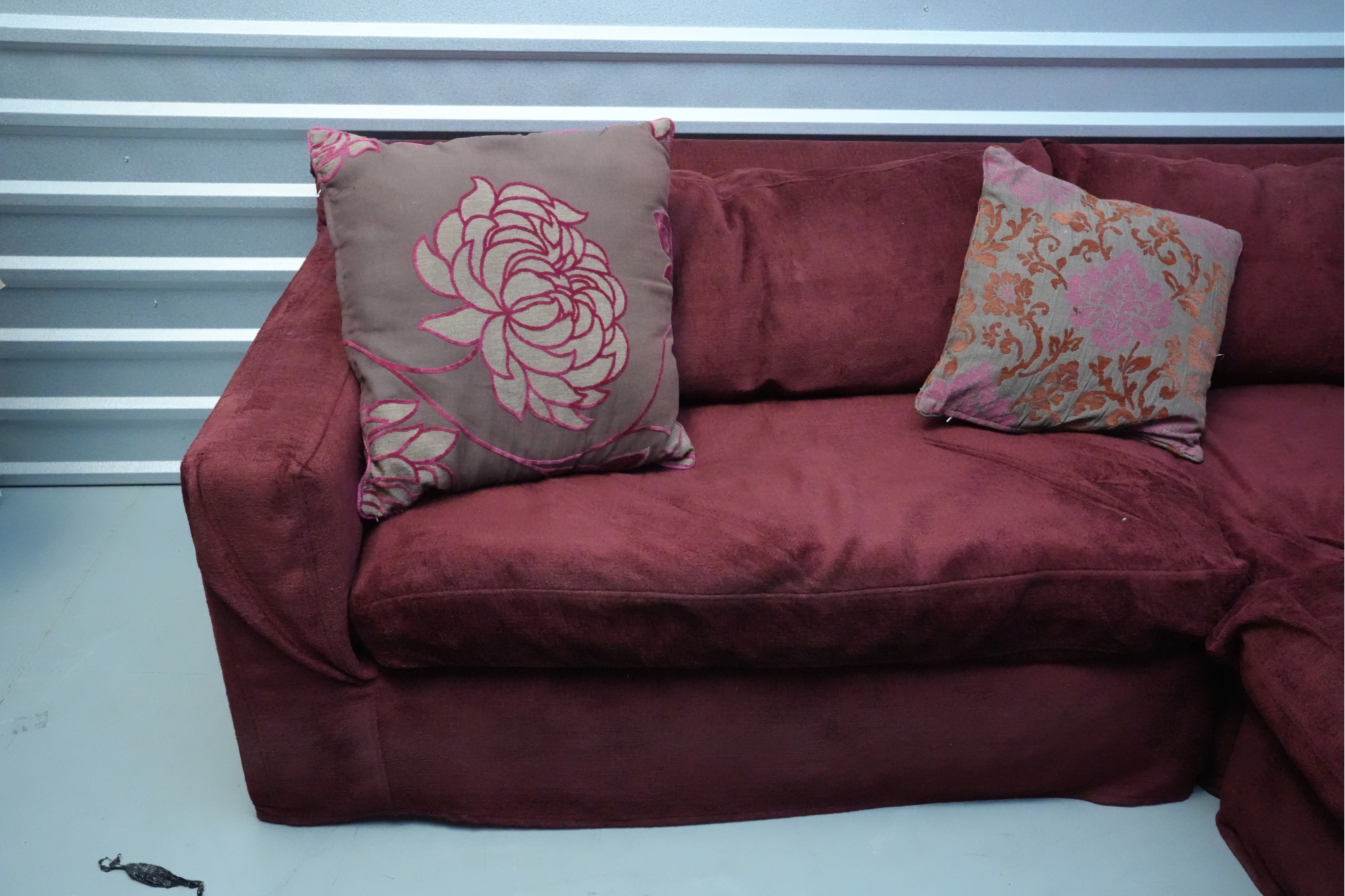 Montauk Sofa (Canada) burgundy fabric sectional sofa with floral accent pillows.