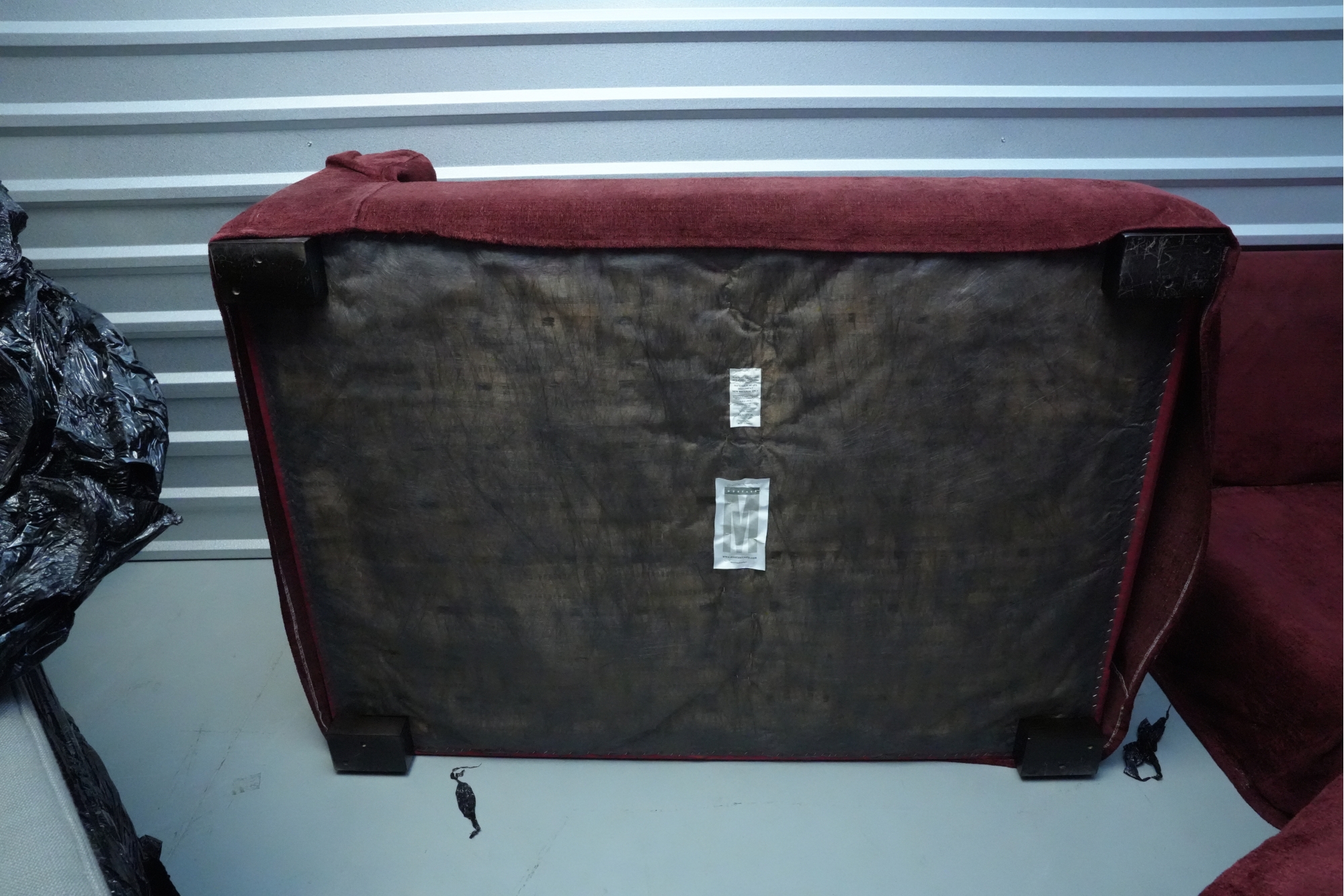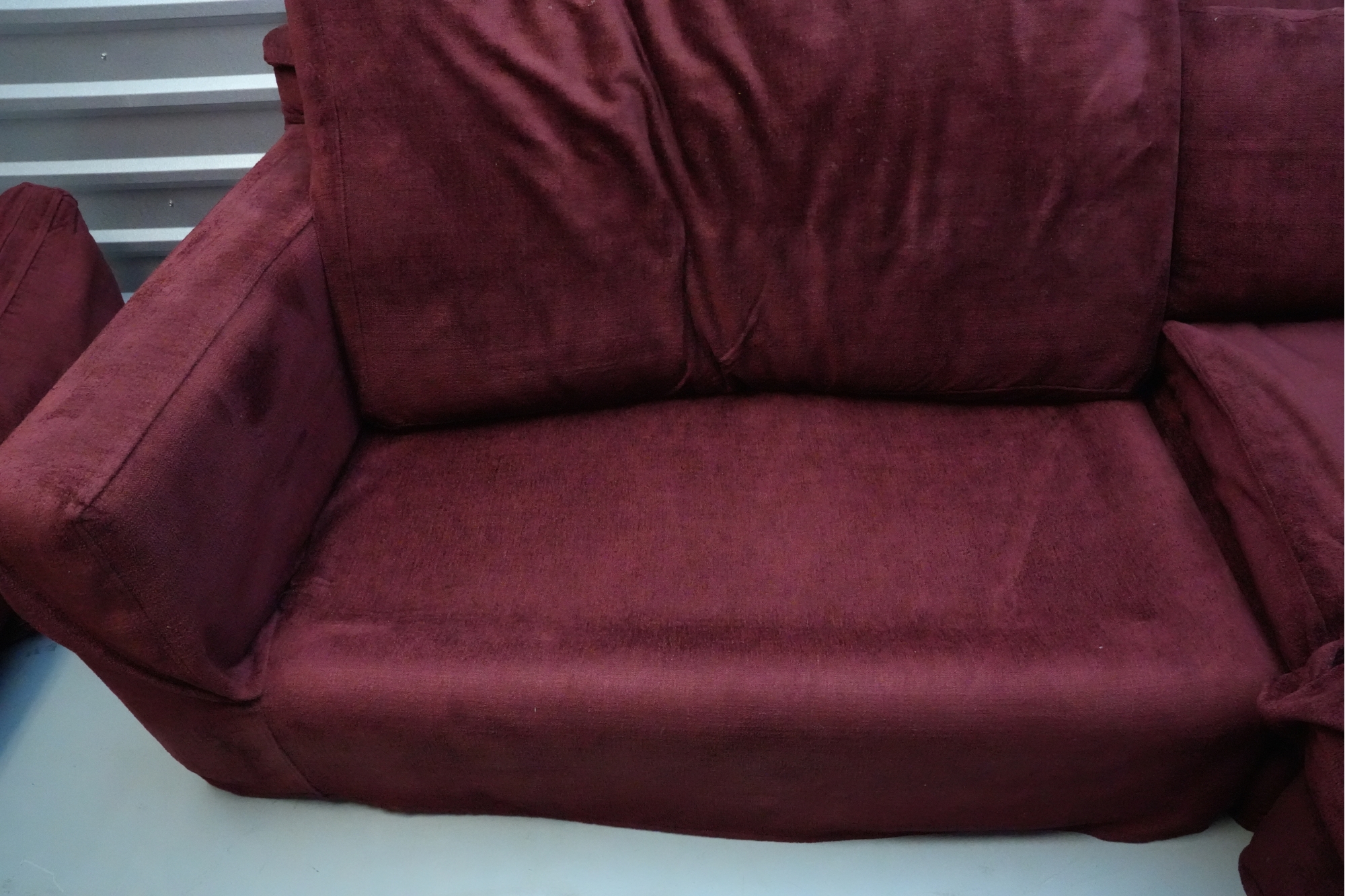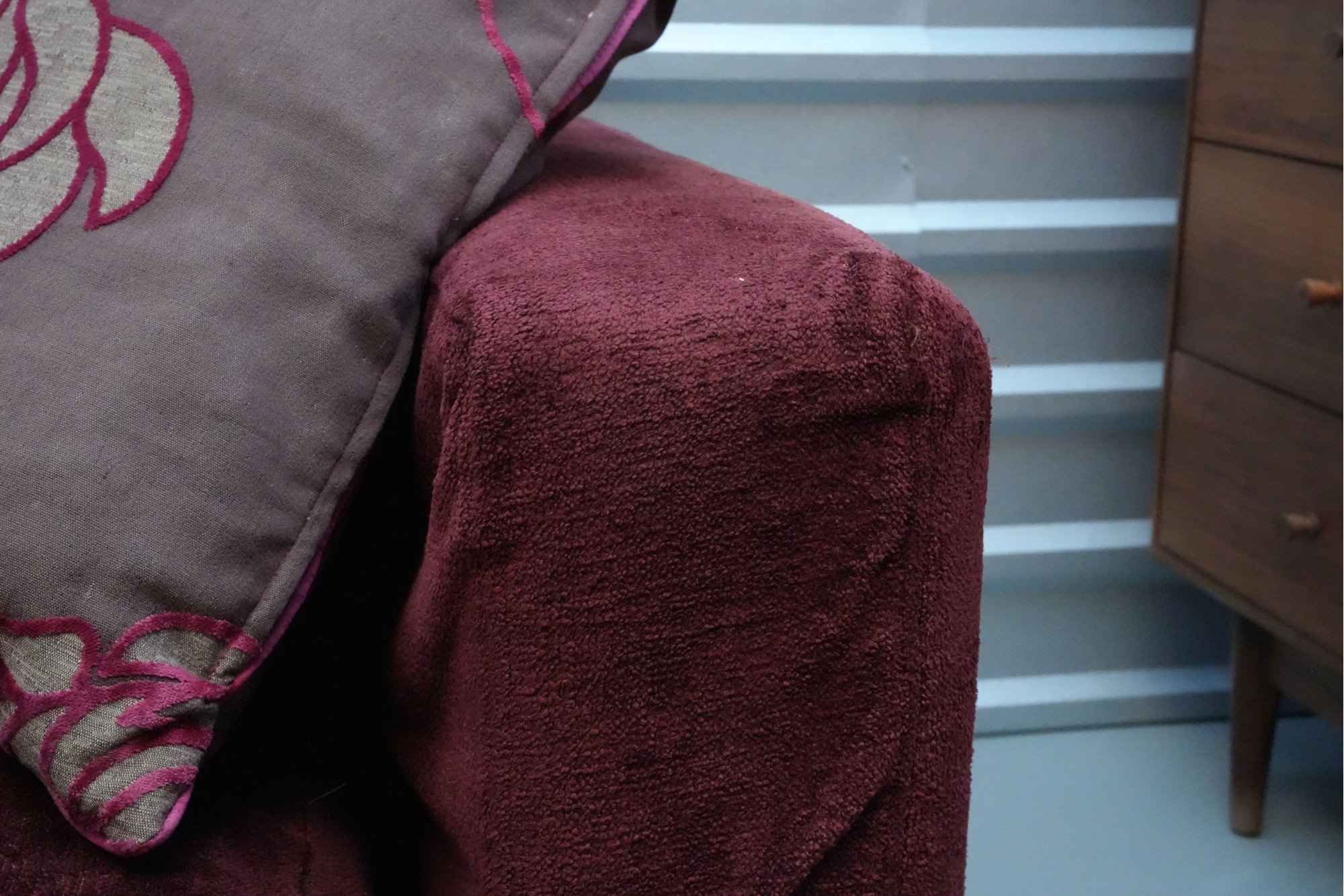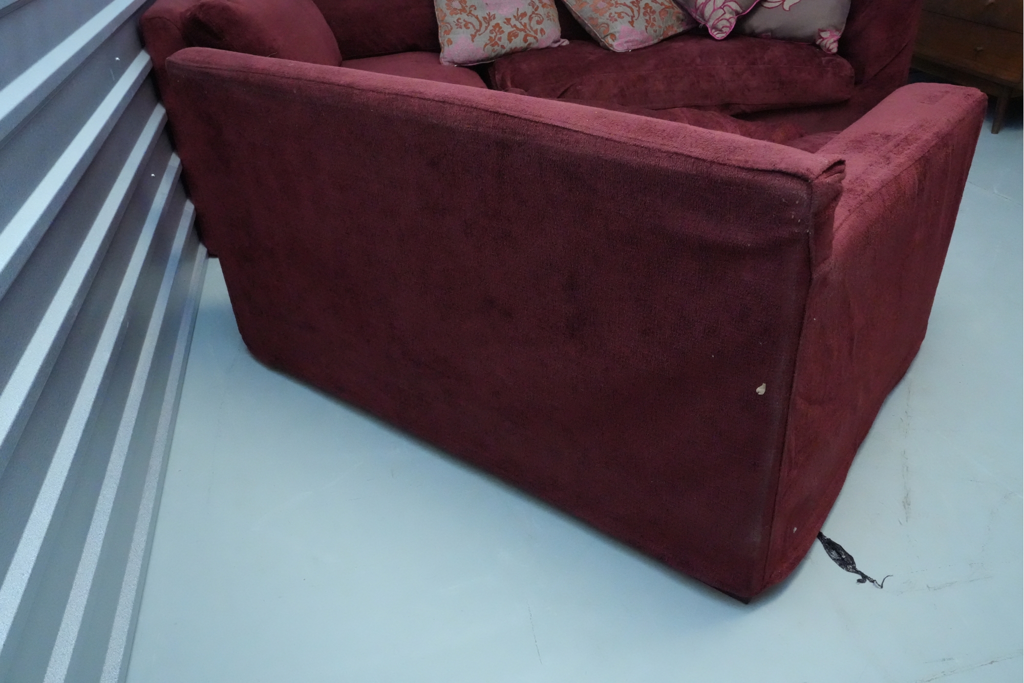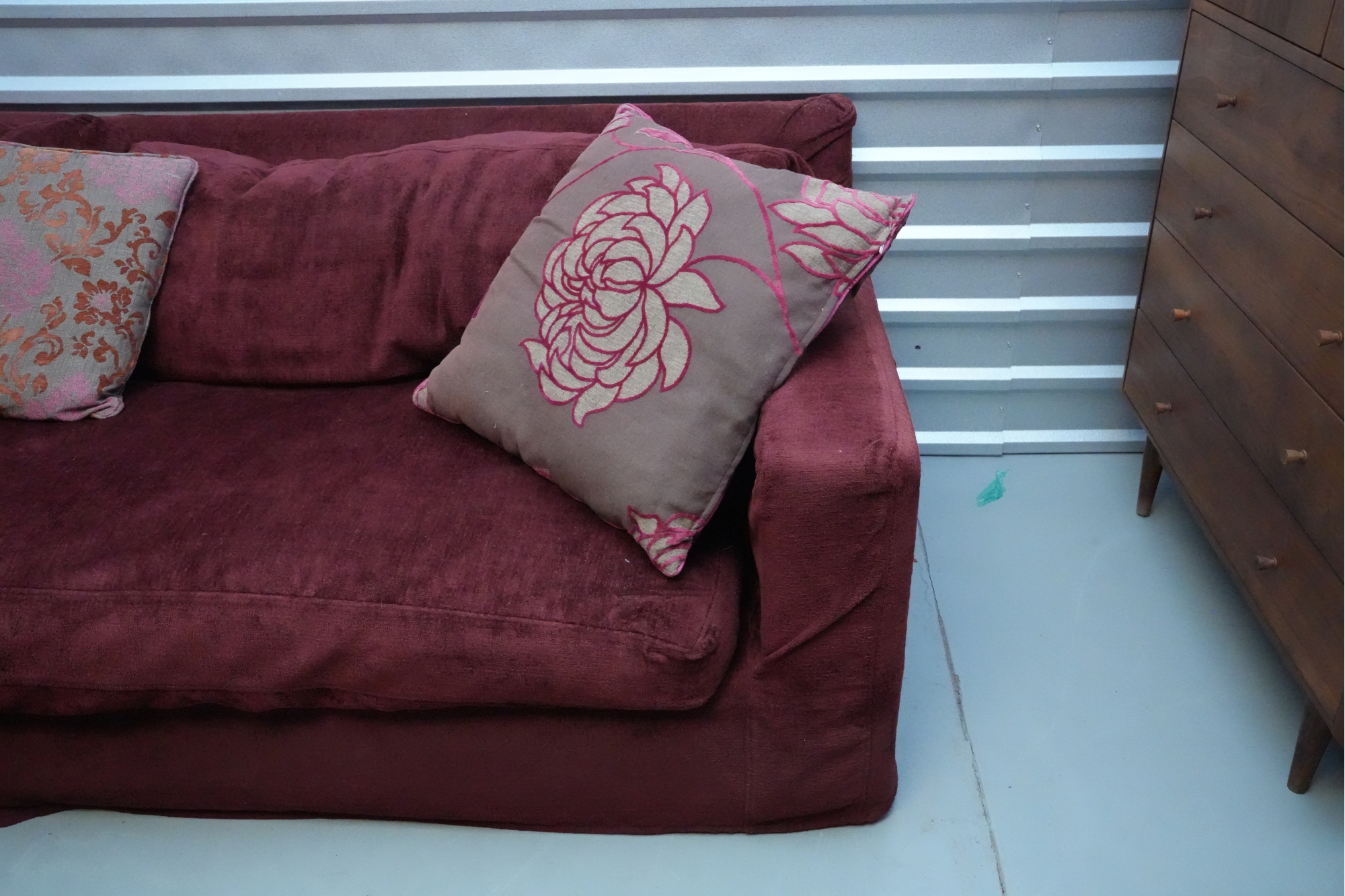 Montauk Sofa (Canada) burgundy fabric sectional sofa with floral accent pillows.