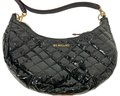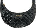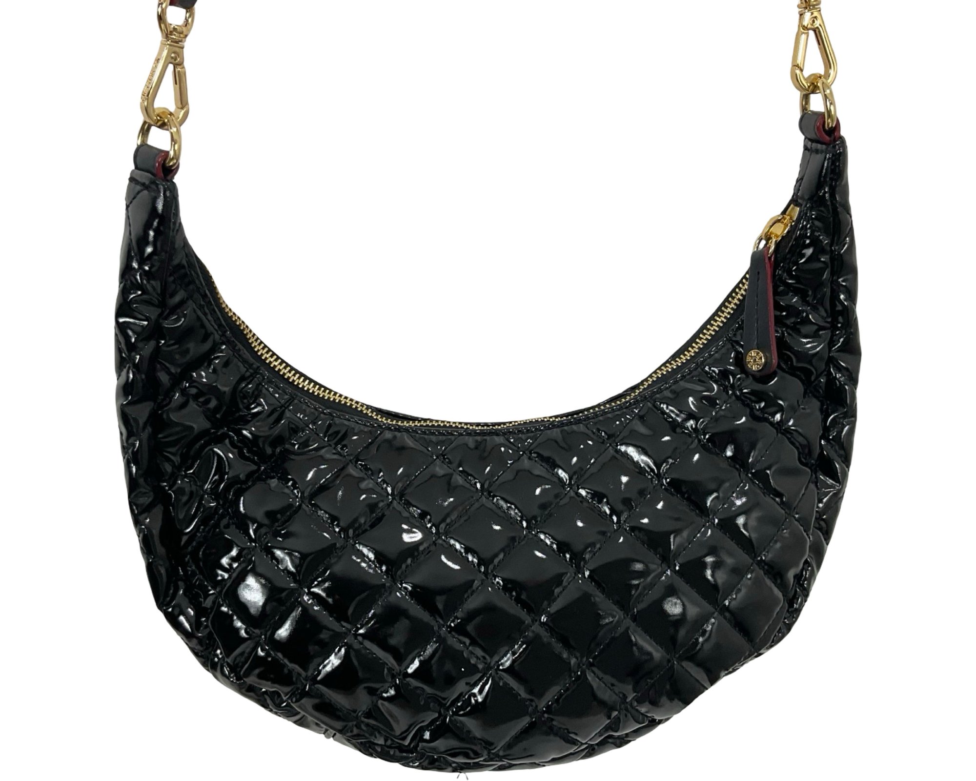 This crescent shaped hobo bag features the brands signature diamond quilted pattern in a glossy black lacquer finish. Gold-tone hardware and a zip-top closure. Includes dust bag and three extra straps to change up your look. Straps are removable.