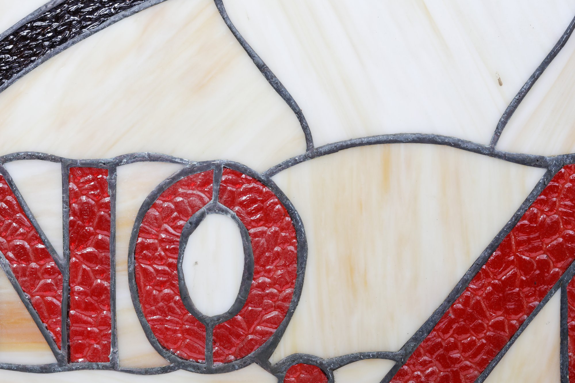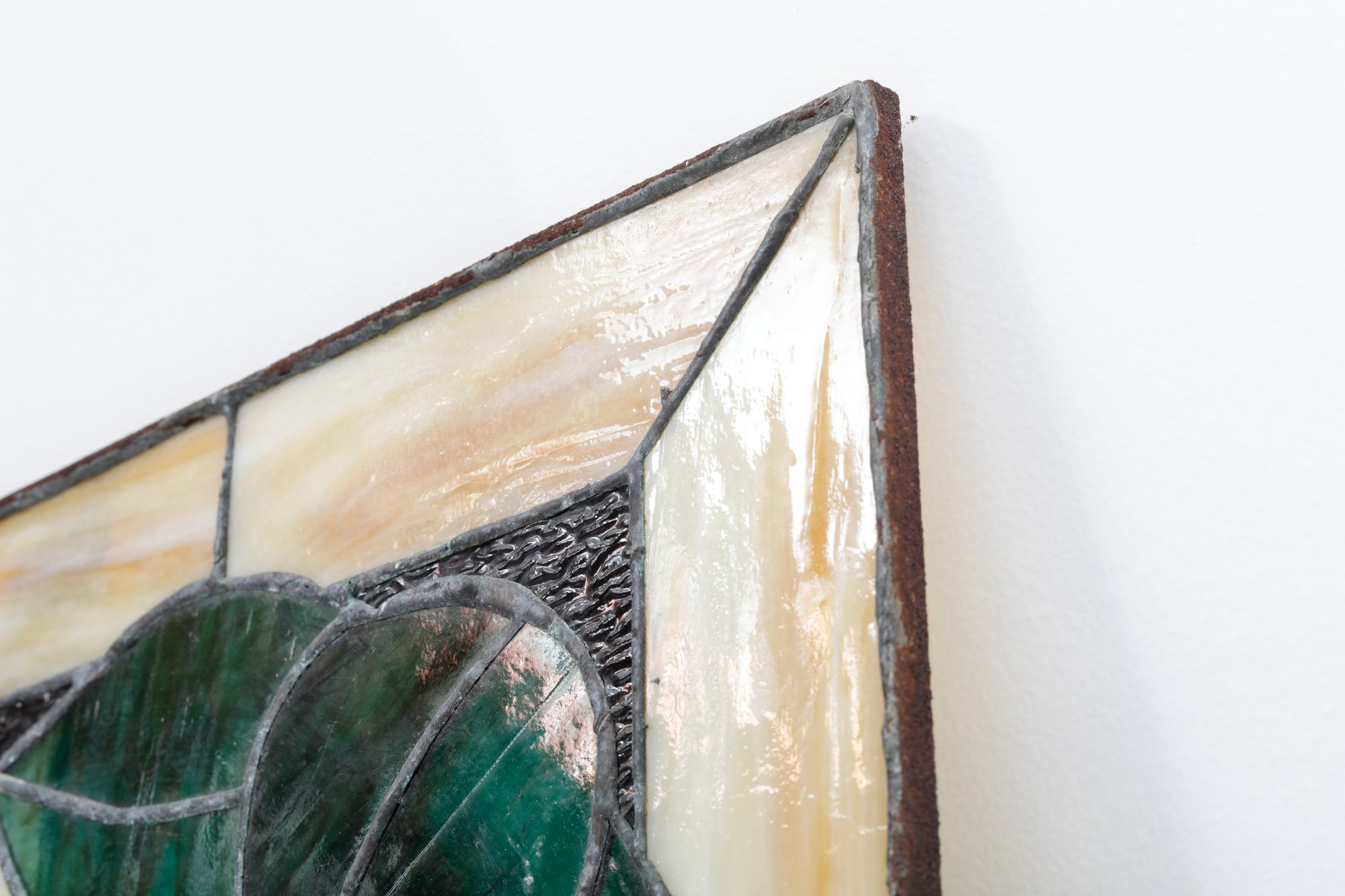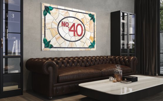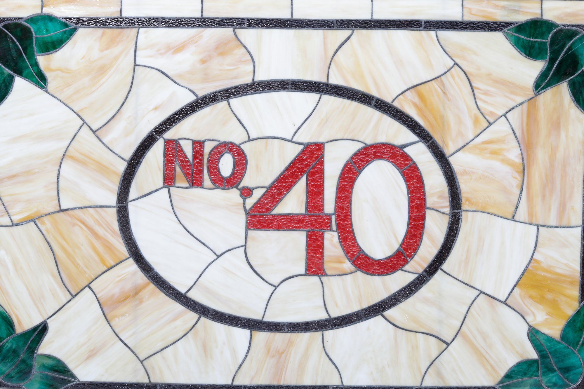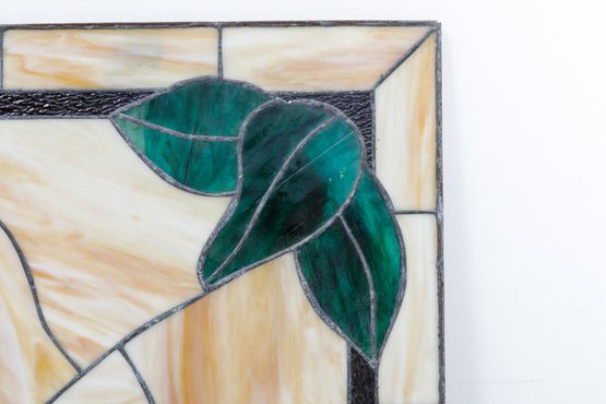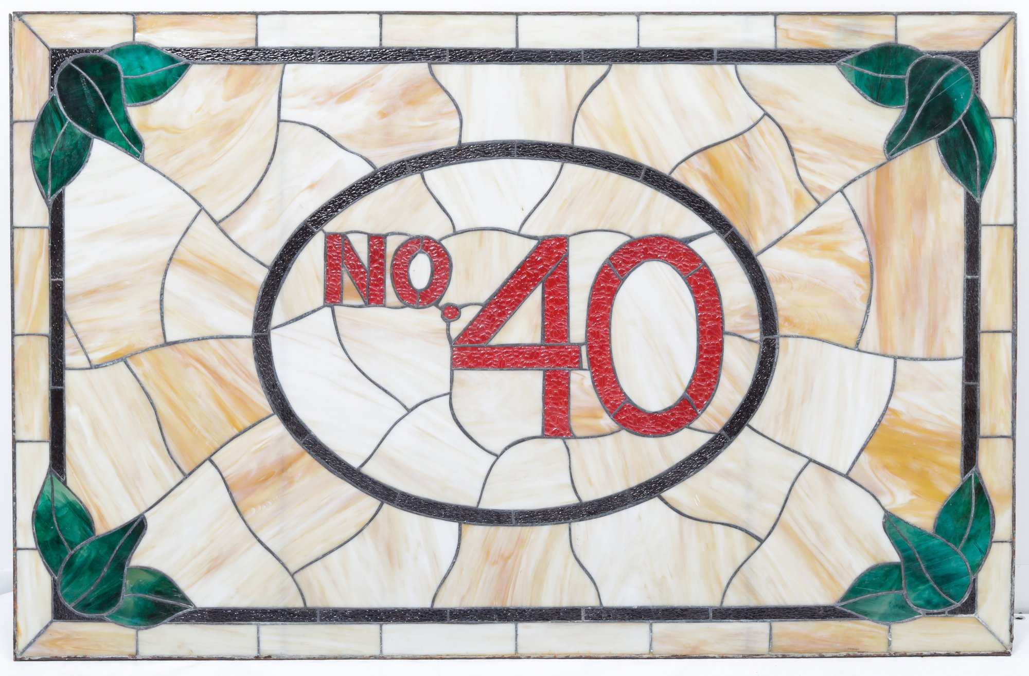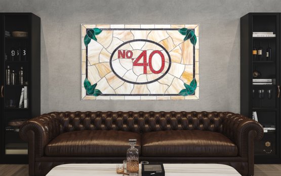 An unframed No. 40 leaded stained glass panel measuring 66 inches by 43 inches is a sizable stained glass artwork. This large stained glass panel, is intended for architectural or decorative purposes, such as windows, room dividers, or decorative installations in buildings.