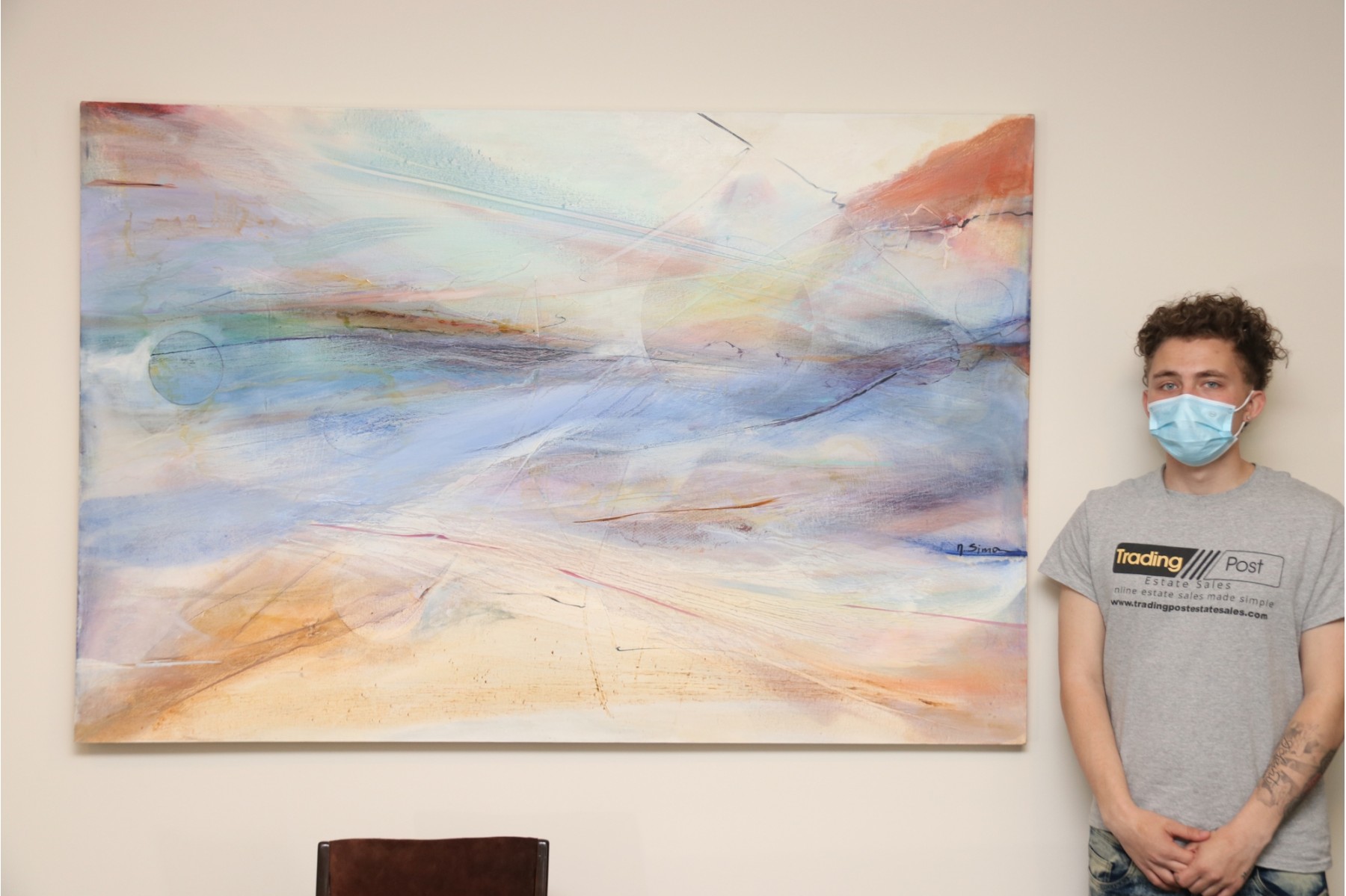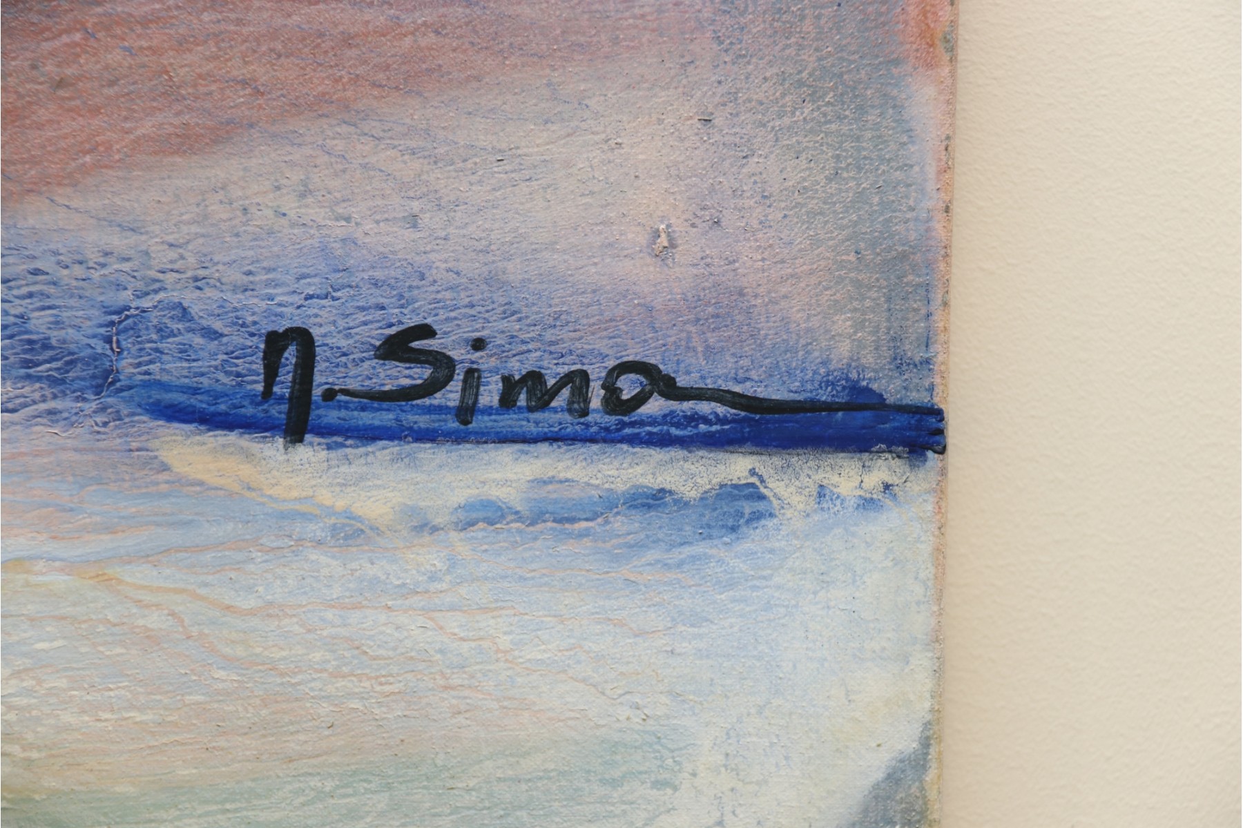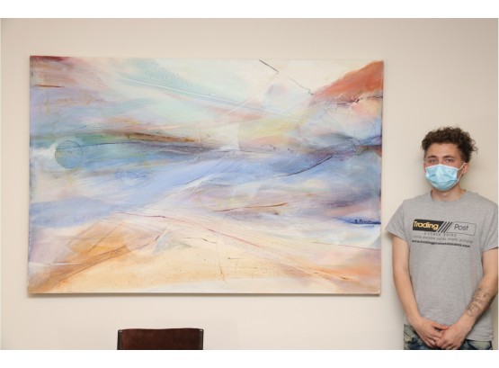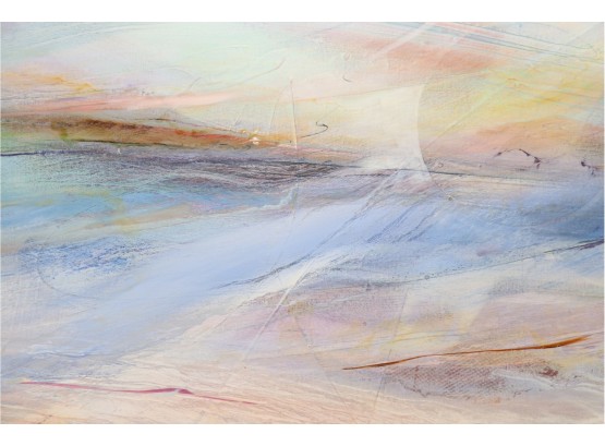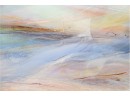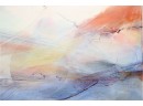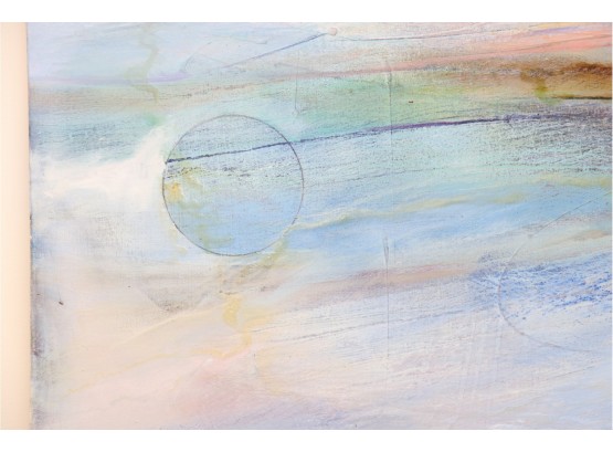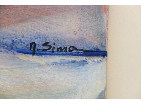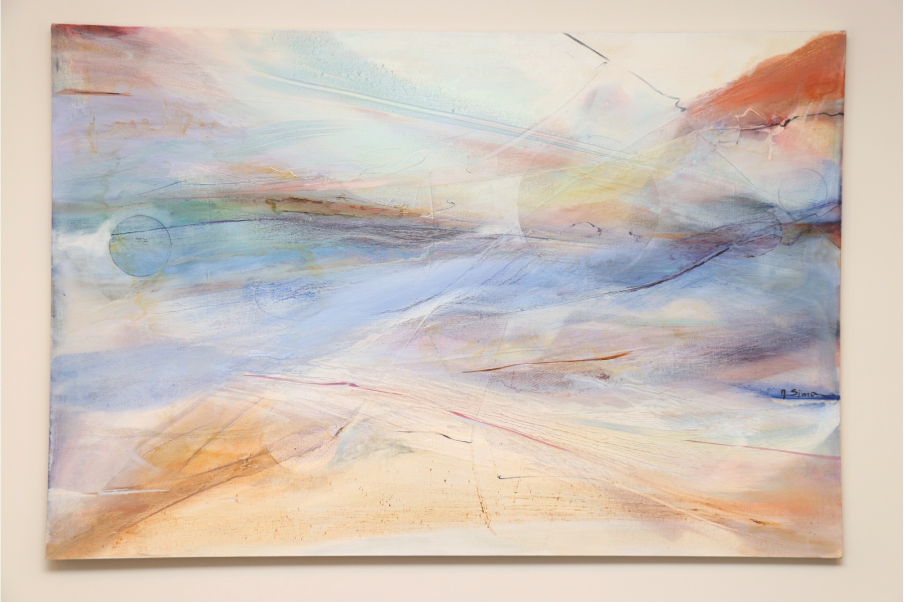 The pastel tones in this abstract skyline give off an ethereal sort of mood, sharpened by hinted arcs and circles that draw the eye in a Z pattern across the canvas. Hang it above a couch or bed, or in a hallway that needs a pop of color to bring out shades of blue, terra cotta, and beige in your design choices. It's signed by artist " Sima" in the center right.