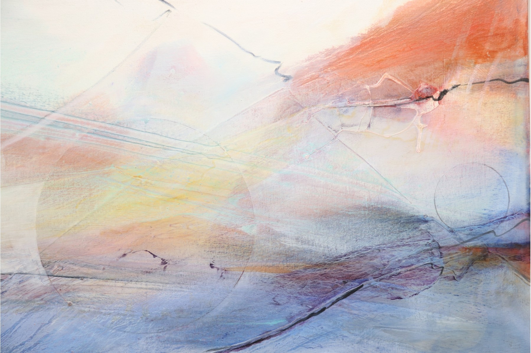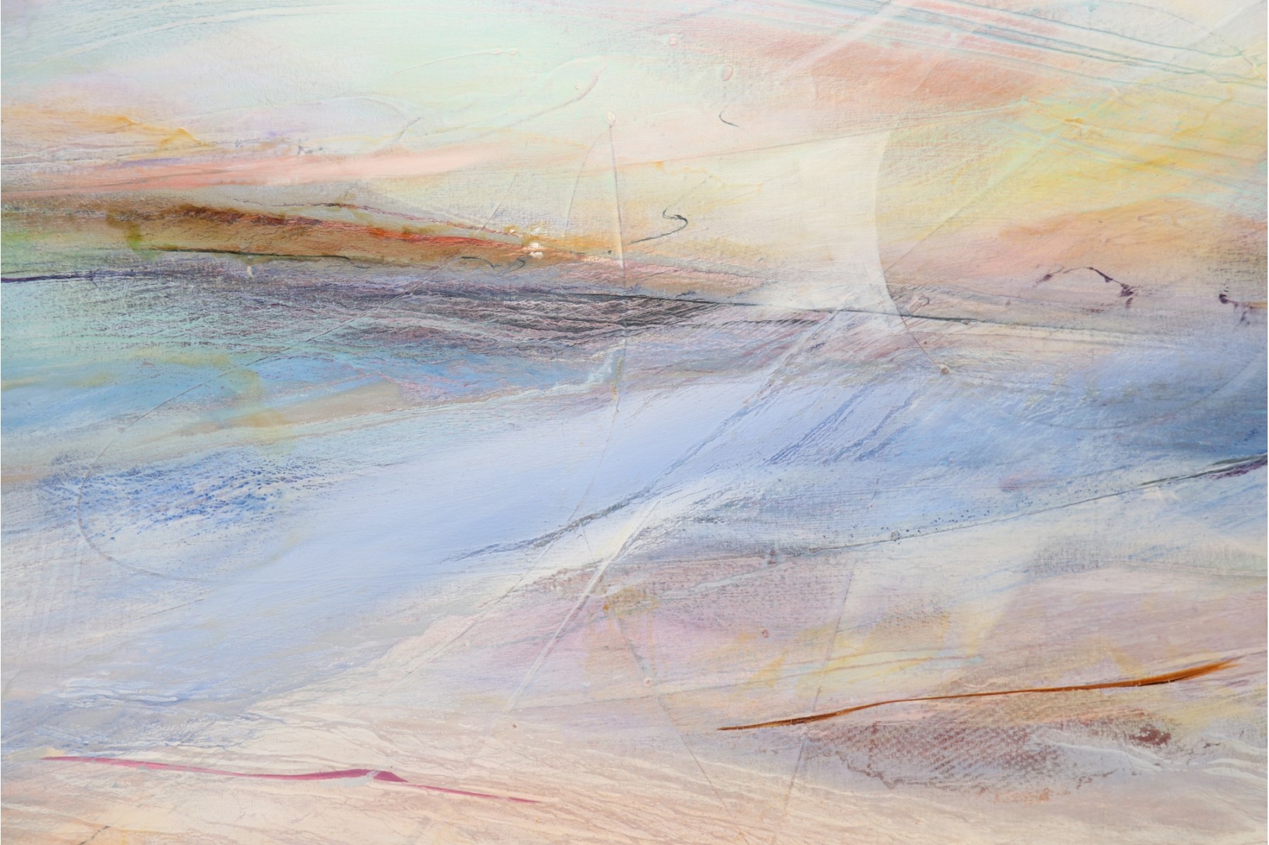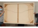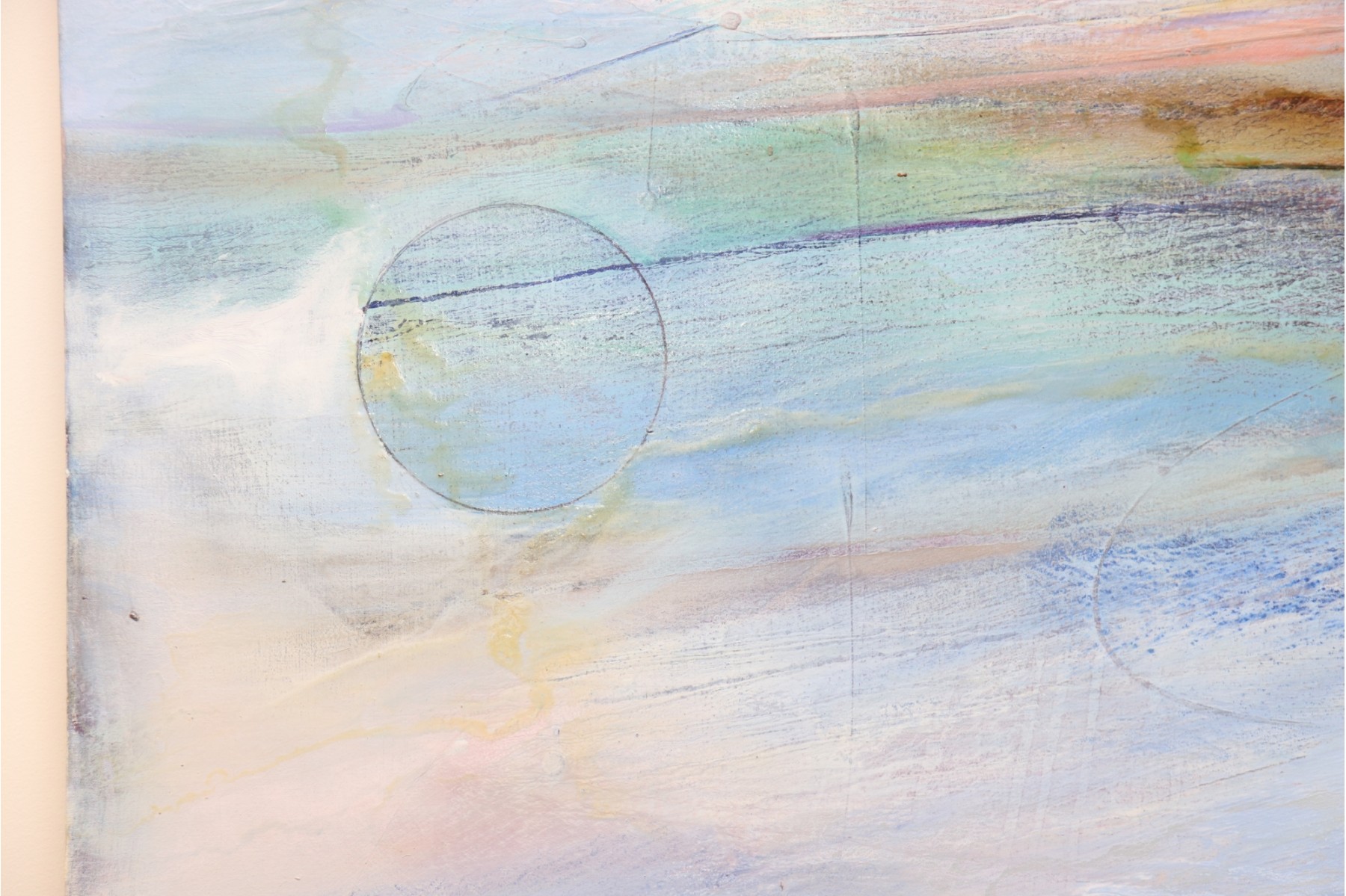The pastel tones in this abstract skyline give off an ethereal sort of mood, sharpened by hinted arcs and circles that draw the eye in a Z pattern across the canvas. Hang it above a couch or bed, or in a hallway that needs a pop of color to bring out shades of blue, terra cotta, and beige in your design choices. It's signed by artist " Sima" in the center right.