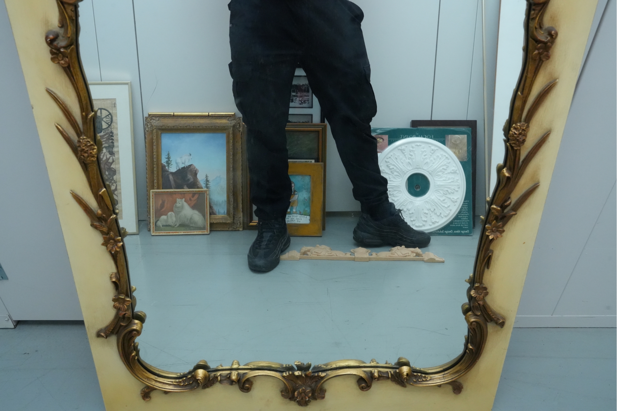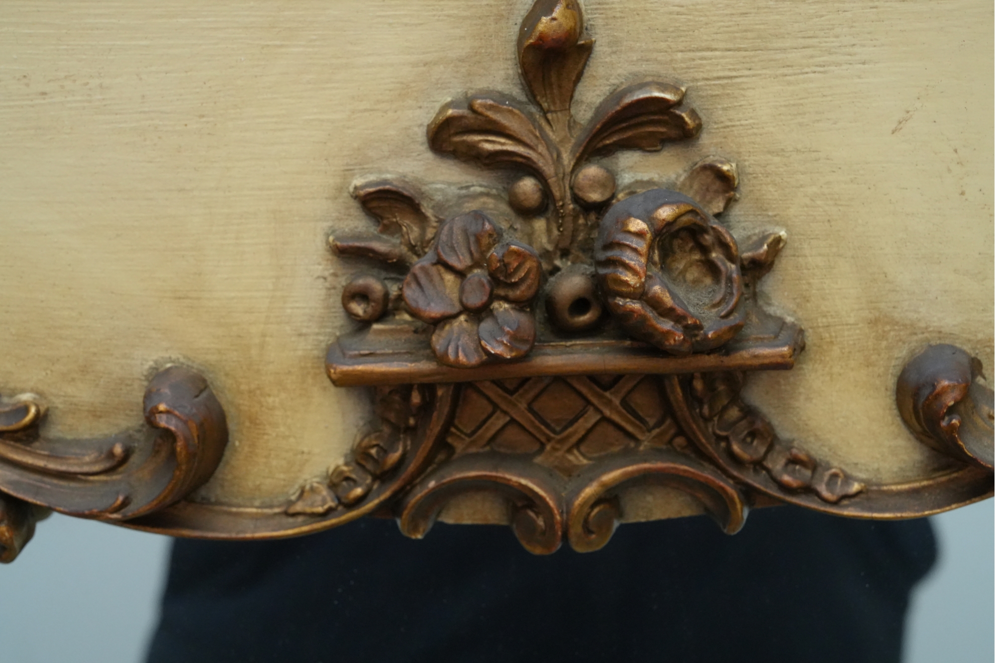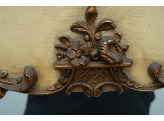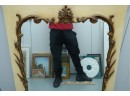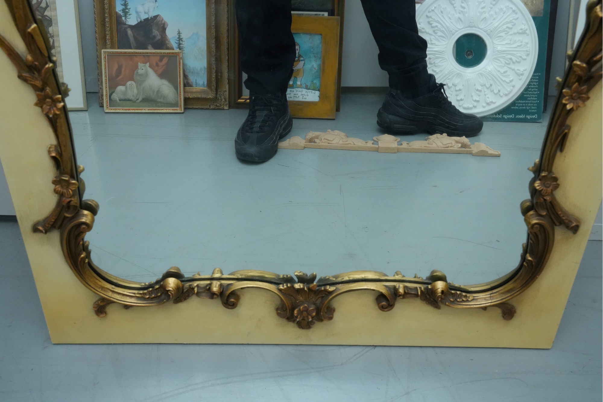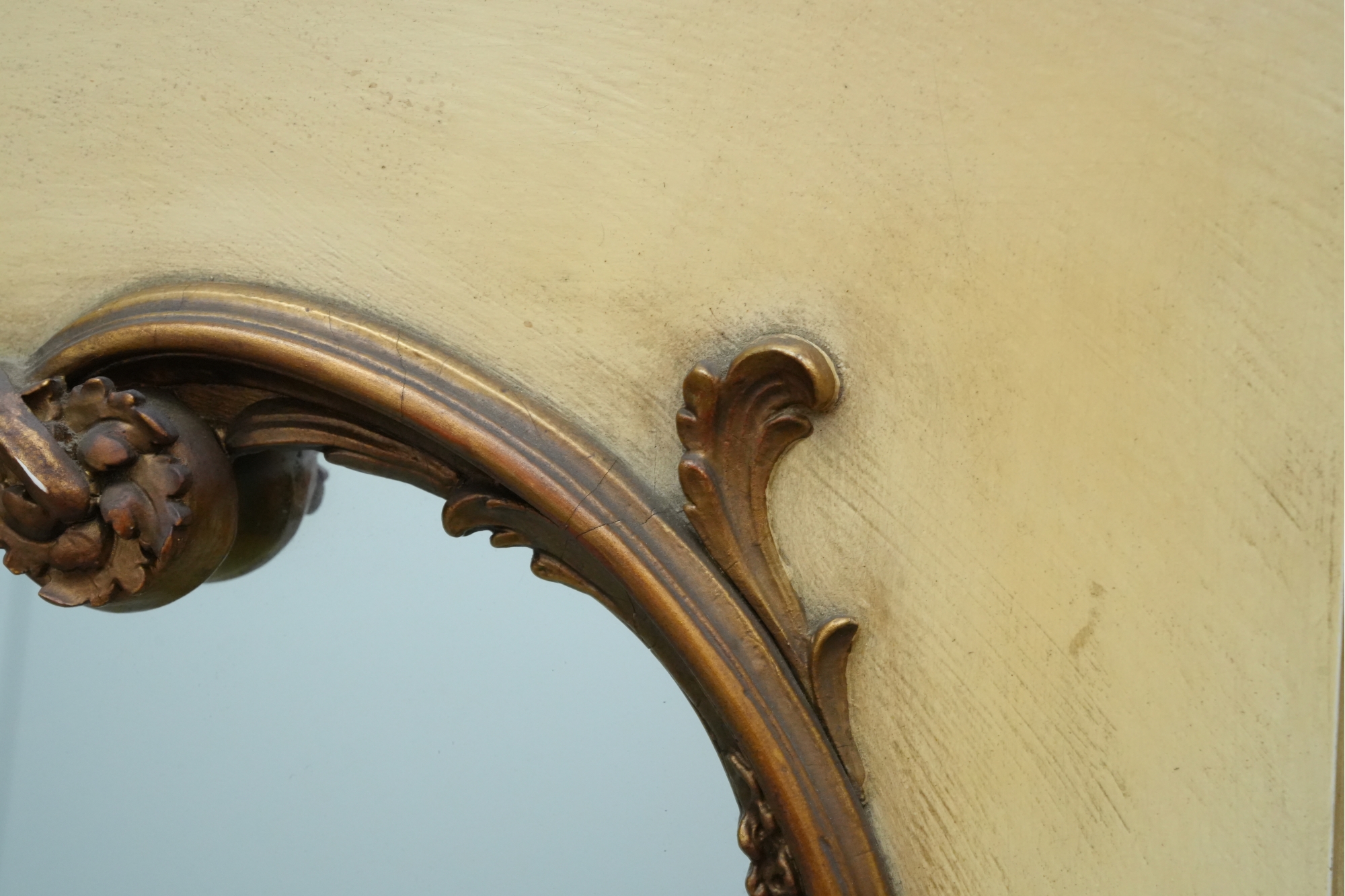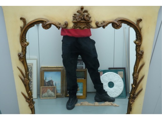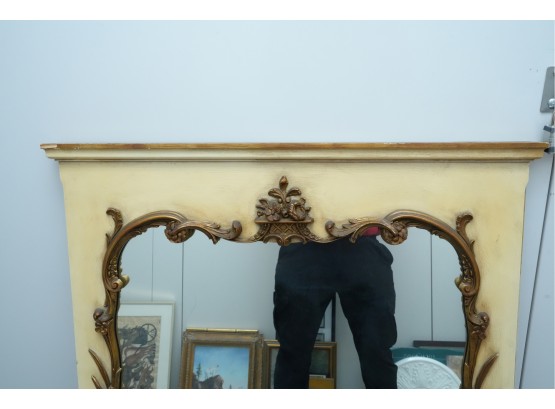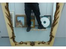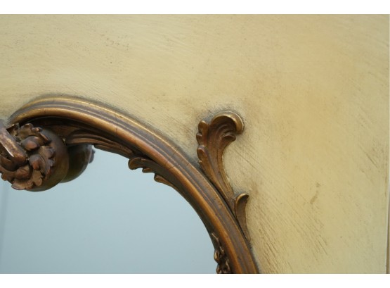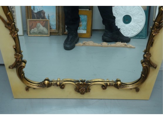 Antique-style ornate wall mirror, set in a gold-toned frame, with detailed floral and scrollwork embellishments.