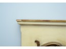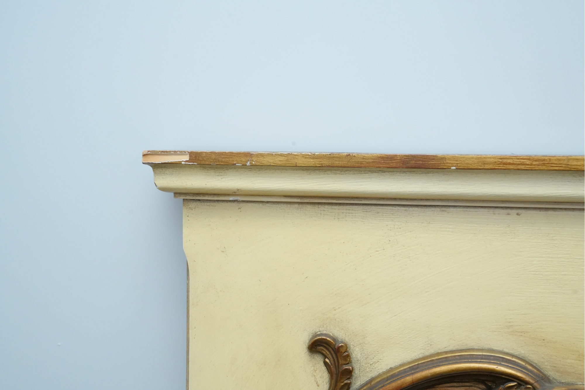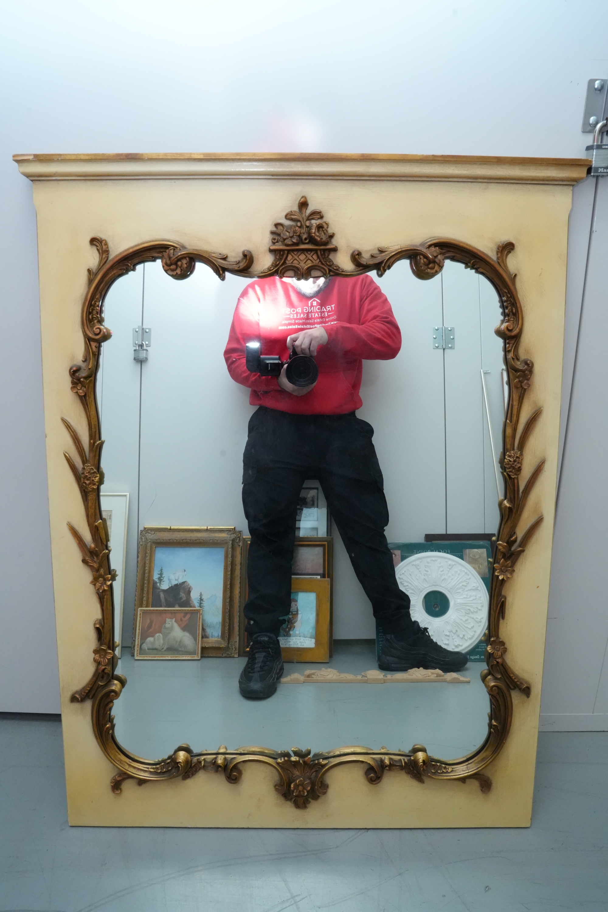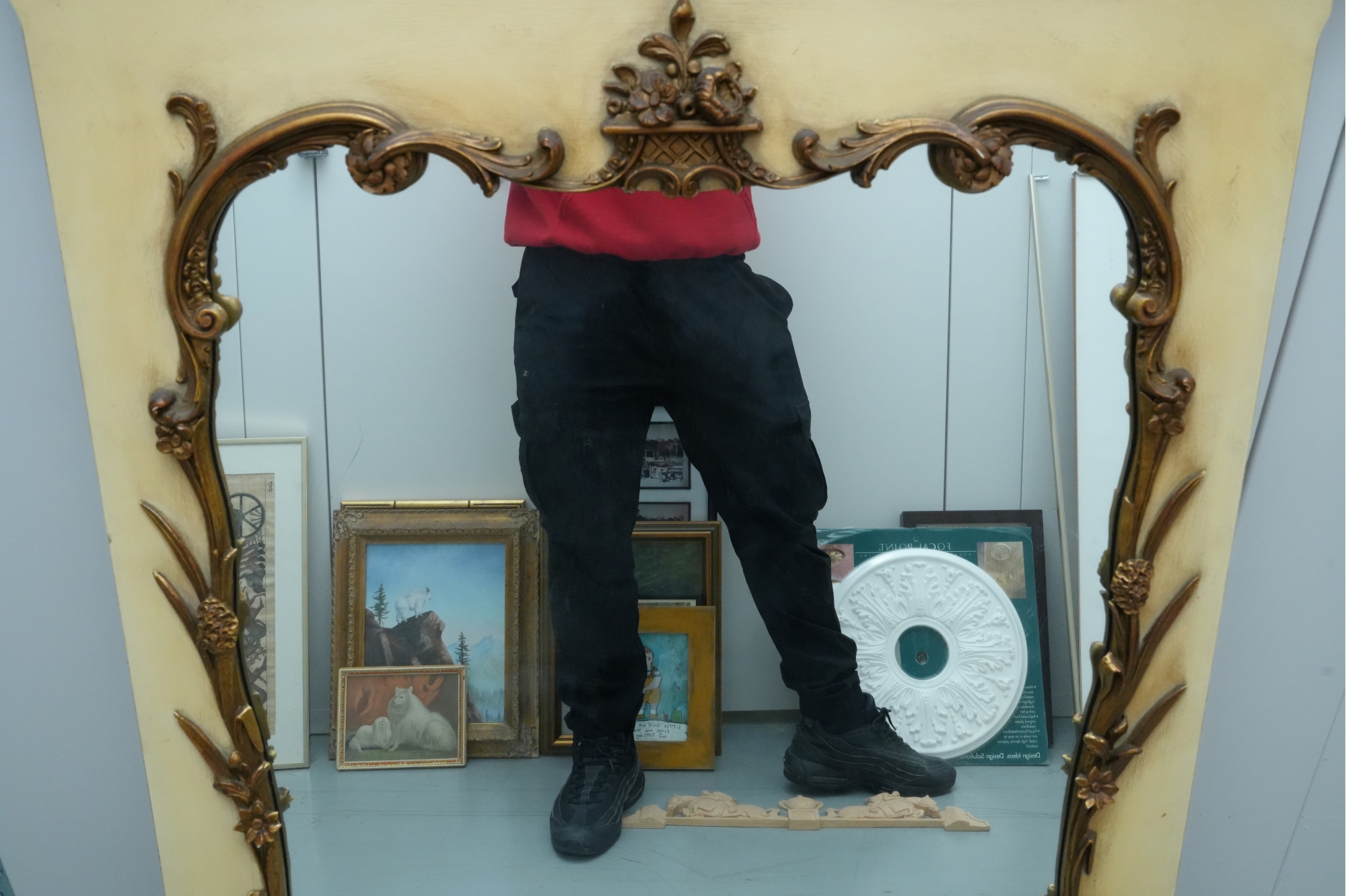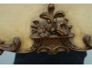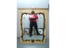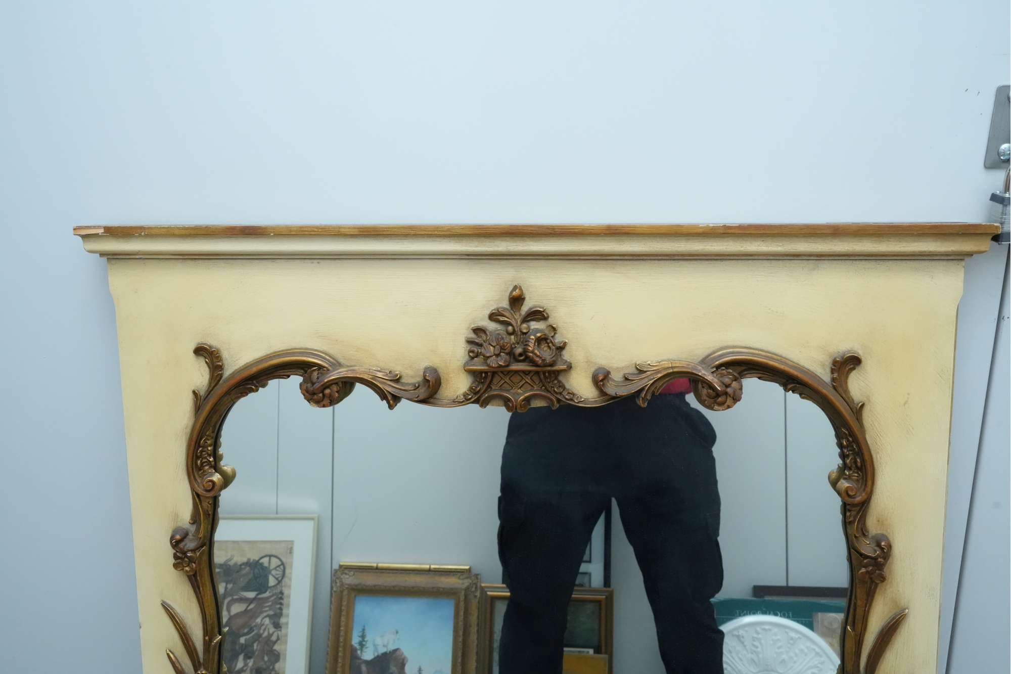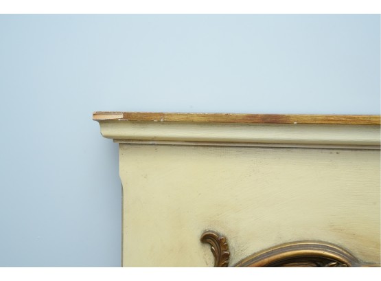 Antique-style ornate wall mirror, set in a gold-toned frame, with detailed floral and scrollwork embellishments.