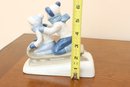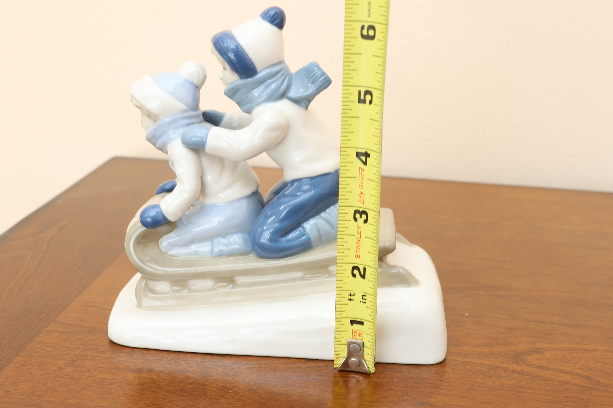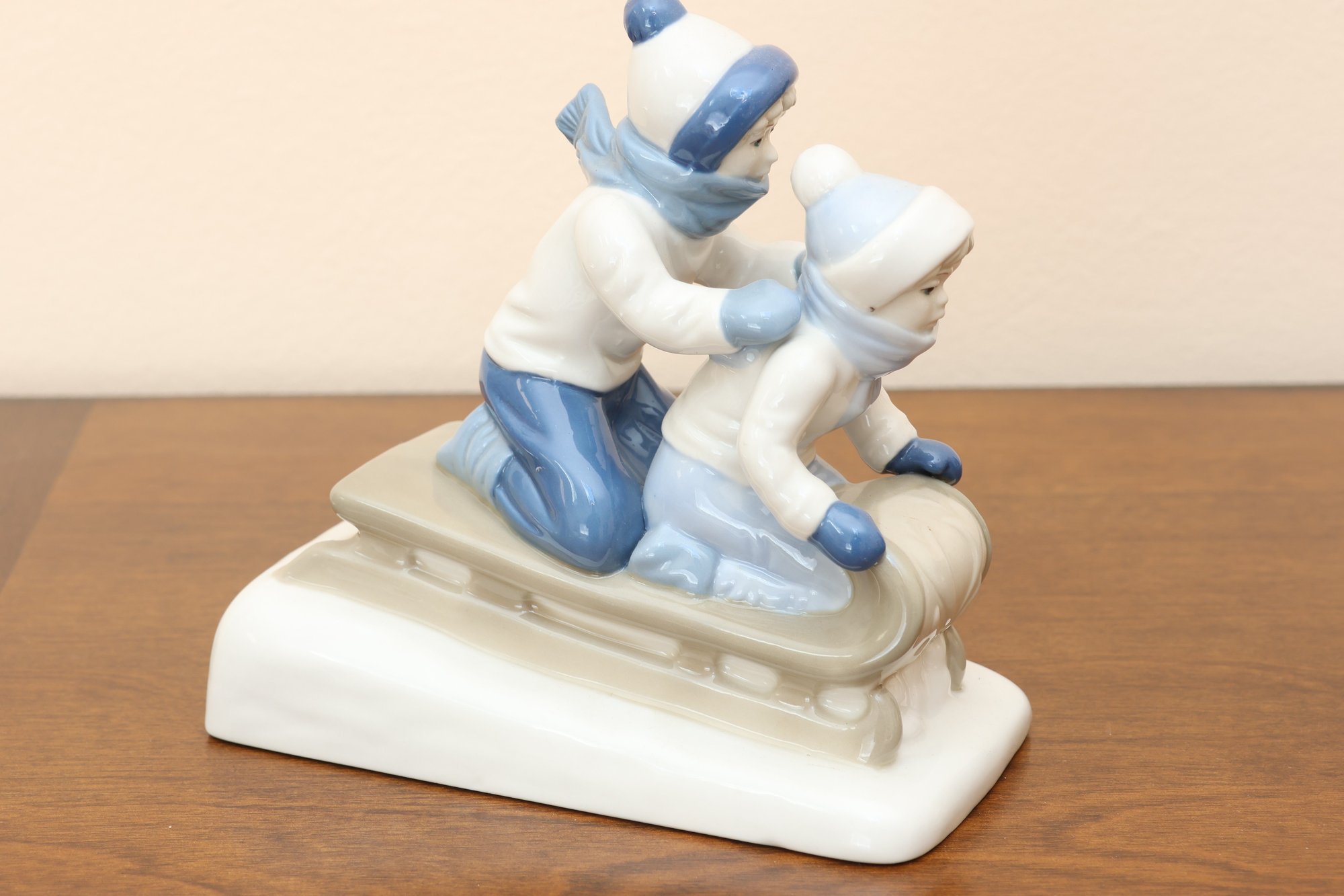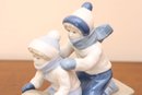 This charming glazed porcelain figurine depicts two children enjoying a winter sledding scene. They are dressed in white and blue winter hats, scarves, mittens, and clothing, kneeling on a grey sled atop a white base representing snow. The piece features delicate modeling and a glossy finish.